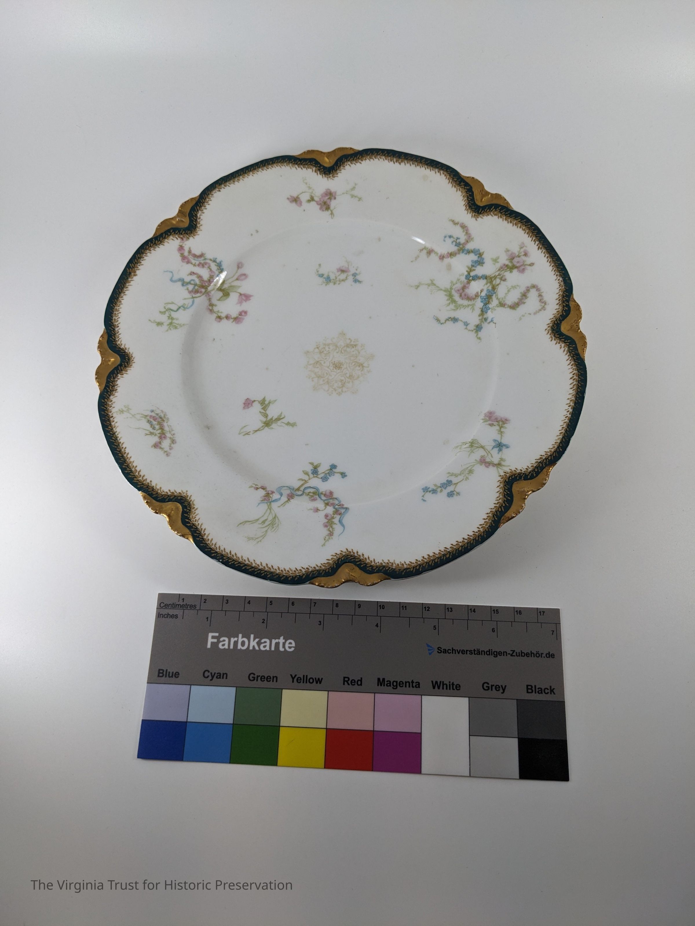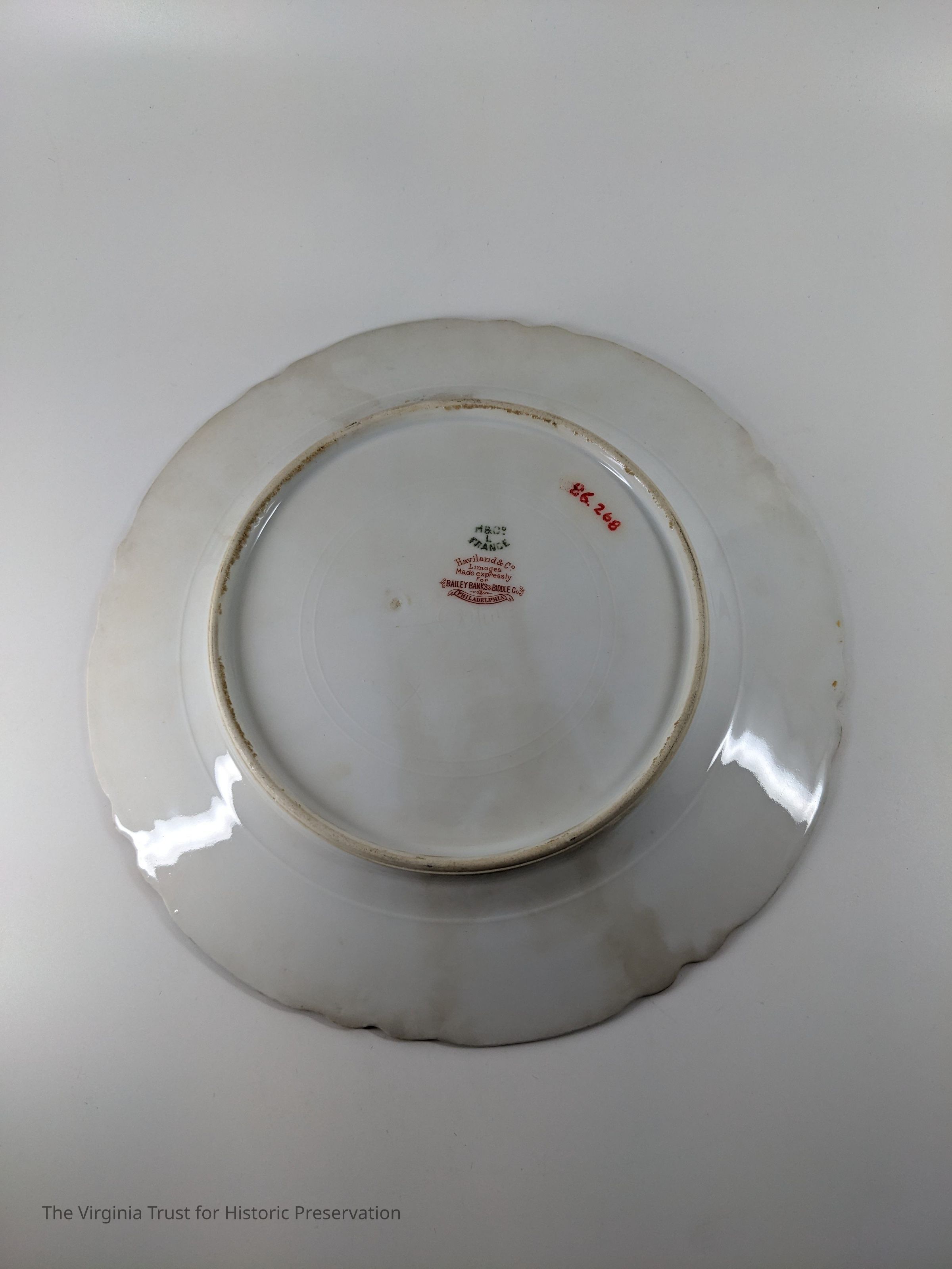 Eleven dessert plates with pale pattern of blue/green and gold. Marked "Haviland & Co. Limoges, Made for Bailey, Banks, and Biddle, Phil. H 7 Co. France."