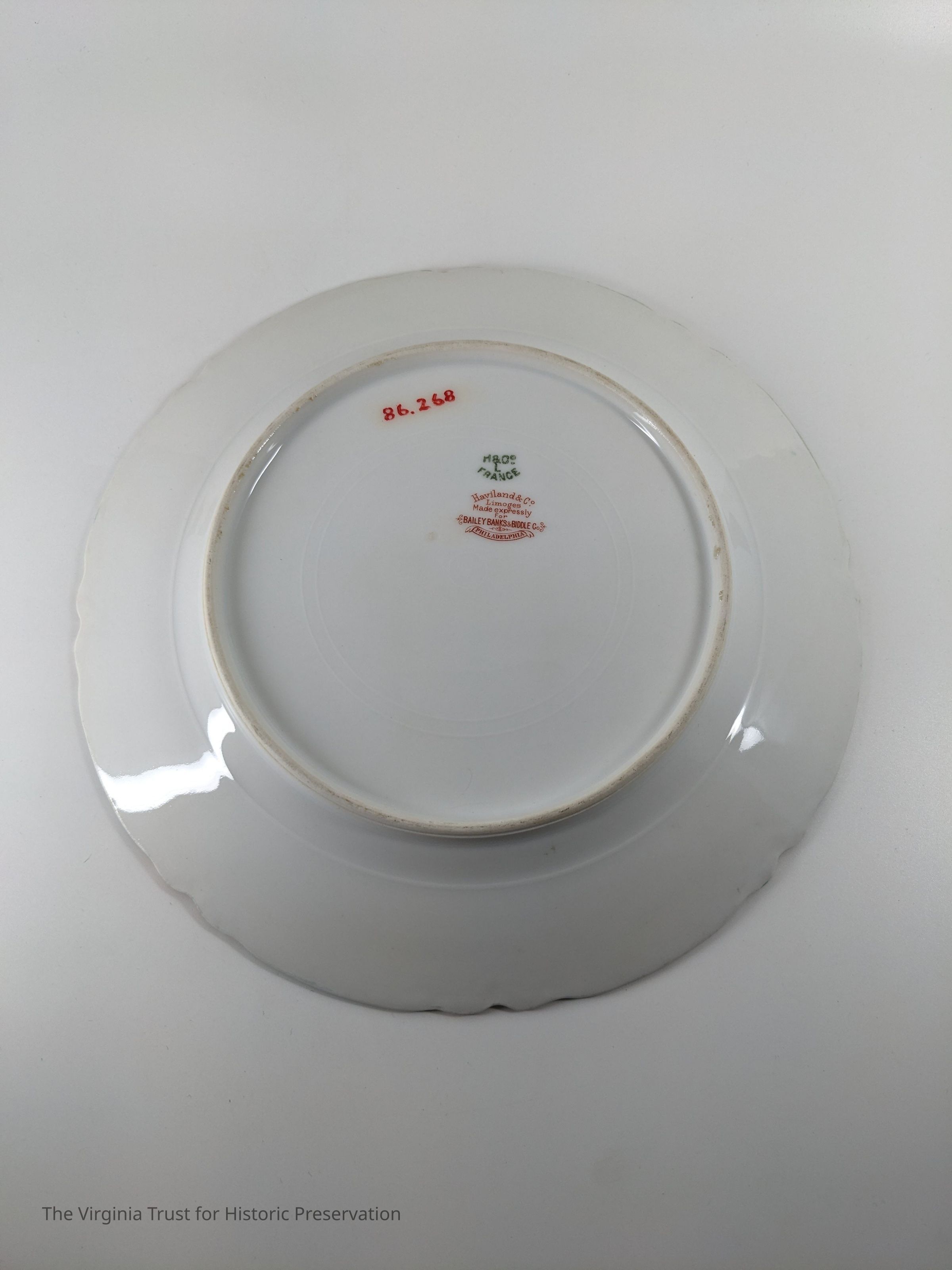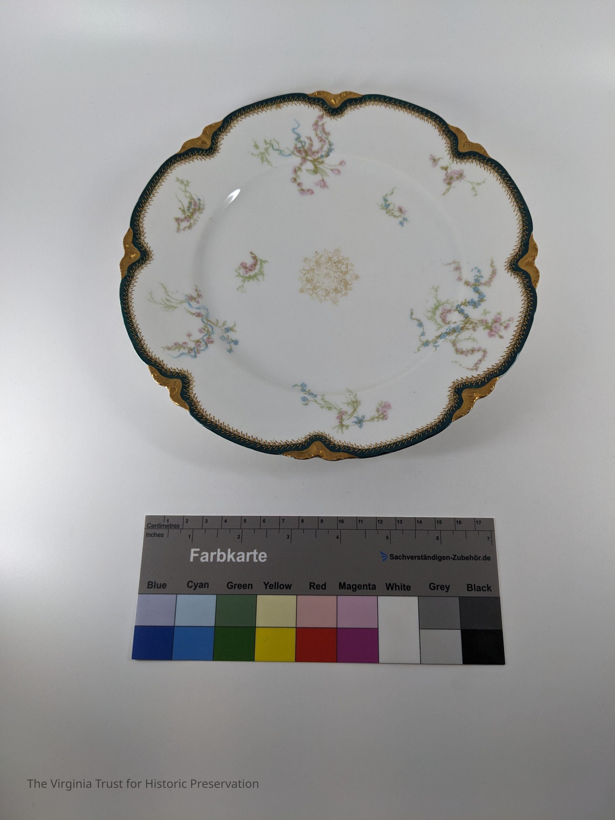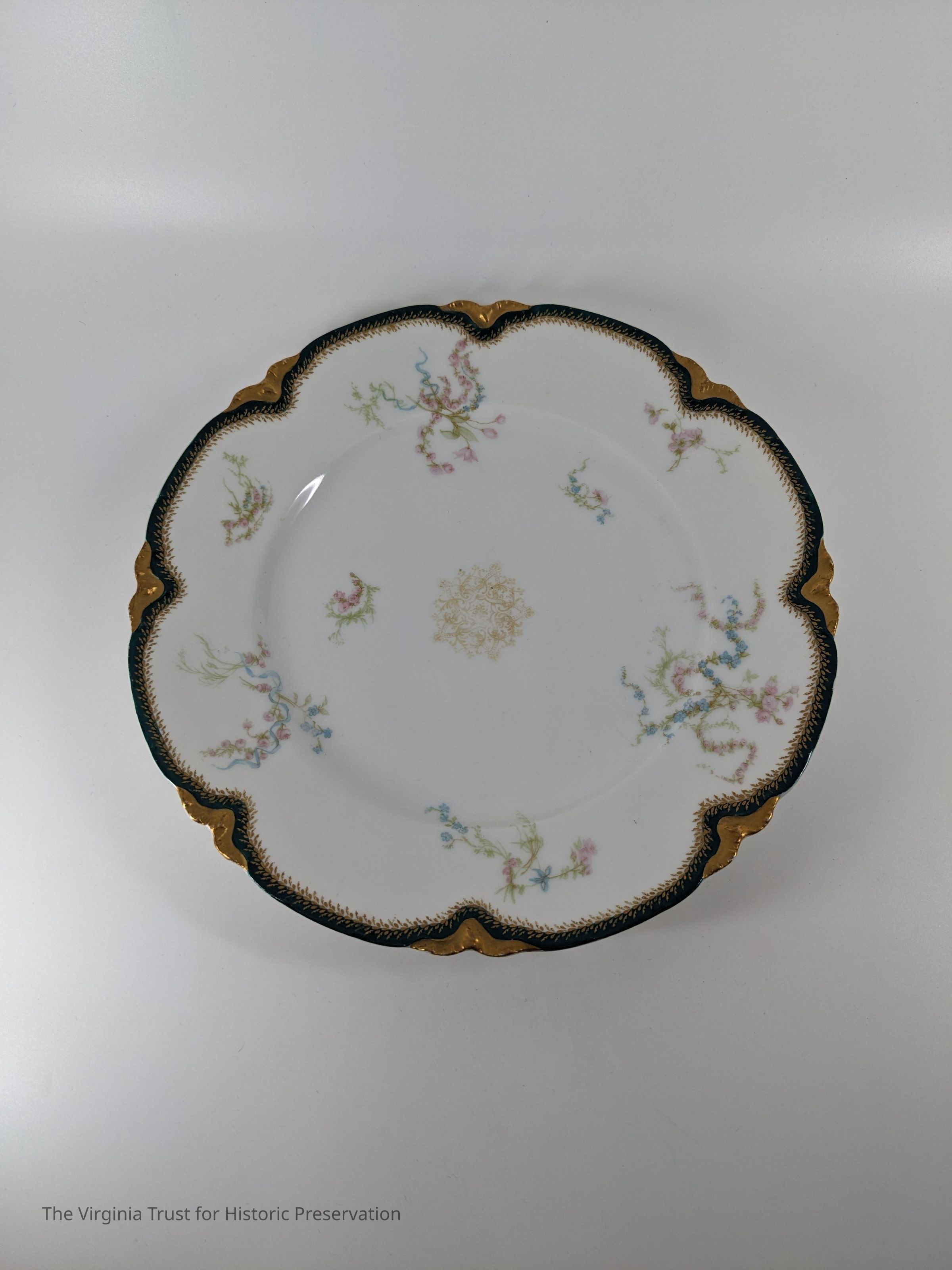 One of 11 dessert plates with pale pattern of blue/green floral designs and gold center. Marked "Haviland & Co. Limoges, Made for Bailey, Banks, and Biddle, Phil. H 7 Co. France."