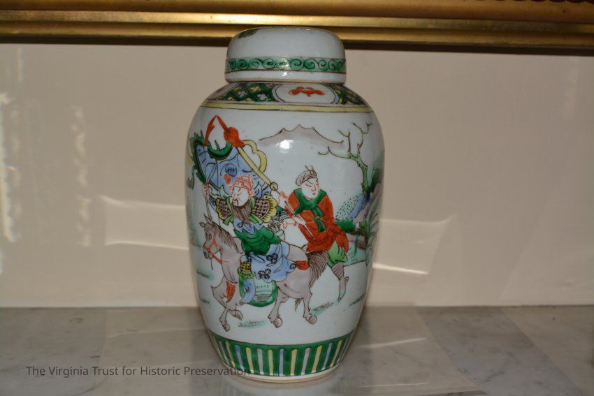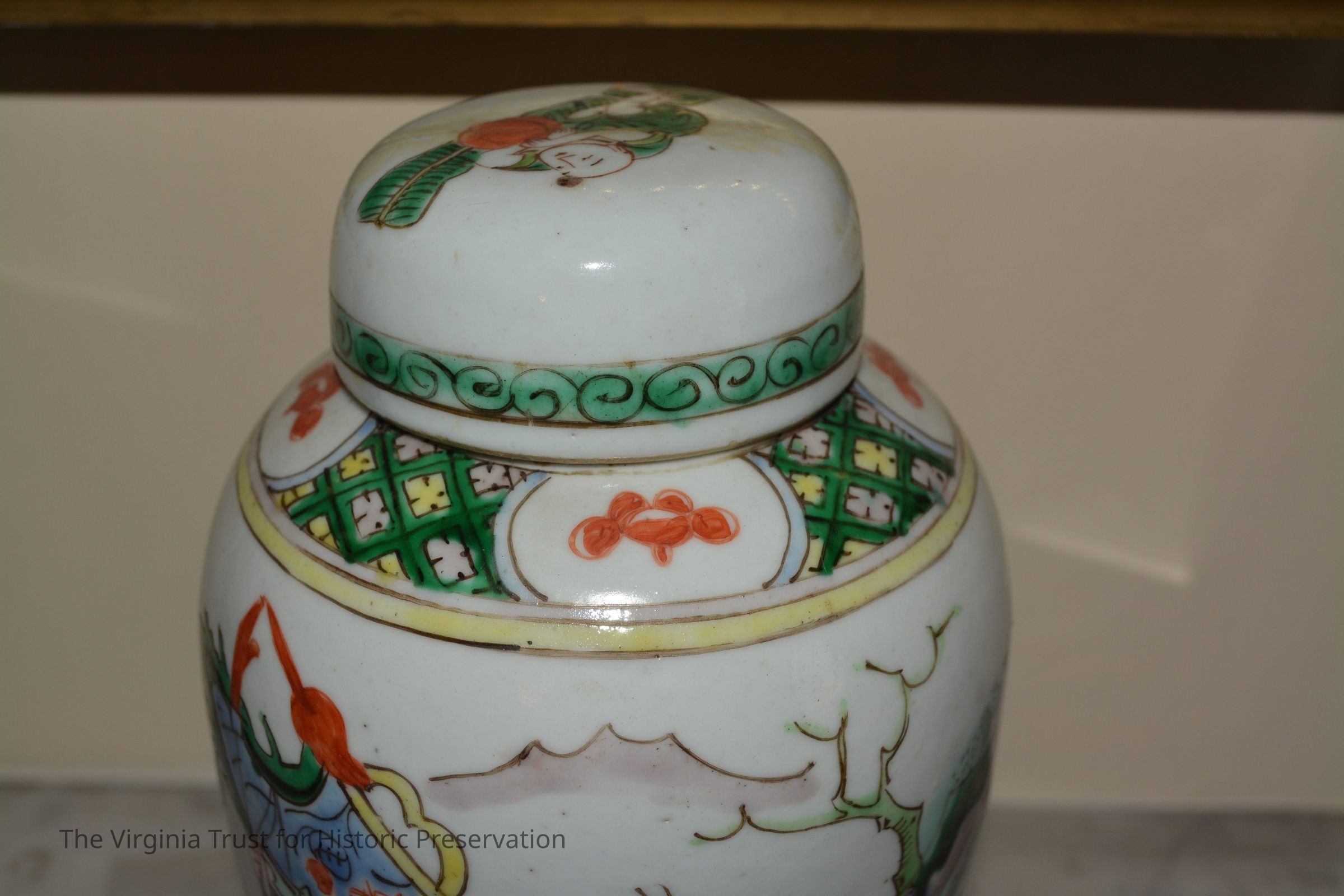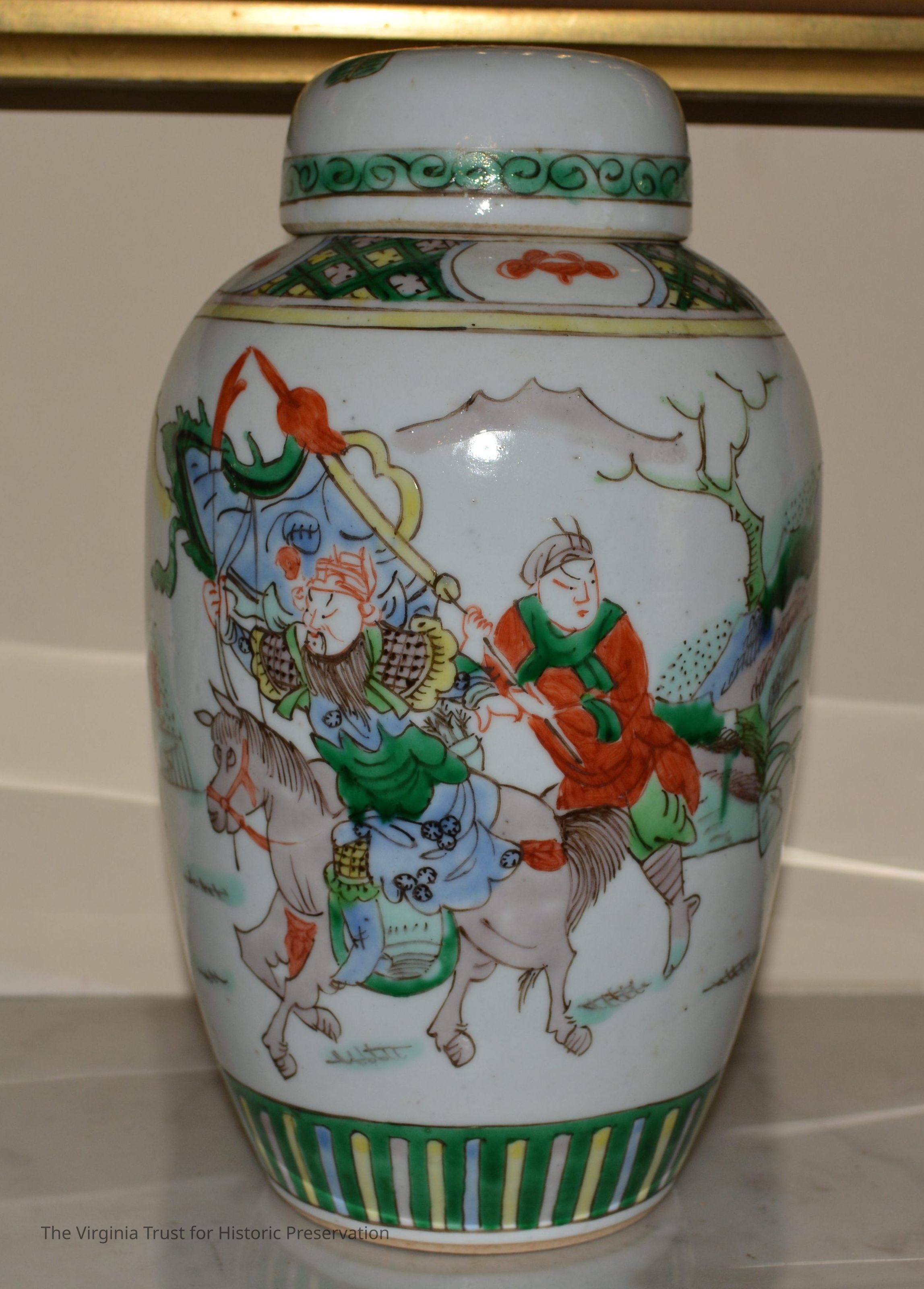 One of a pair of porcelain jars, each with separate lids. Green painted design with orange oriental horse.