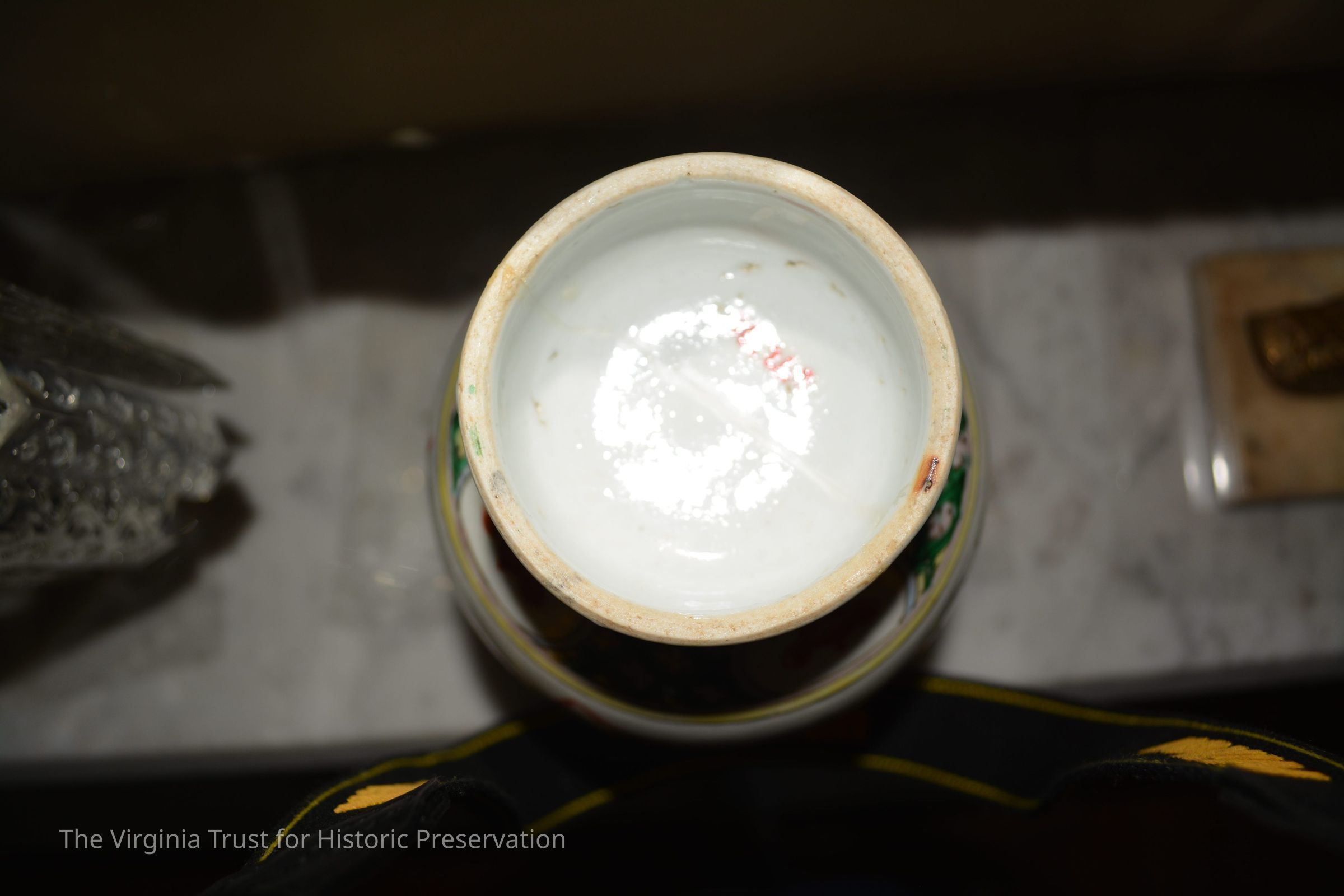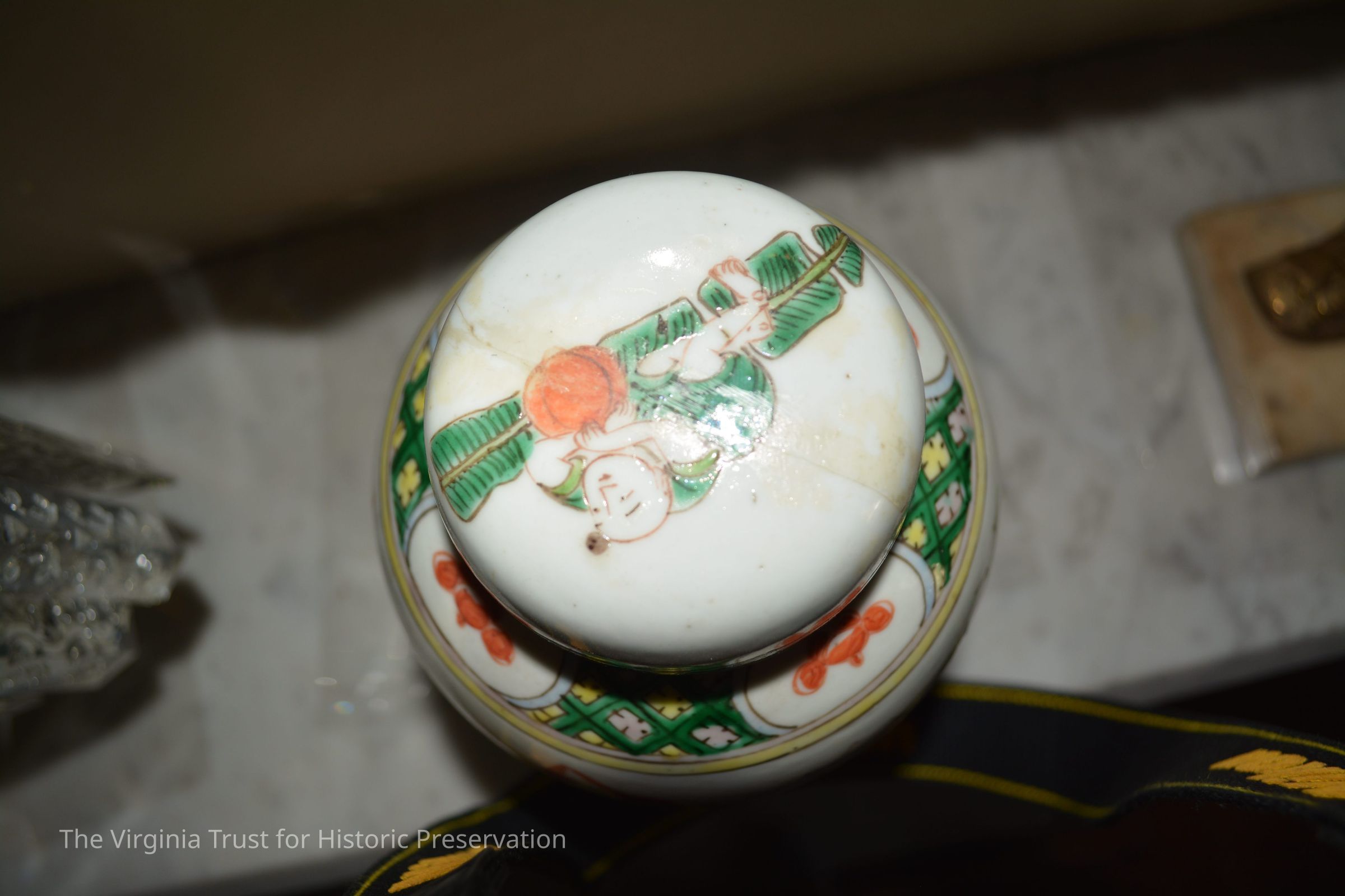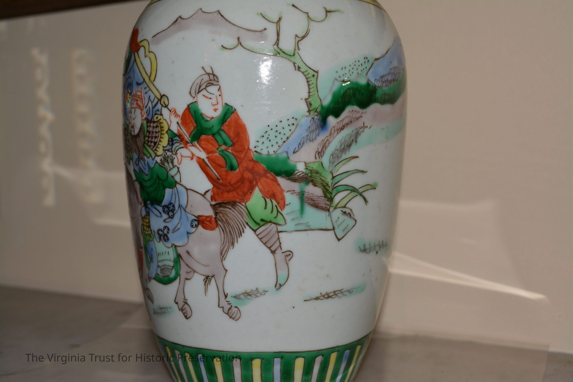 One of a pair of porcelain jars, each with separate lids. Green painted design with orange oriental horse.