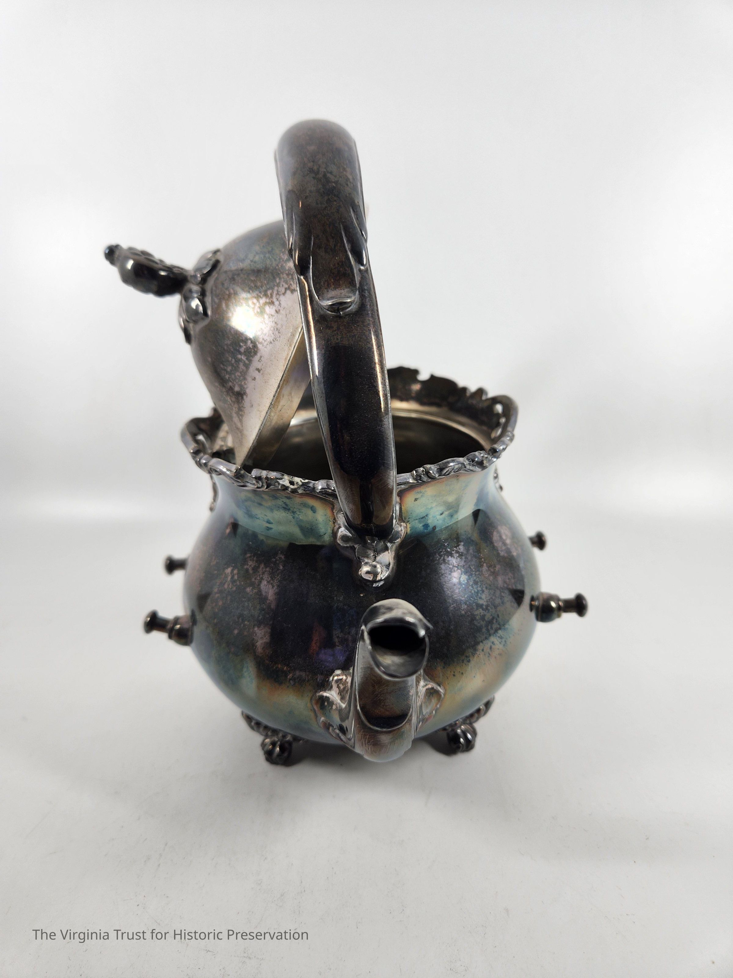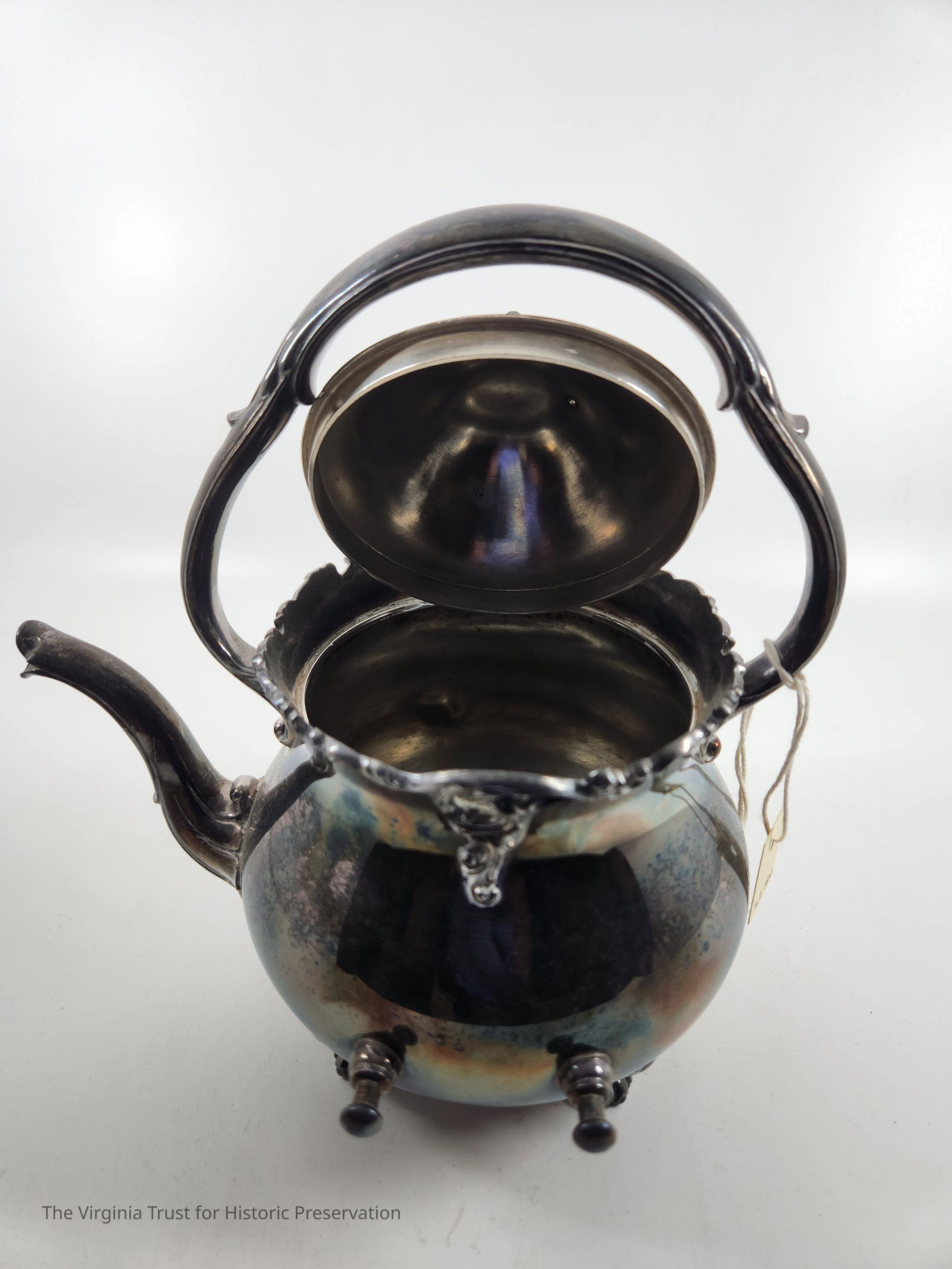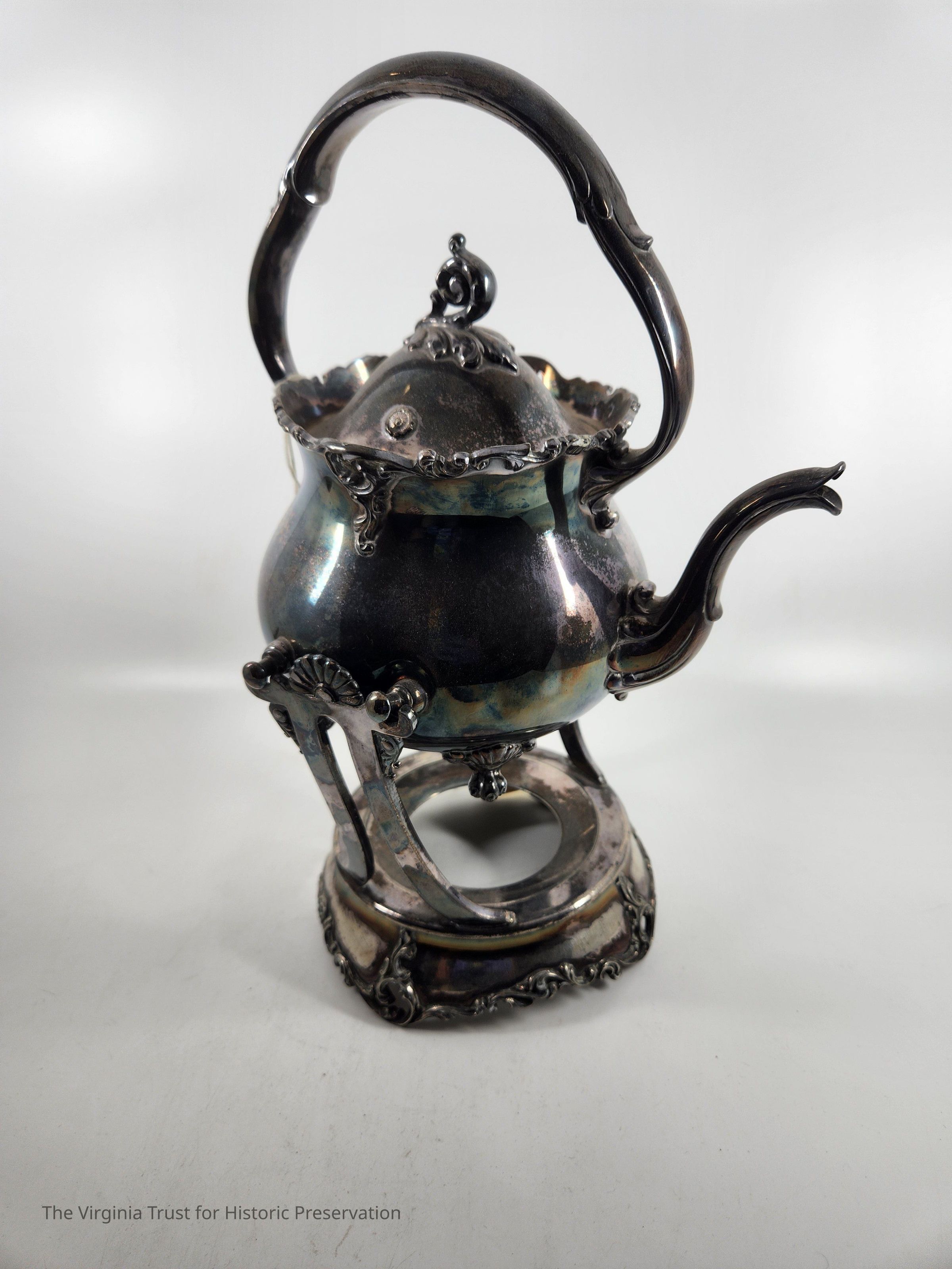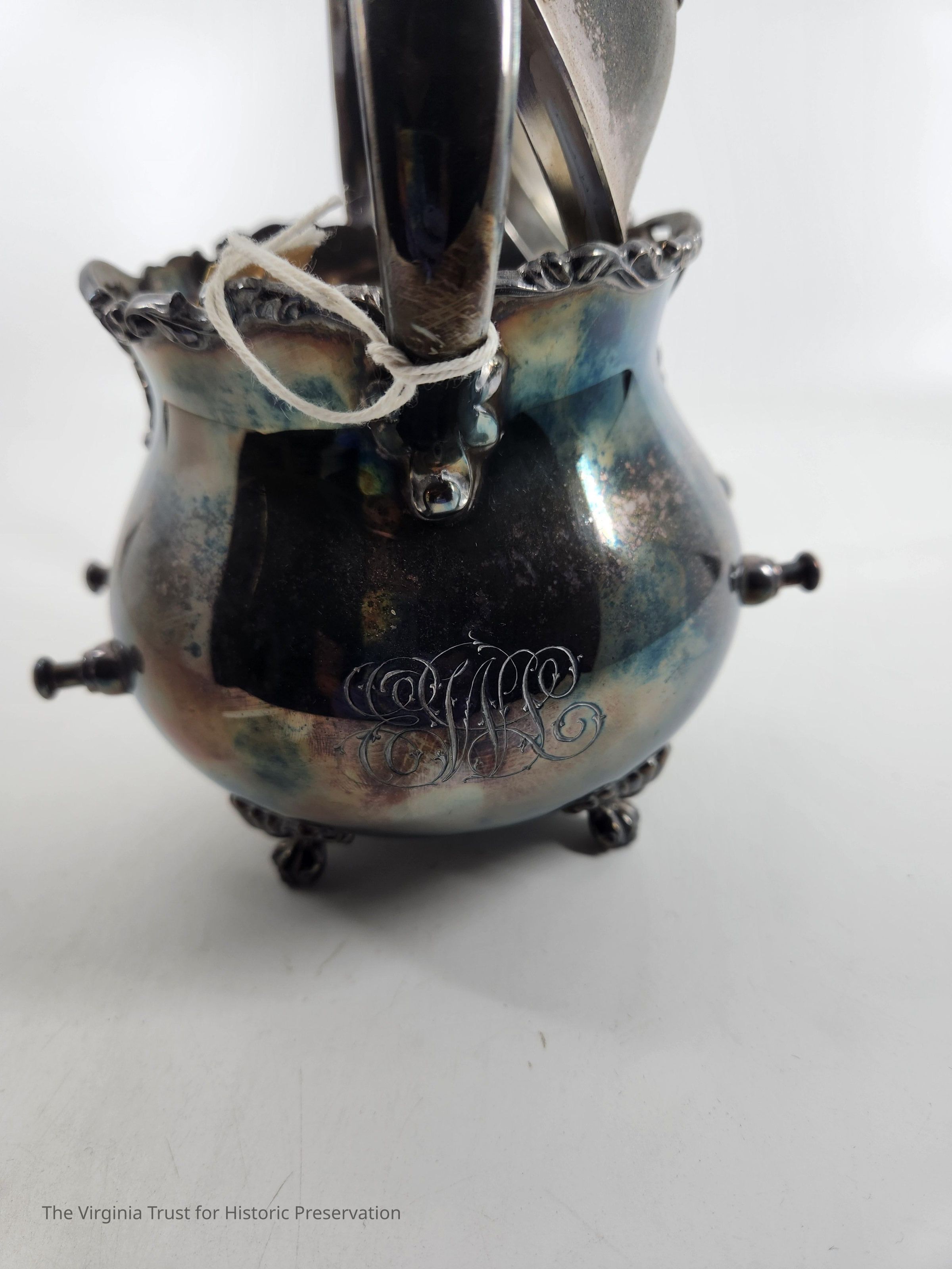 Silver plated tea pot on stand. Marked "Meriden Silver Plate Co. #1466." Monogrammed "EWL."