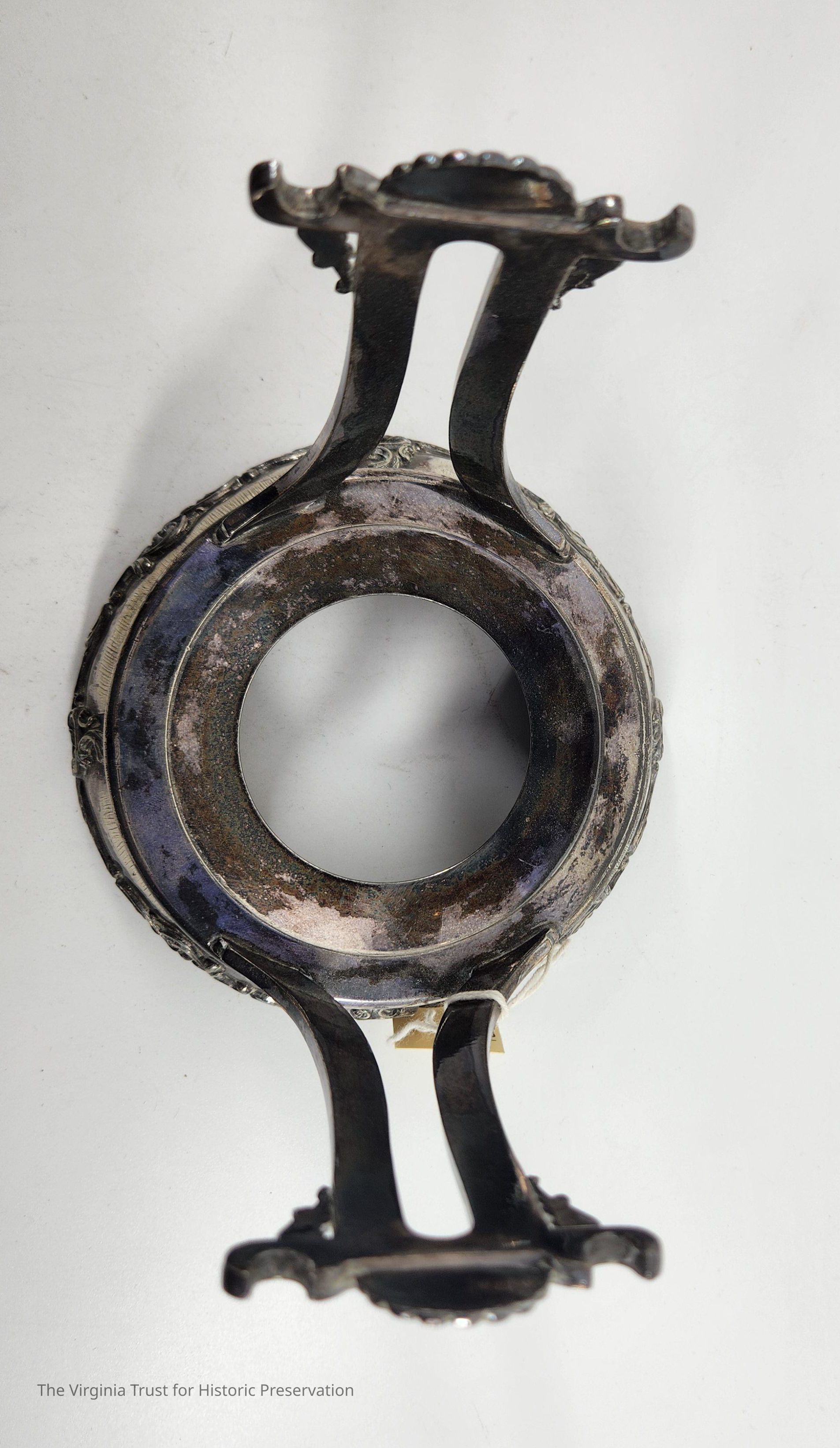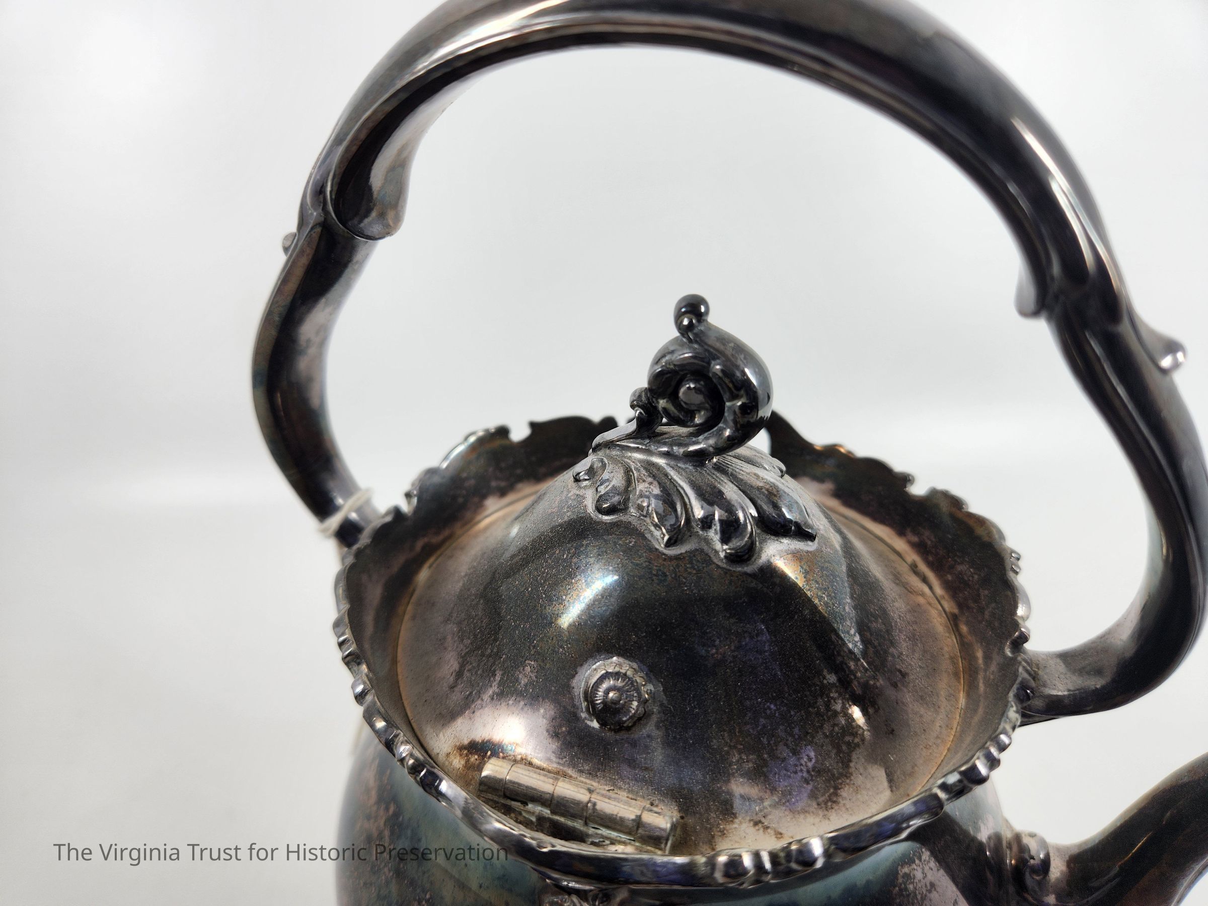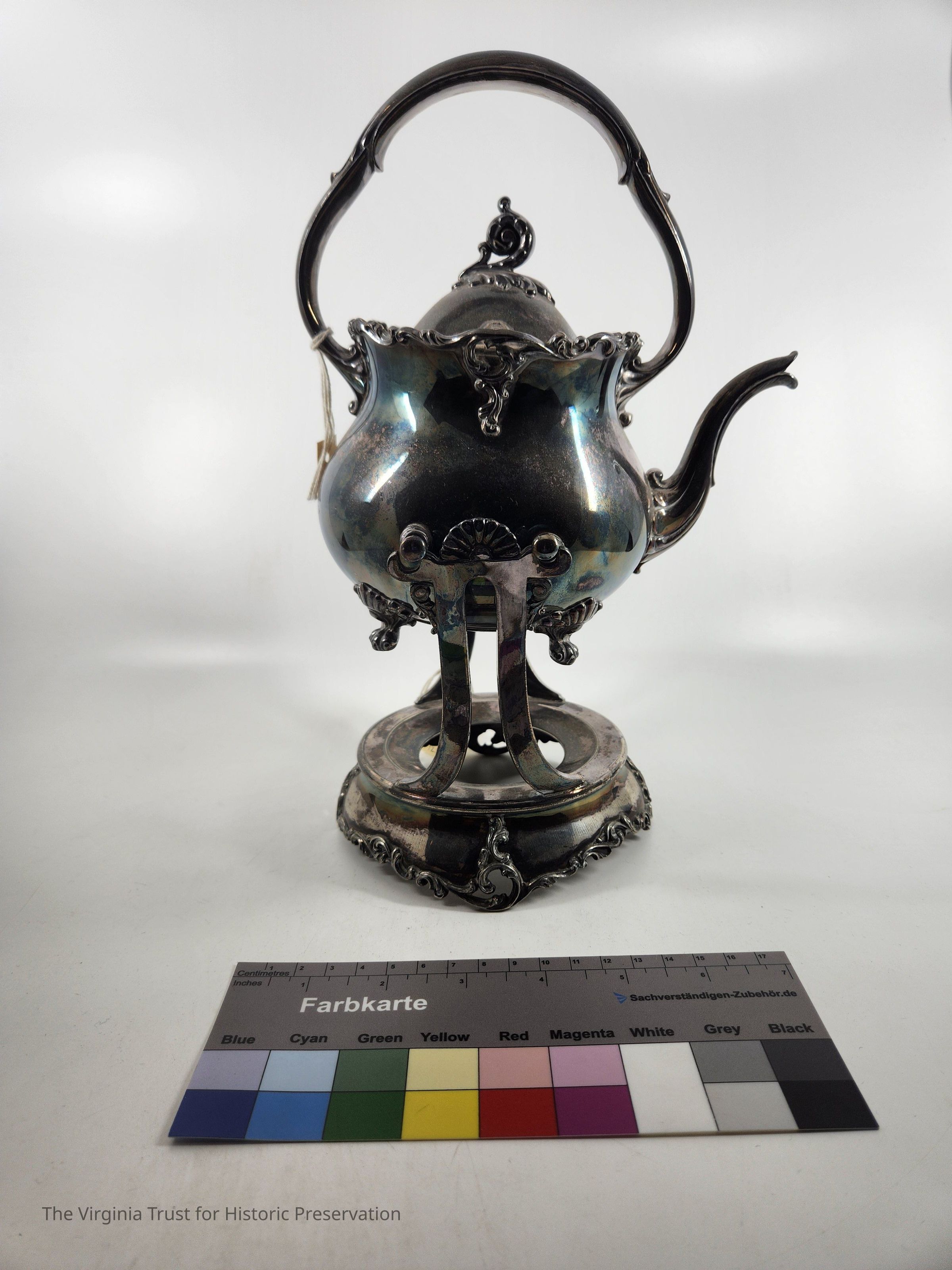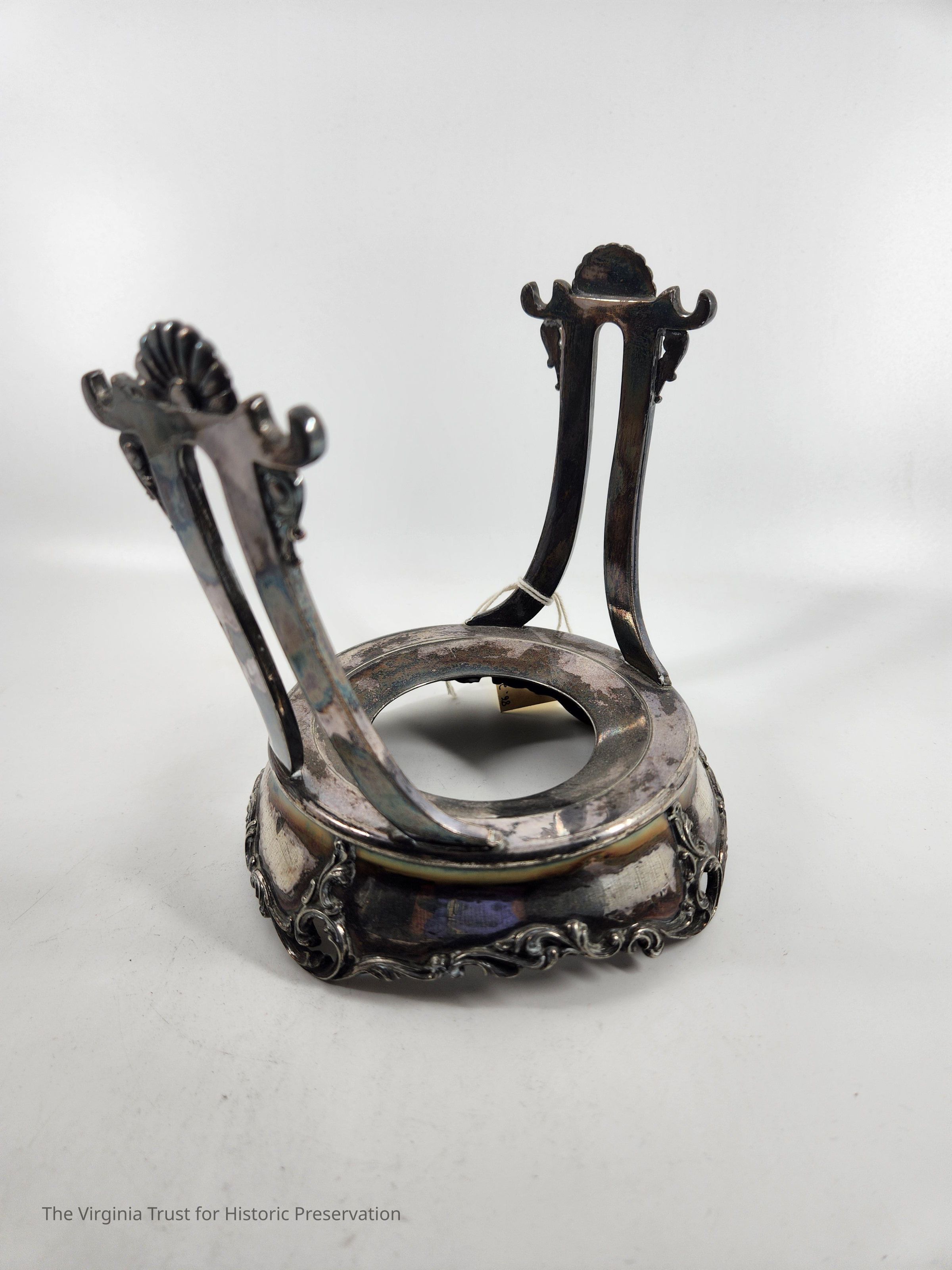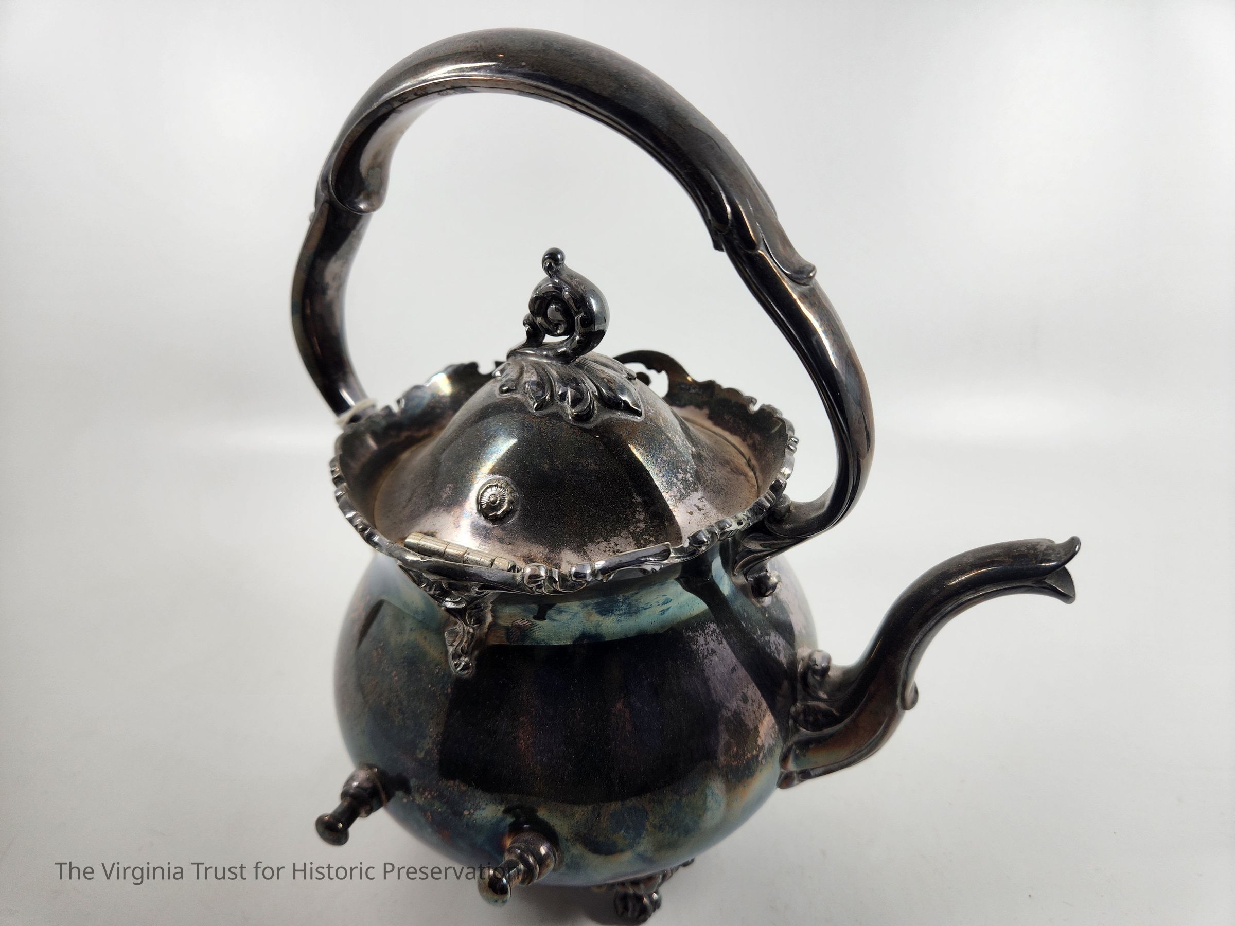 Silver plated tea pot on stand. Marked "Meriden Silver Plate Co. #1466." Monogrammed "EWL."