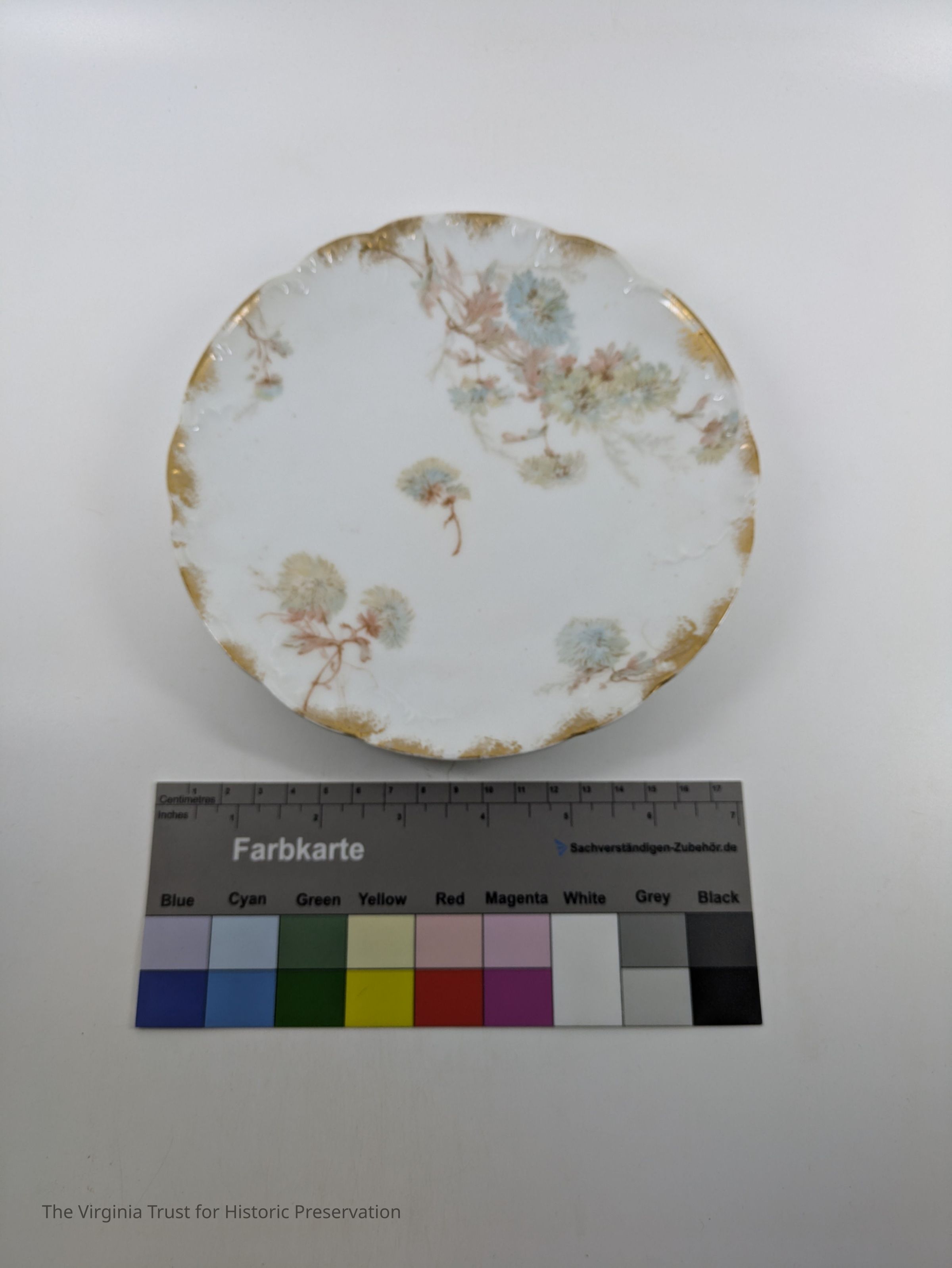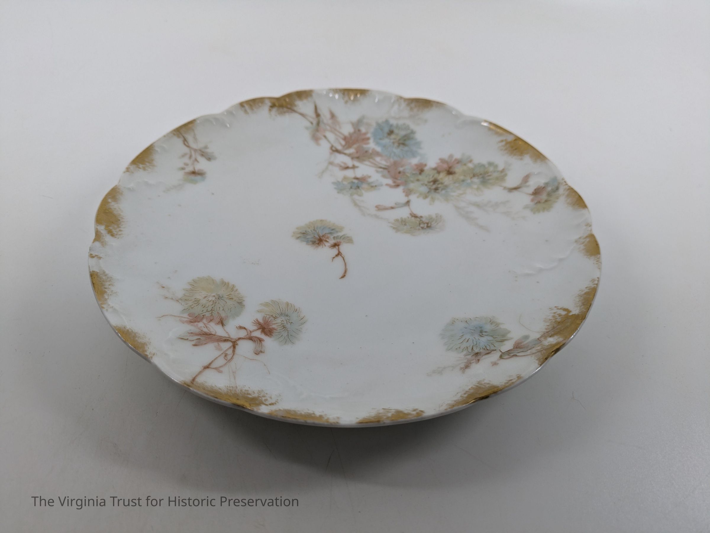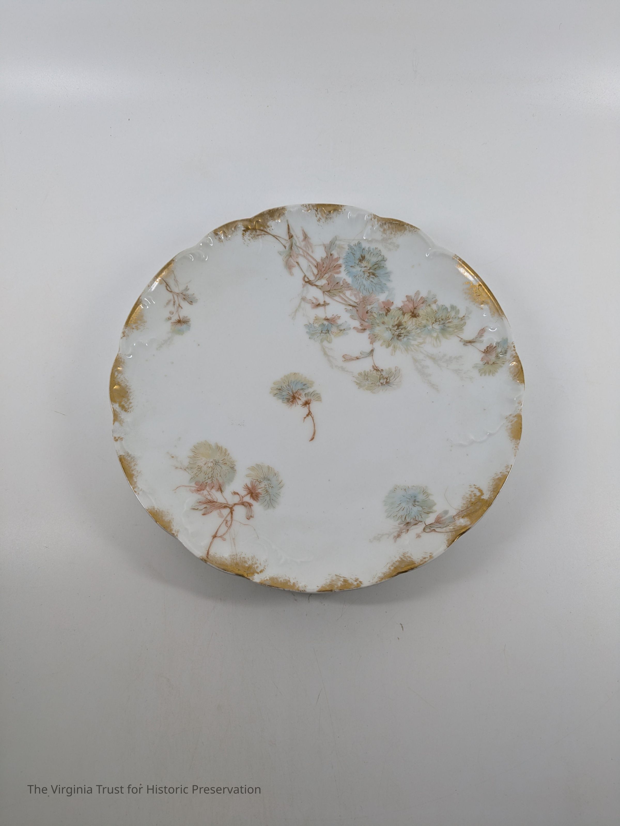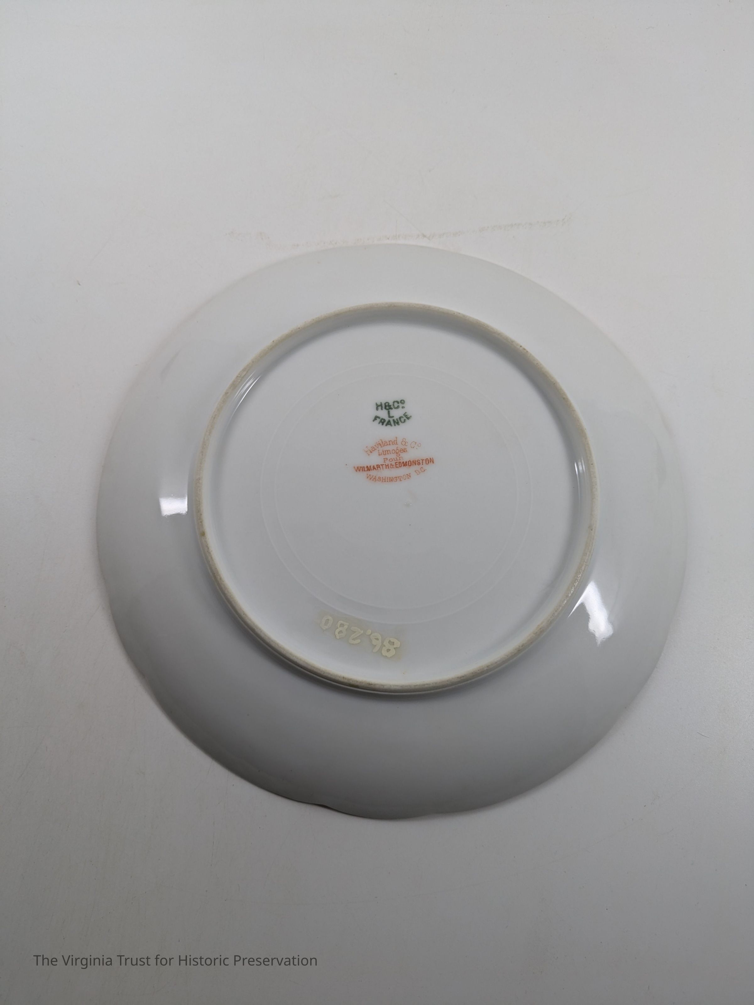 One of a set of twelve plates with pastel floral pattern and gold intermittently around the rim. Green: "H & C" France Red: "Haviland & Co. Limoges Pour Wilmarth & edmonston Washington, DC."