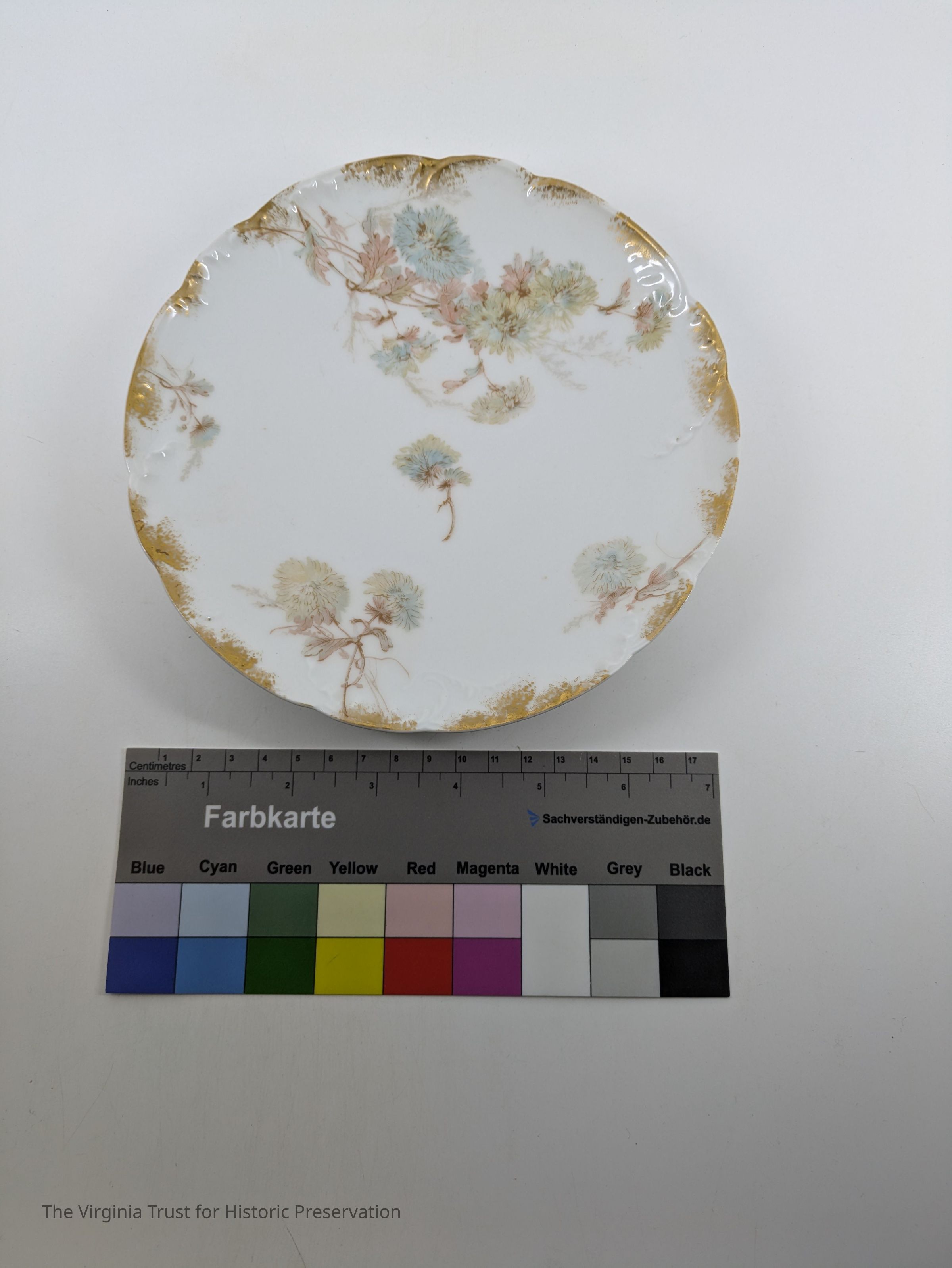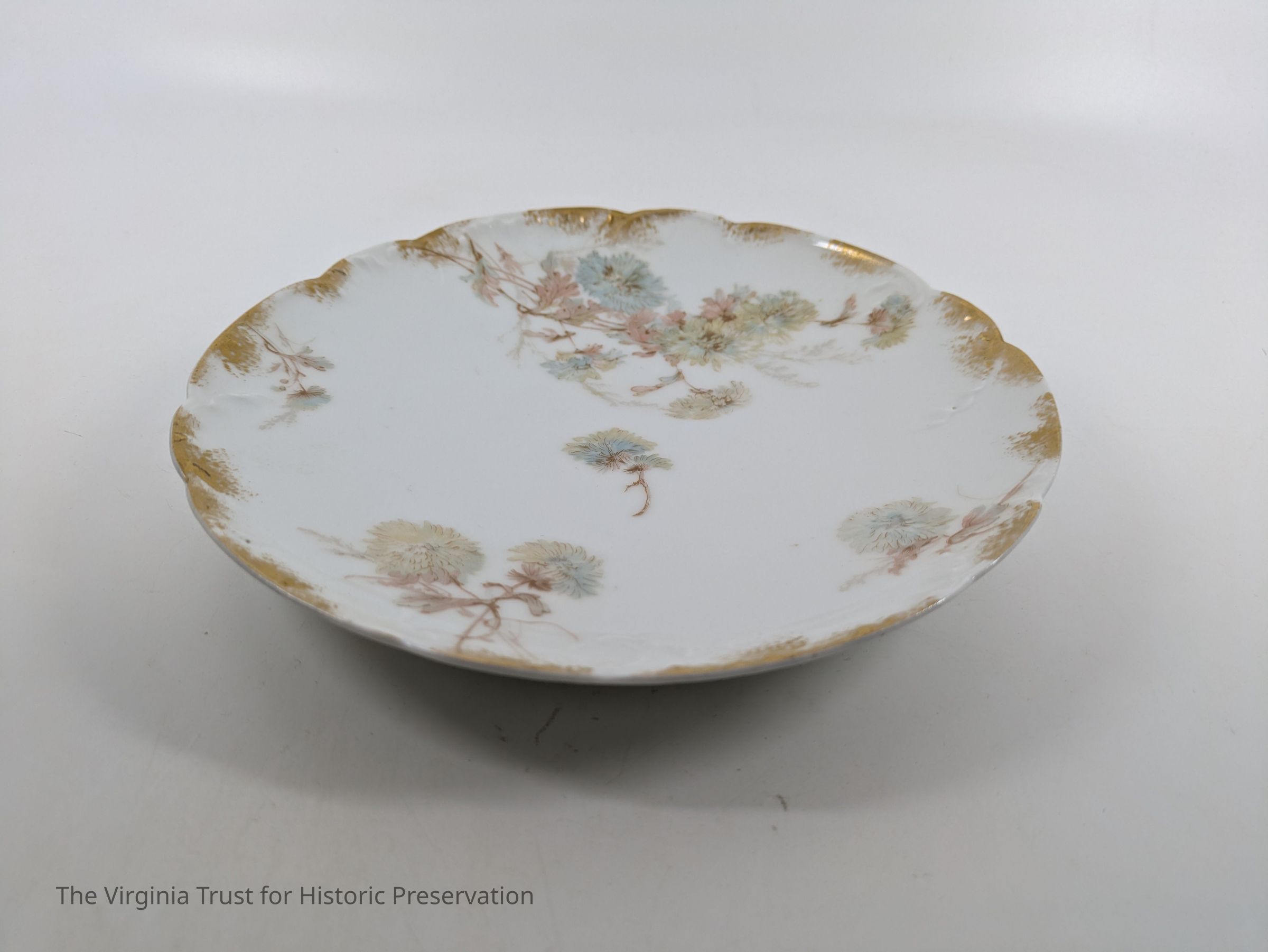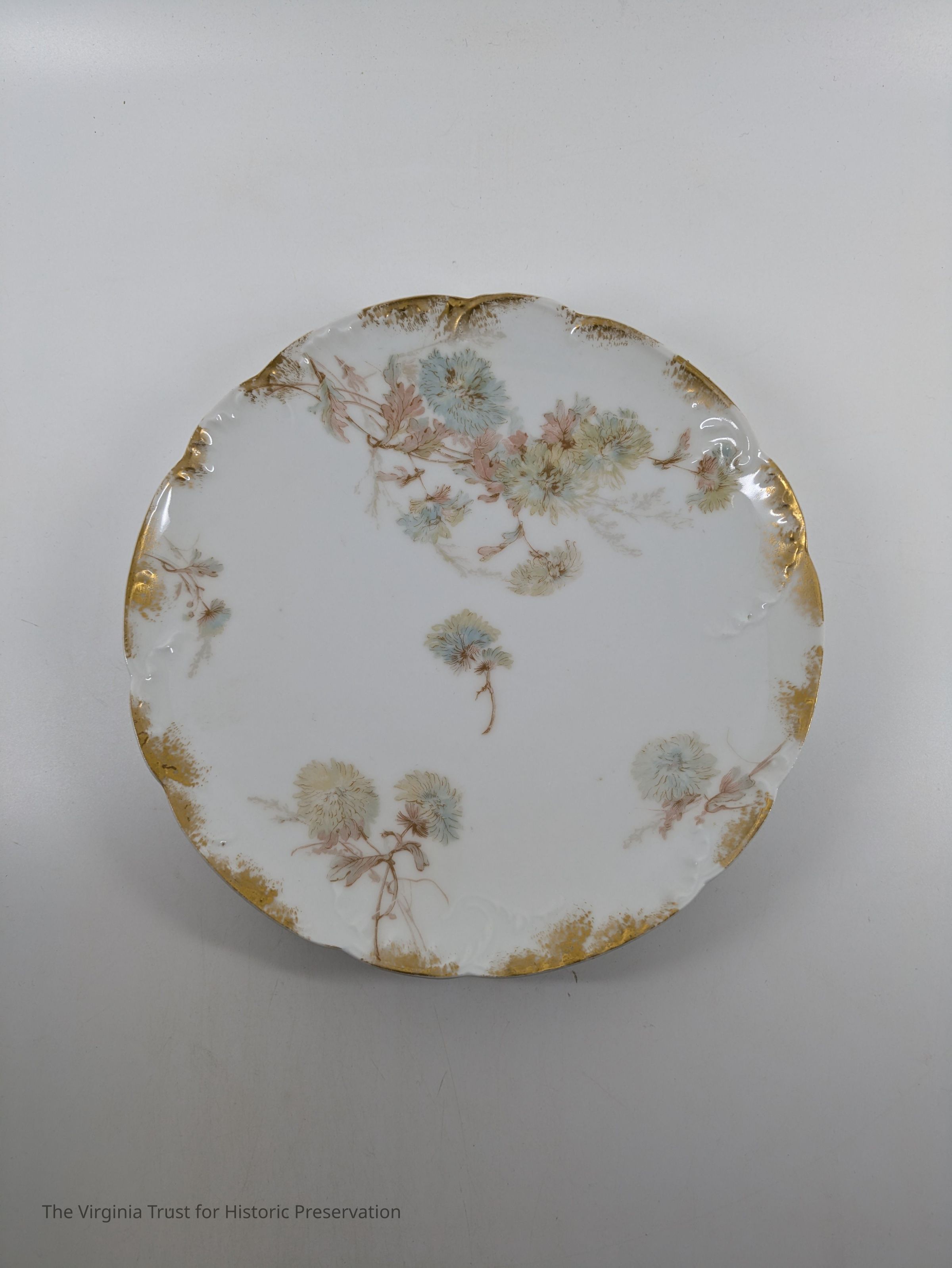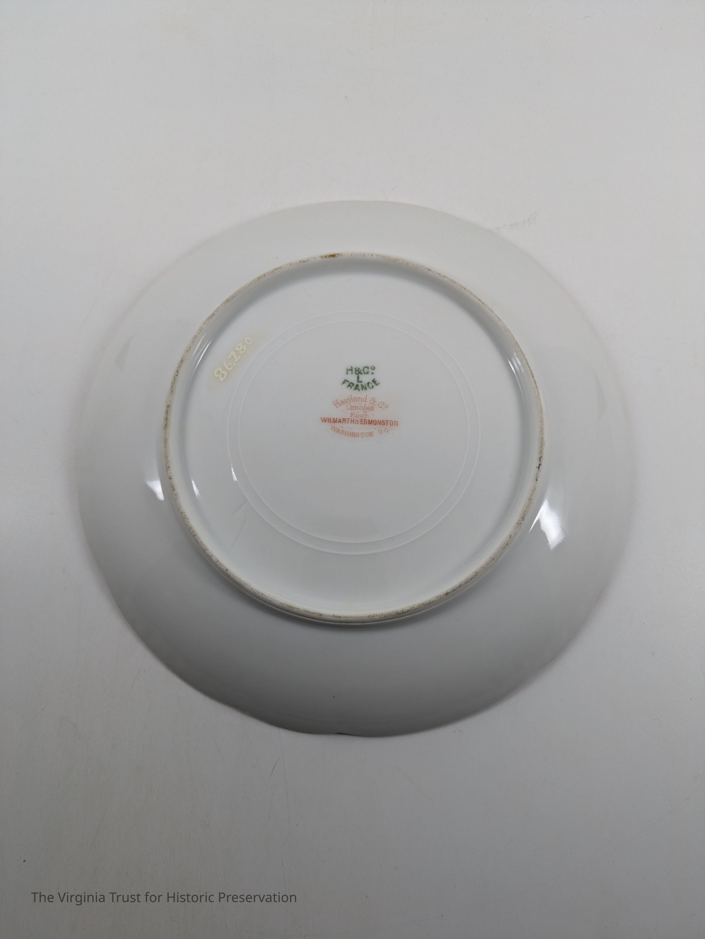One of a set of twelve plates with pastel floral pattern and gold intermittently around the rim. Green: "H & C" France Red: "Haviland & Co. Limoges Pour Wilmarth & edmonston Washington, DC."