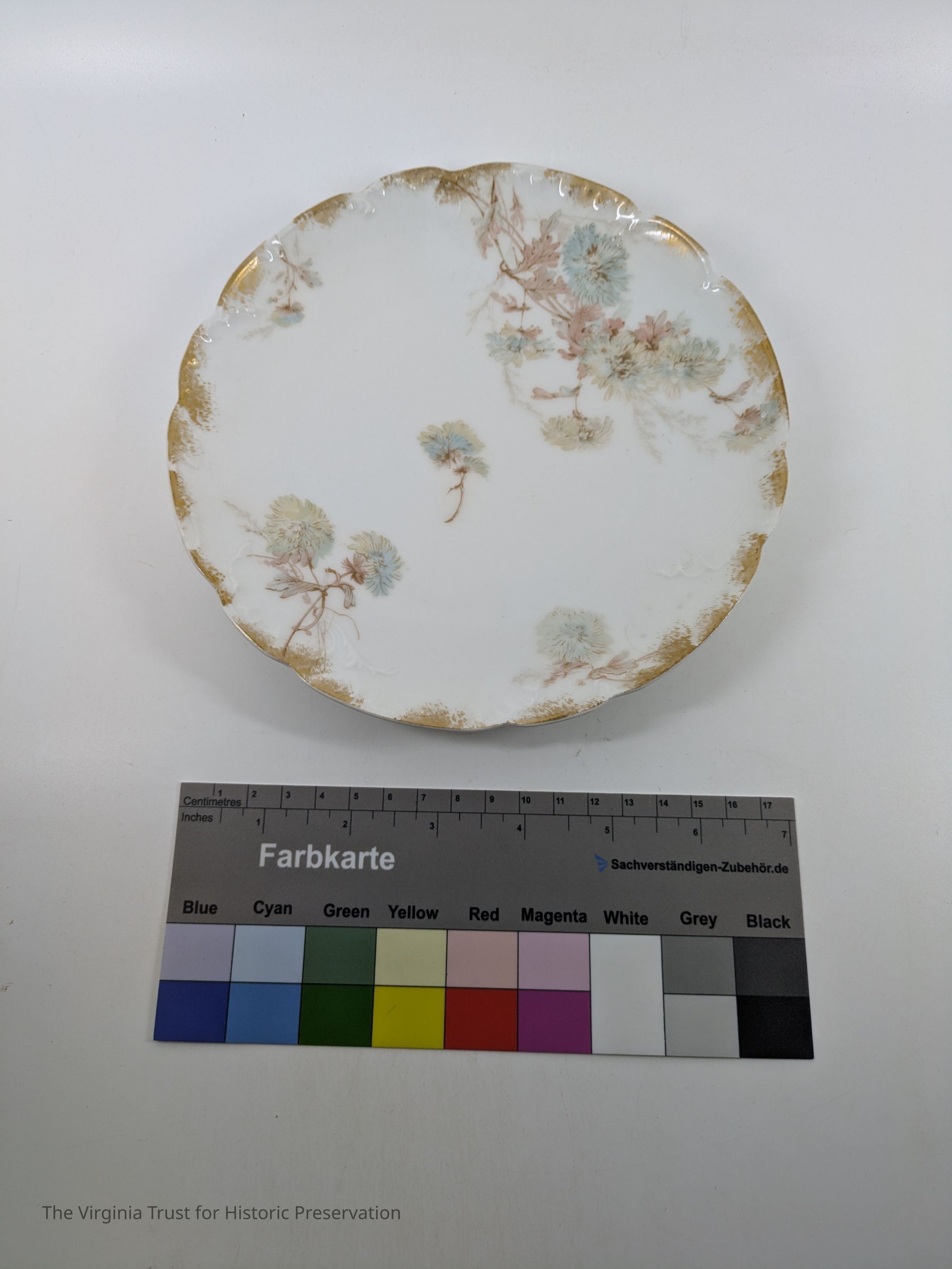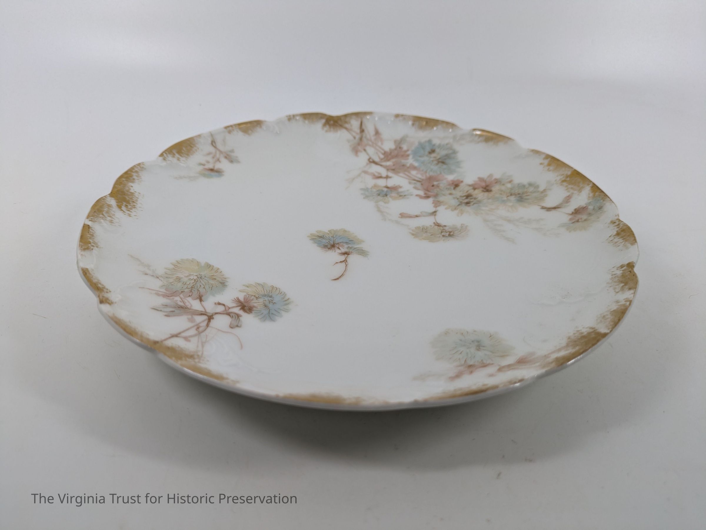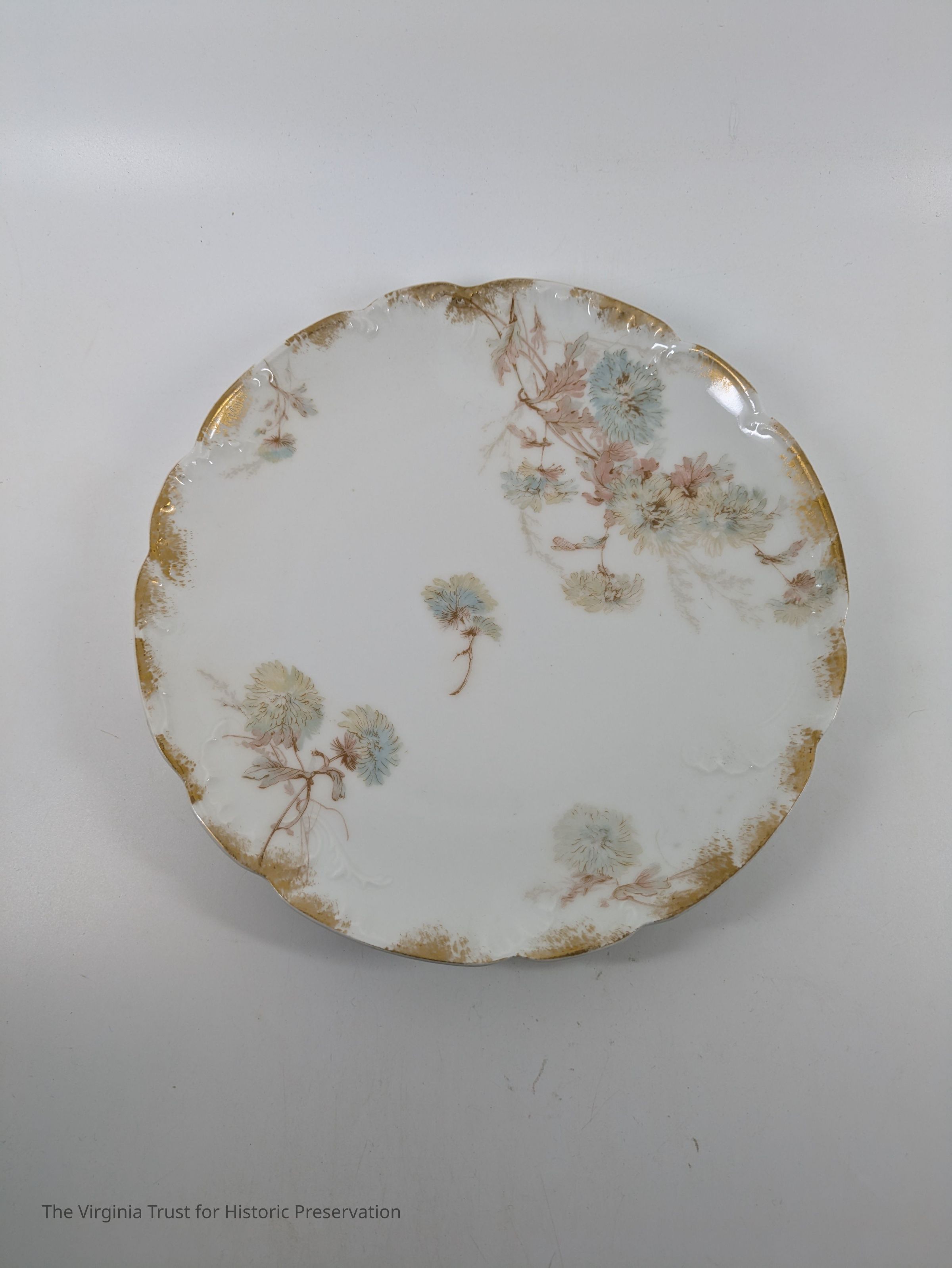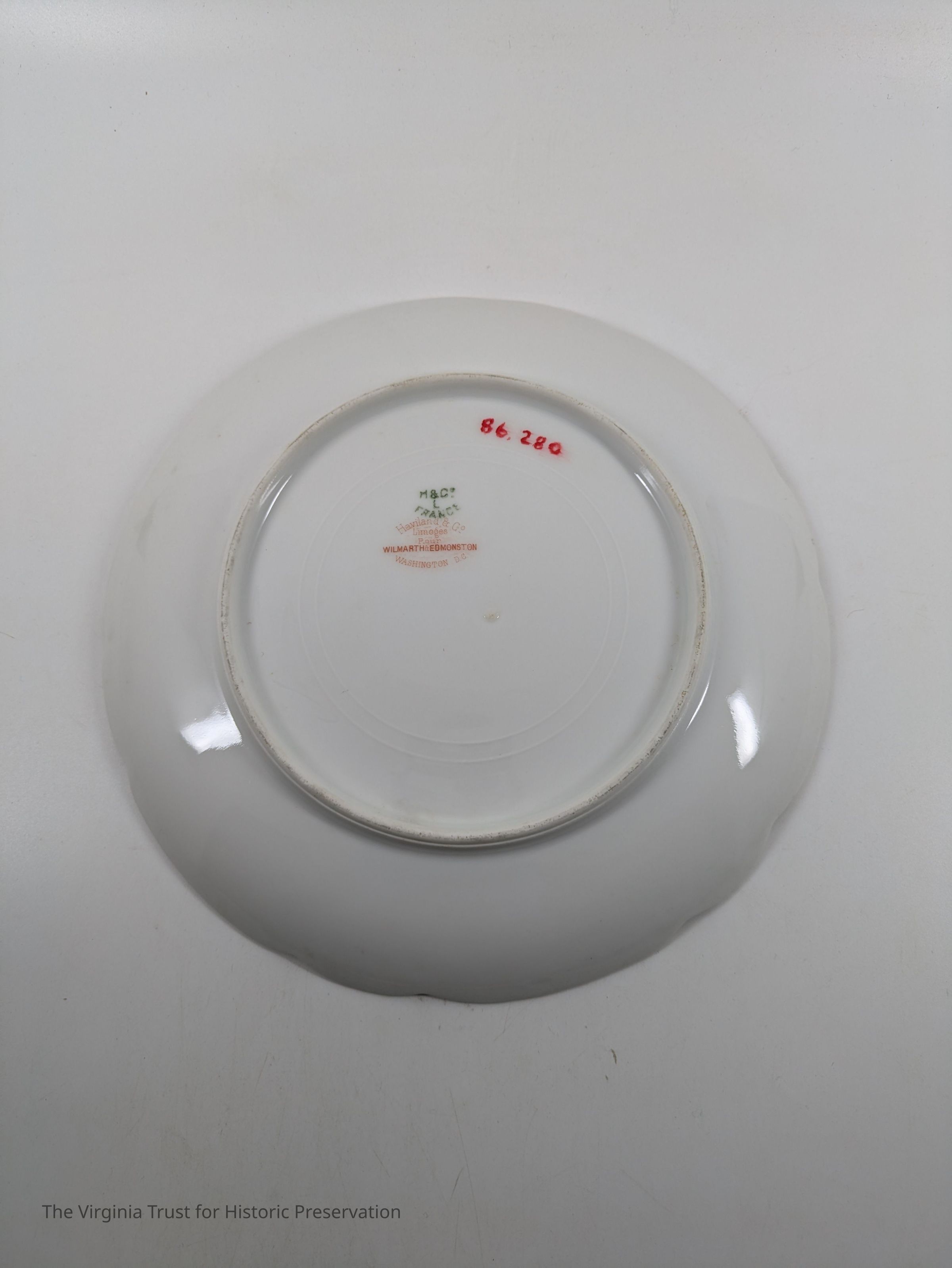 One of a set of twelve plates with pastel floral pattern and gold intermittently around the rim. Green: "H & C" France Red: "Haviland & Co. Limoges Pour Wilmarth & edmonston Washington, DC."