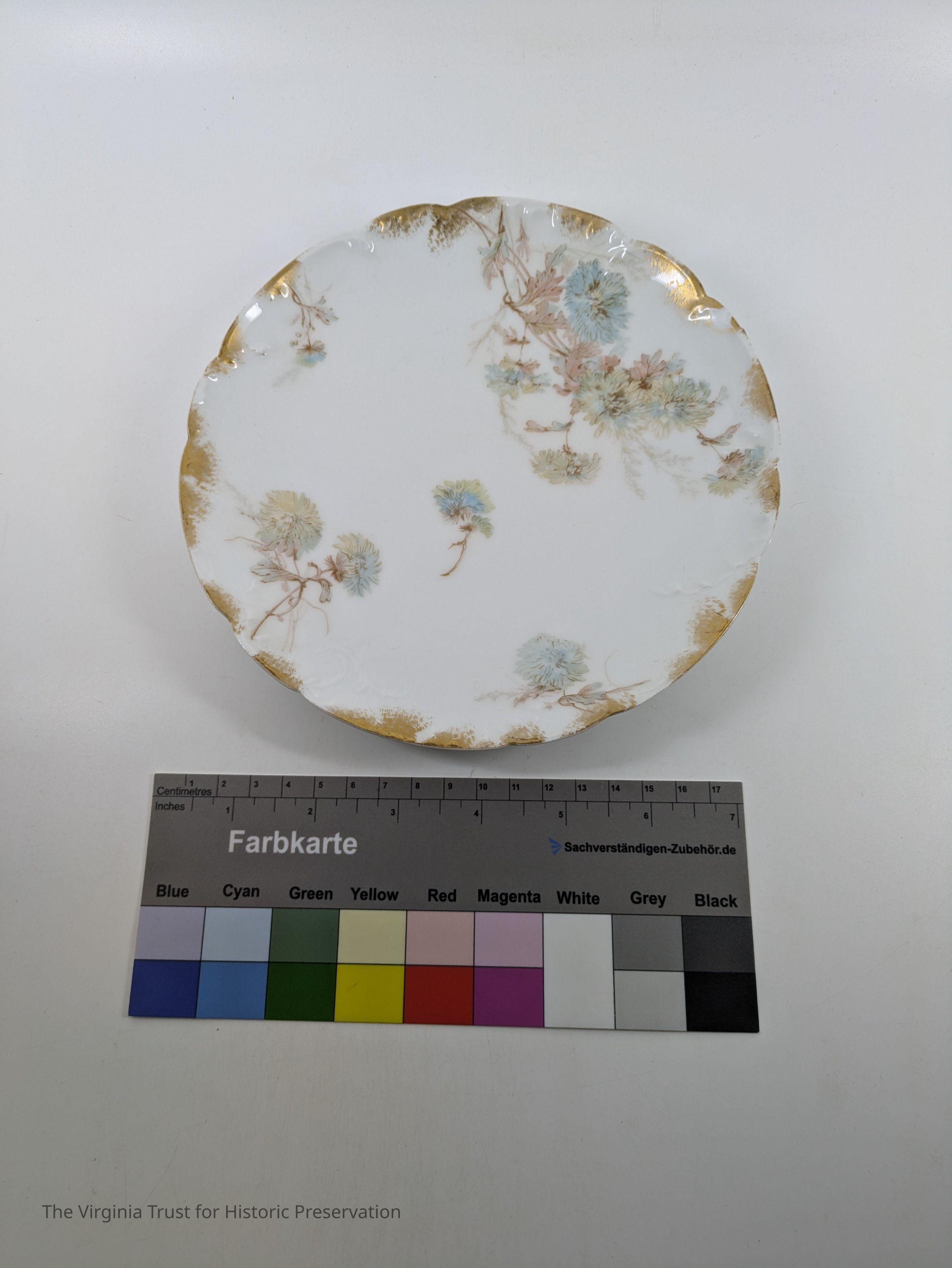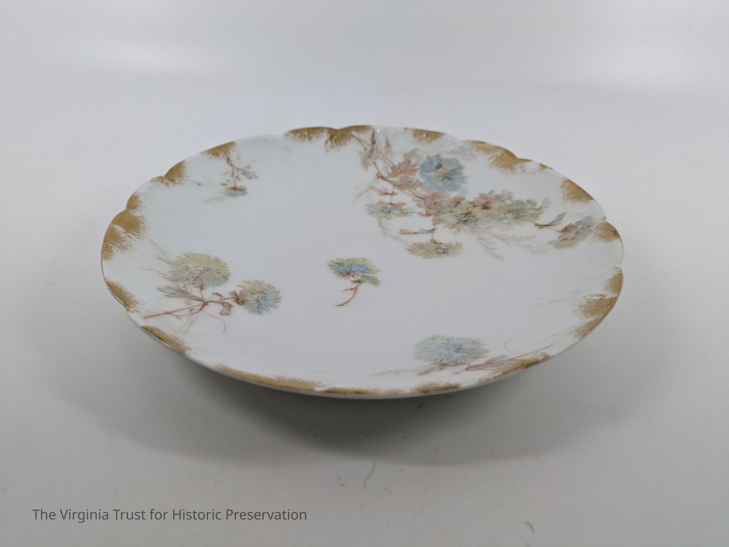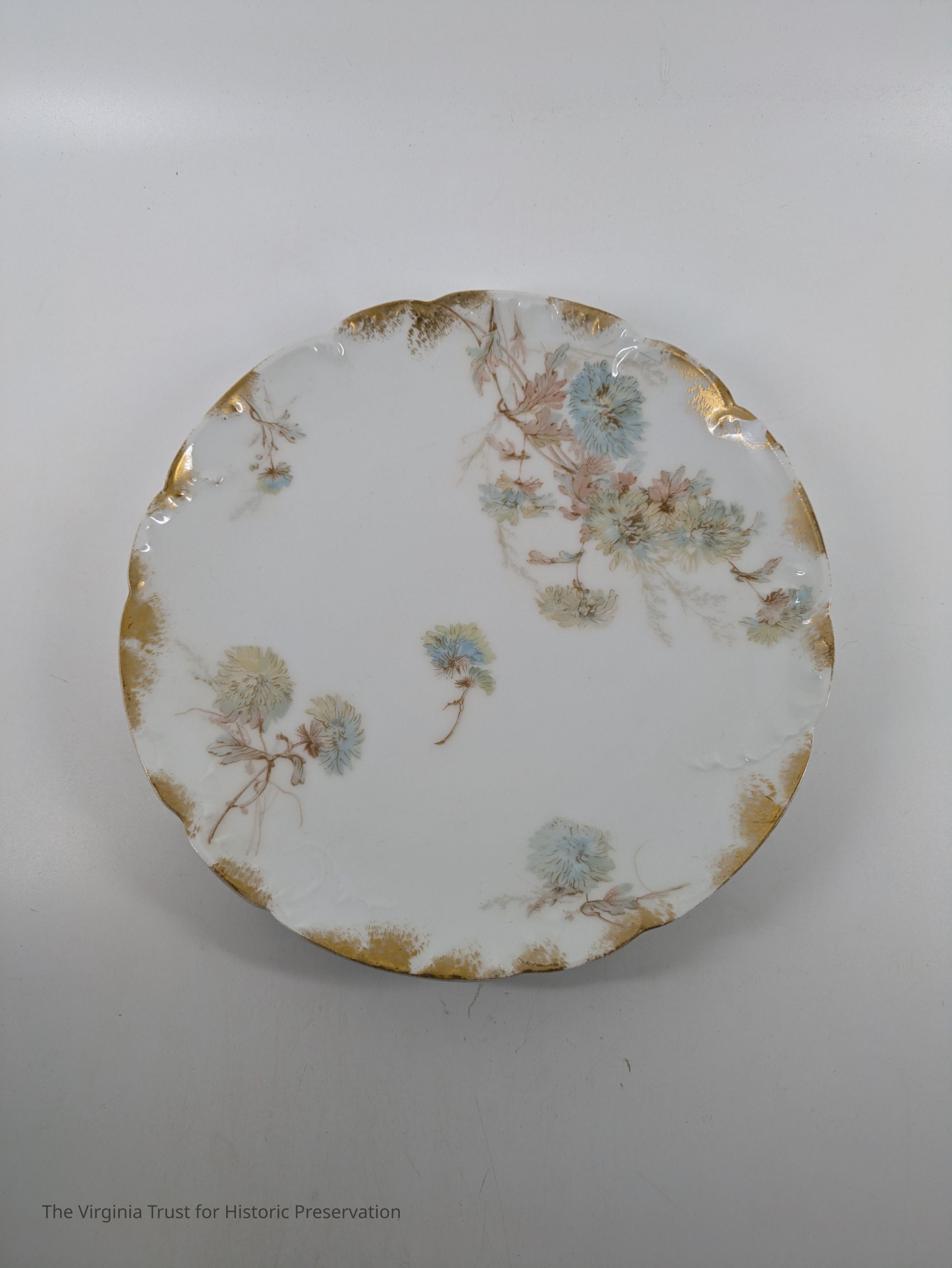 One of a set of twelve plates with pastel floral pattern and gold intermittently around the rim. Green: "H & C" France Red: "Haviland & Co. Limoges Pour Wilmarth & edmonston Washington, DC."