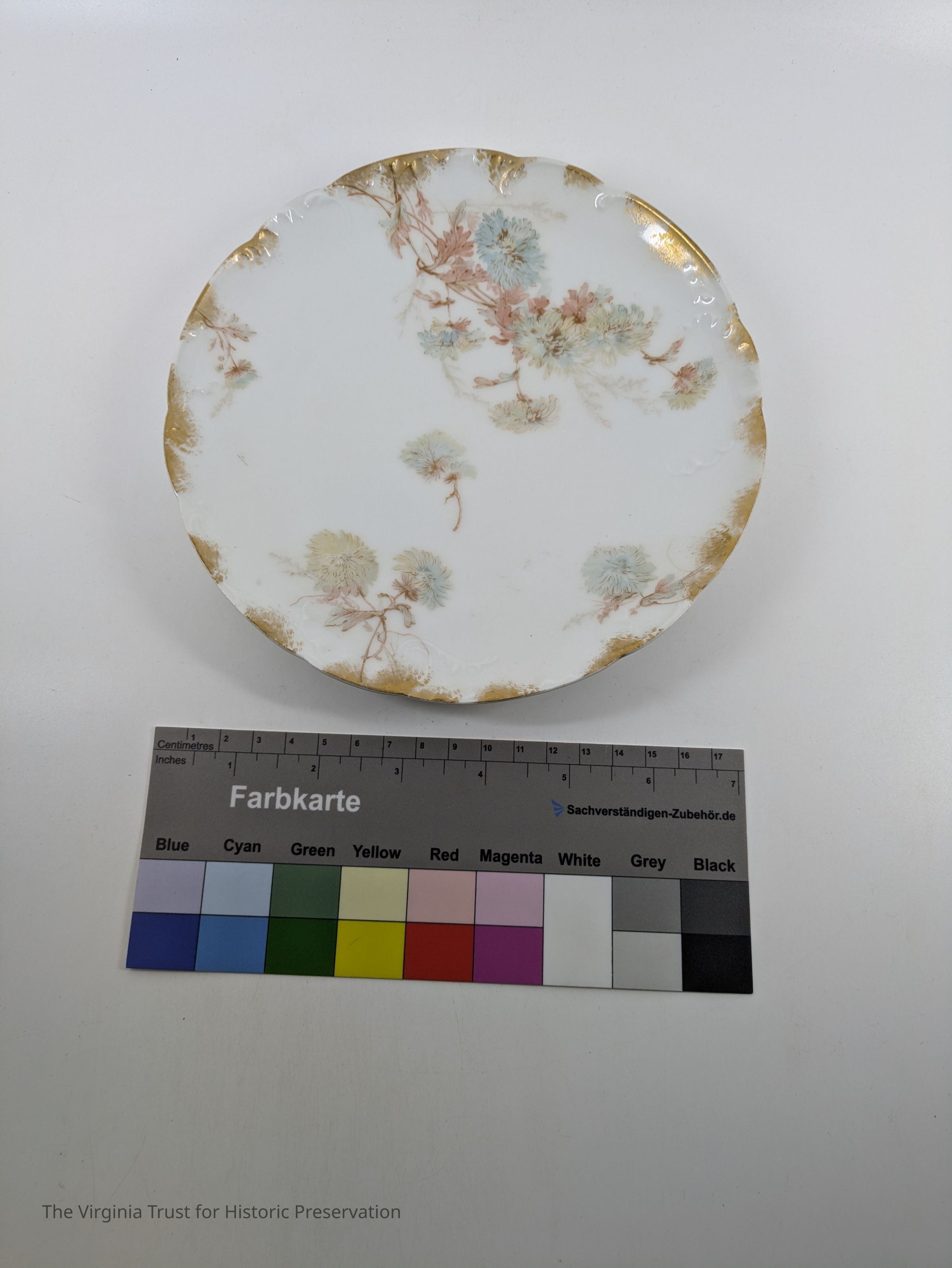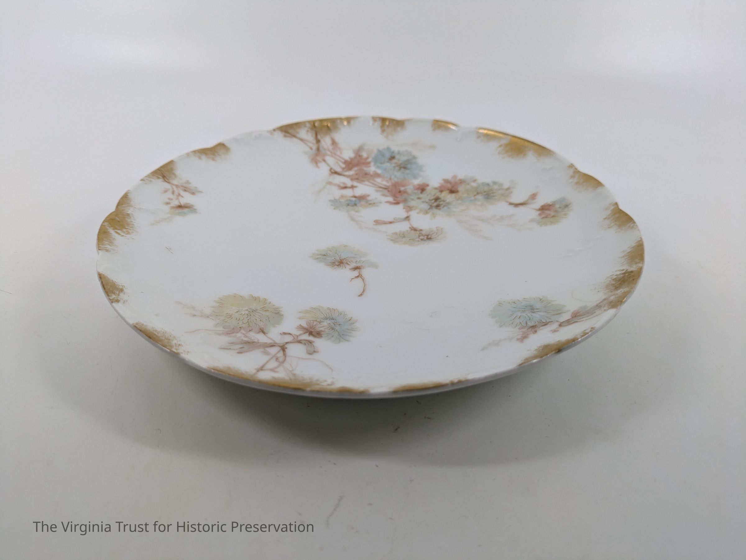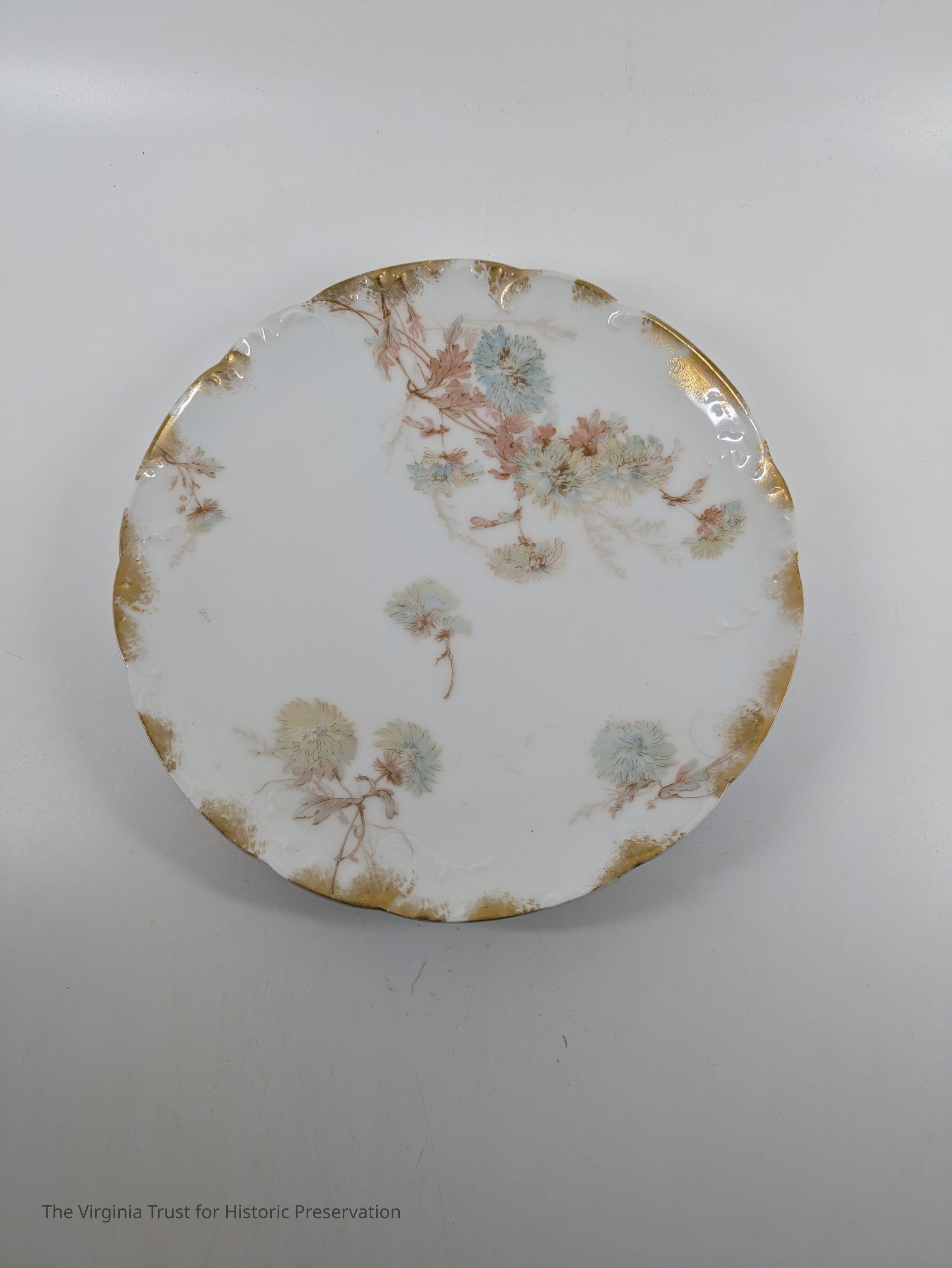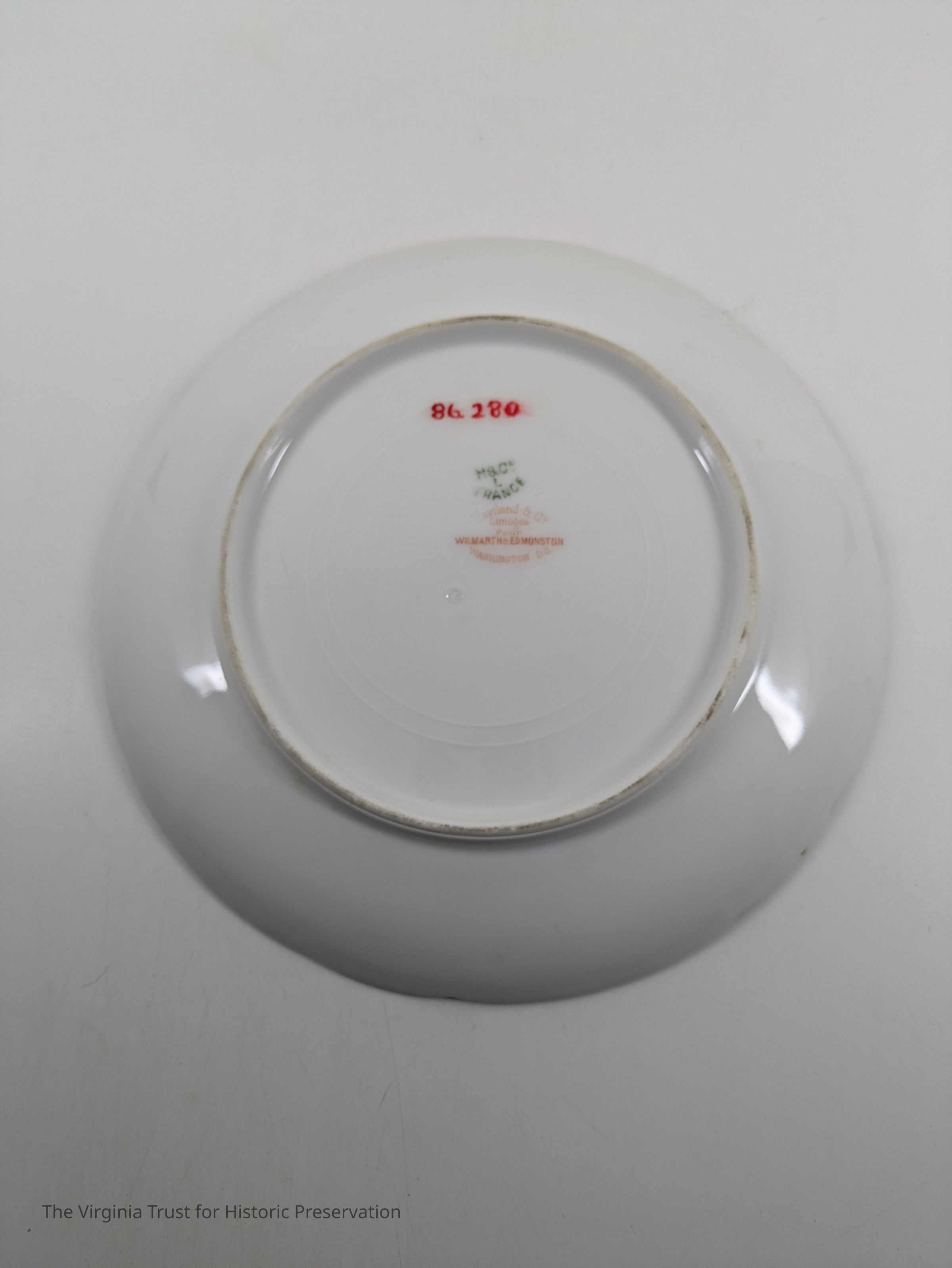 One of a set of twelve plates with pastel floral pattern and gold intermittently around the rim. Green: "H & C" France Red: "Haviland & Co. Limoges Pour Wilmarth & edmonston Washington, DC."