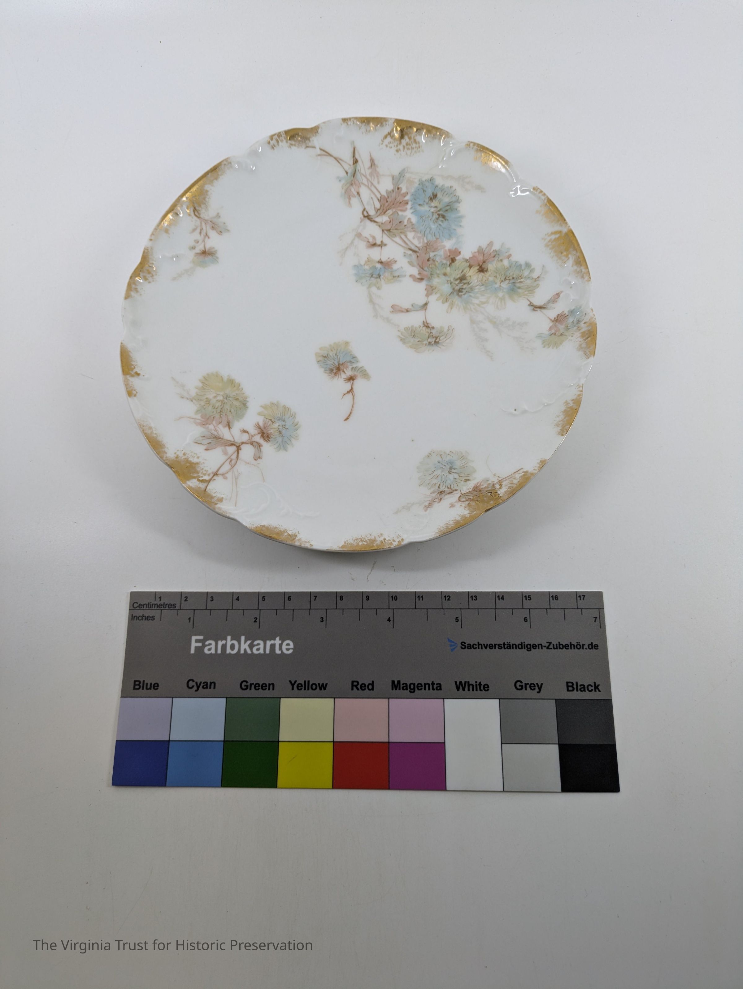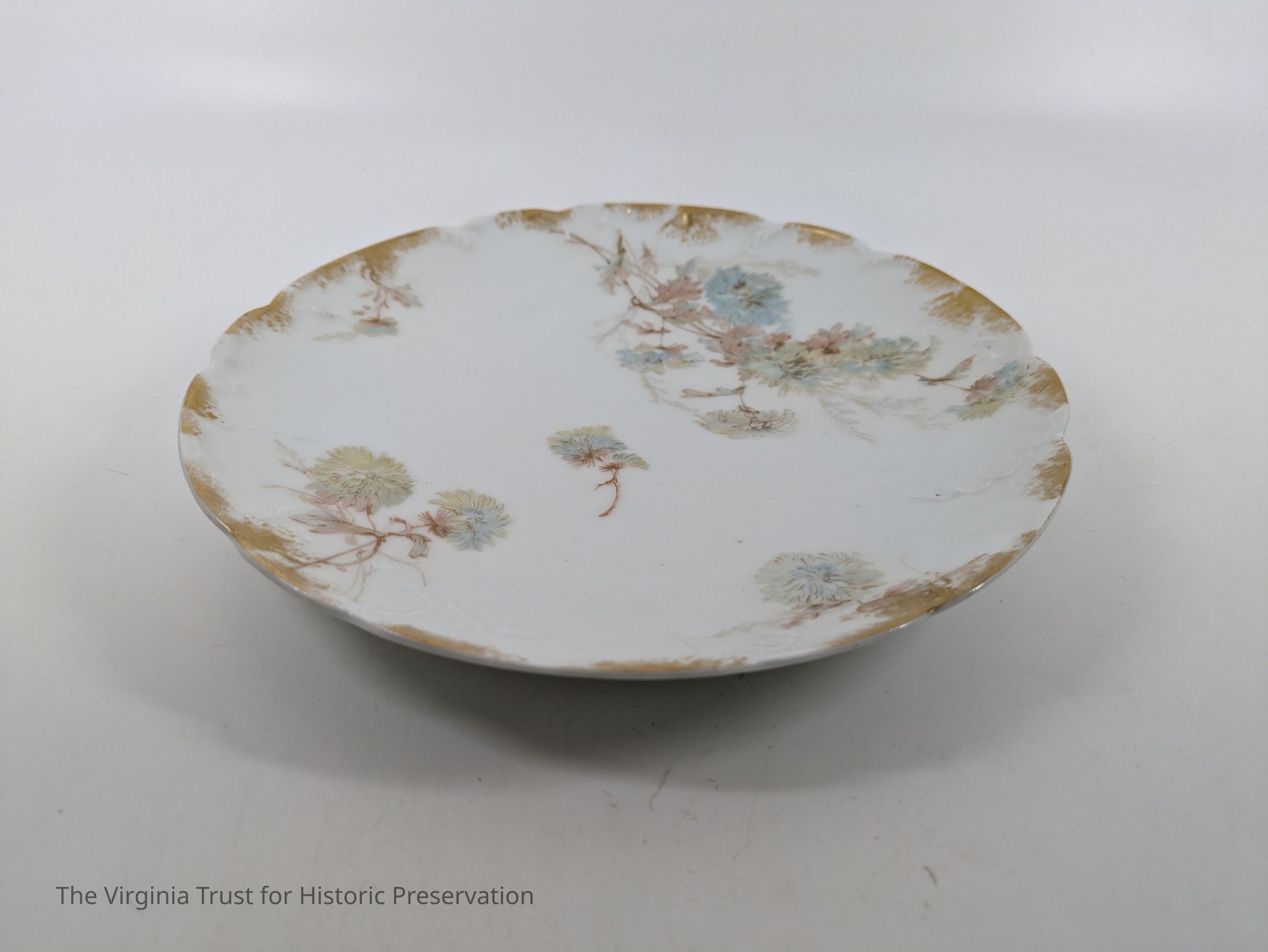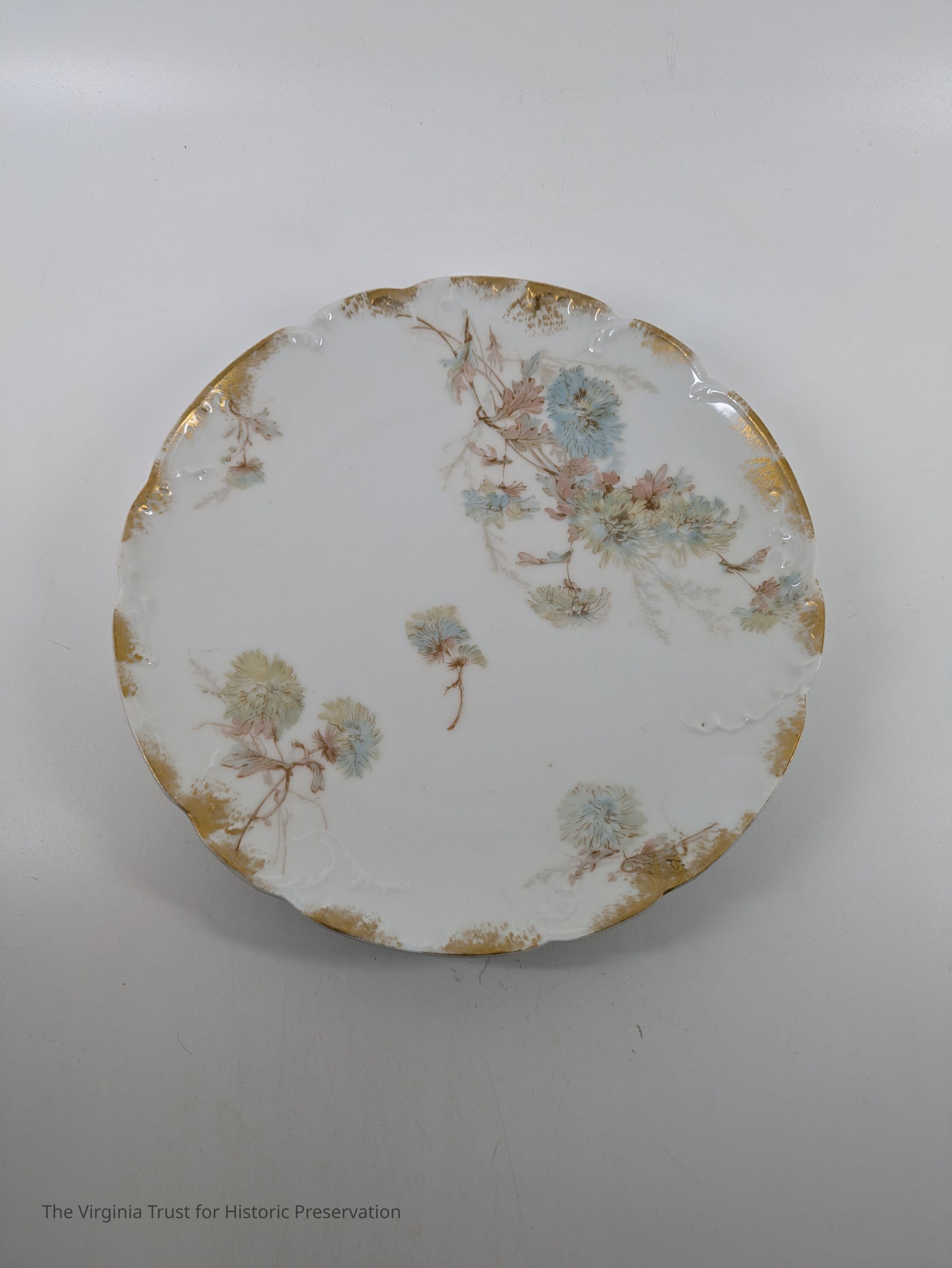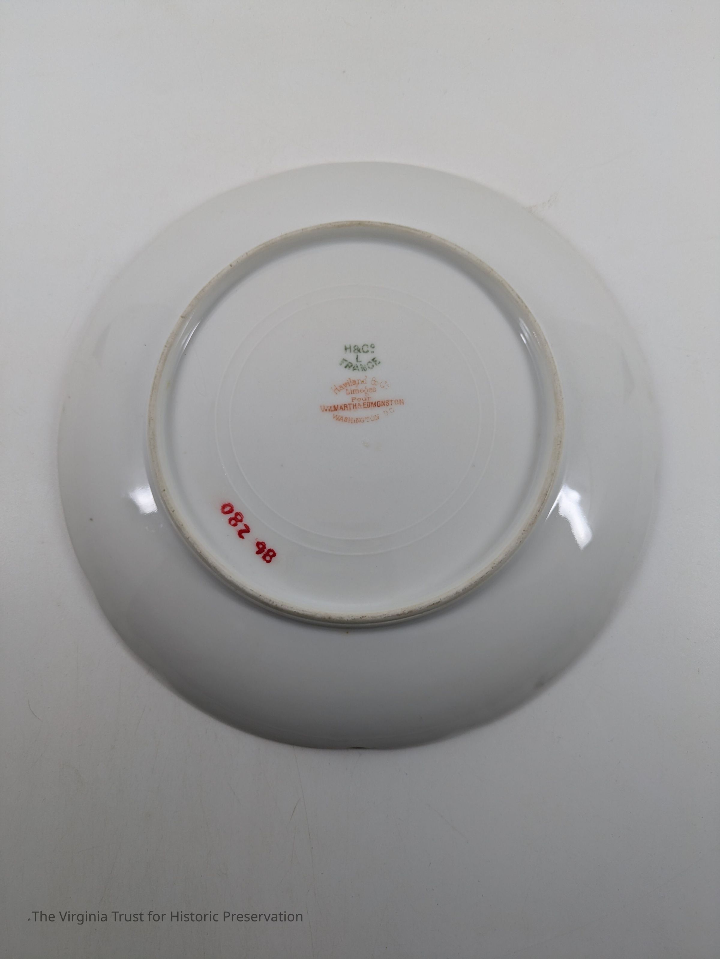 One of a set of twelve plates with pastel floral pattern and gold intermittently around the rim. Green: "H & C" France Red: "Haviland & Co. Limoges Pour Wilmarth & edmonston Washington, DC."