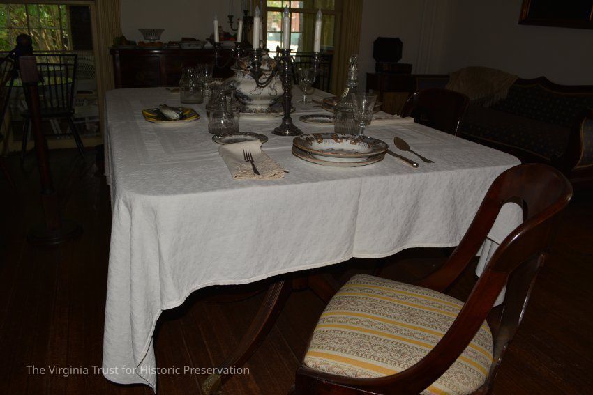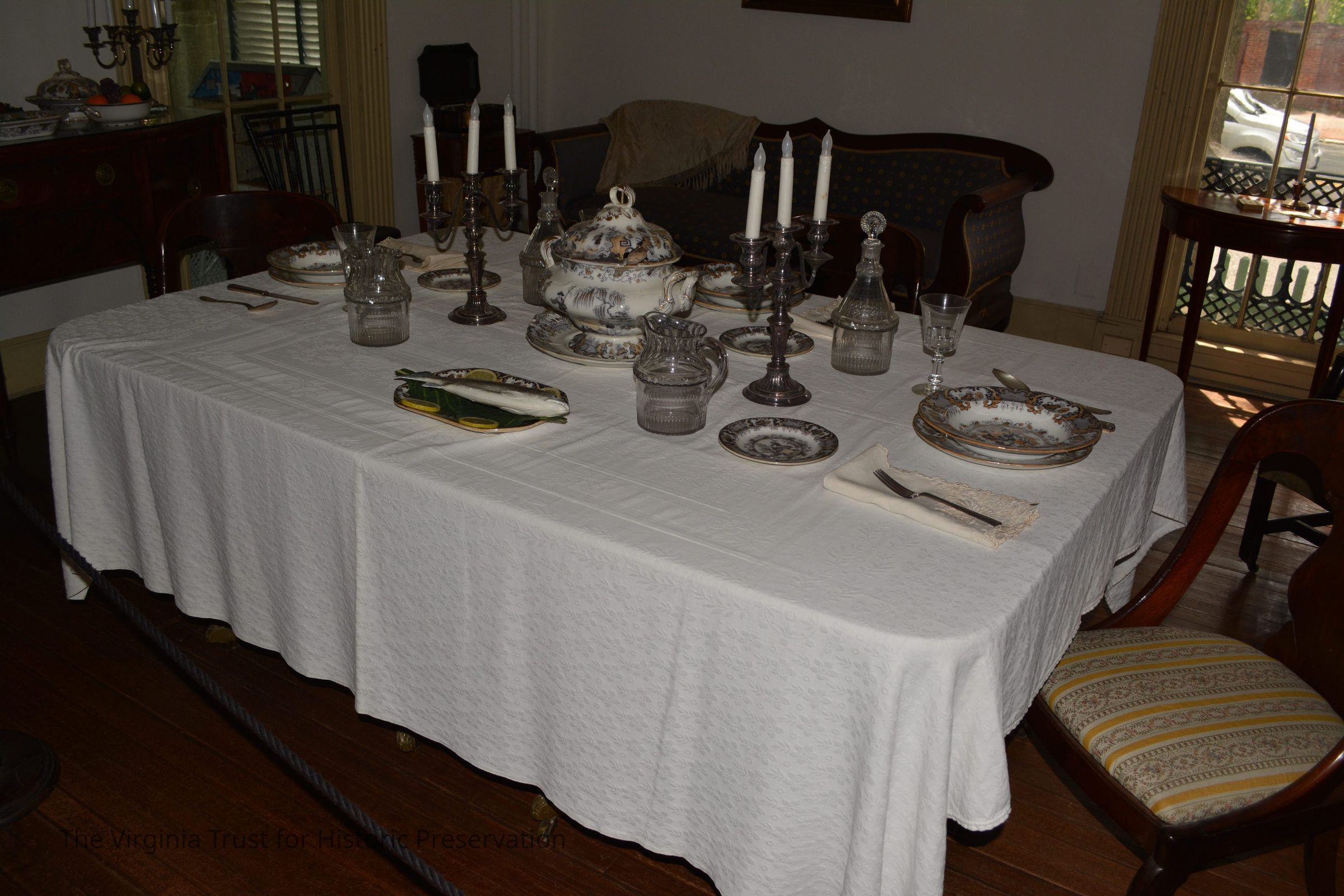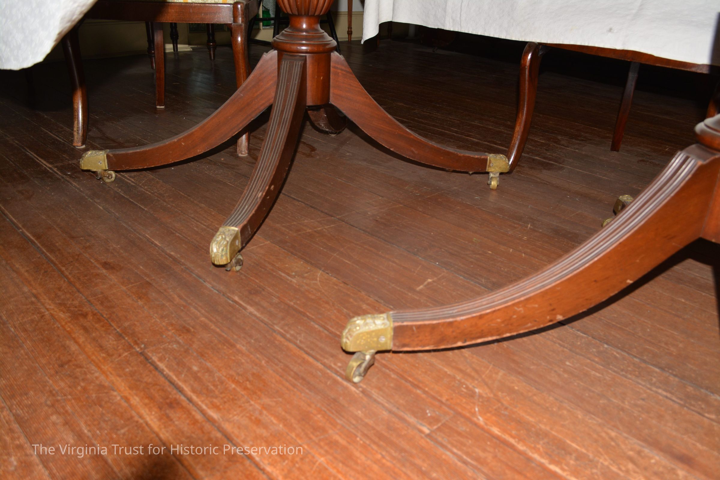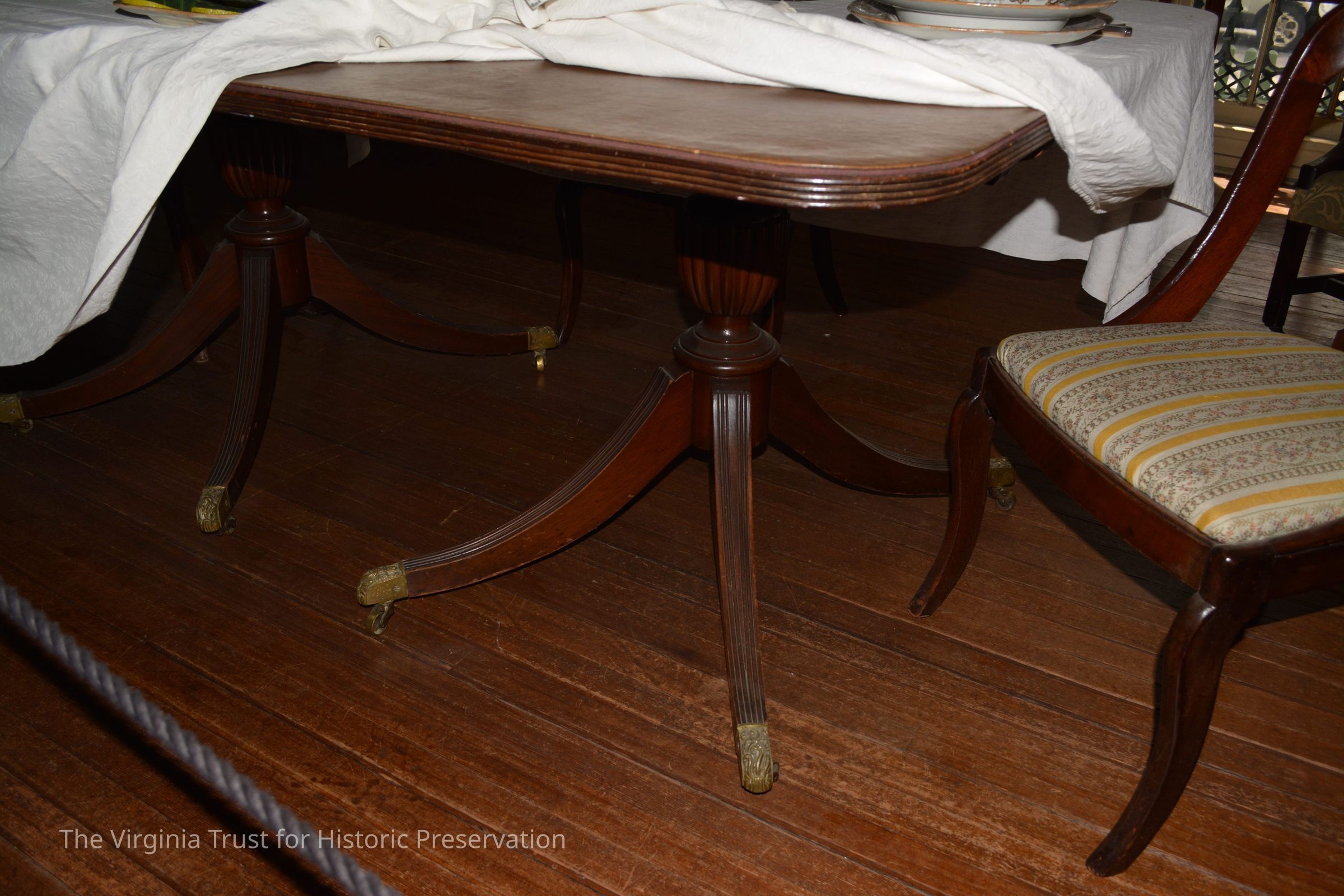 Nineteenth century Duncan Phyfe style dining room table. Two pedestal center legs. Table top has been restored. Two extra leaves in South Collection Room. Table includes casters so that it can be rolled from room to room.Dimensions