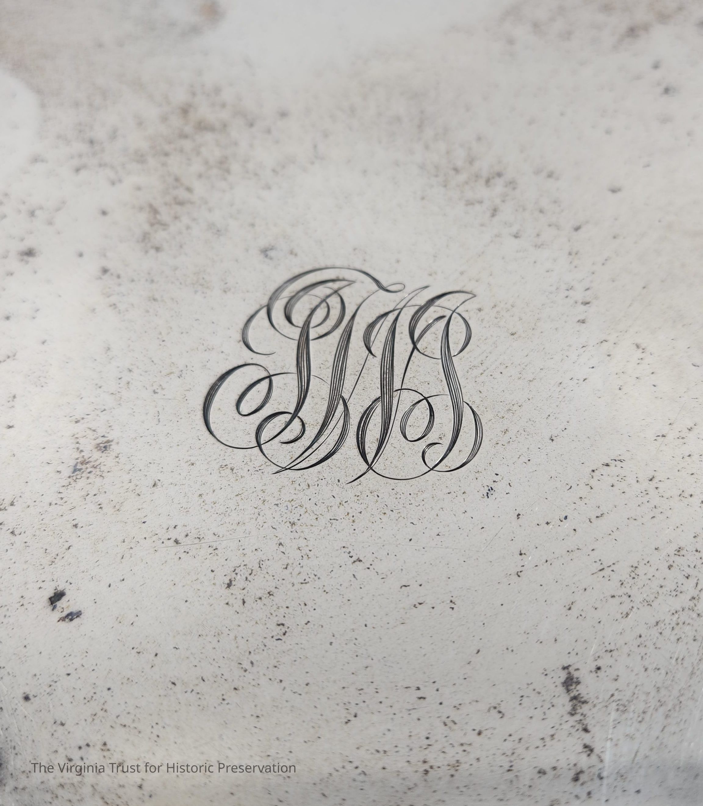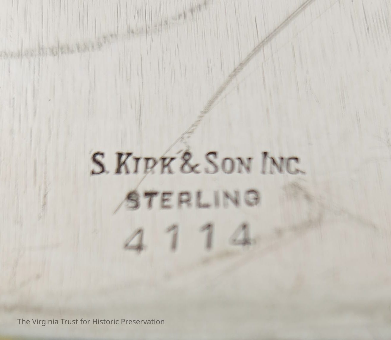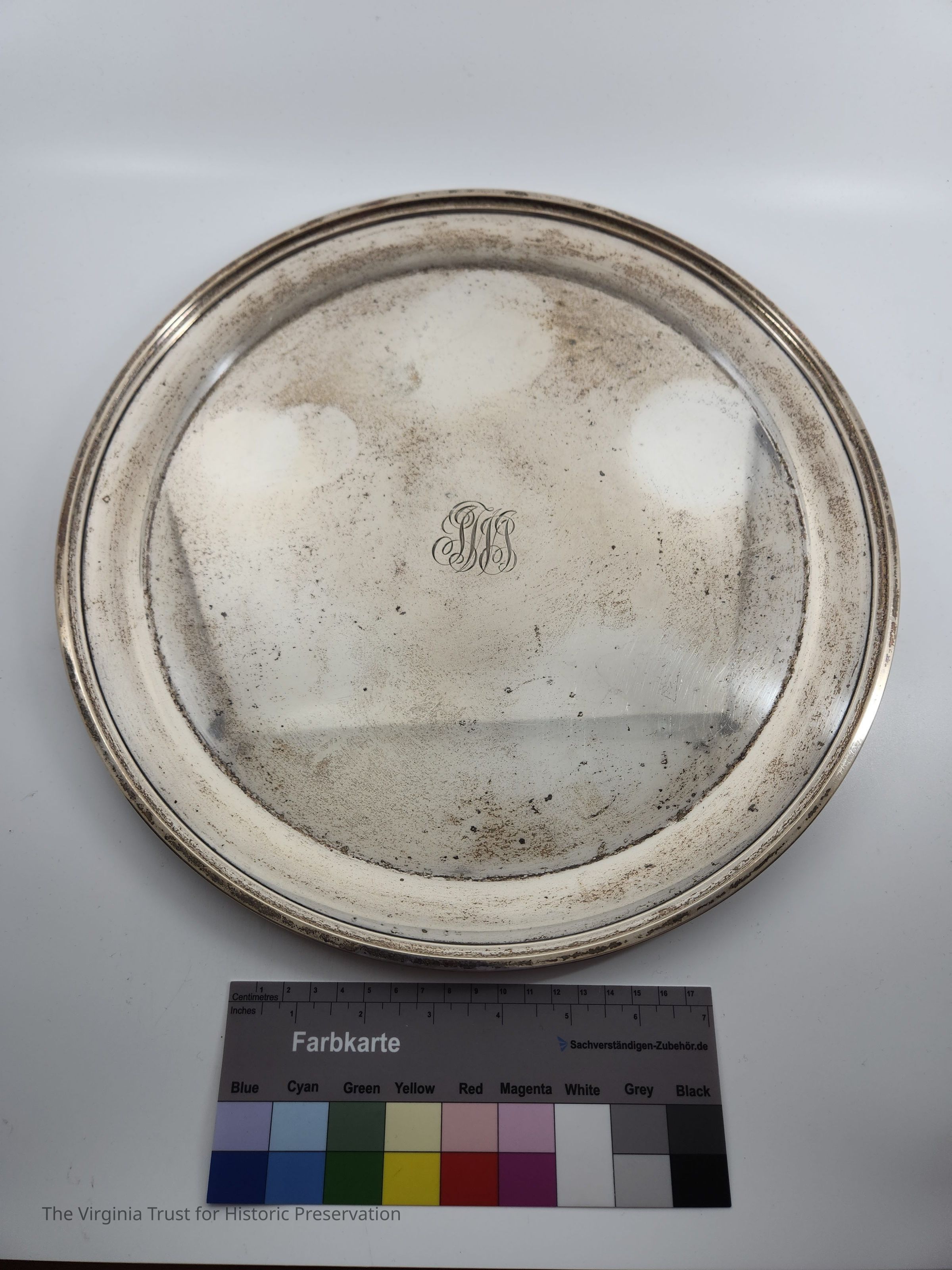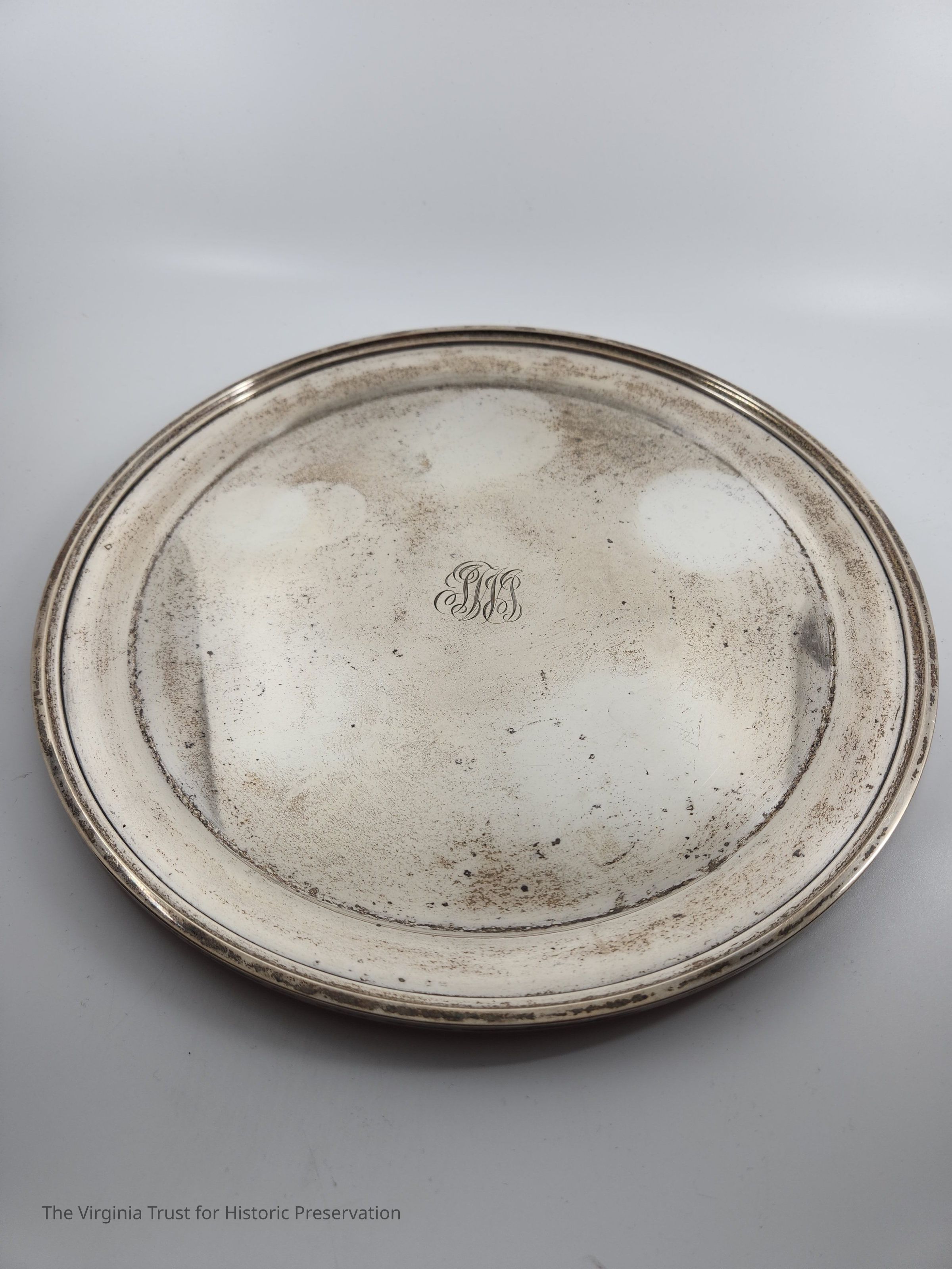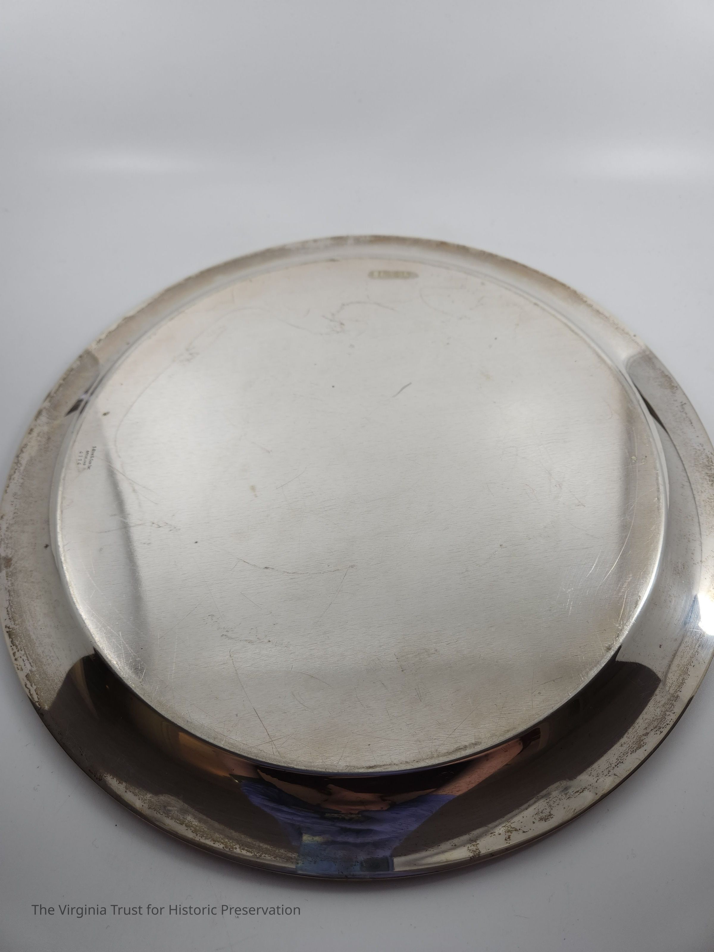 Circular silver tray. Monogram "J.W.J." Marked S. Kirk and Son., Inc. Sterling 4114. Heavy gage.