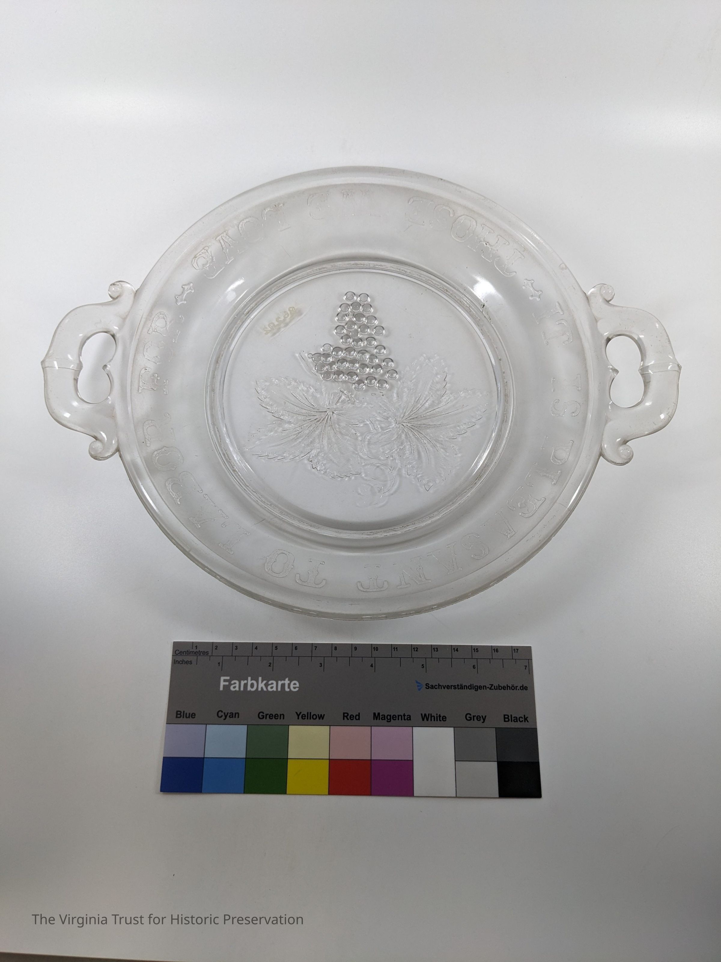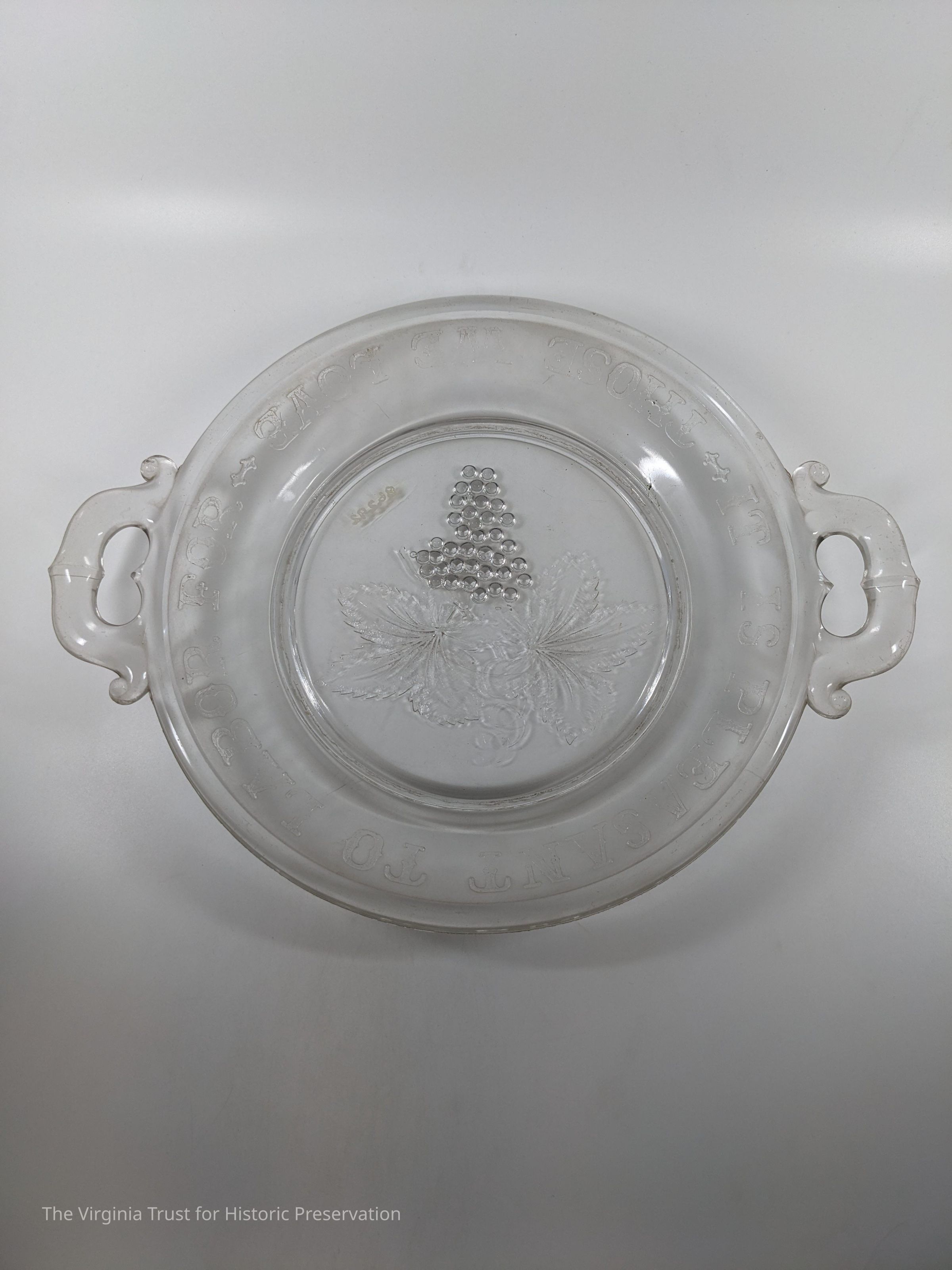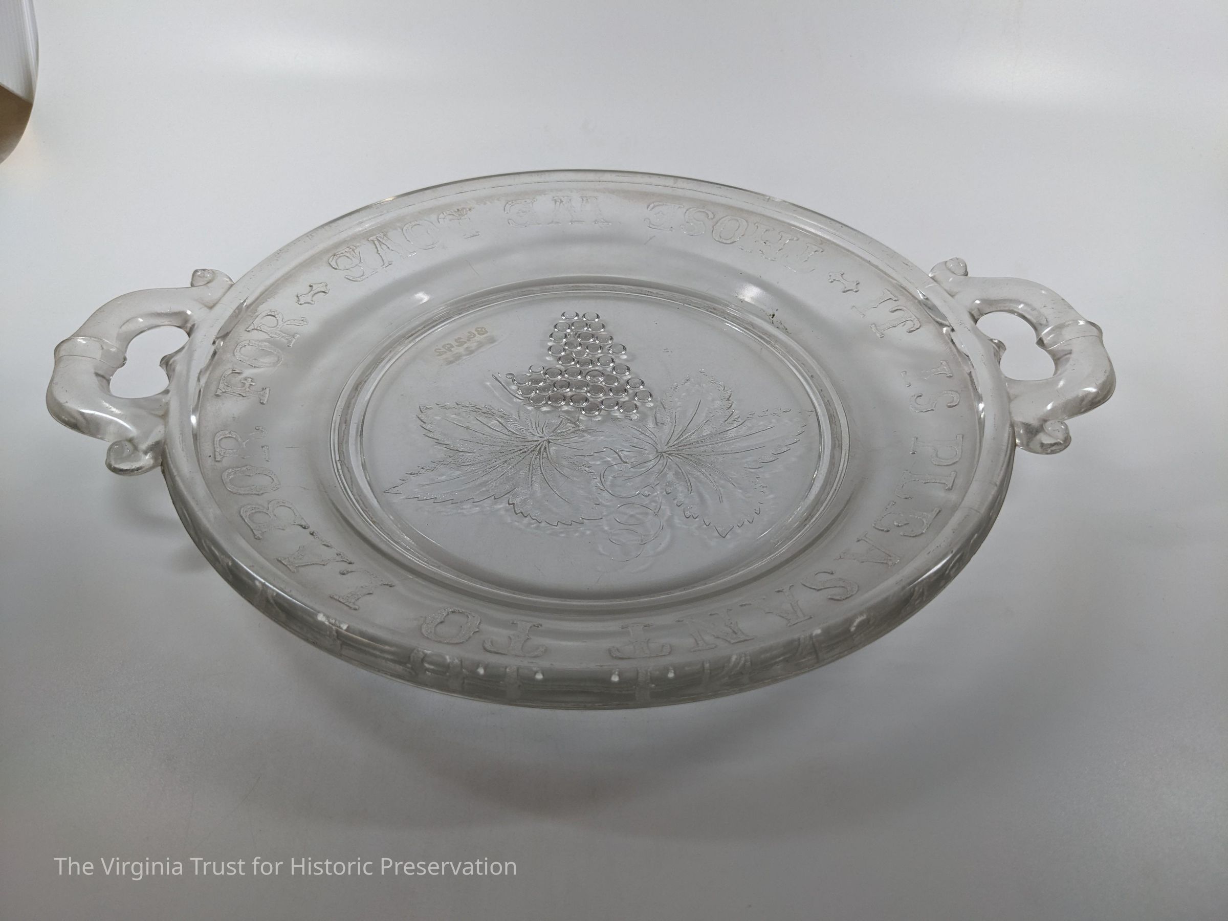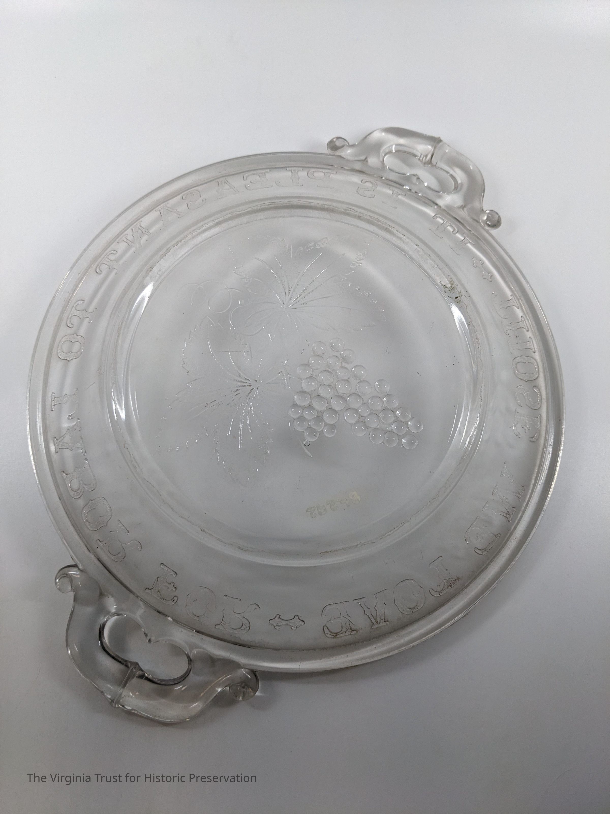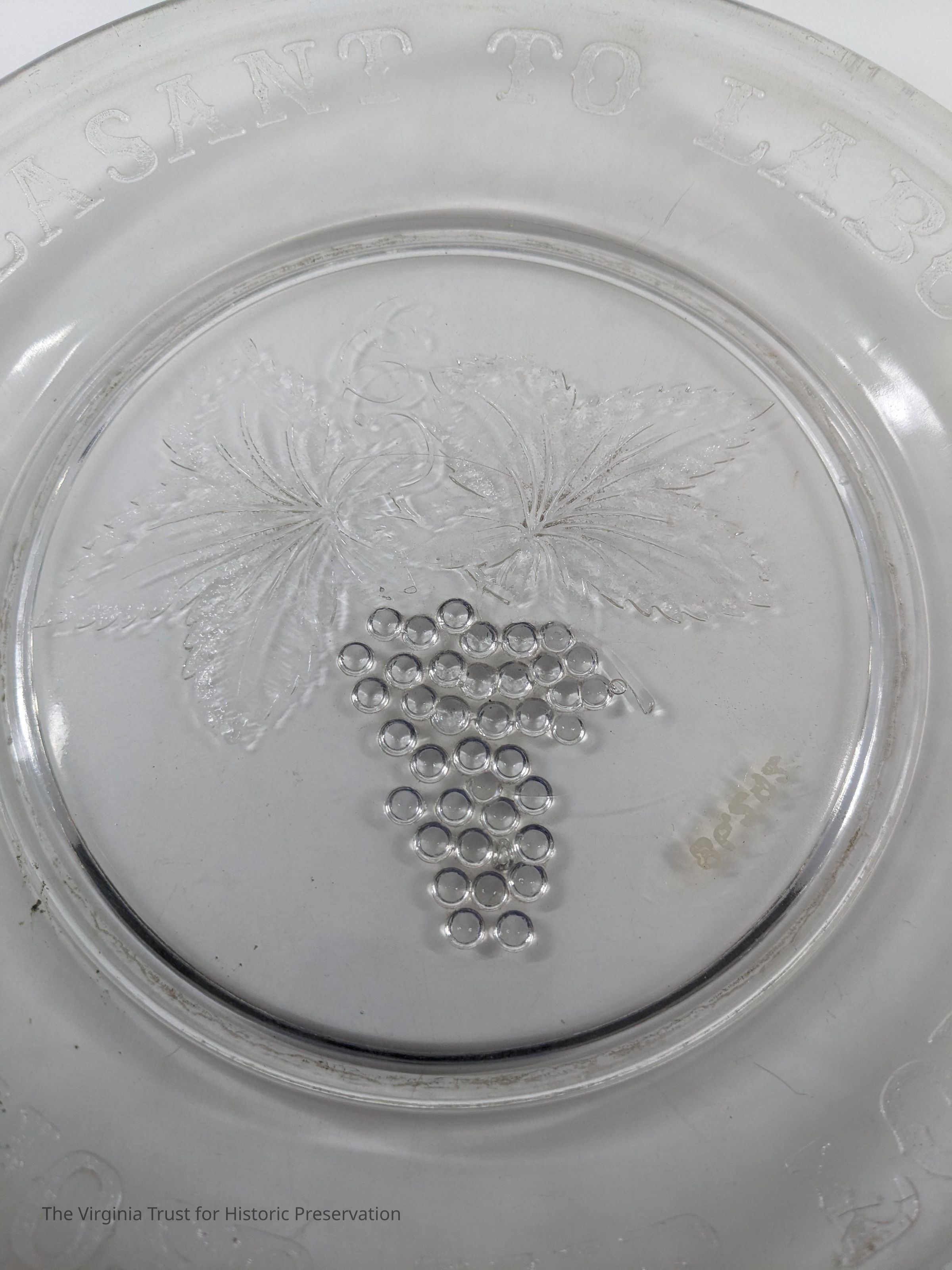 Round glass plate marked "It is pleasant to labor for those we love" around the rim. Grape design in center.