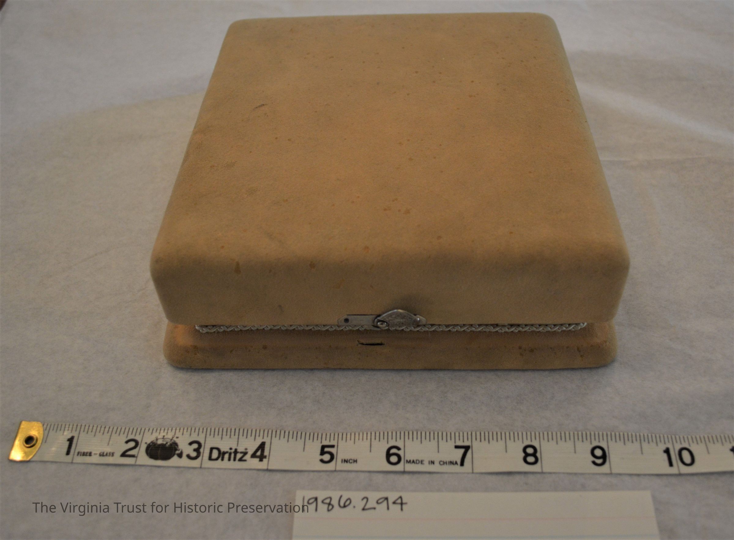 Box is camel colored with a metal clasp and is lined inside with a cream colored satin material.