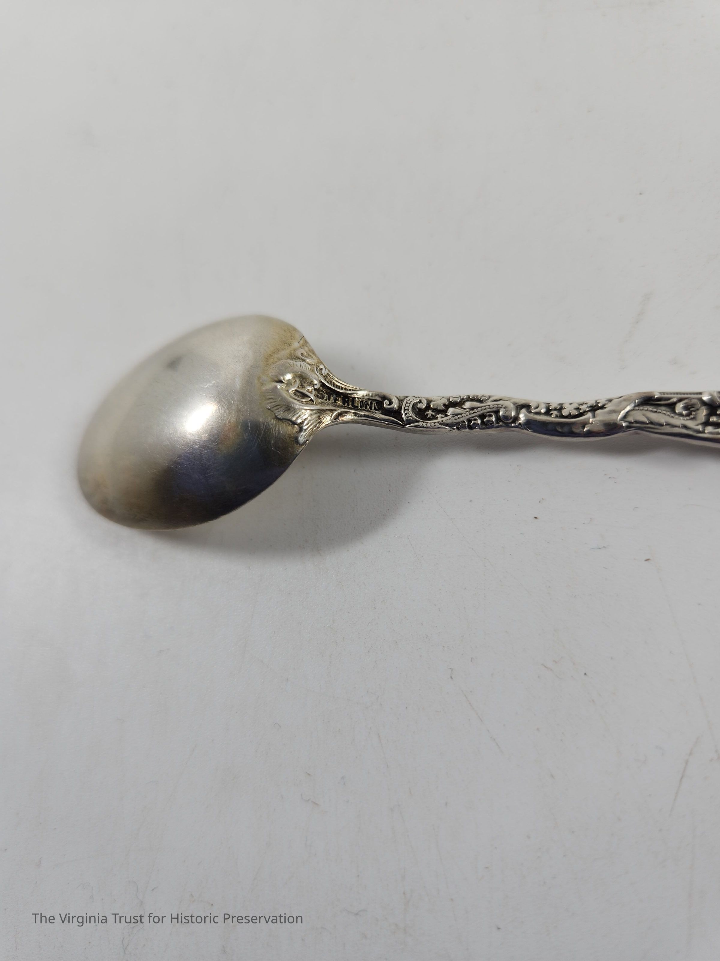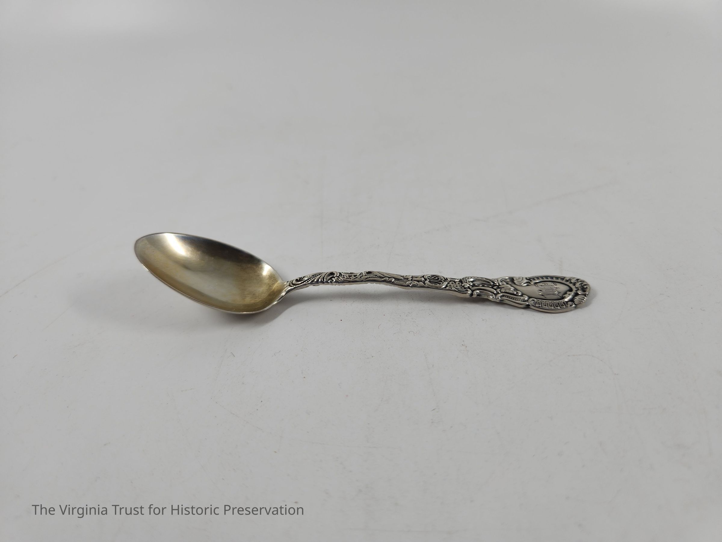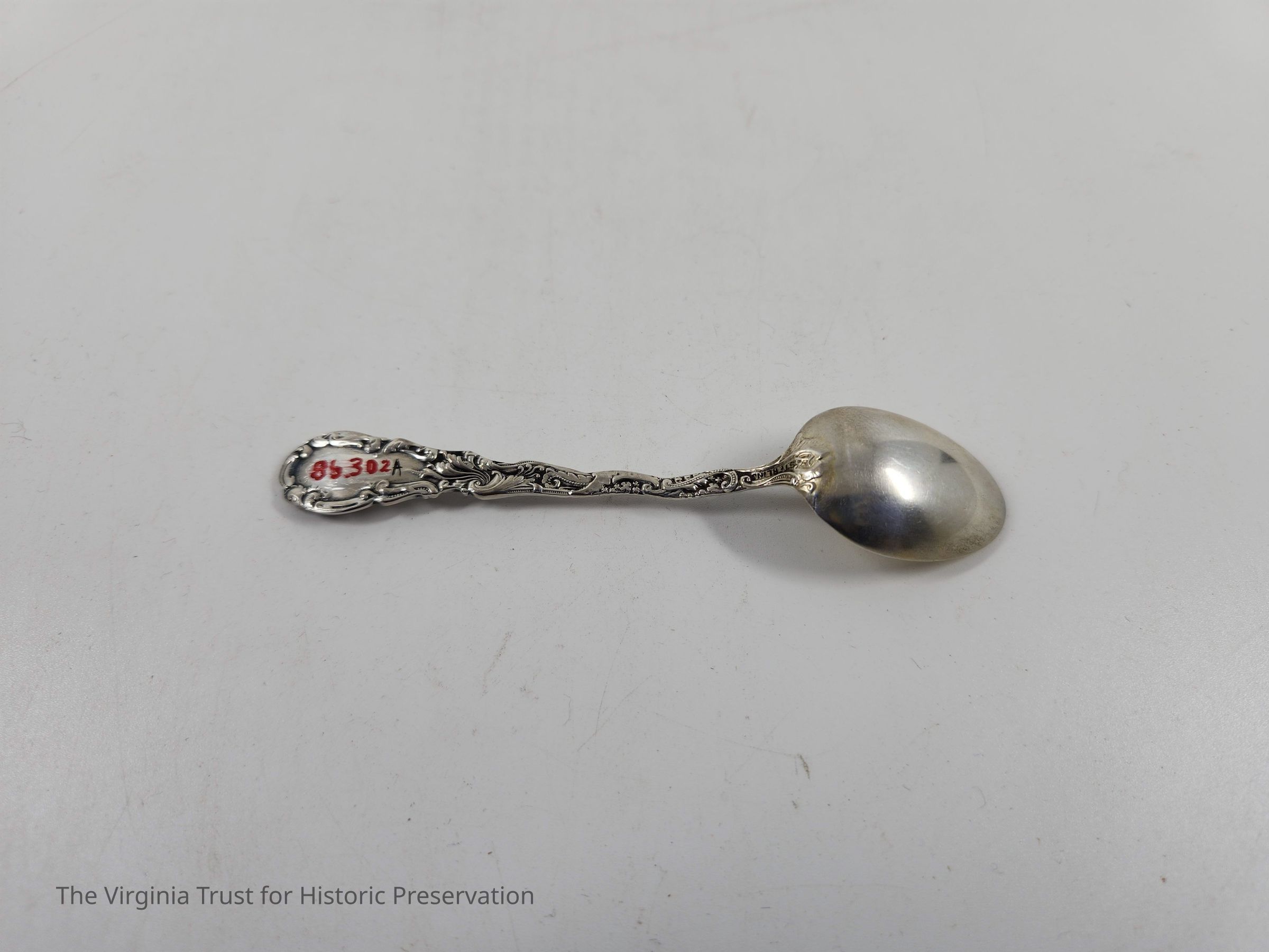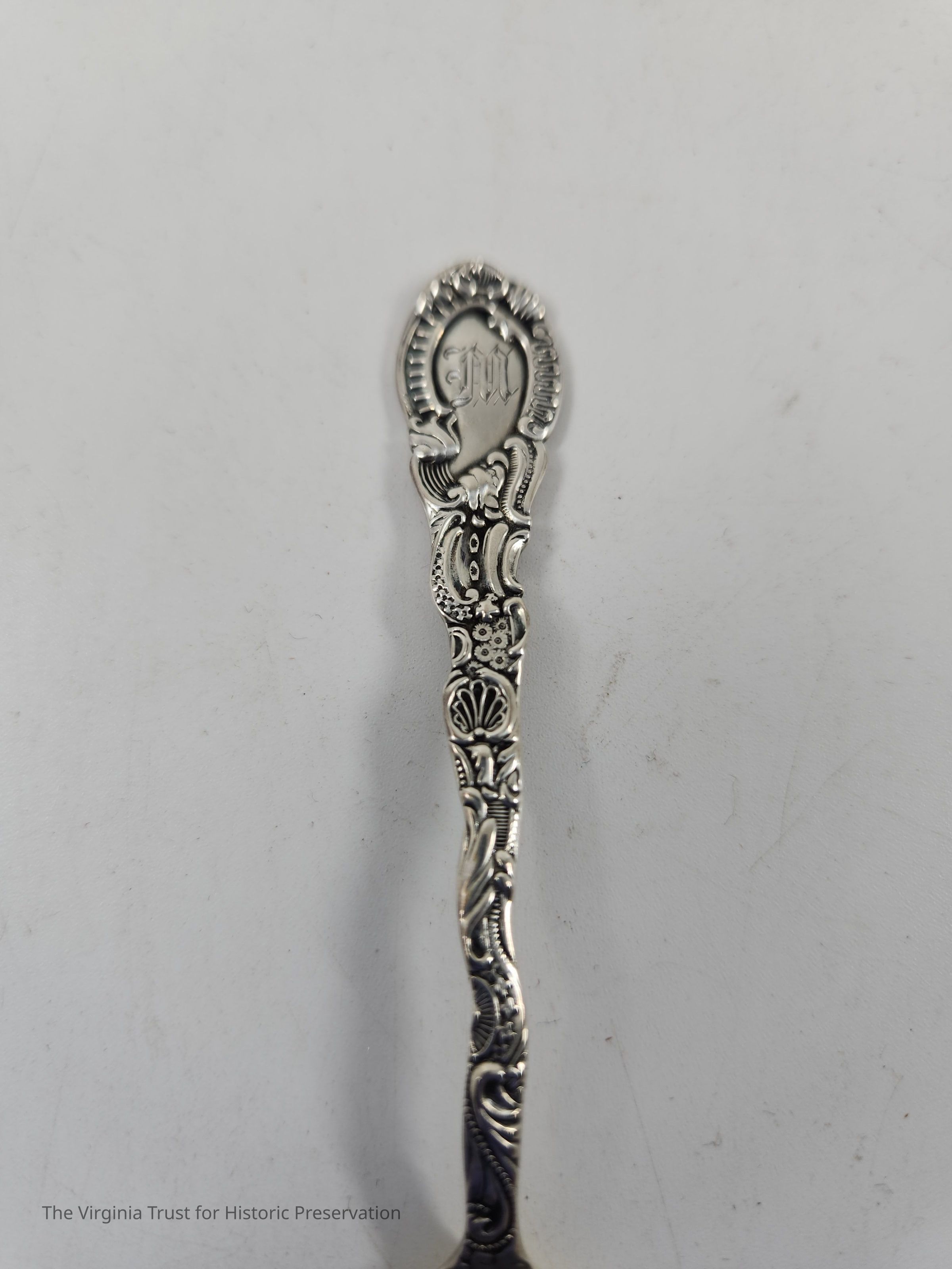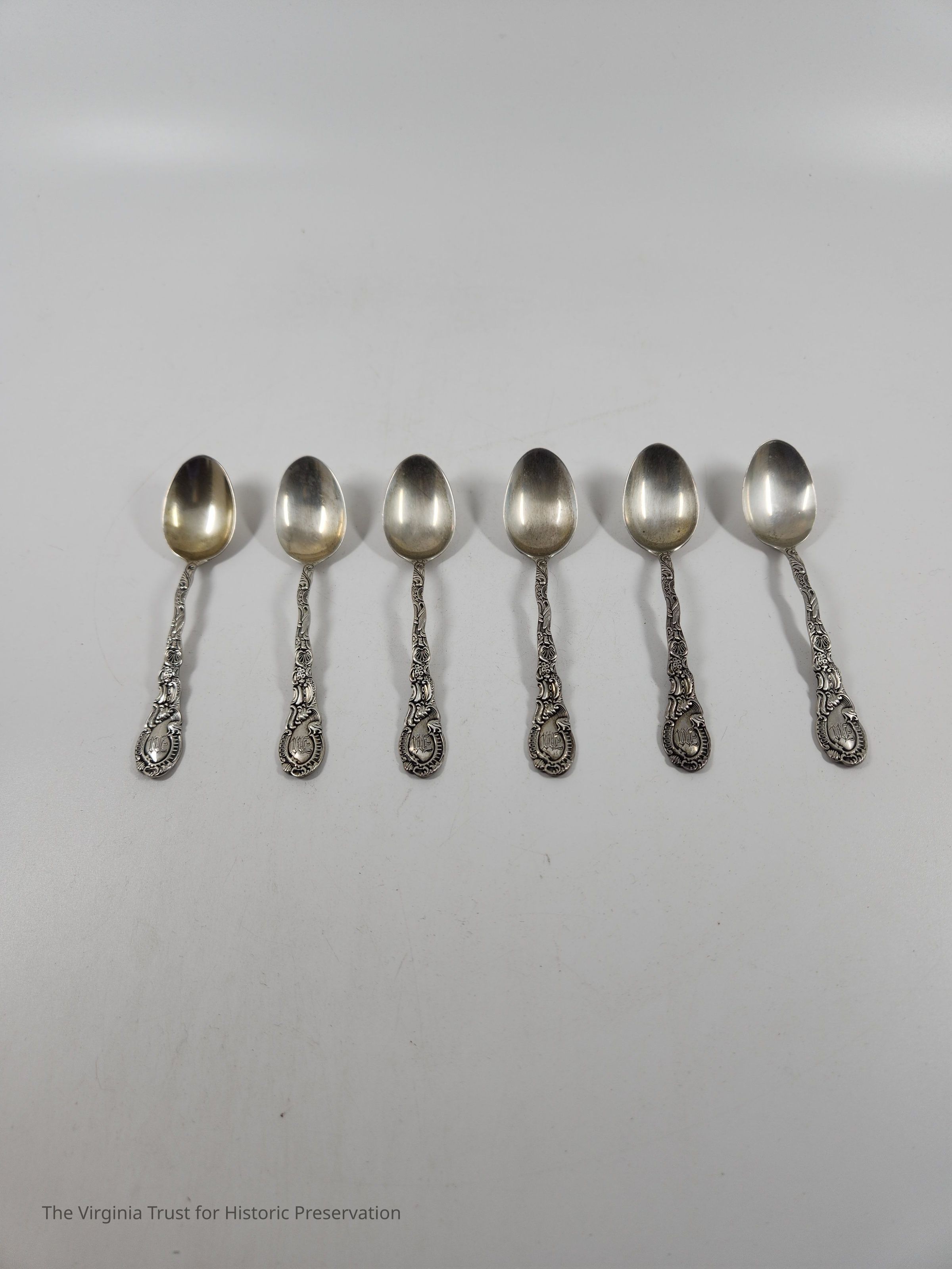 Part of set of six sterling silver demitasse spoons. Floral design on handle in Louis XV style (first introduced 1891). Monogrammed "M" on the handle. The "M" on these spoons likely stands for Dr. Edwin Cecil Morgan (1828-1867) and wife Evelina Prosser Lee Morgan (1832-1905).