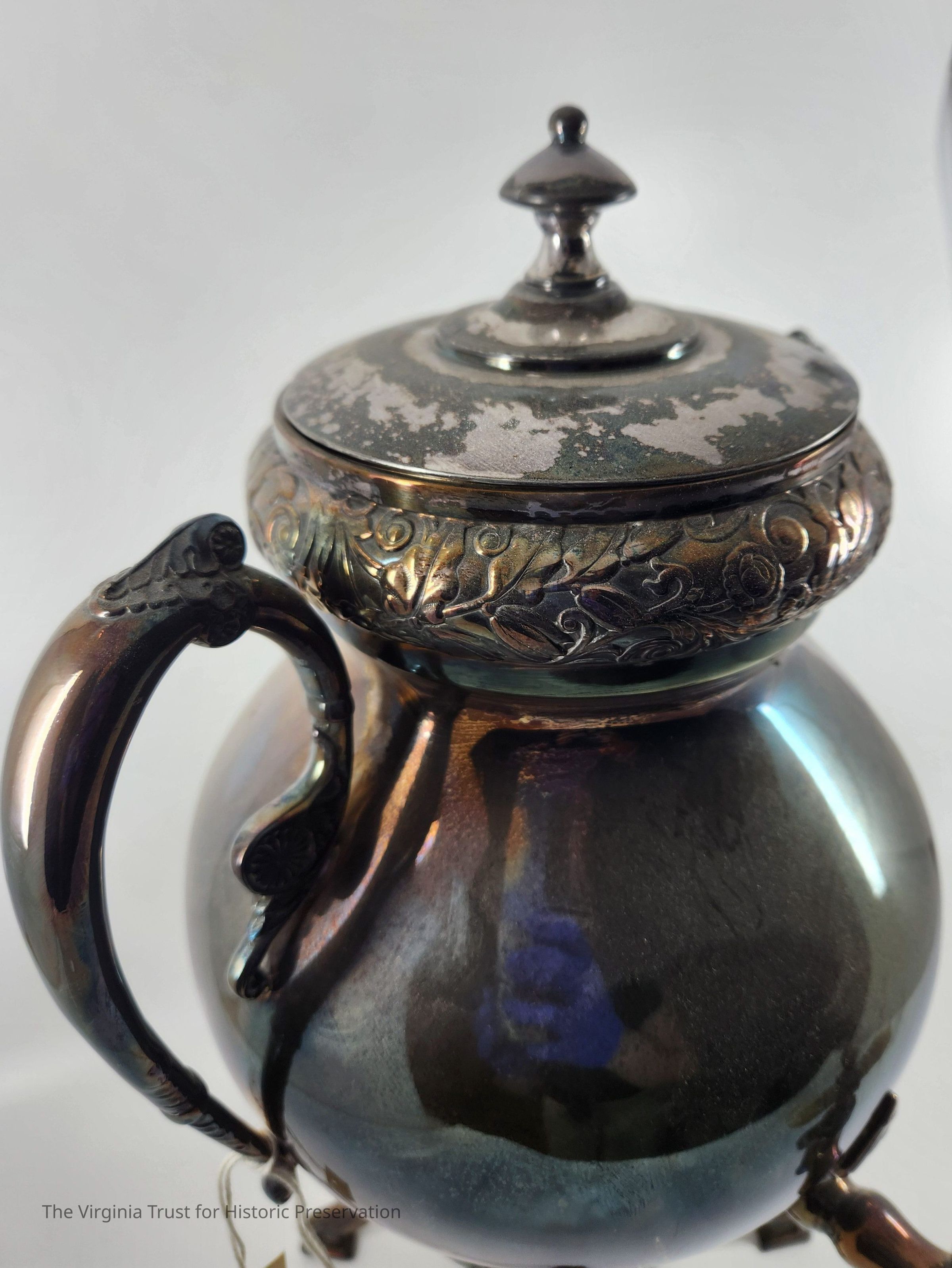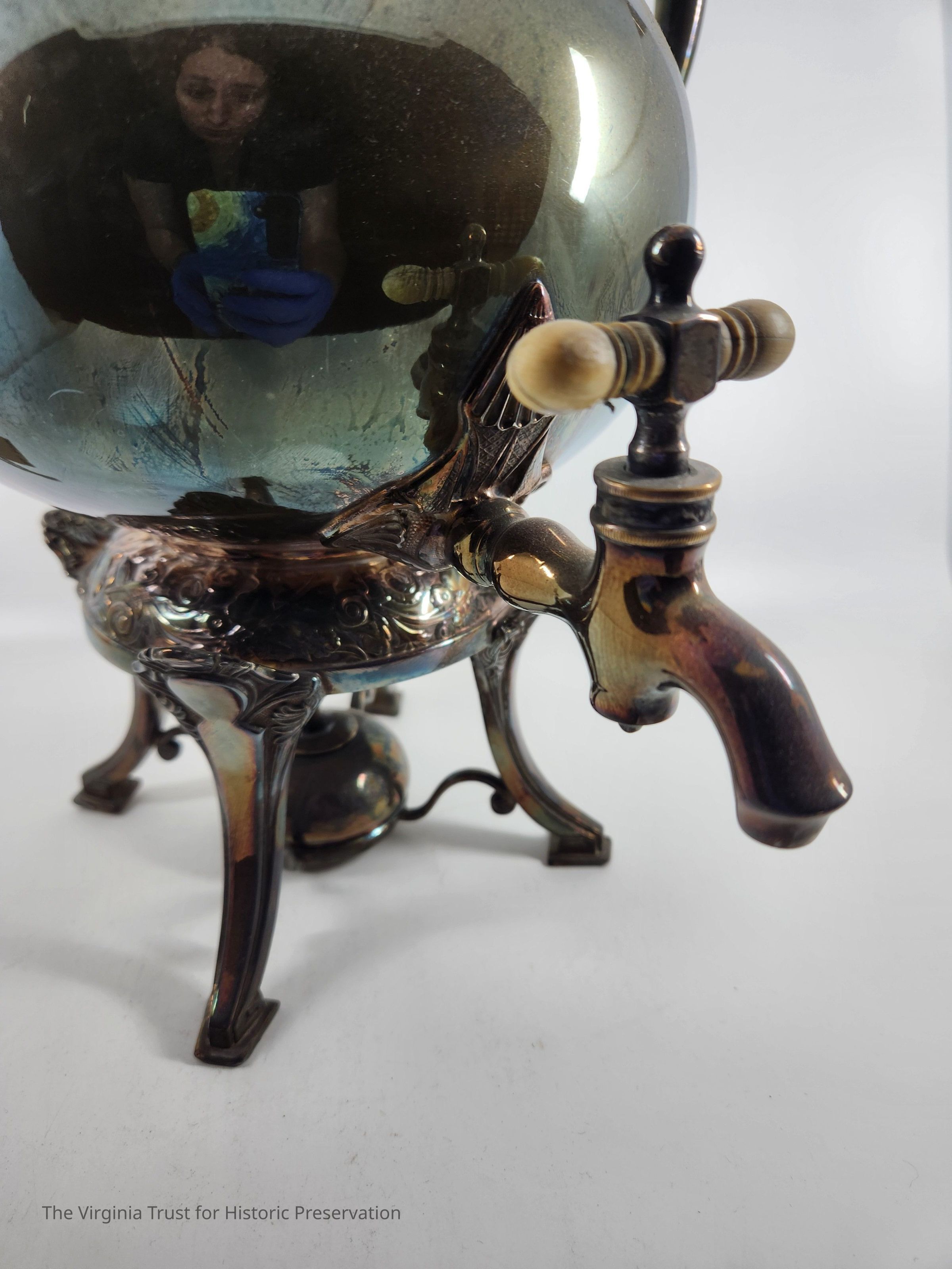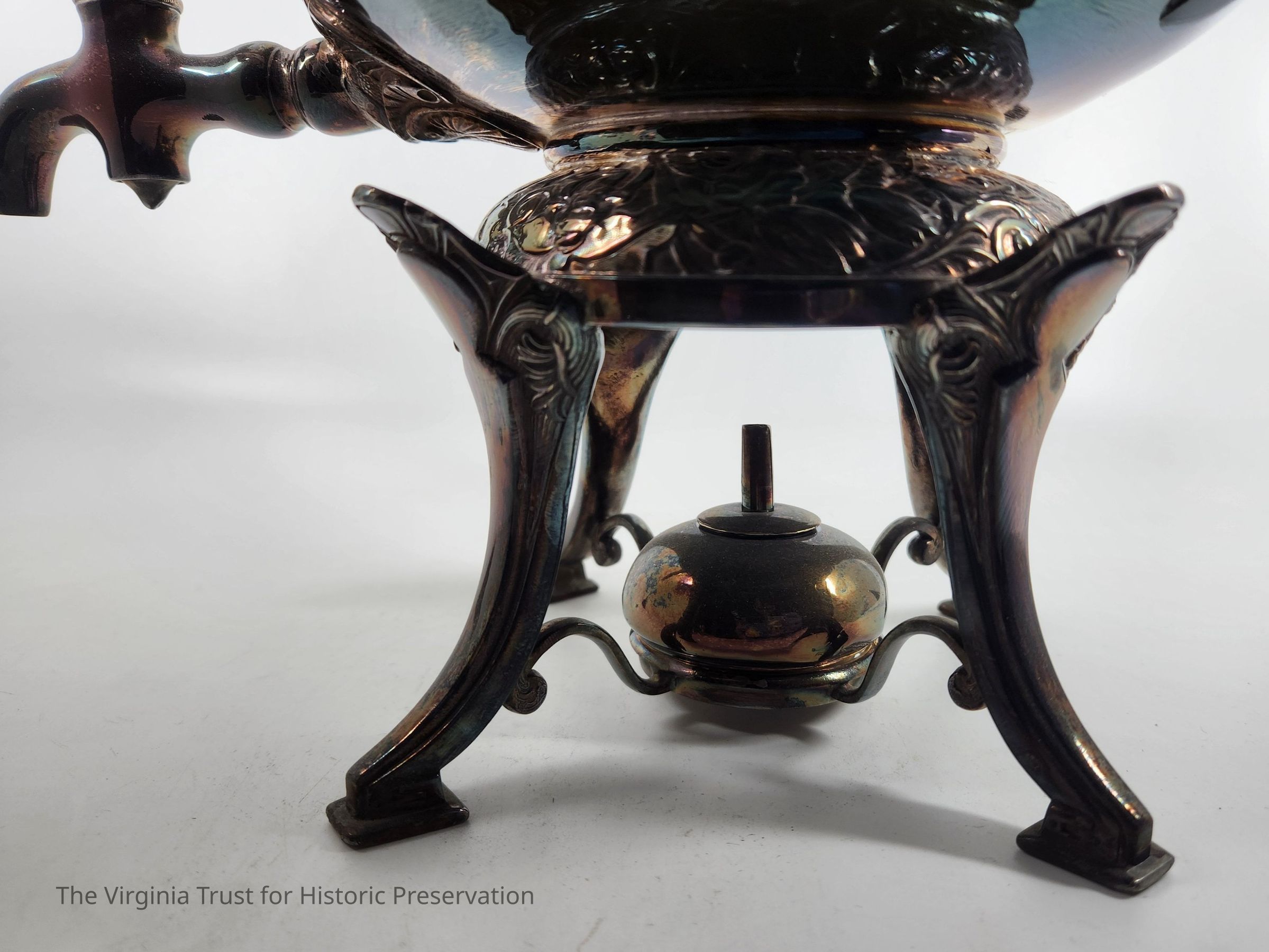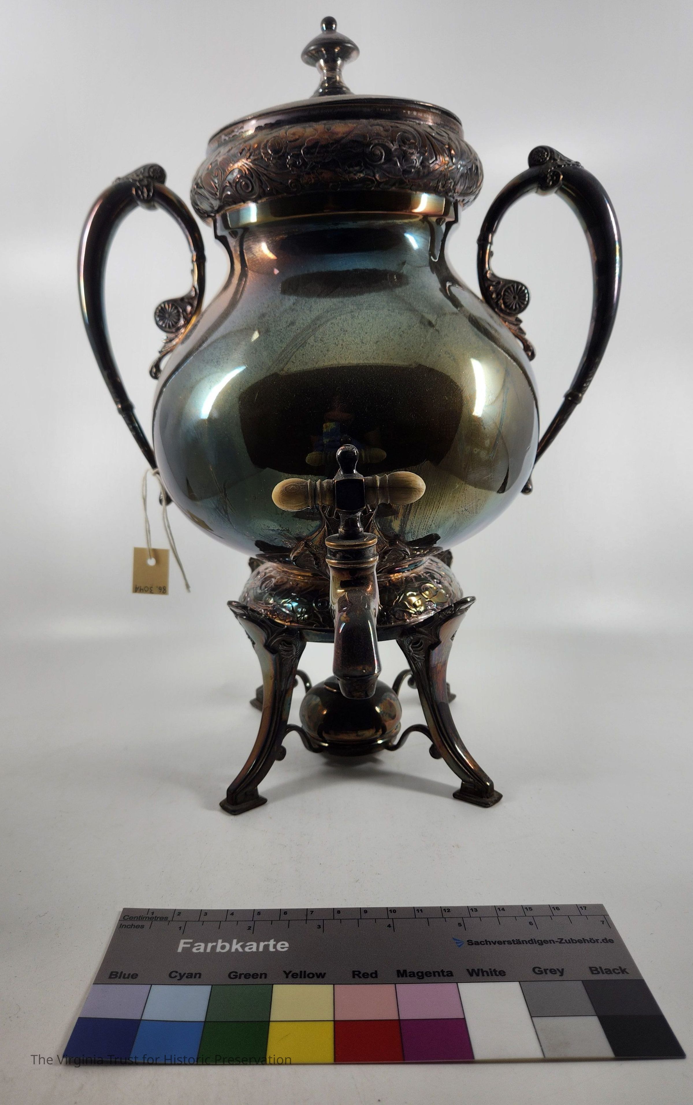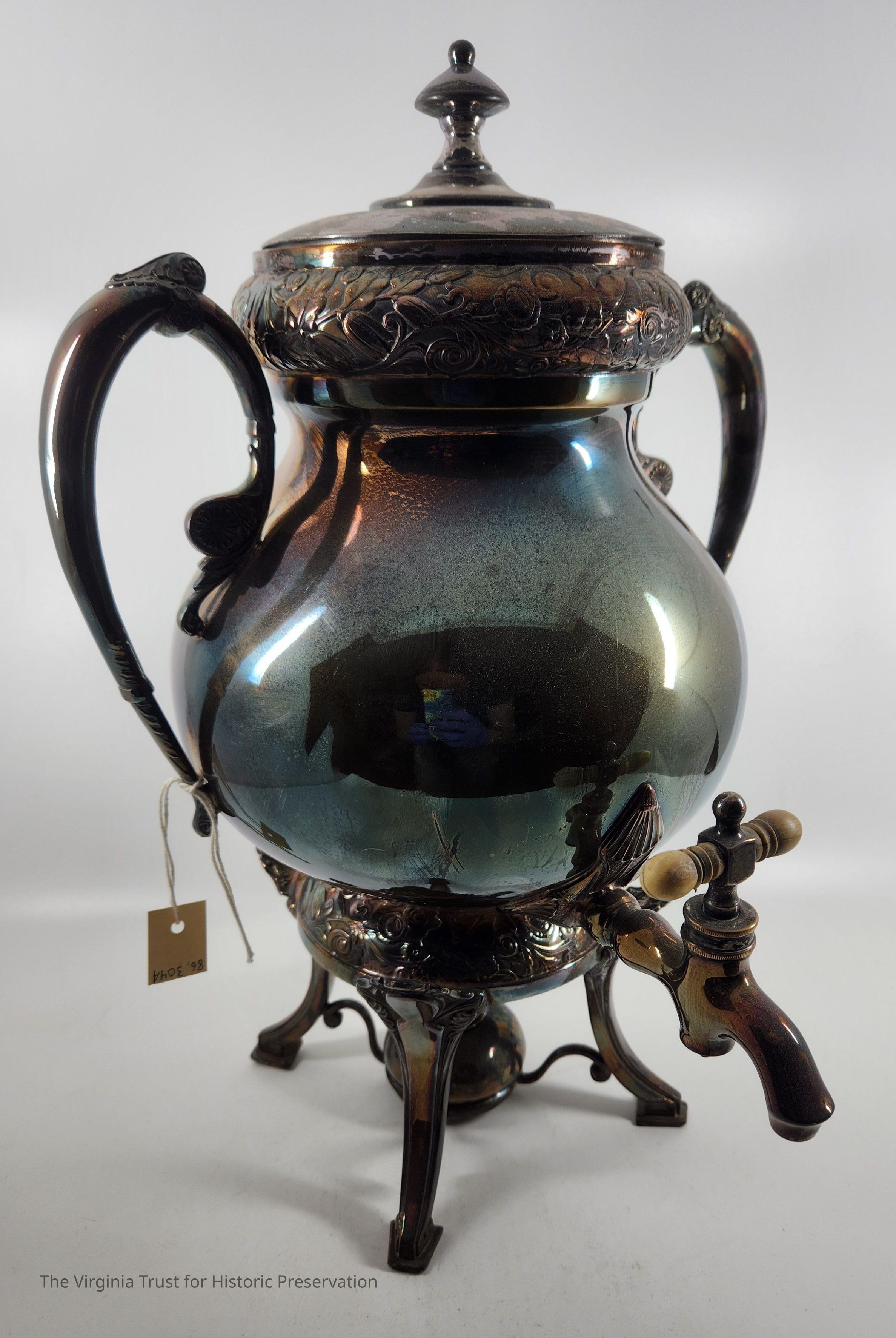 Footed coffee urn, alcohol burner, and ivory insulated spigot. Silver stamped "Quadruple plate Wilcox Silver Plate Co. Meriden 159."