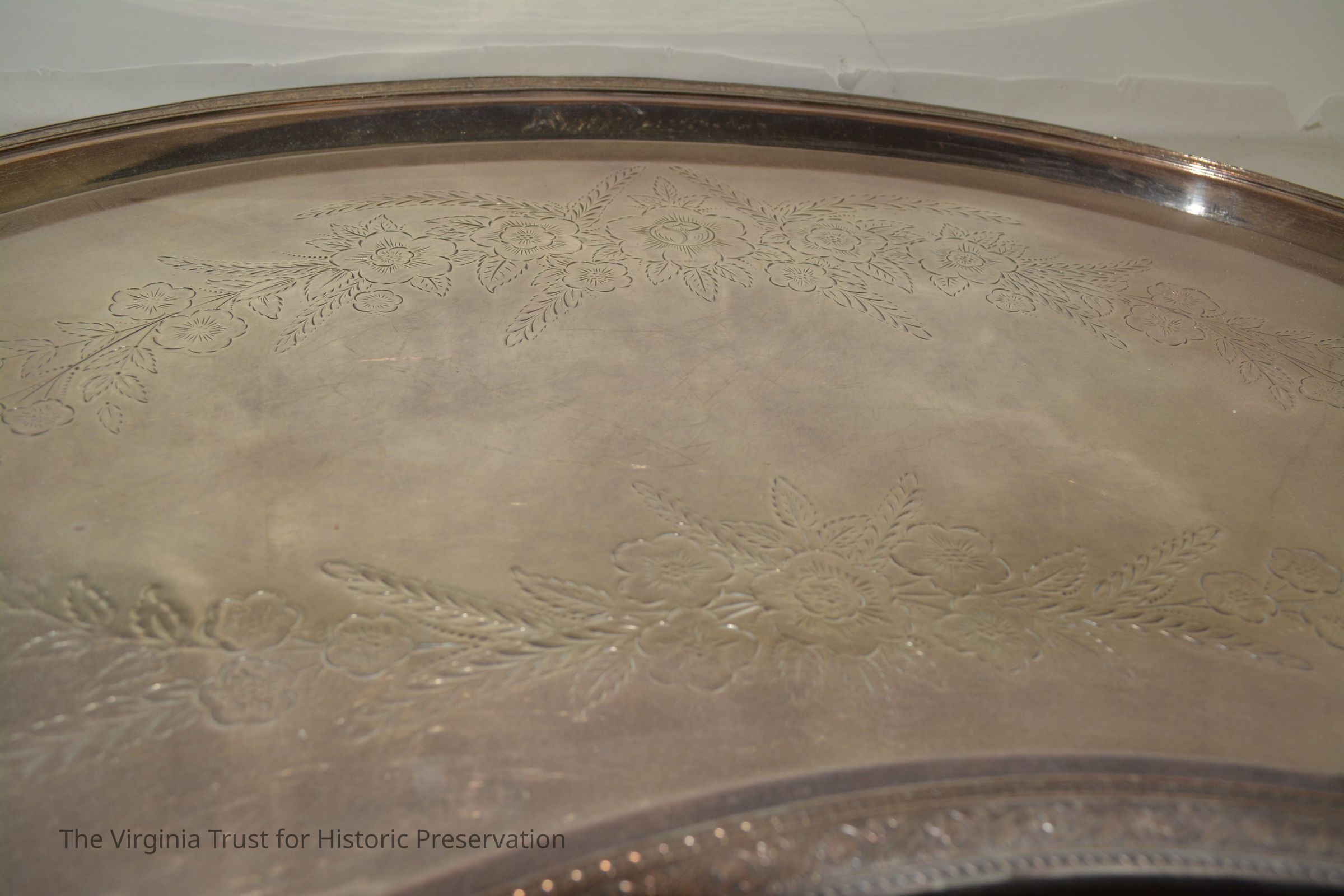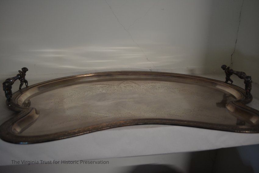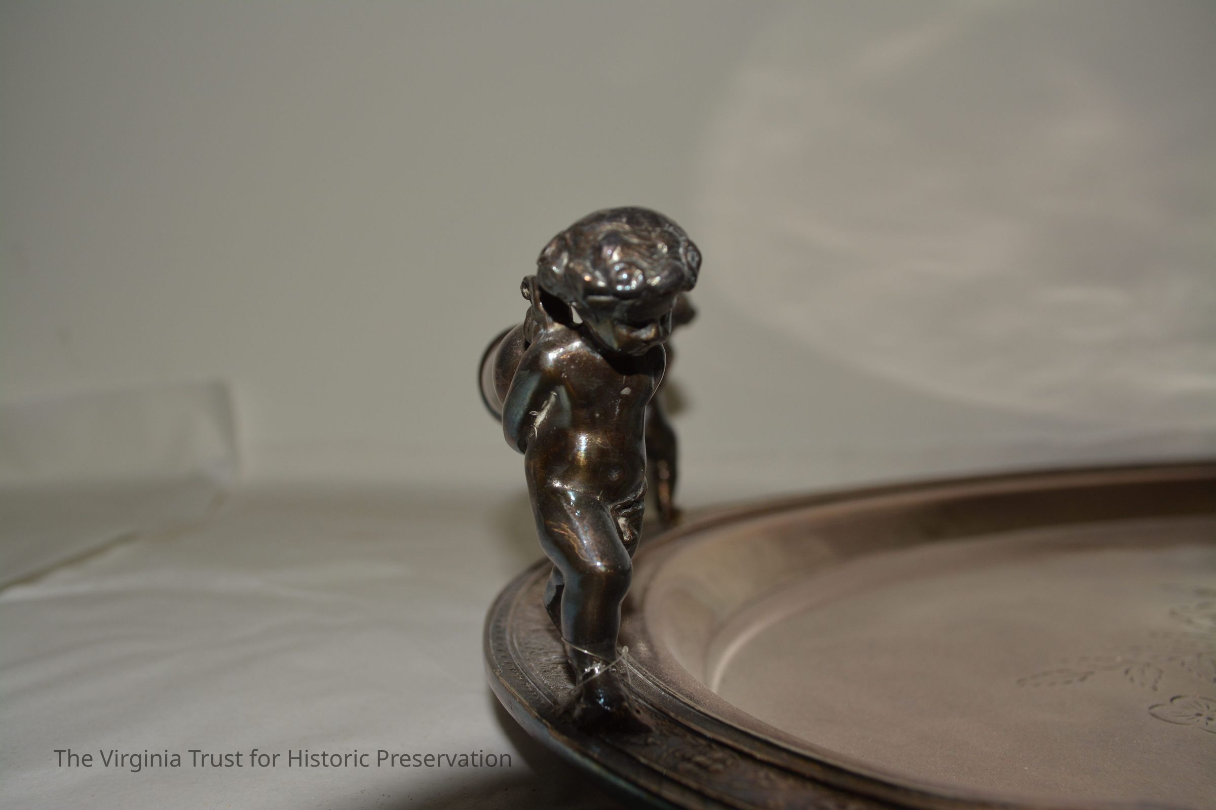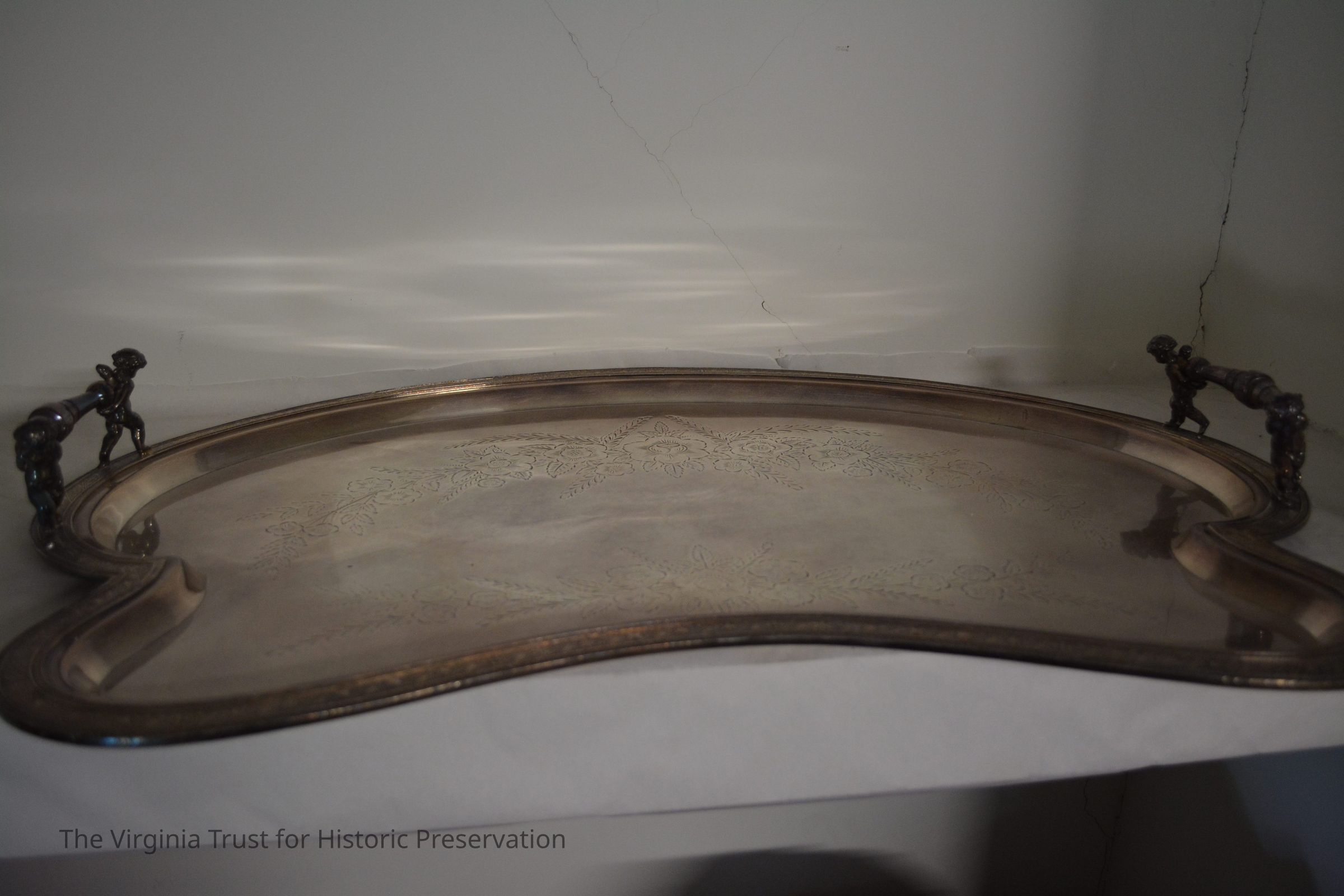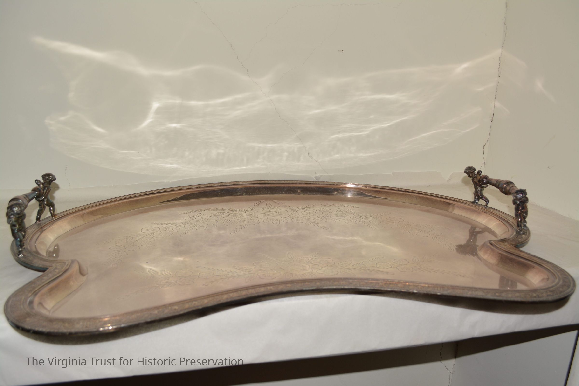 Large kidney shaped tray with cupid handles. Silver marked: "Quadruple Plate Wilcox Silver Plate Co. Meriden 159."