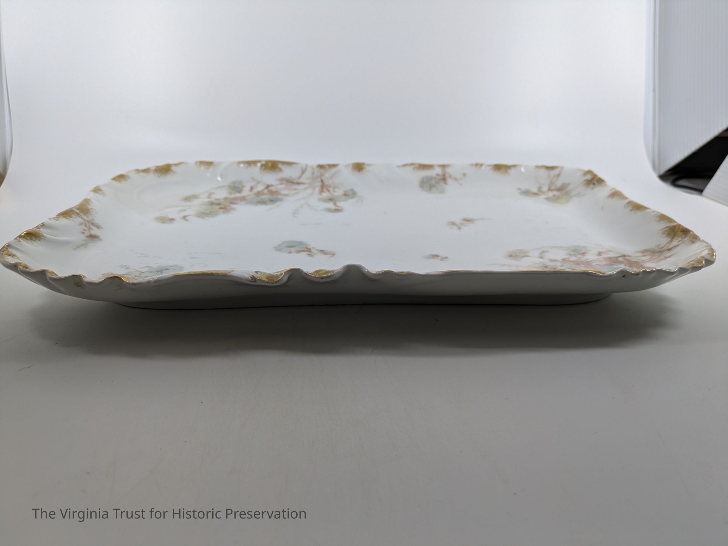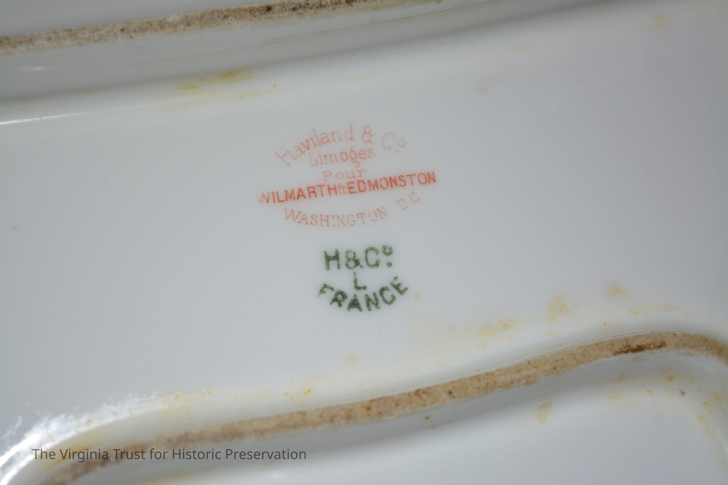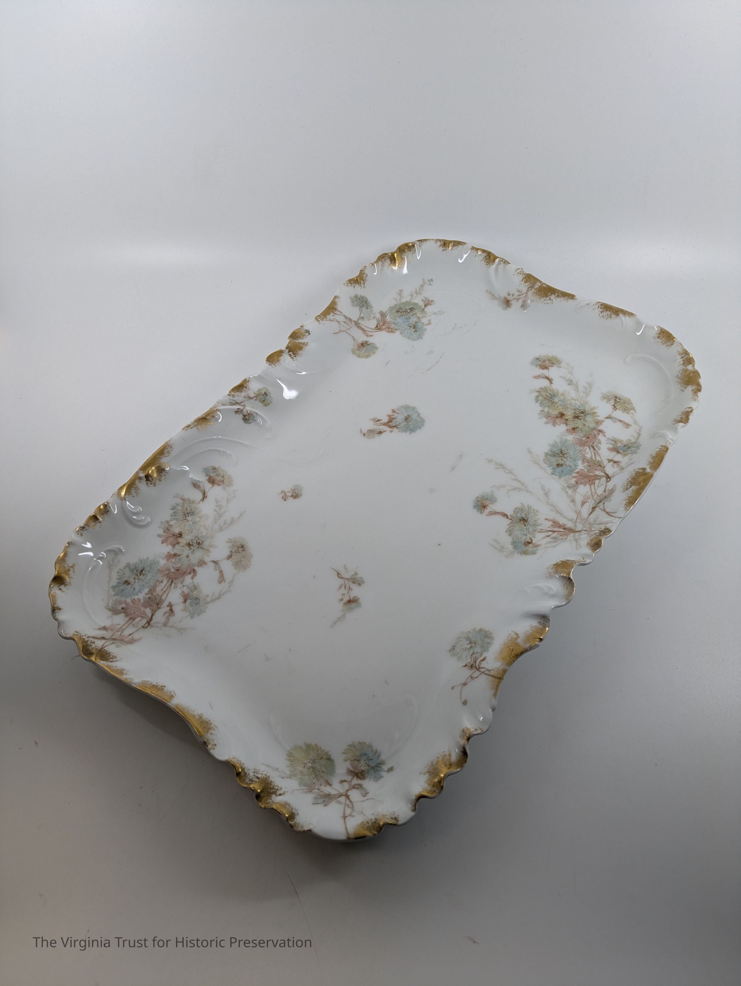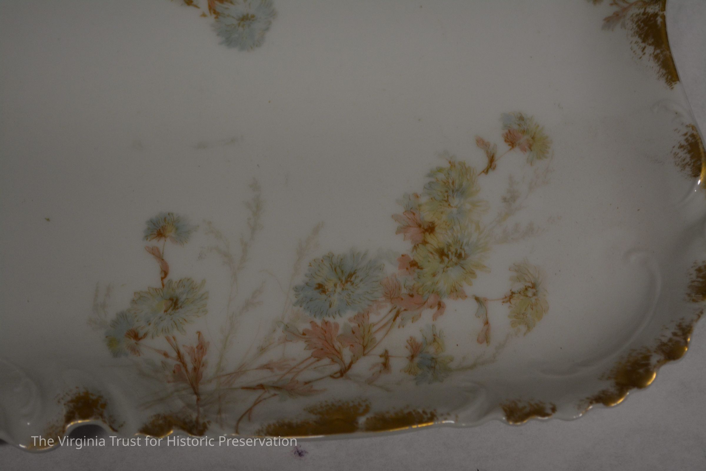 Porcelain serving platter with a pastel floral pattern and gold intermittently around the rim. Tray has a card attached with glue identifying the platter as property of the Lee family. Marked: "Haviland & Co. Limoges Pour Wilmarth and Edmonston Washington, DC" in red. "H & Co. L France" in green.