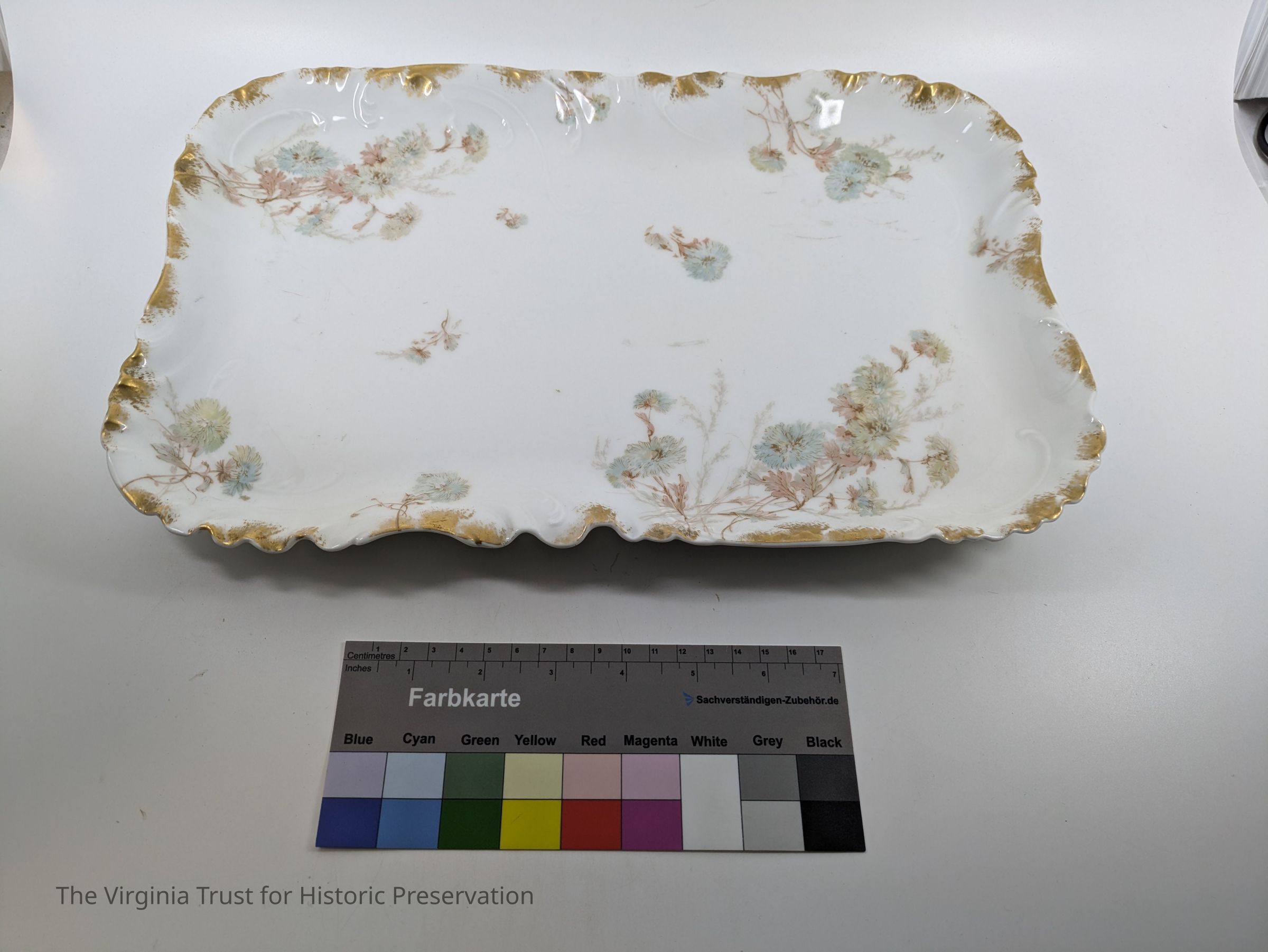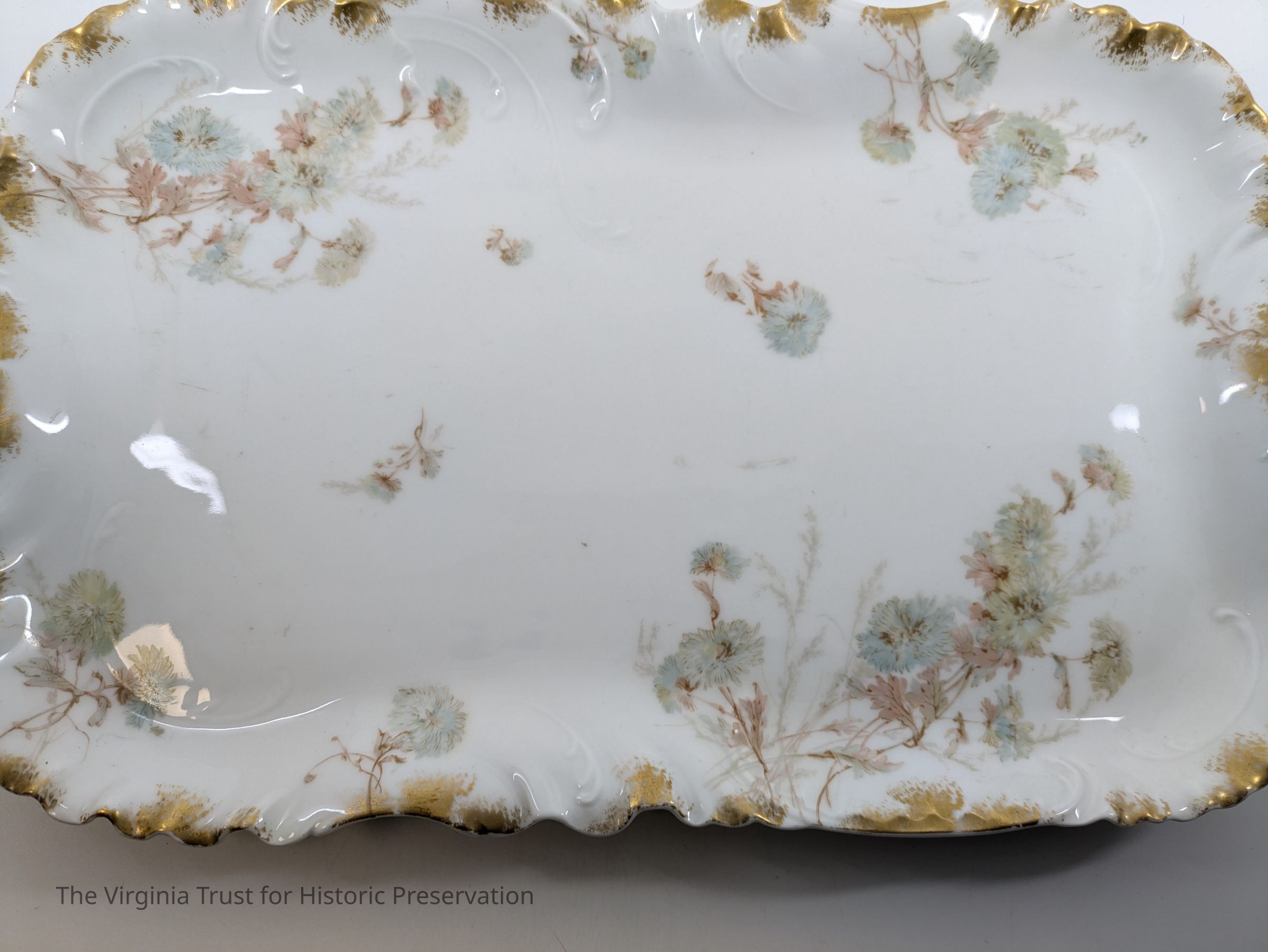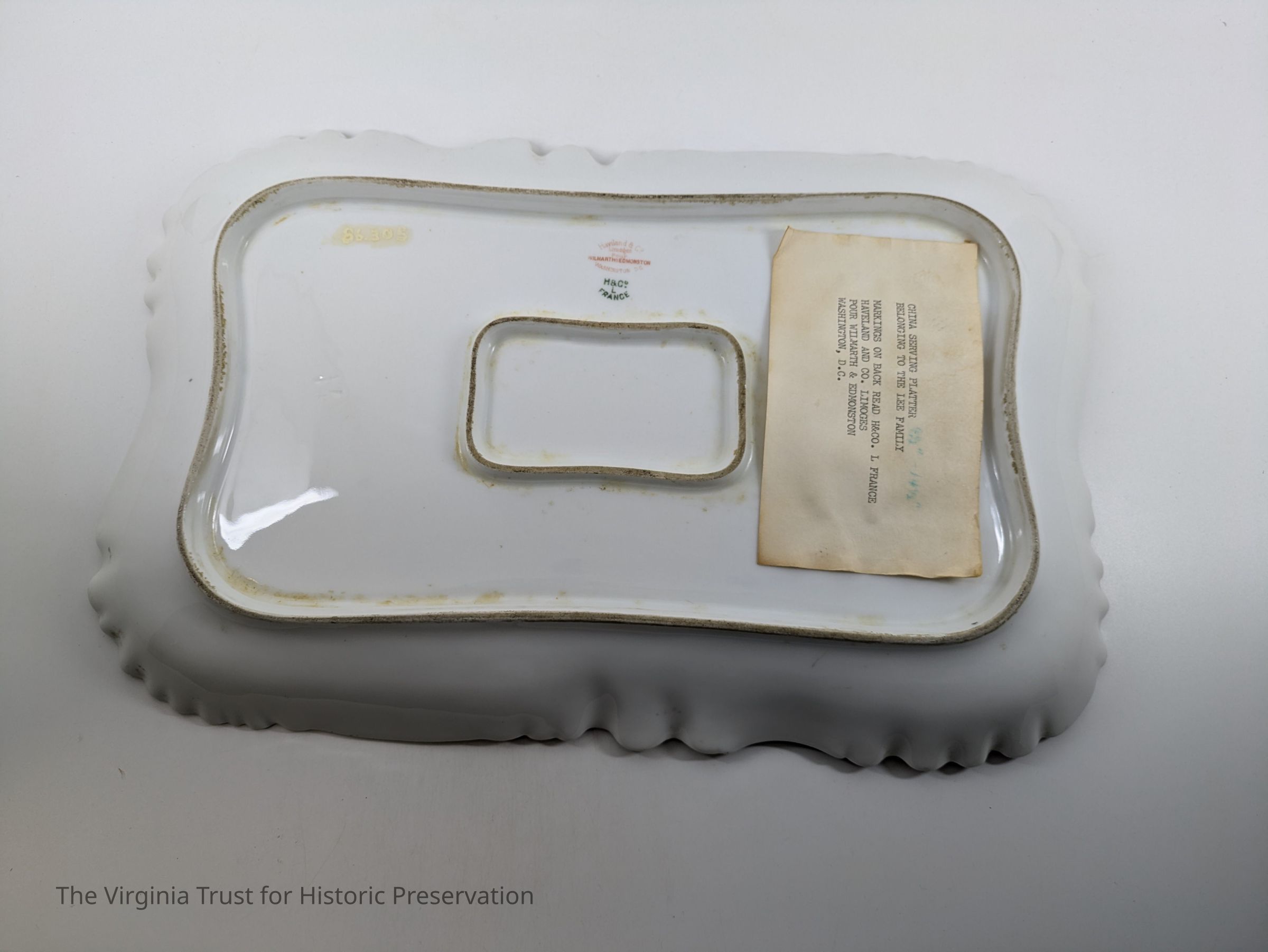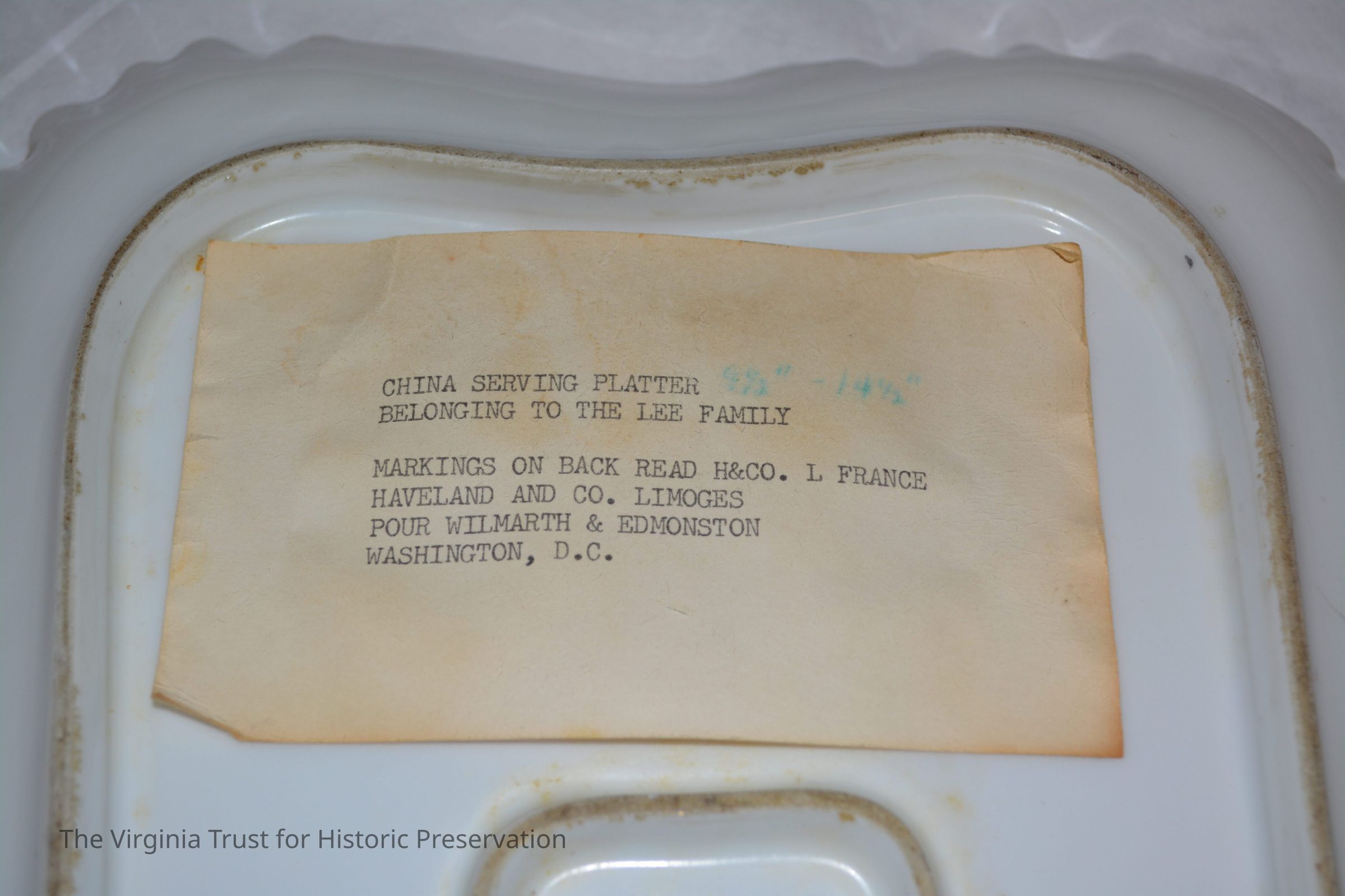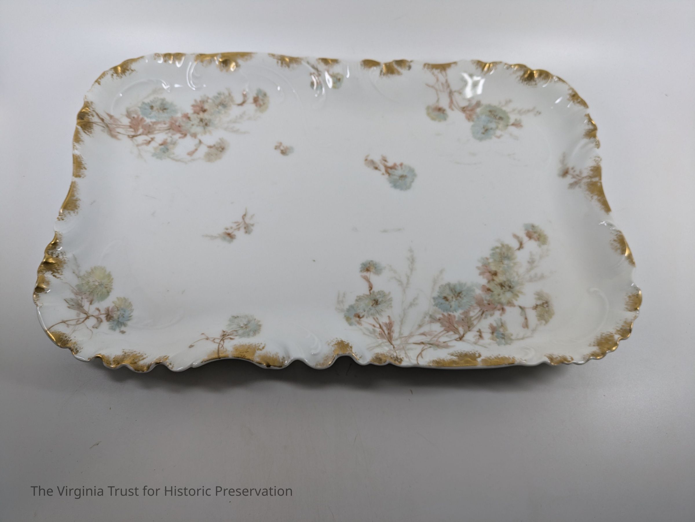 Porcelain serving platter with a pastel floral pattern and gold intermittently around the rim. Tray has a card attached with glue identifying the platter as property of the Lee family. Marked: "Haviland & Co. Limoges Pour Wilmarth and Edmonston Washington, DC" in red. "H & Co. L France" in green.