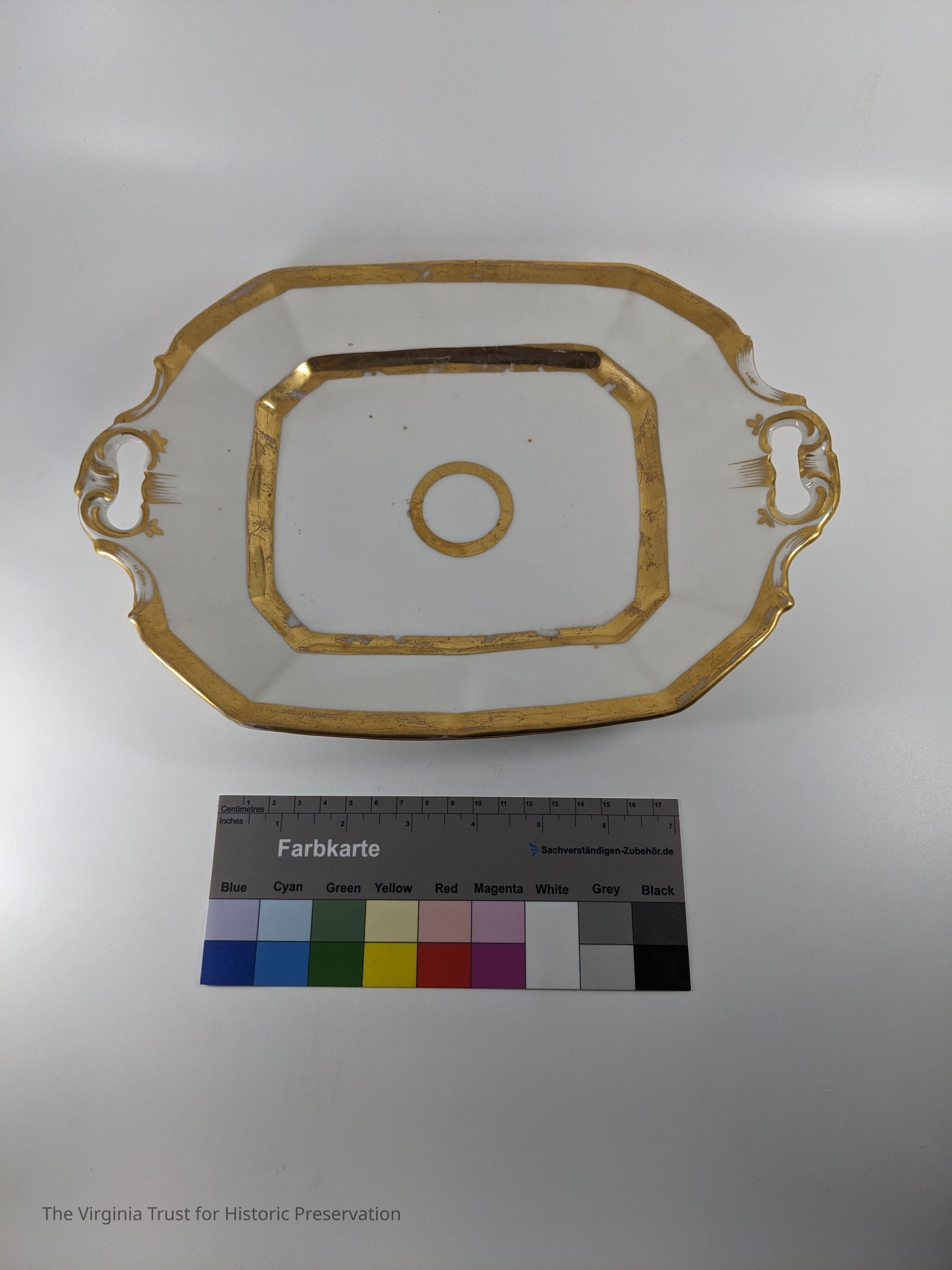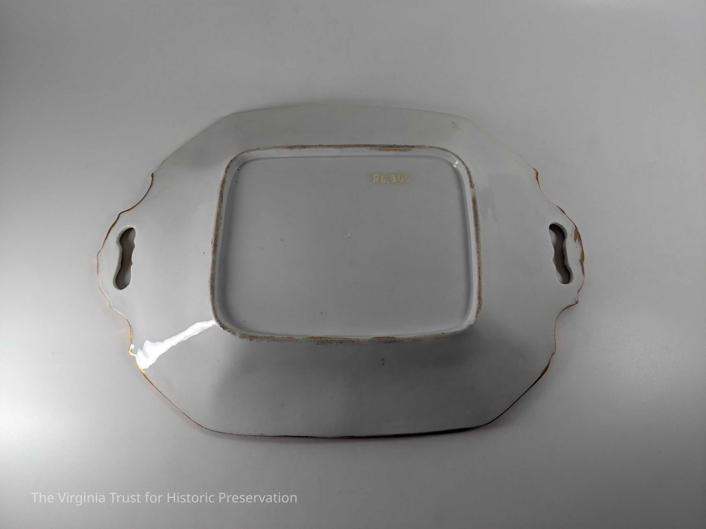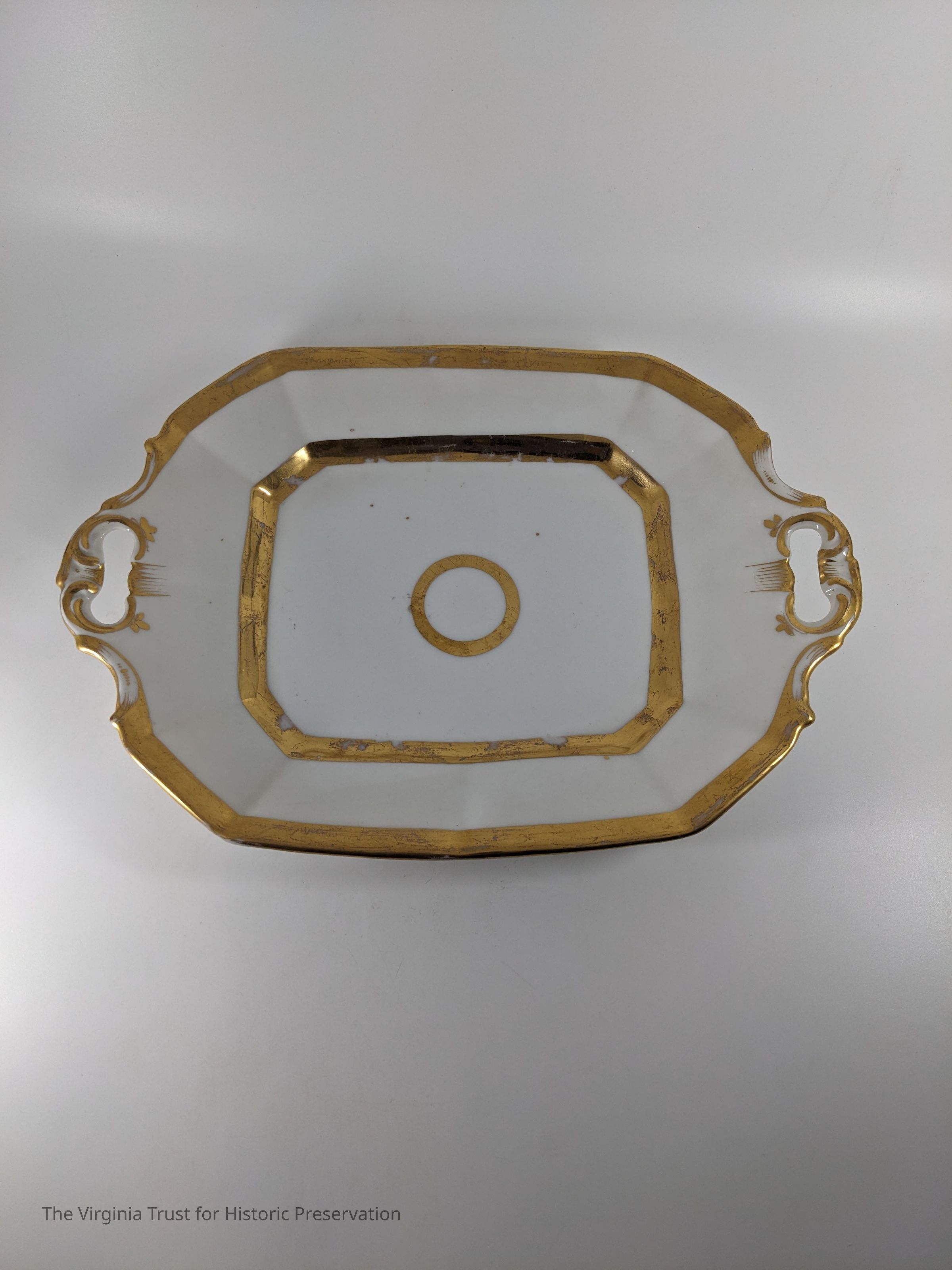 Small serving platter with gold trim and no markings. Handles have open part surrounded by gold decoration.