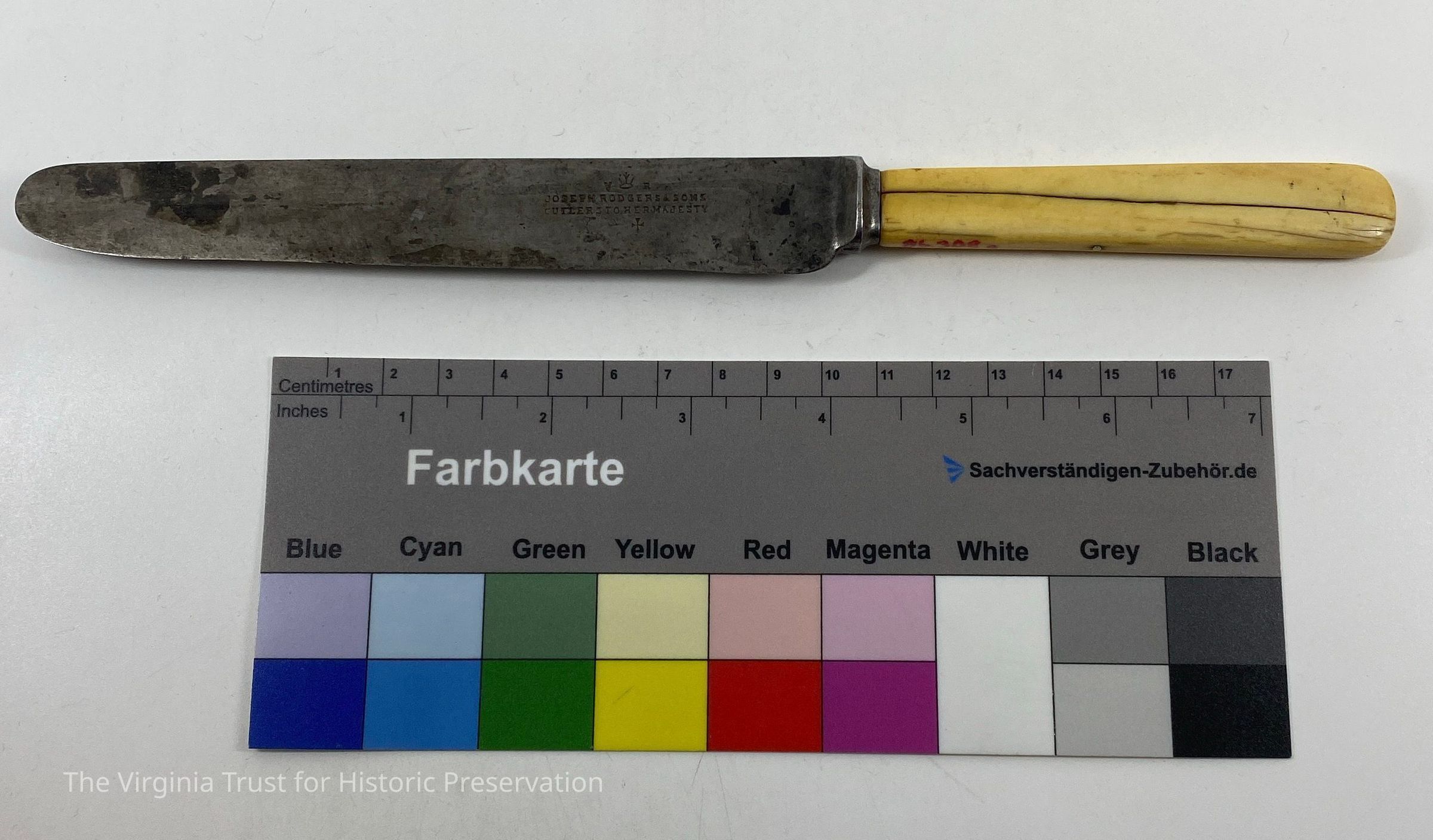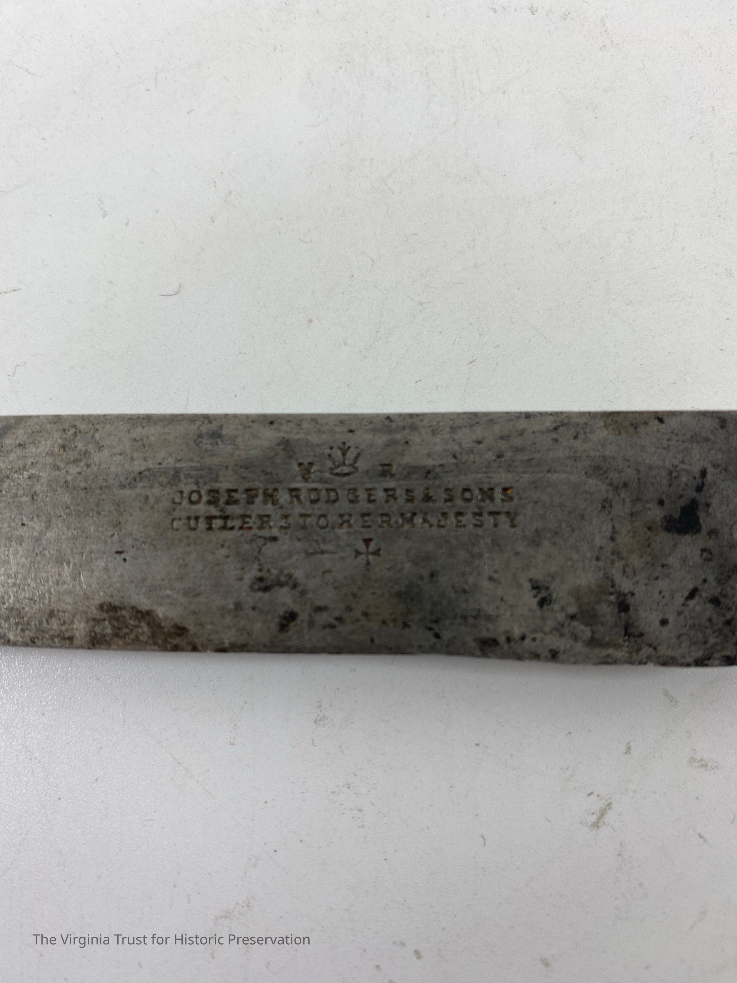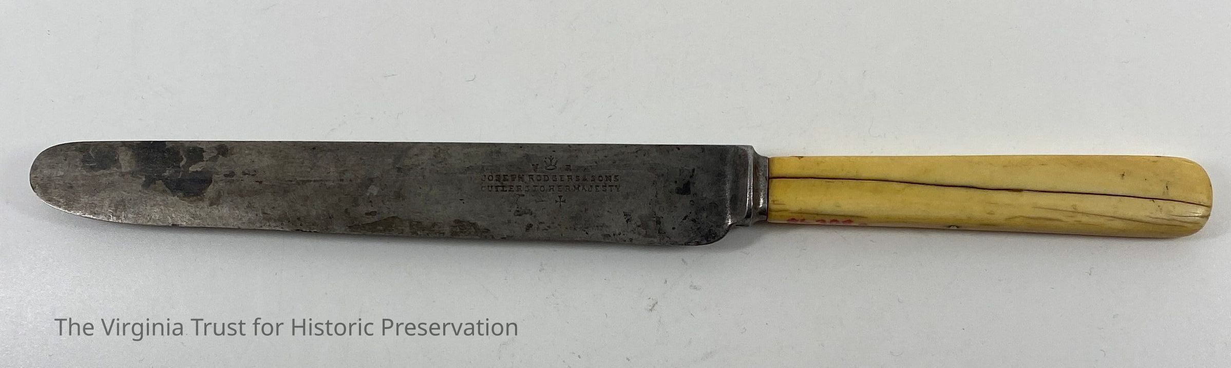 Metal knife with bone handle. Set of 10 (A-I) marked "Joseph Rogers & Sons, Cutlers to her Magesty 'VOR'."