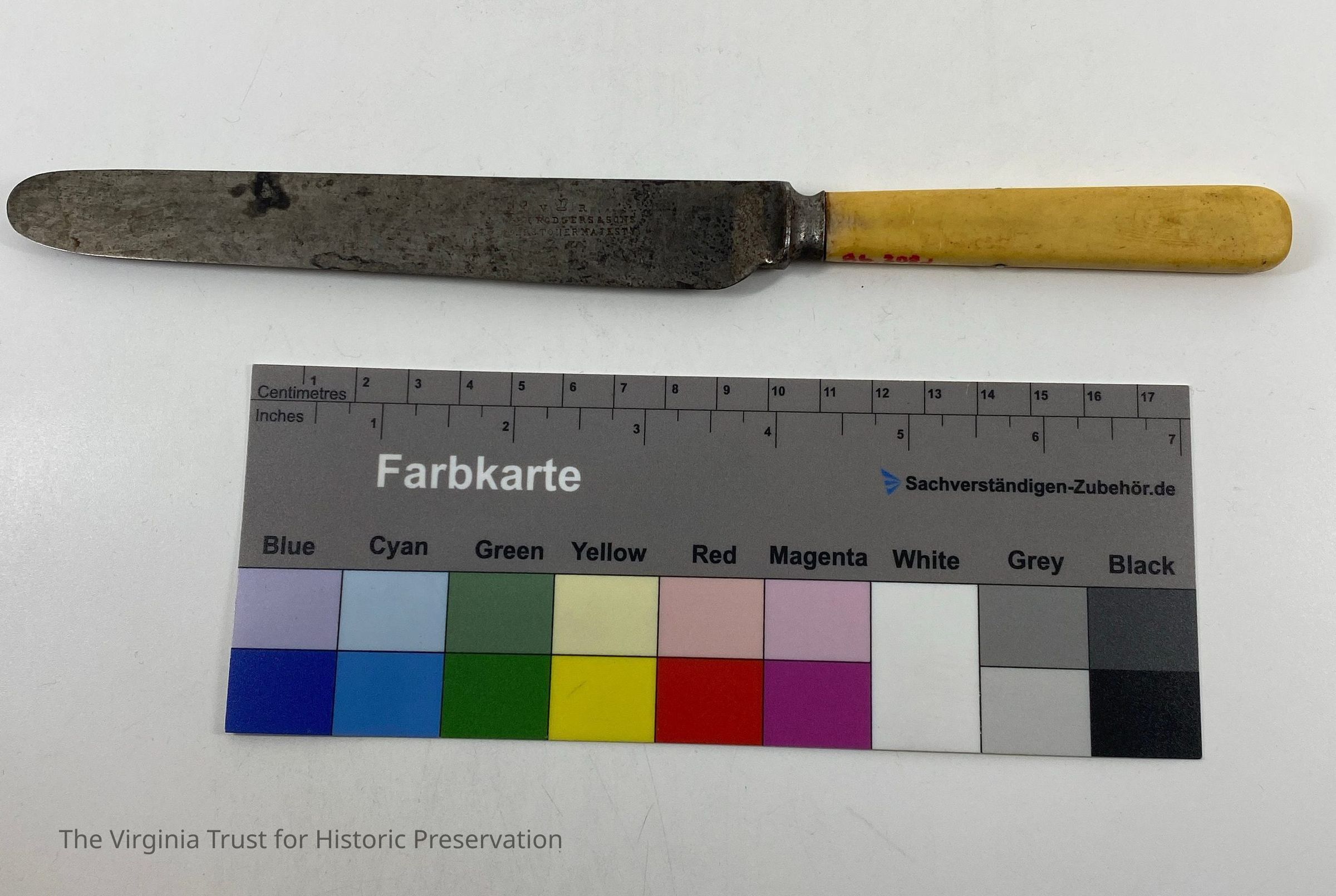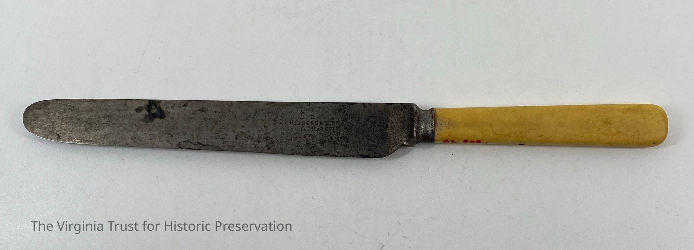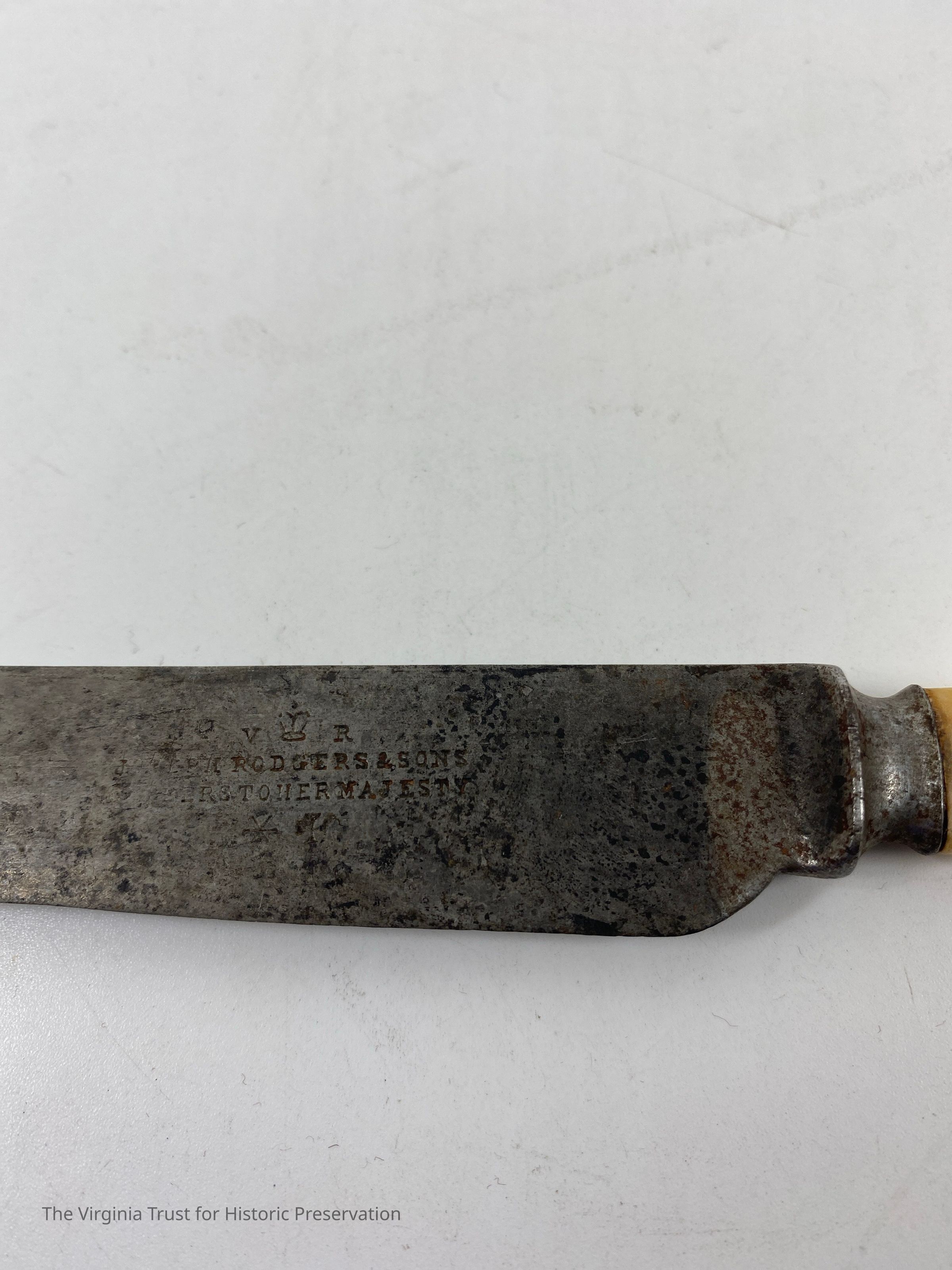 Metal knife with bone handle. Set of 10 (A-I) marked "Joseph Rogers & Sons, Cutlers to her Magesty 'VOR'."