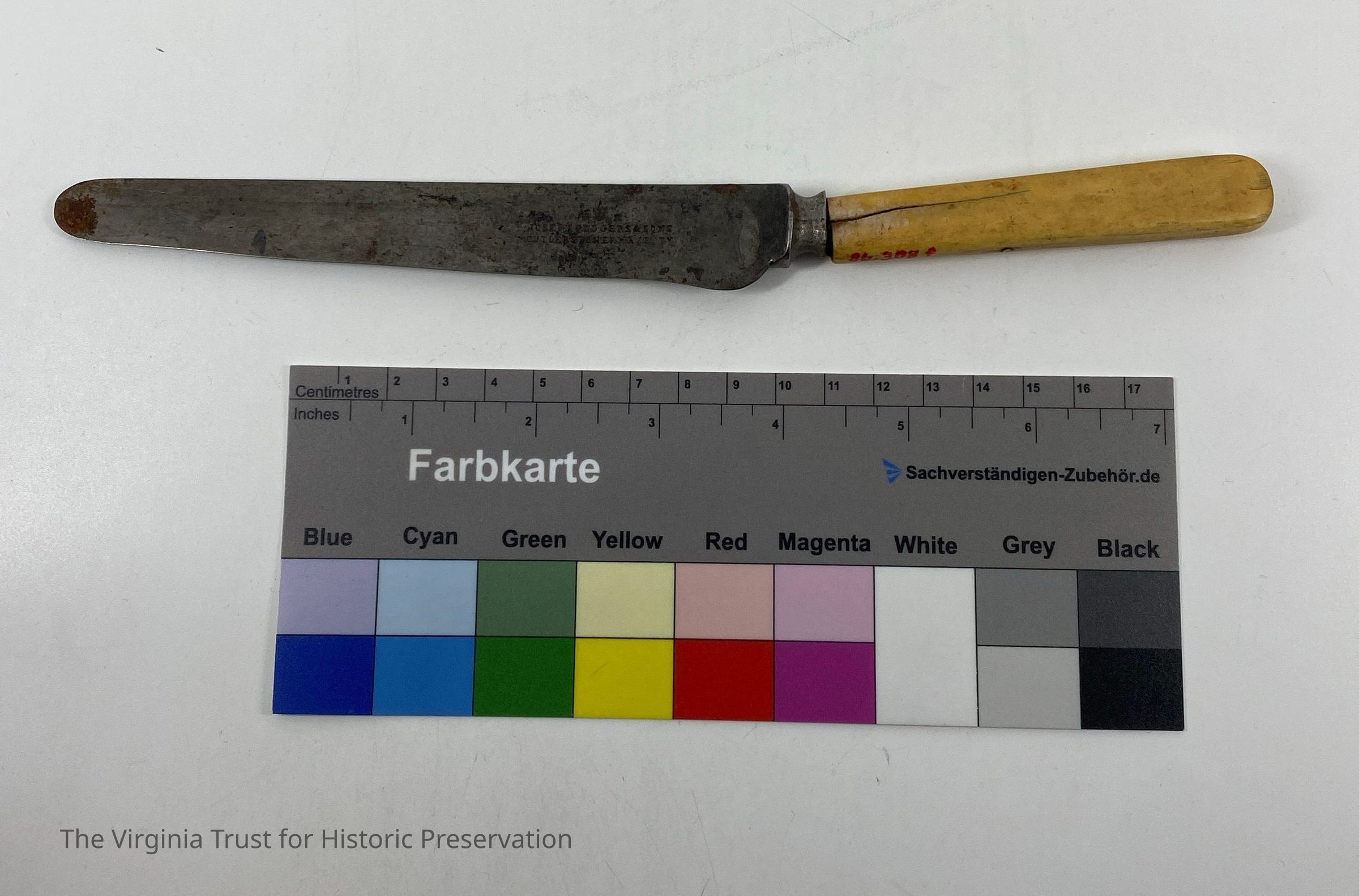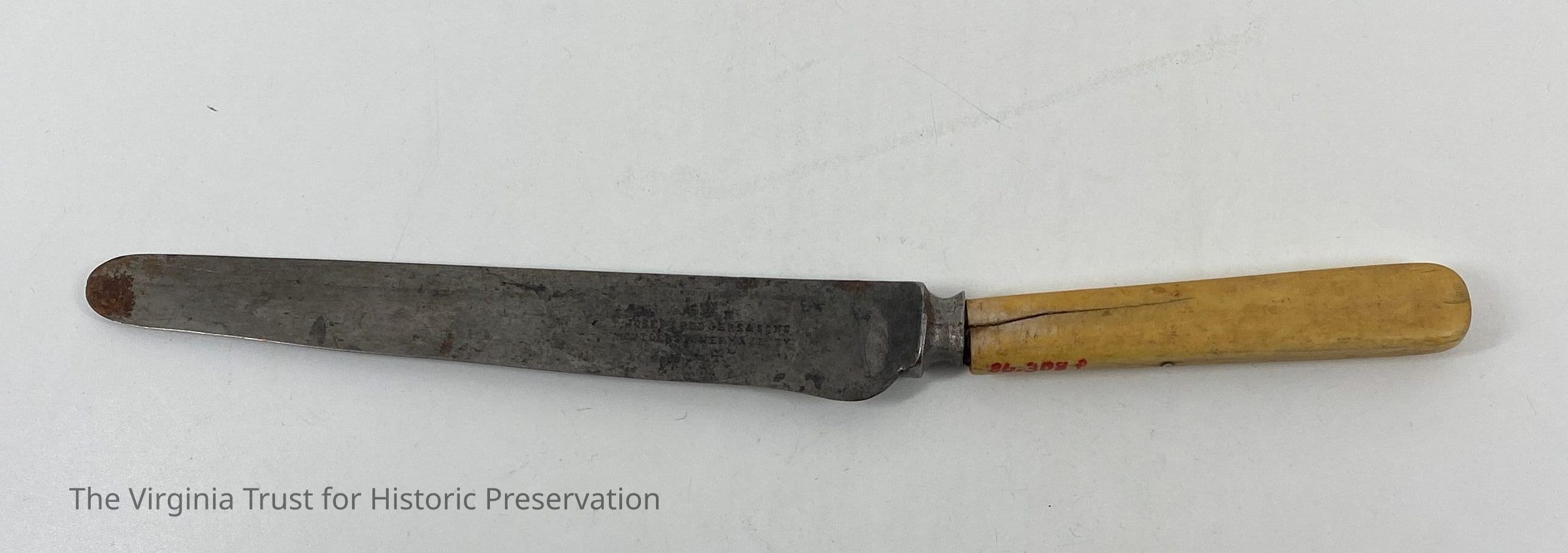 Metal knife with bone handle. Set of 10 (A-I) marked "Joseph Rogers & Sons, Cutlers to her Magesty 'VOR'."