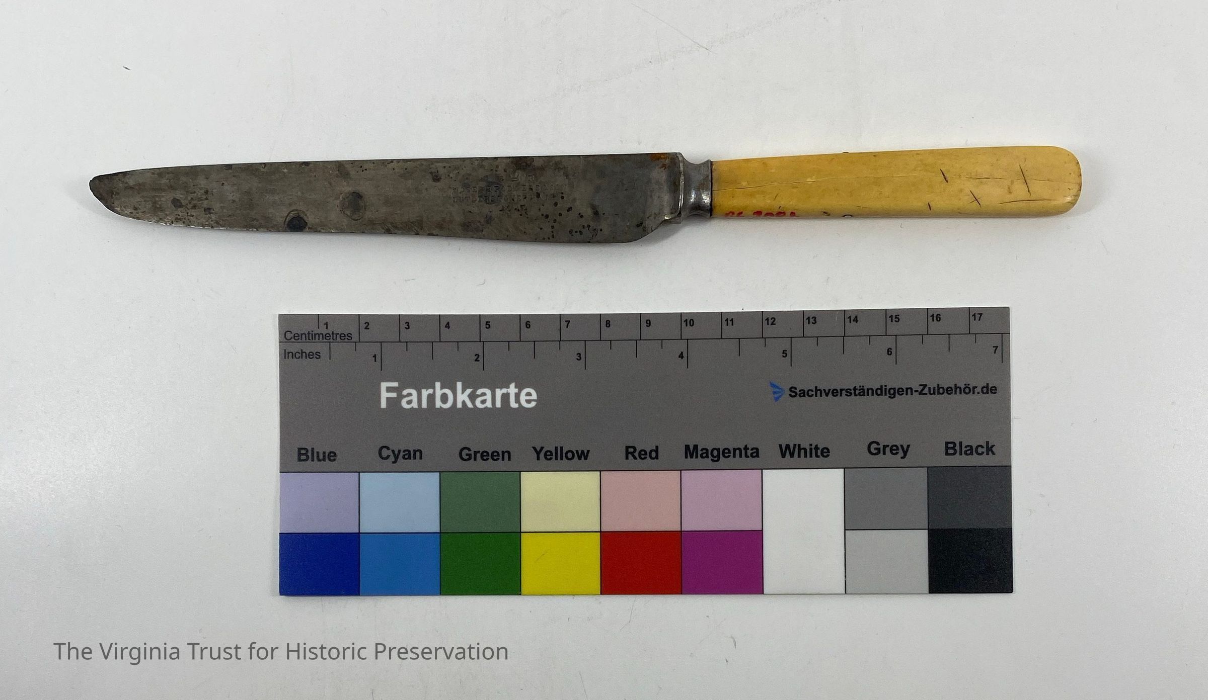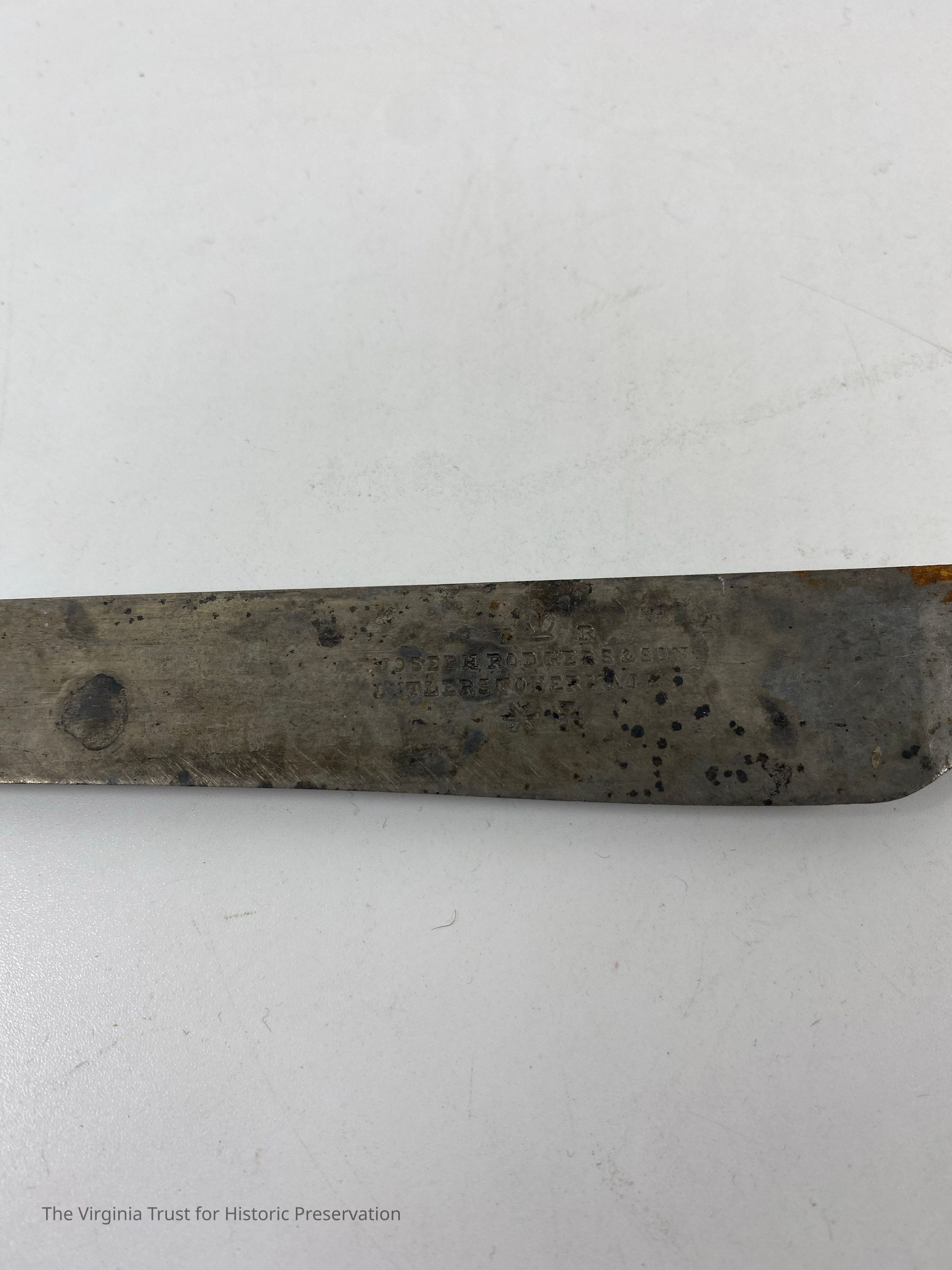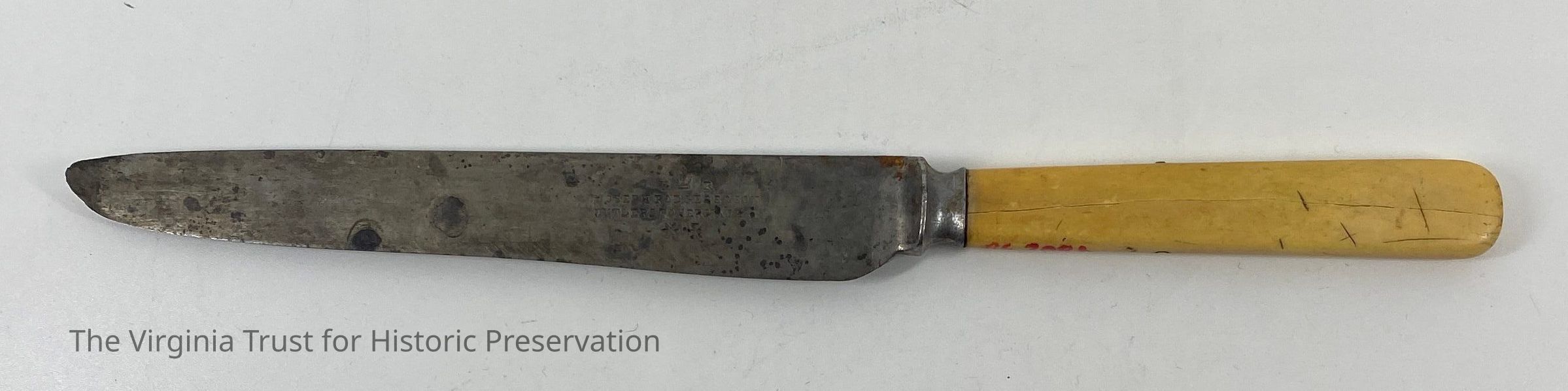 Metal knife with bone handle. Set of 10 (A-I) marked "Joseph Rogers & Sons, Cutlers to her Magesty 'VOR'."