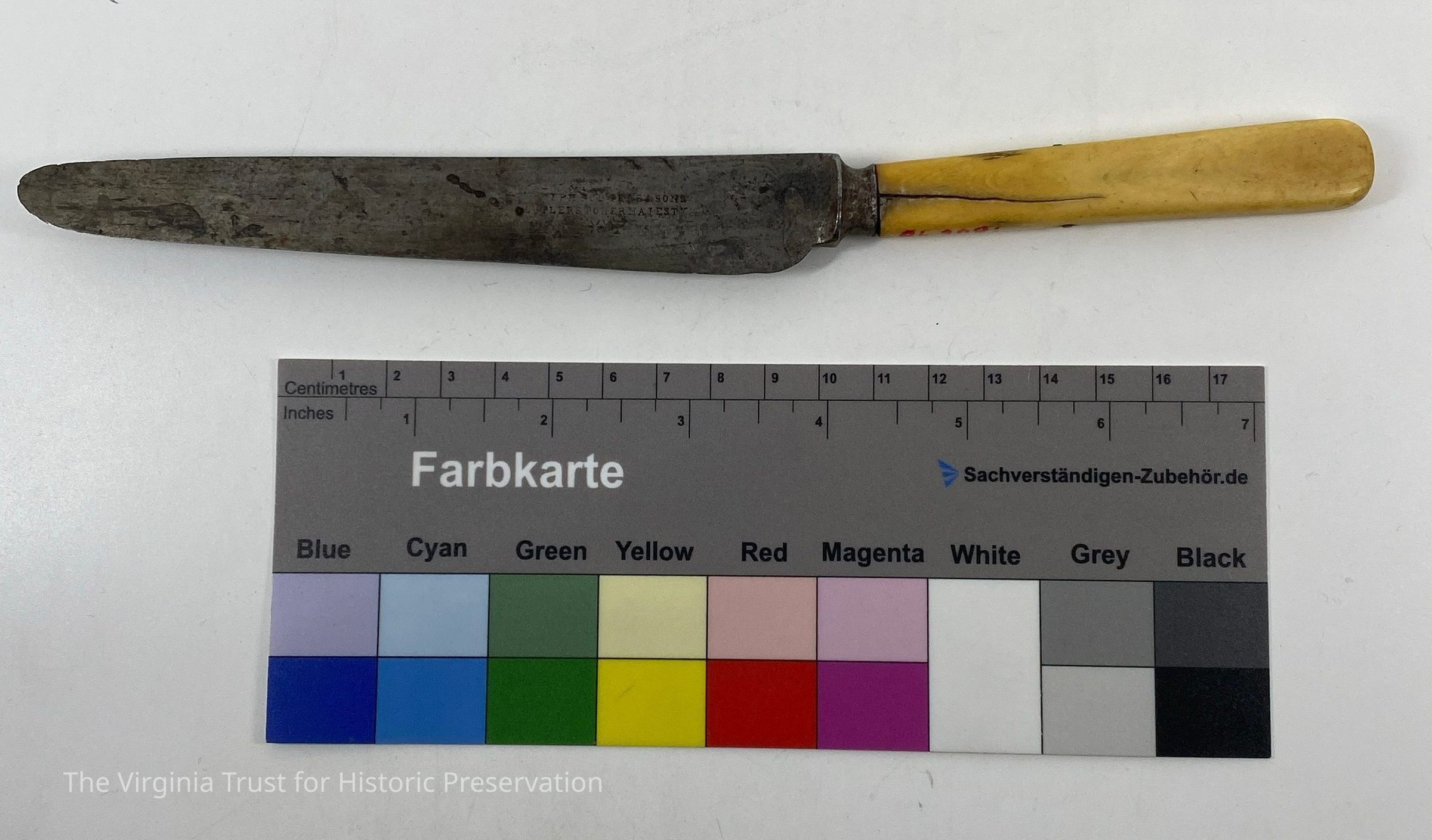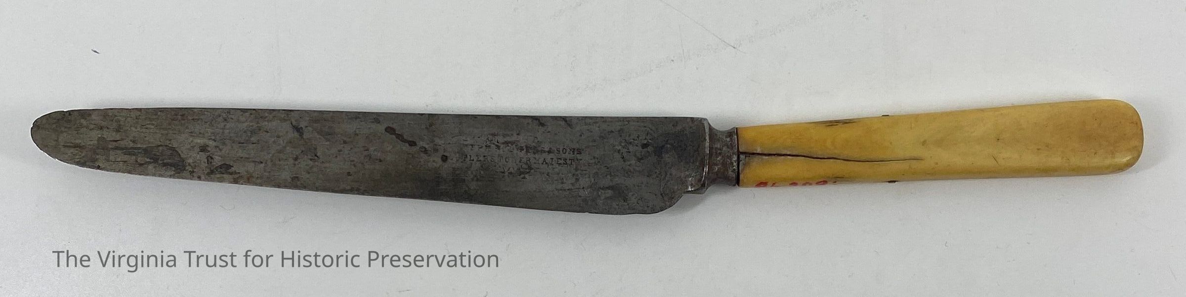 Metal knife with bone handle. Set of 10 (A-I) marked "Joseph Rogers & Sons, Cutlers to her Magesty 'VOR'."