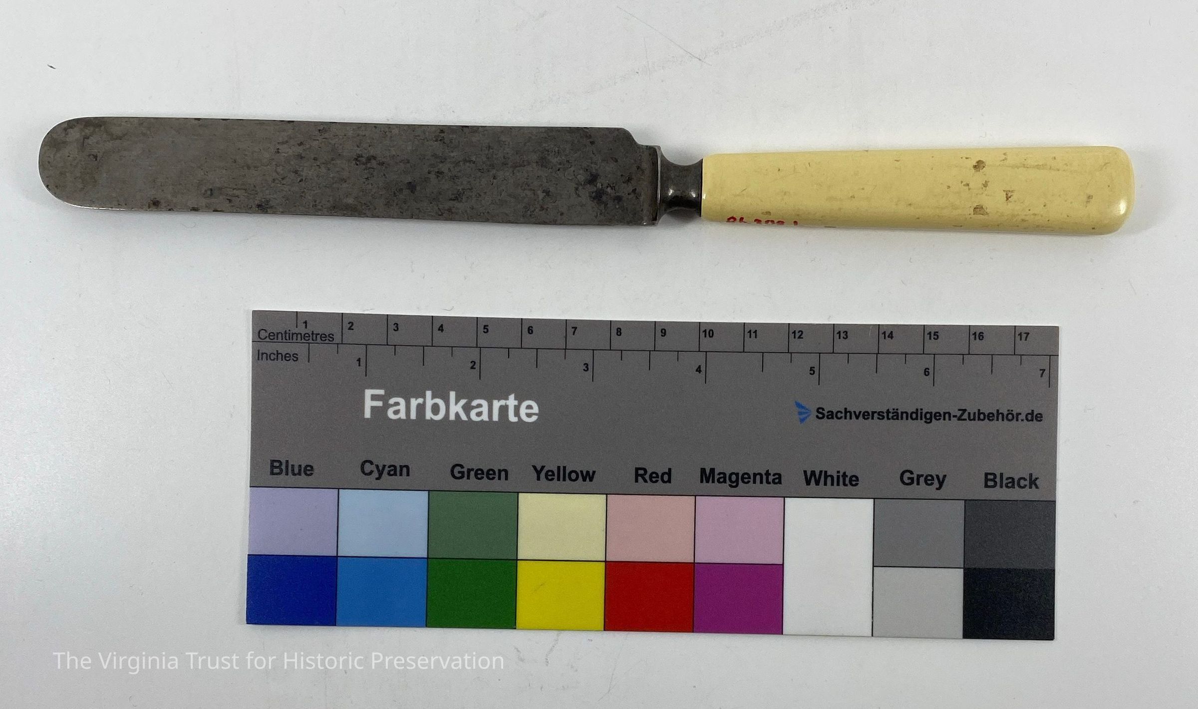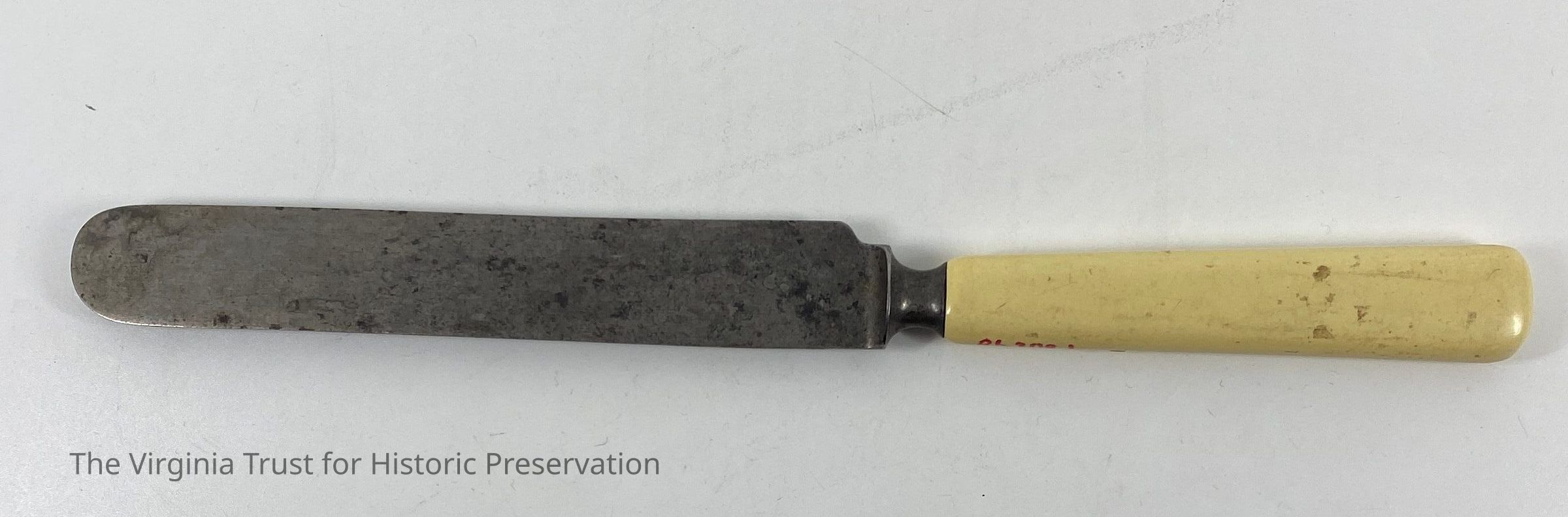 Metal knife with bone handle. Marked "Lamson * Goonow Mfg Co." Creame colored handle & cure shaped like butter knives.