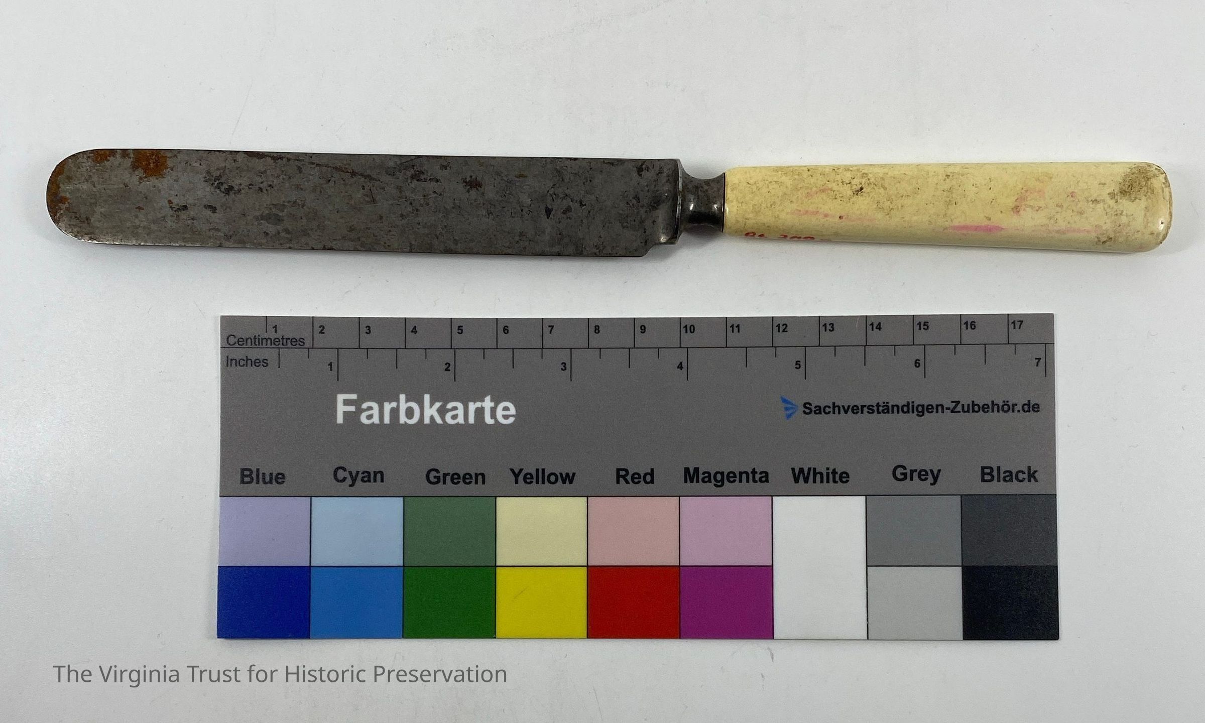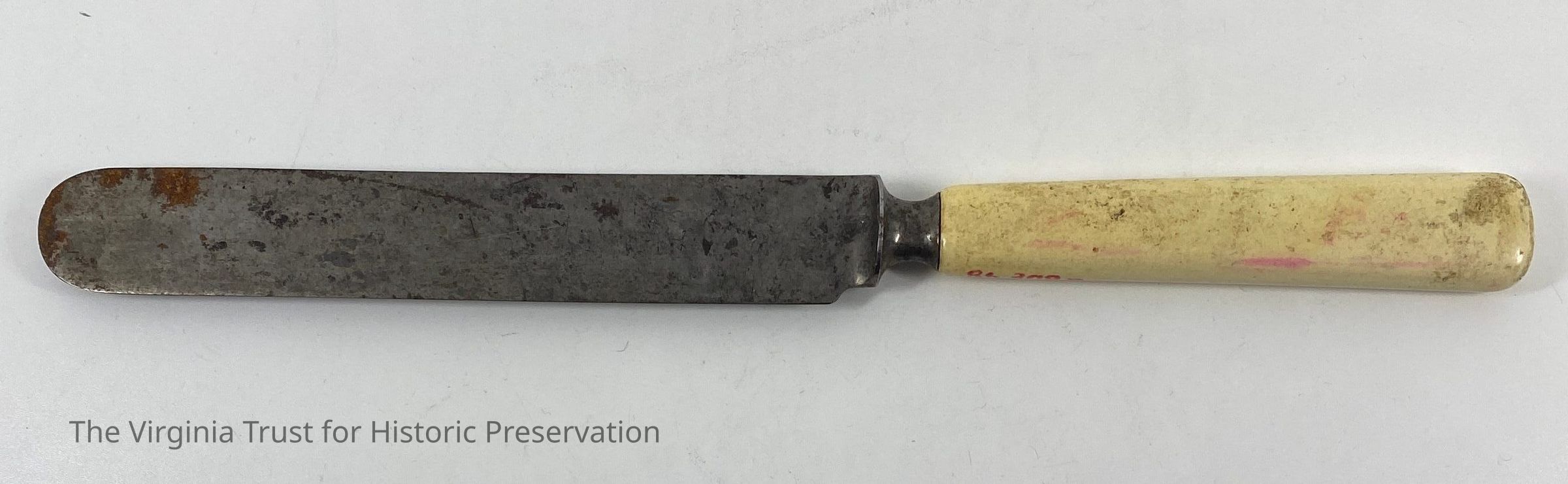 Metal knife with bone handle. Marked "Lamson & Goodnow Mfg Co." Shaped like butter knife.