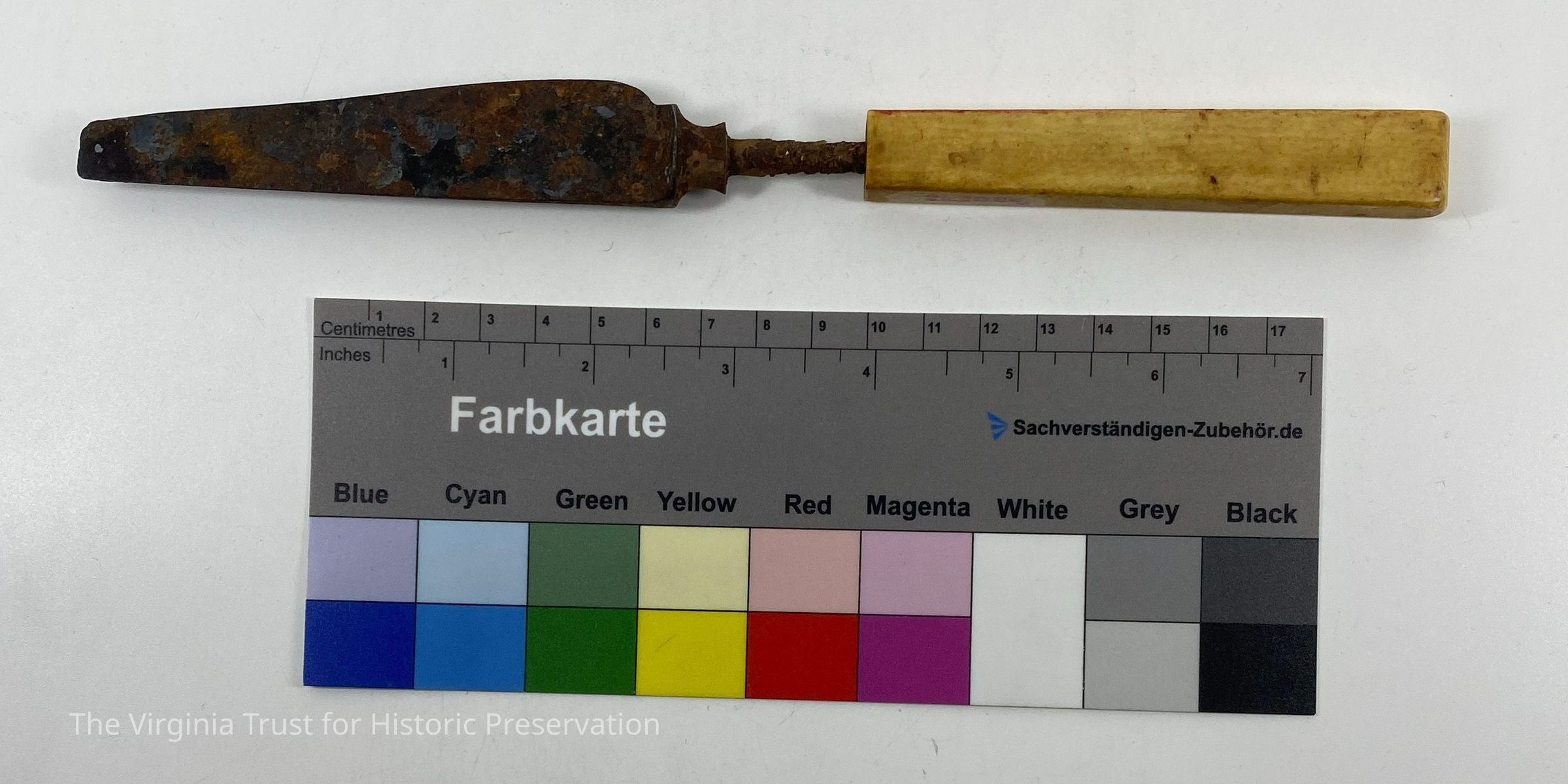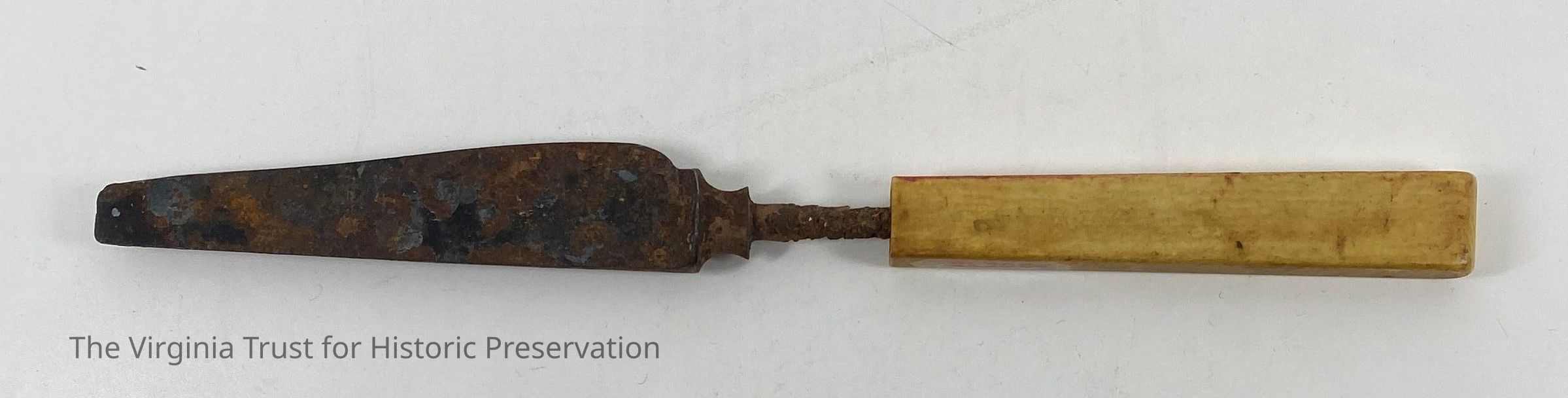 Metal blade with square bone handle. Blade is detattched from handle. Blade is 6.25", including part that goes into knife.