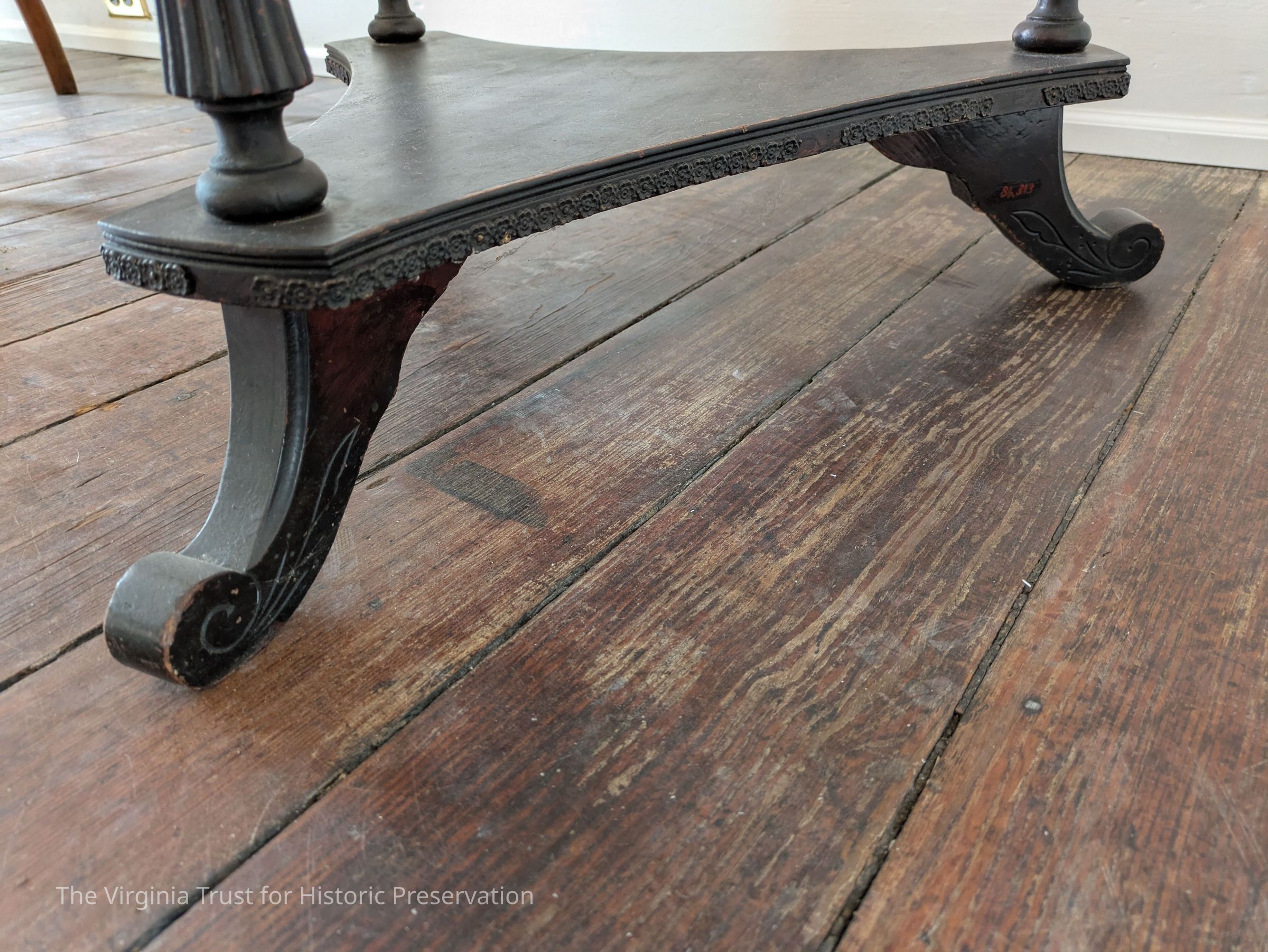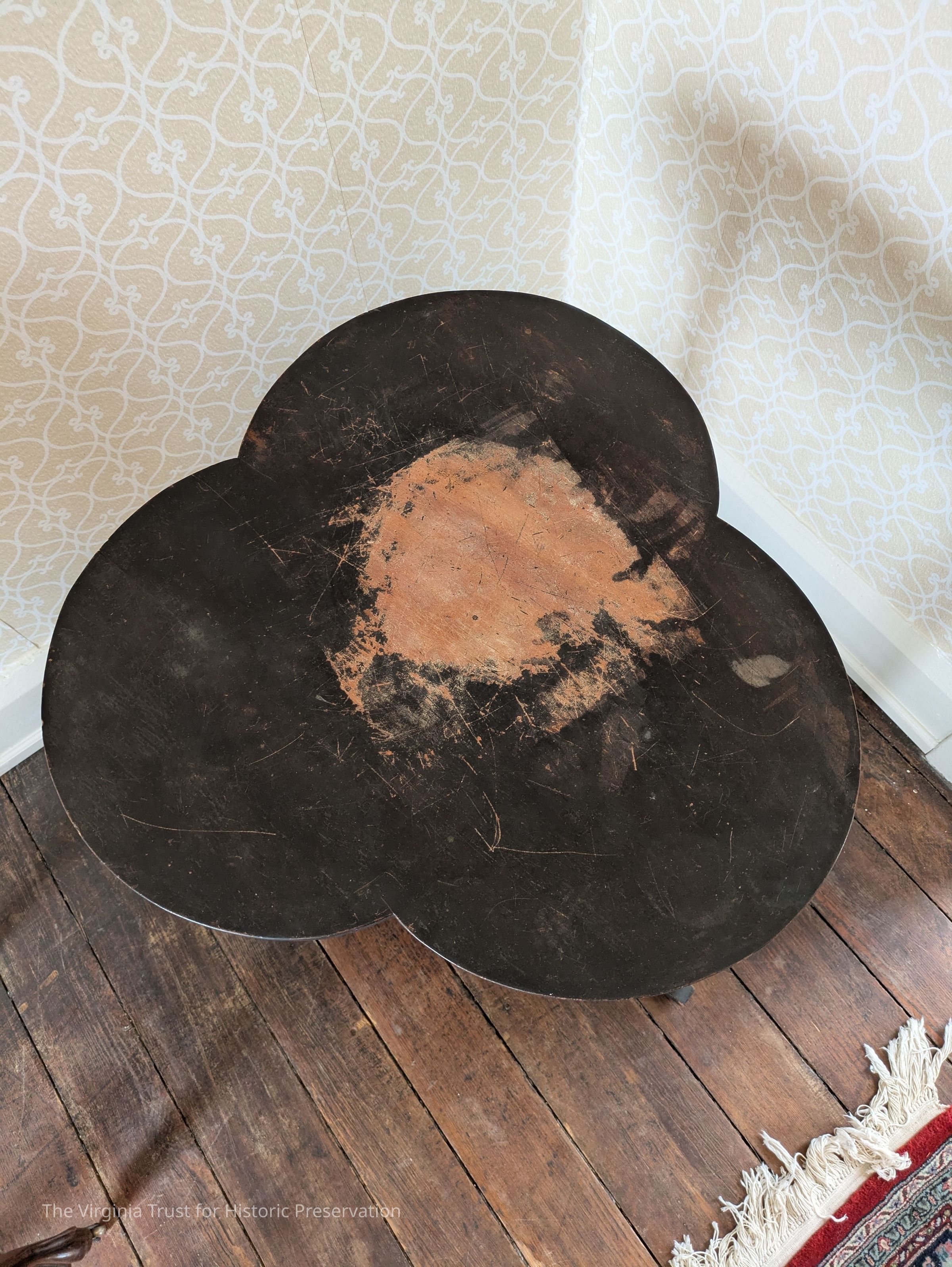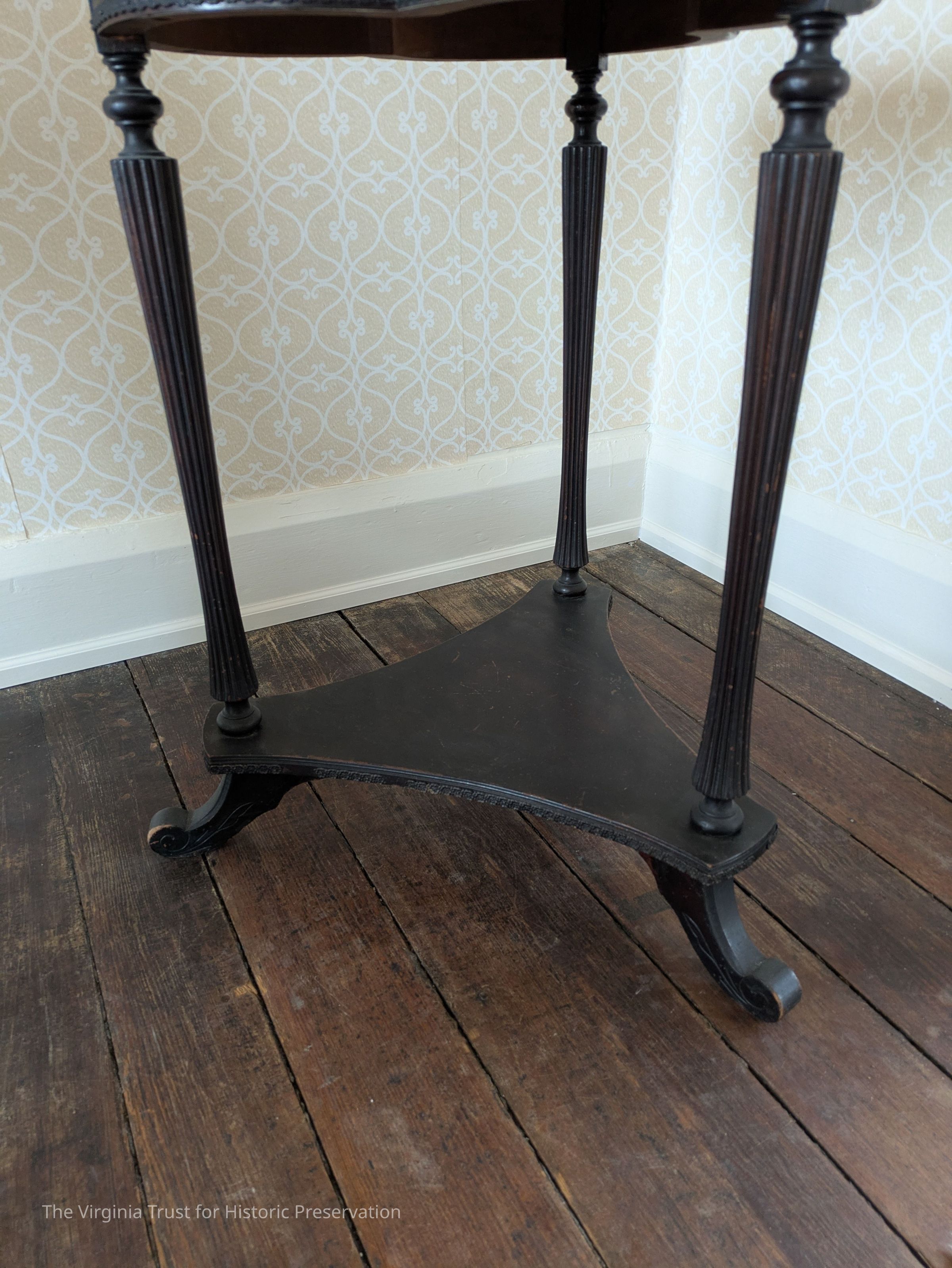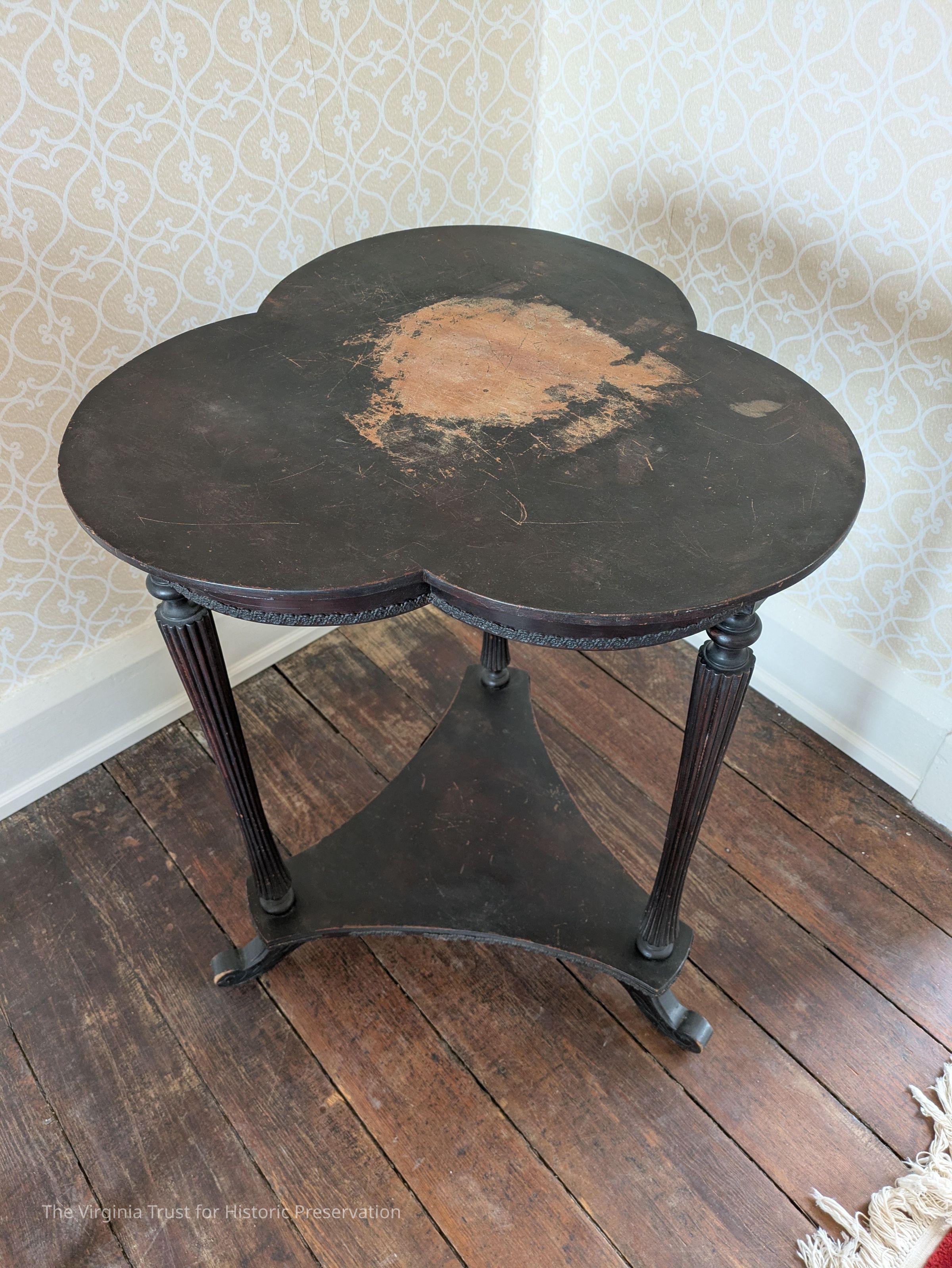 Cloverleaf shaped small table with three fluted legs and a bottom base in a triangular shape. Both top and base have a decorative band of small continuous flowers.