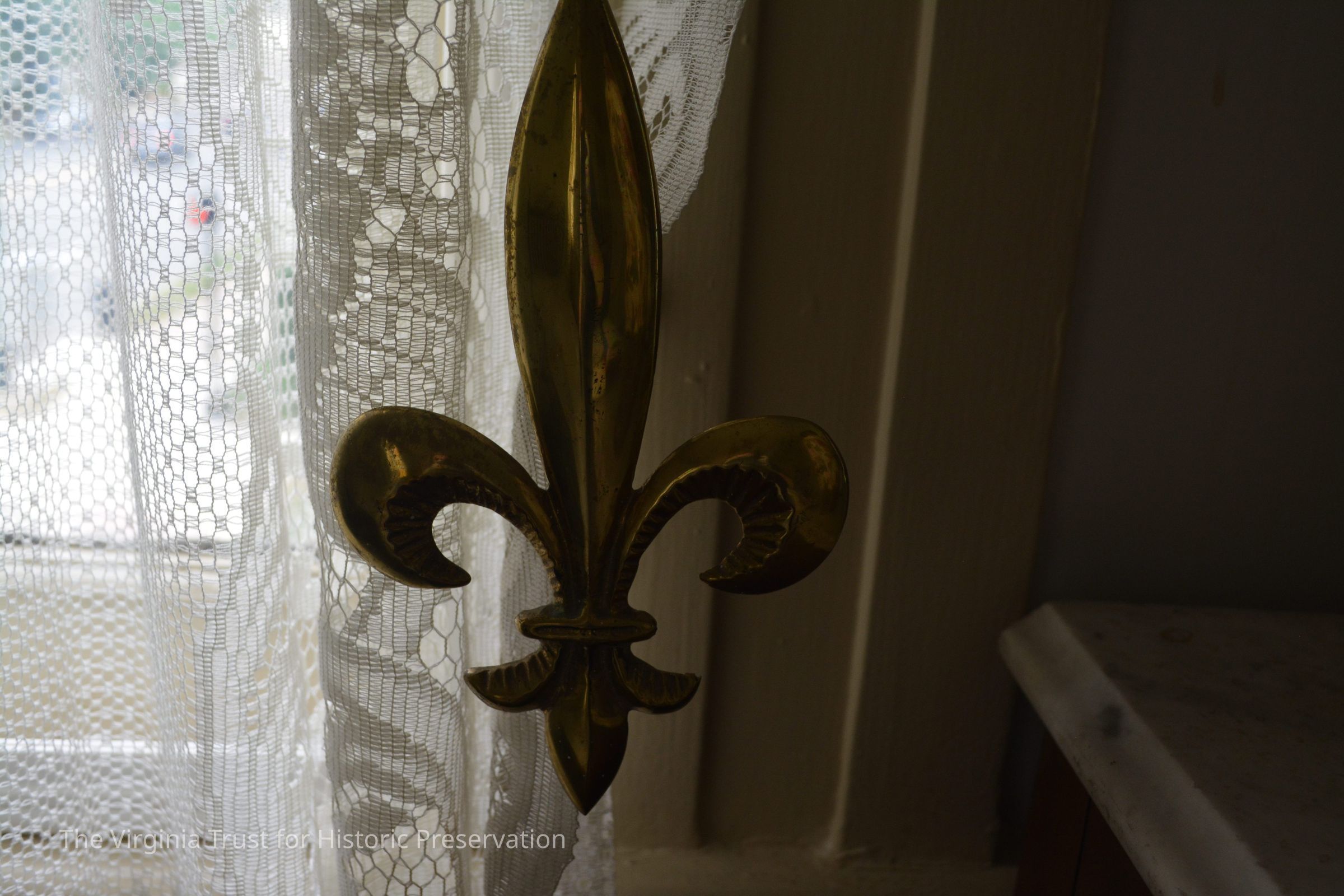 Plated brass curtain tie-backs with fleur-di-lis design. Total of six. Two broken from stem attachment.