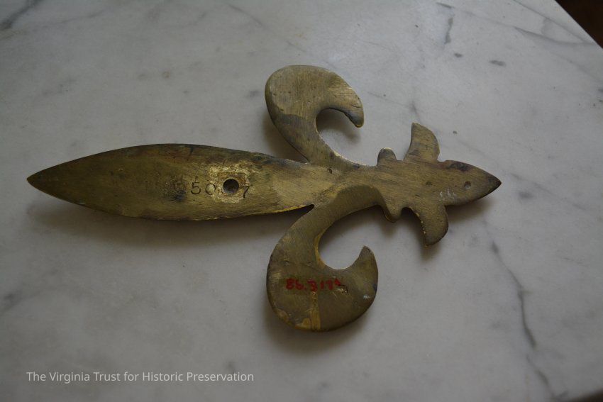 Plated brass curtain tie-backs with fleur-di-lis design. Total of six. Two broken from stem attachment.