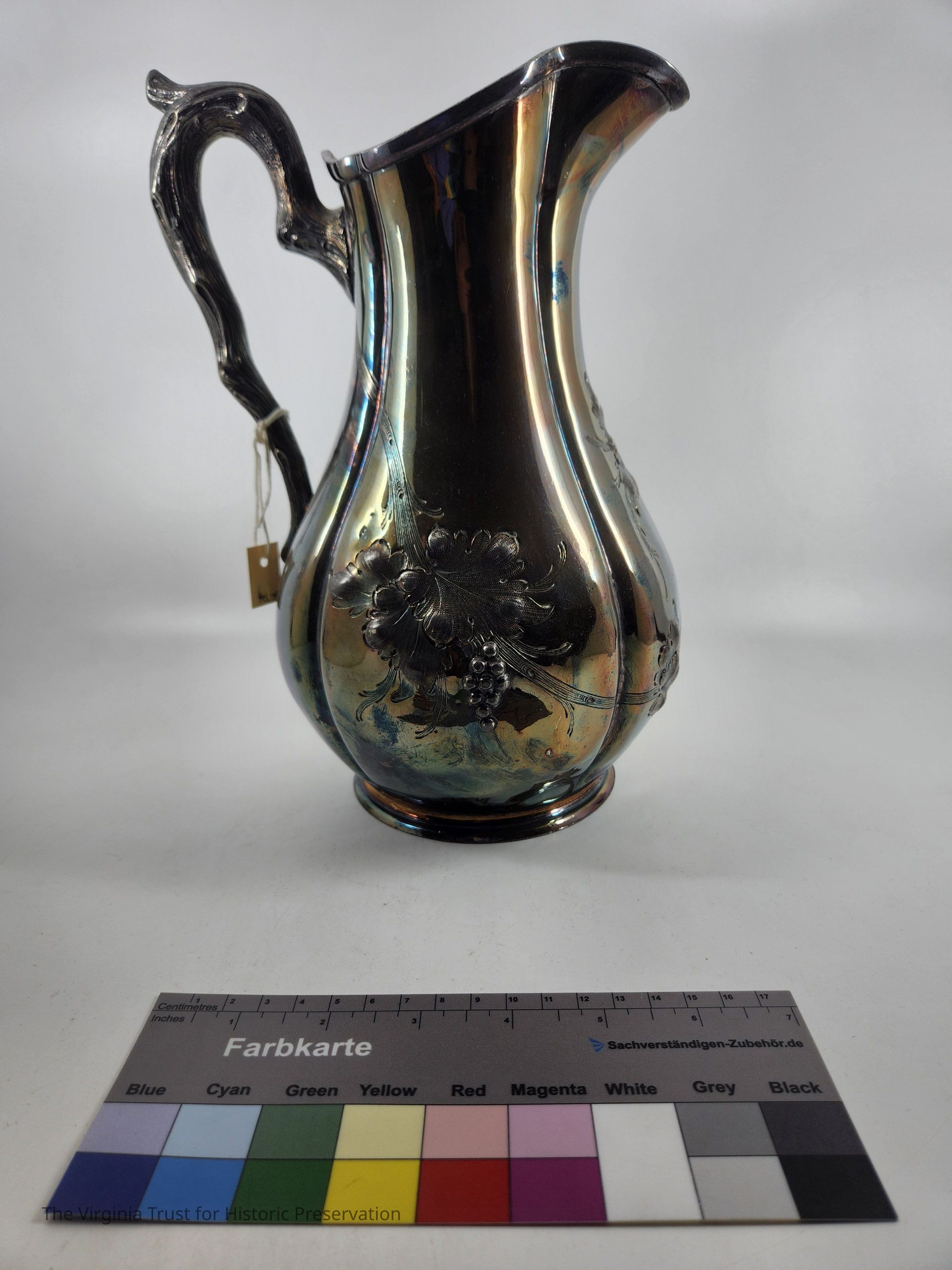 Lobed baluster form with respousse grapevine decoration; cast branch-form handle; moulded round foot. American-madeDimensions