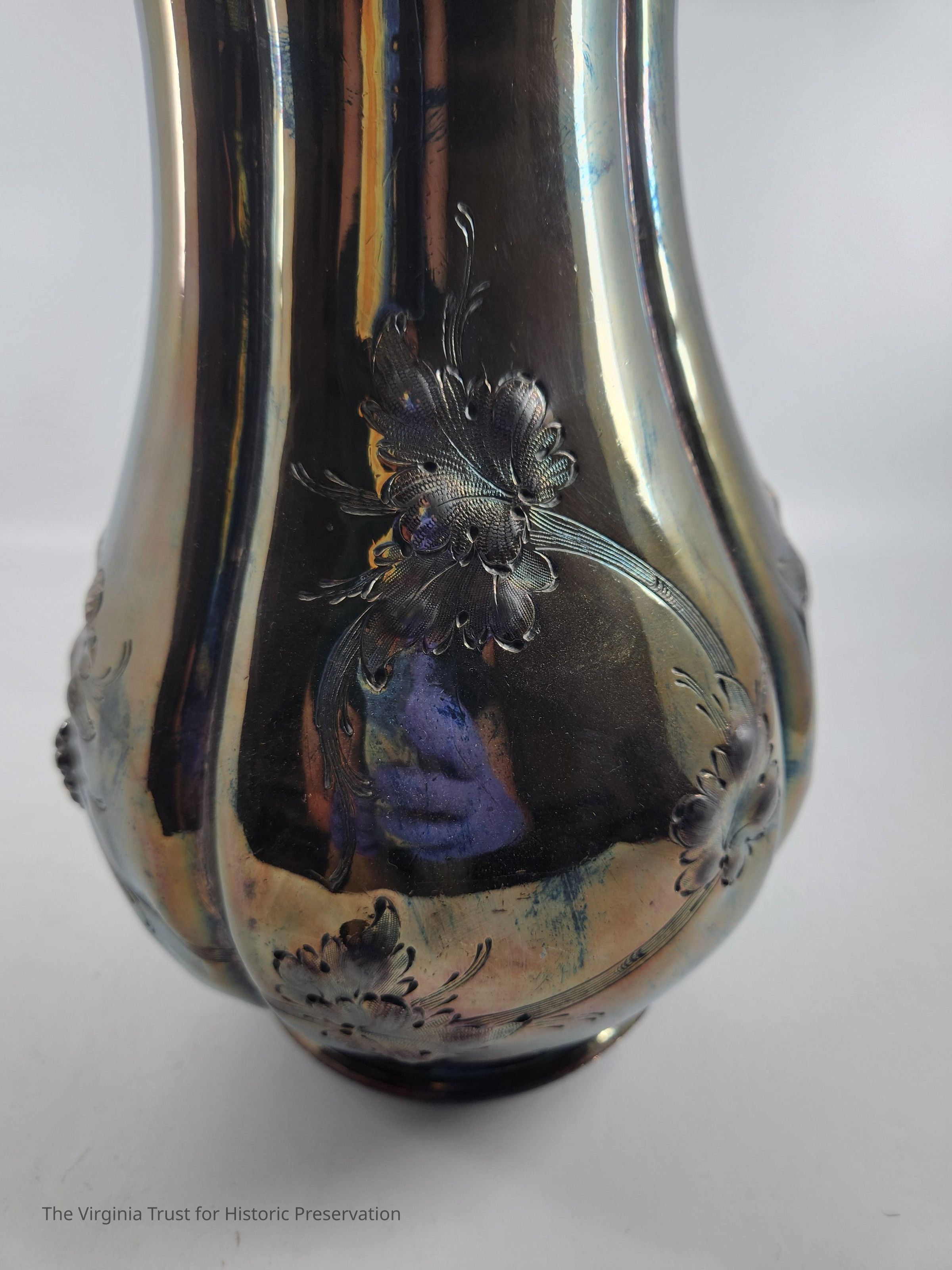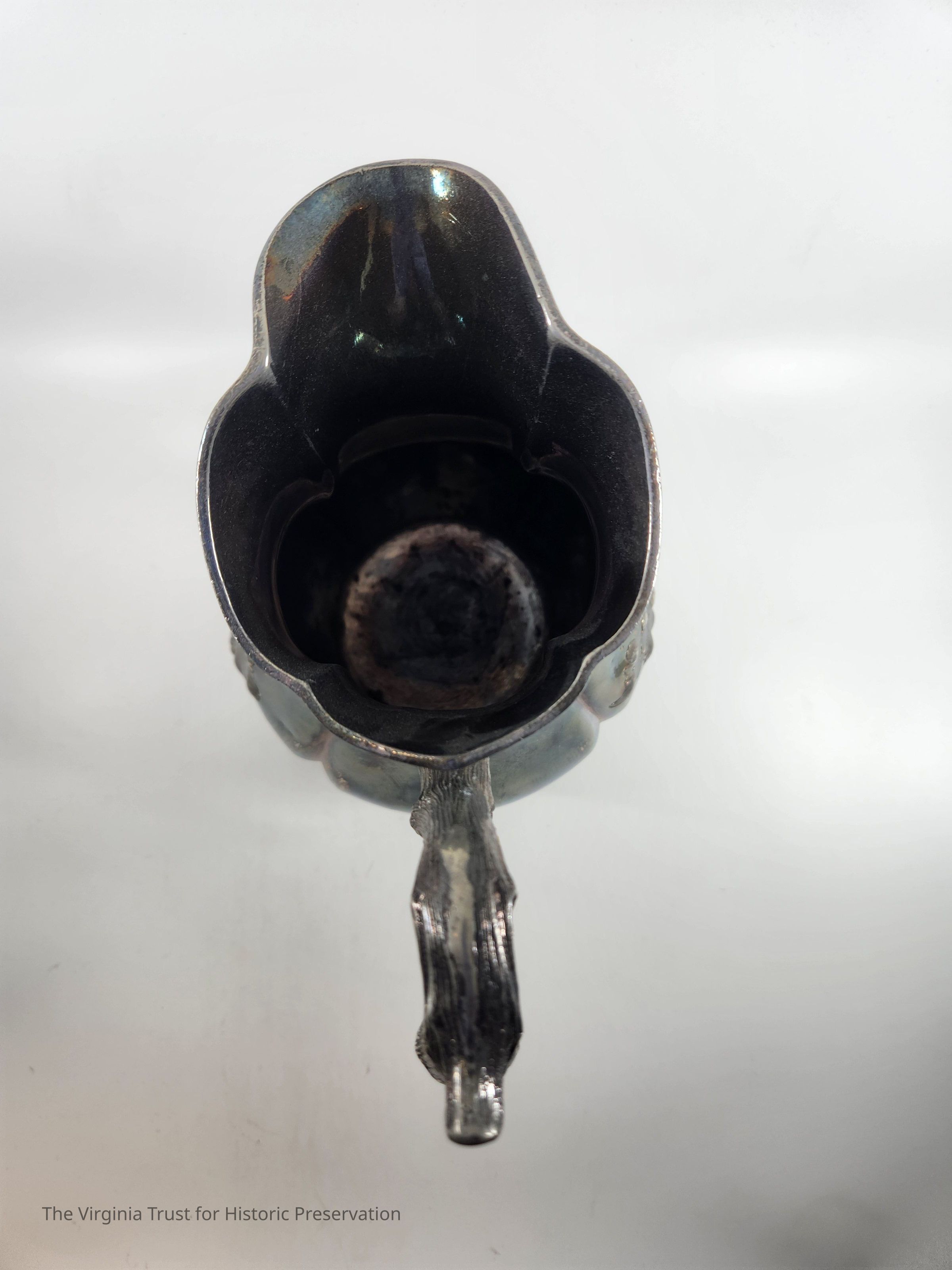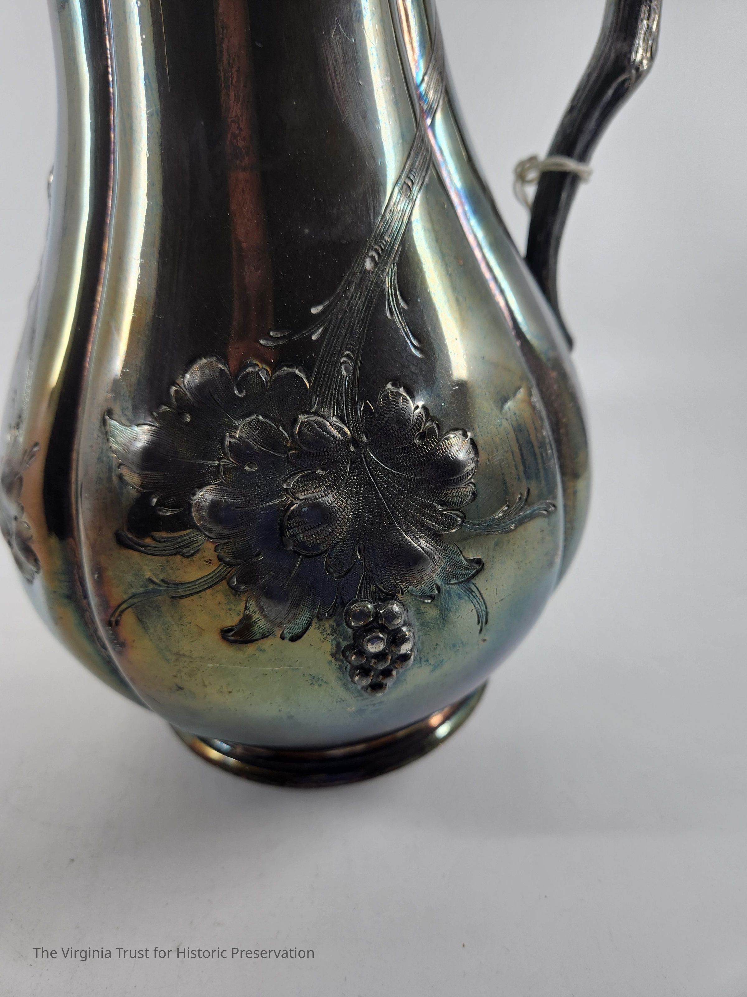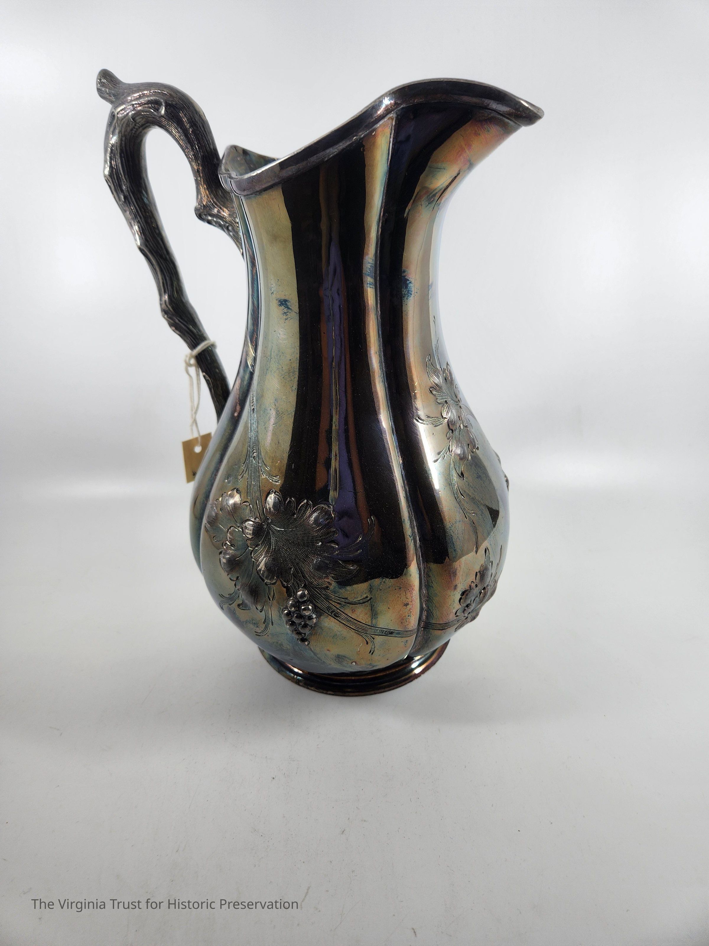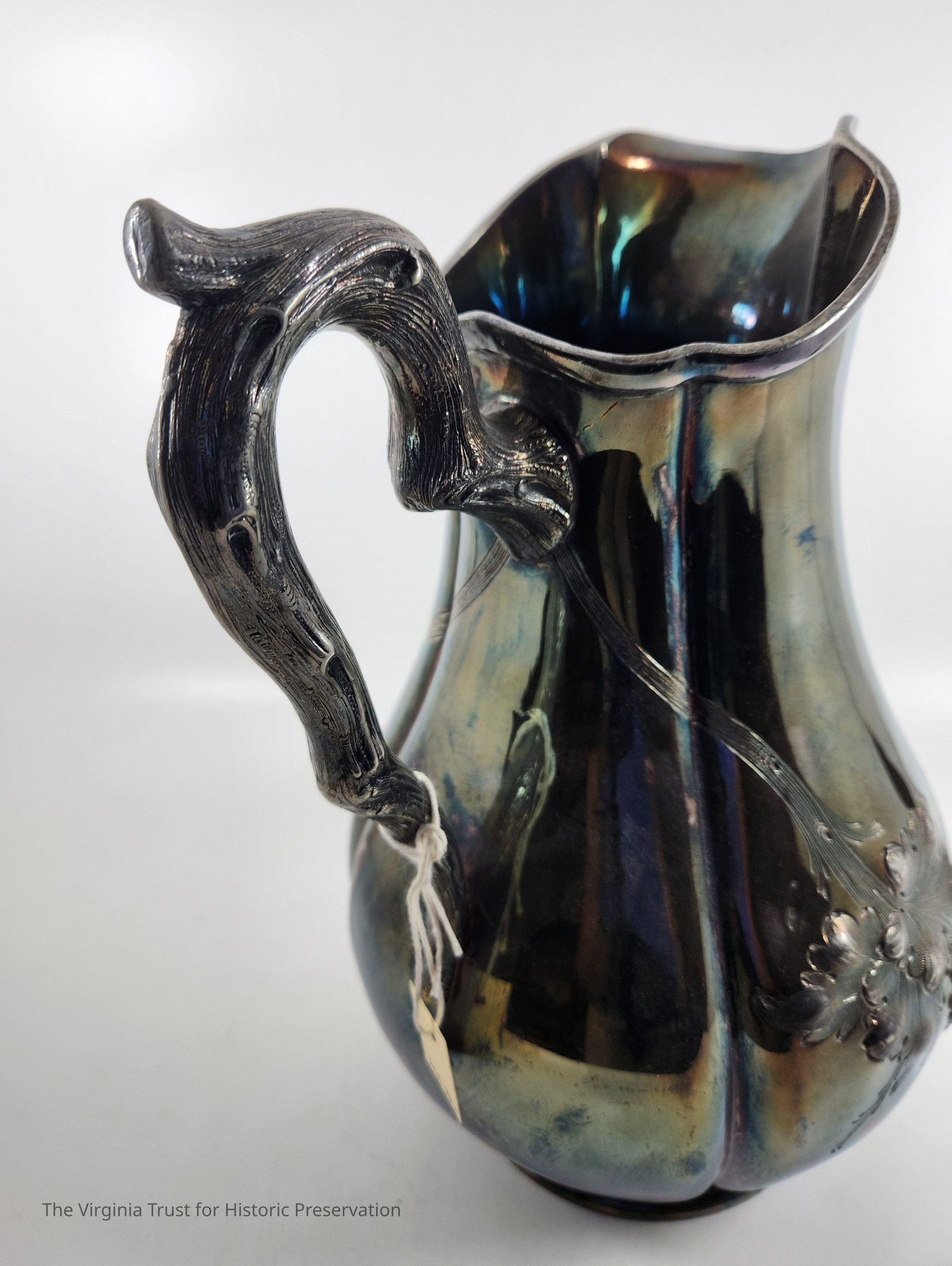 Silver christening pitcher with a floral design. Handle designed to look like tree branch. Used by the Lee family as a christening pitcher. Companion piece to the christening mug (1986.281)