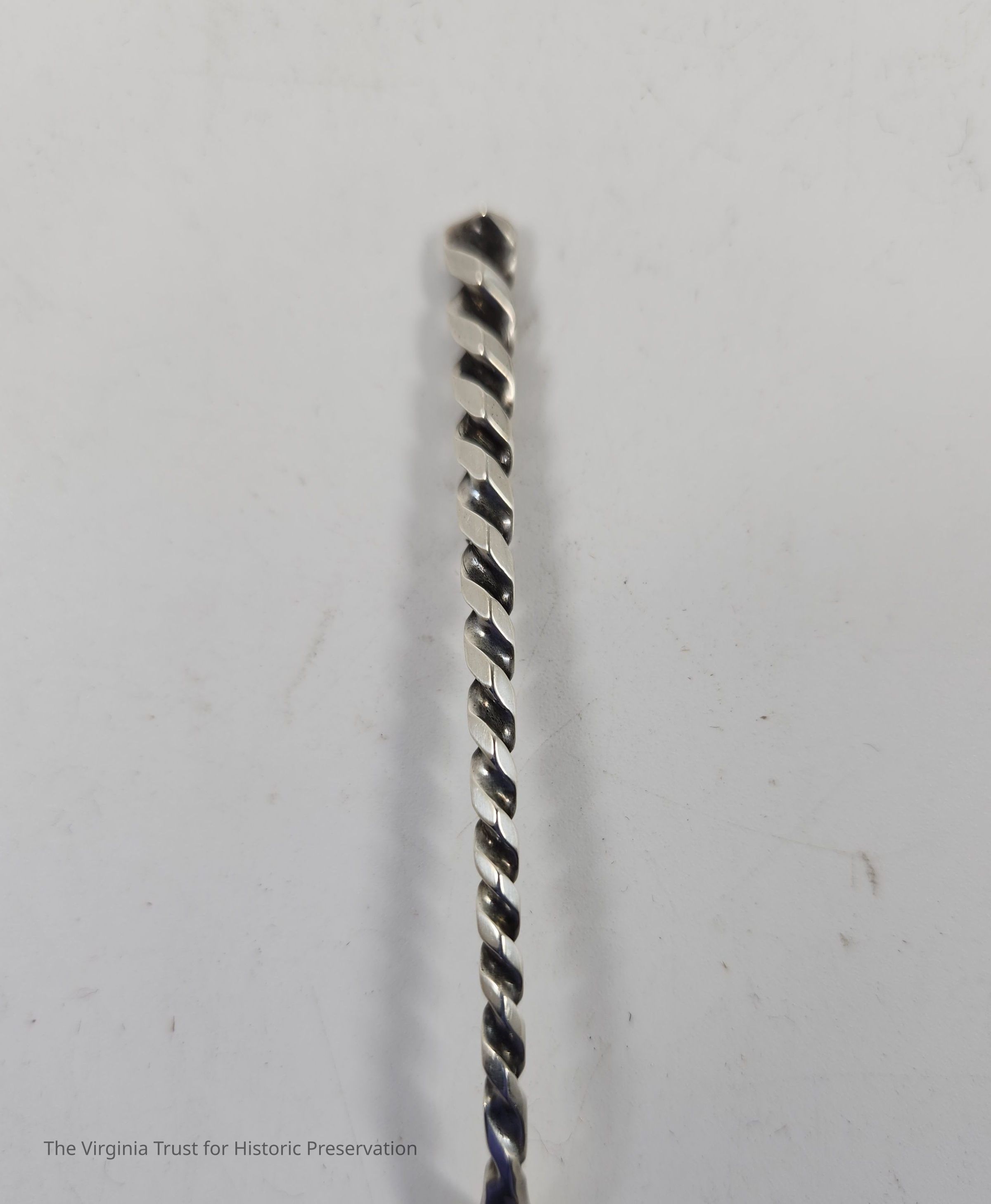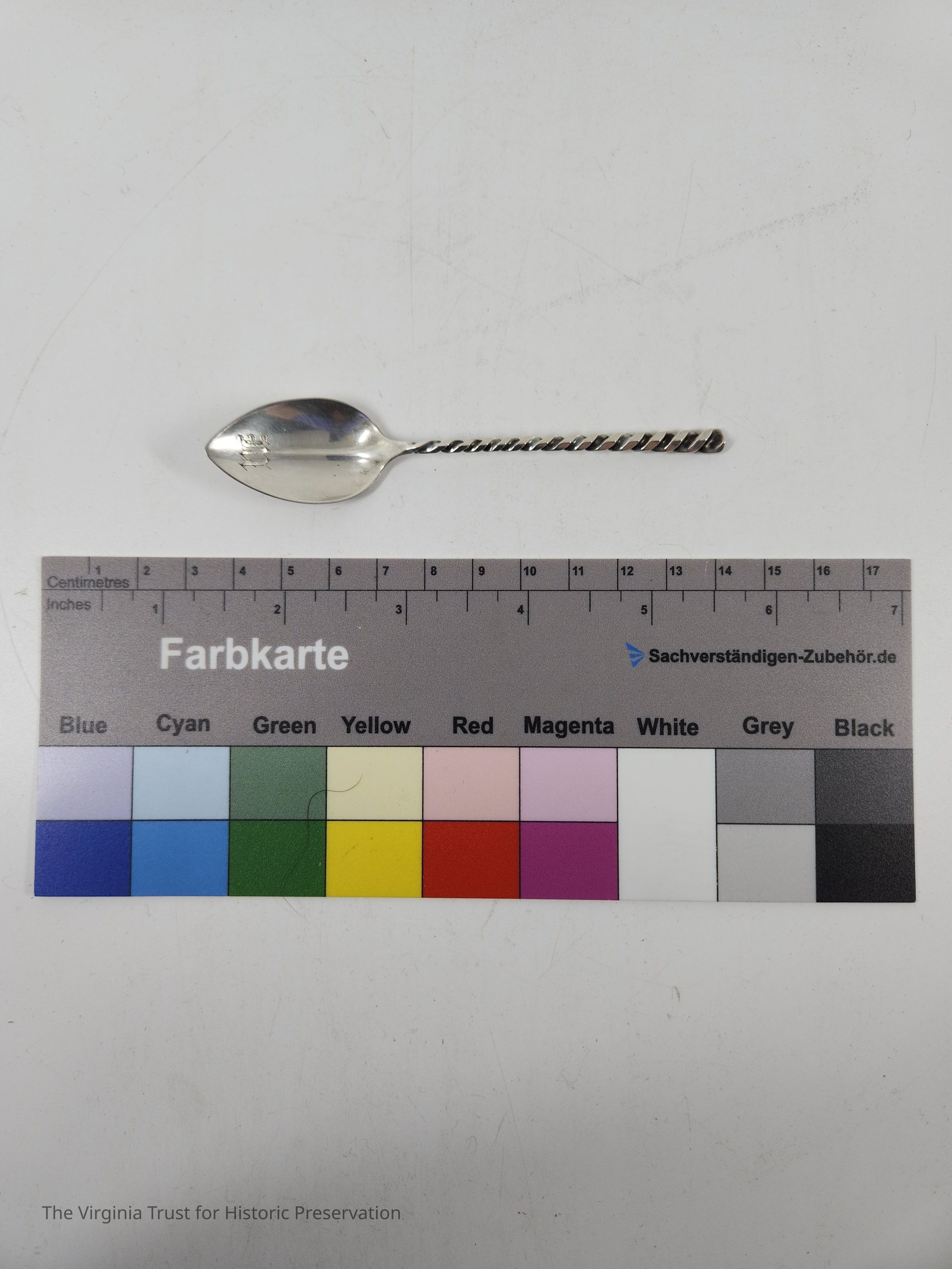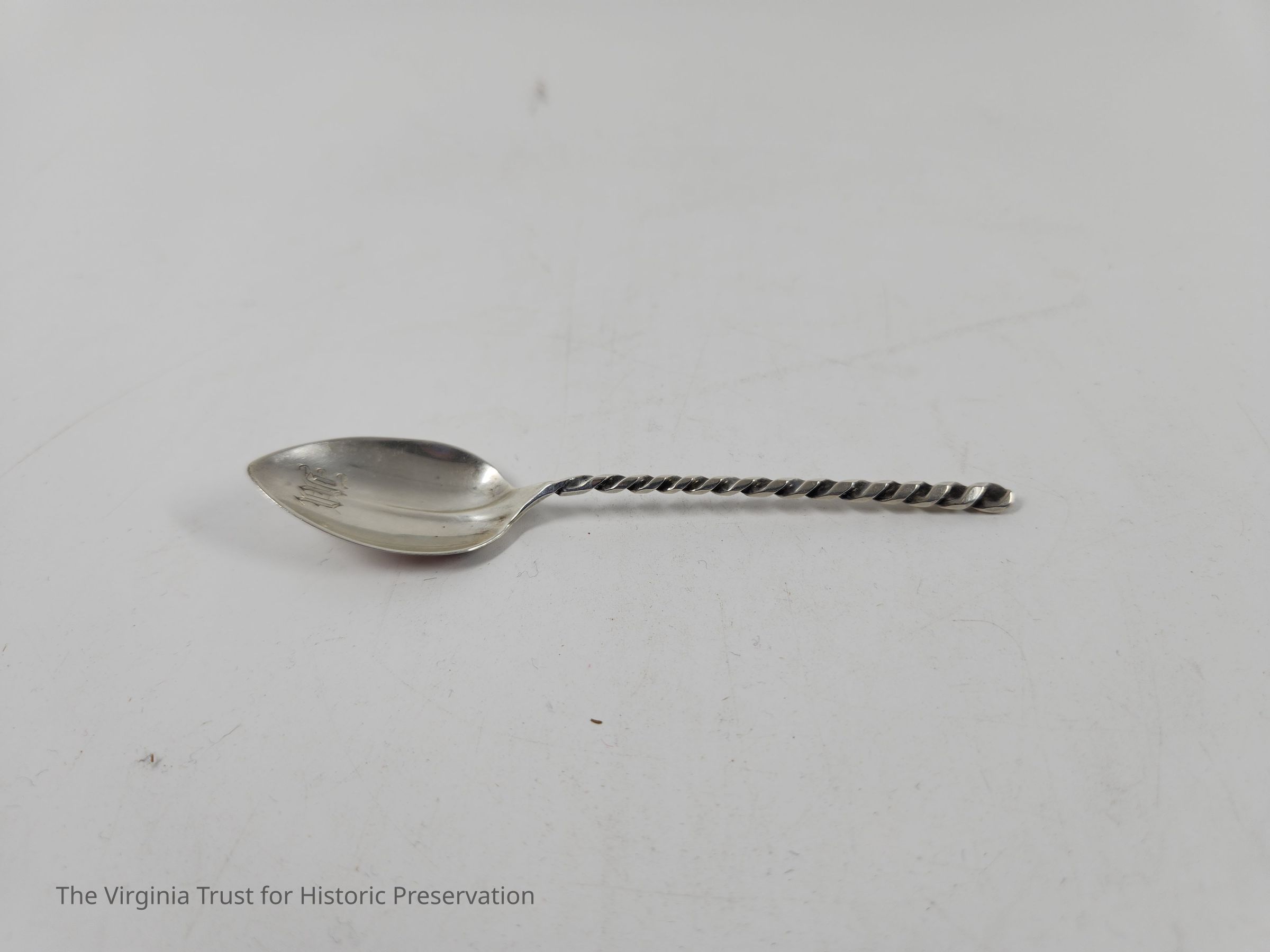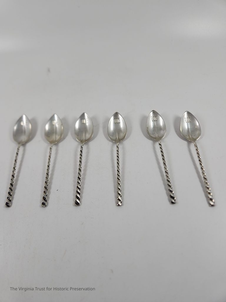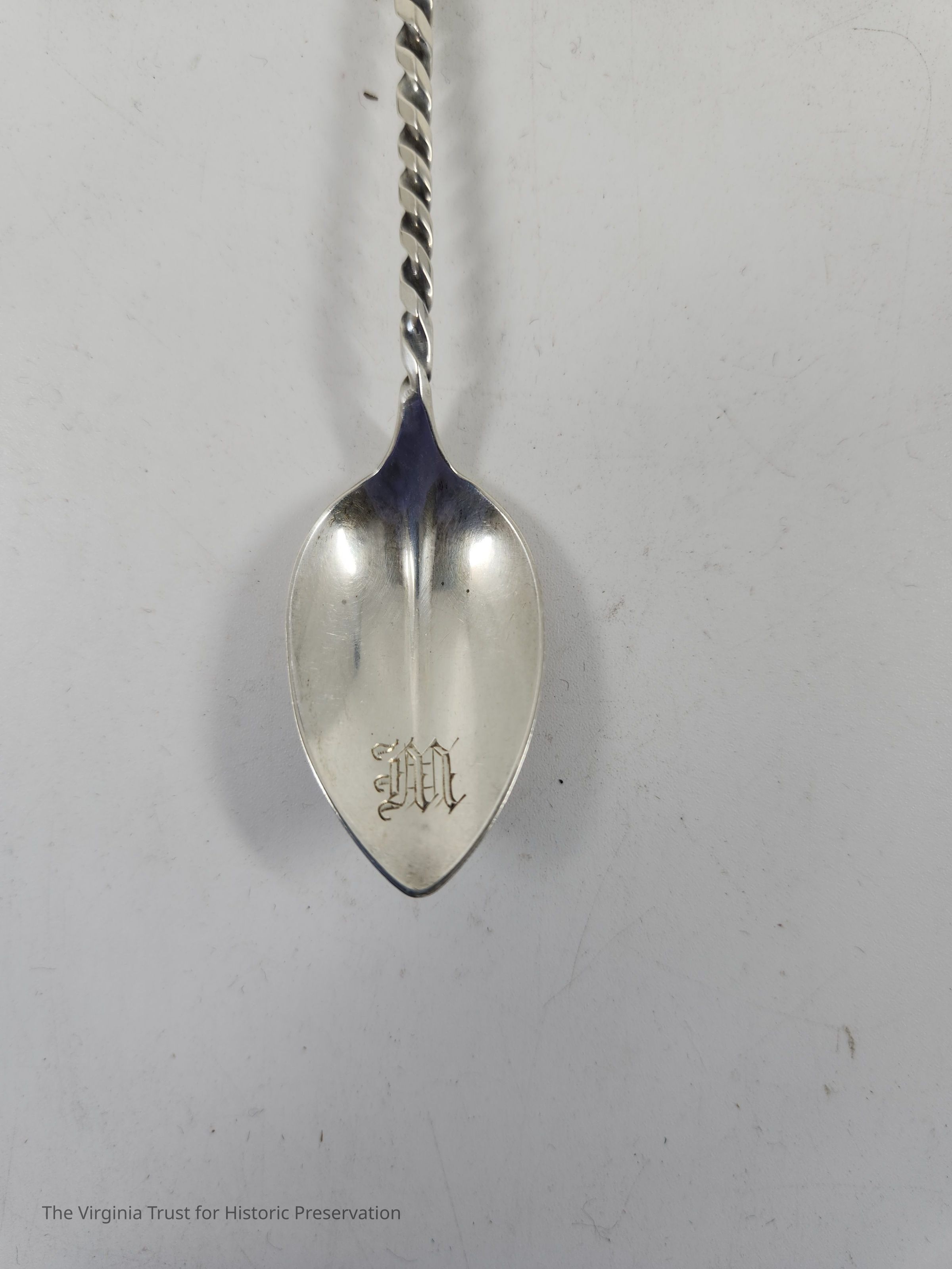 One of a set of six silver demitasse spoons with twisted handle and "M" monogrammed in the bowl