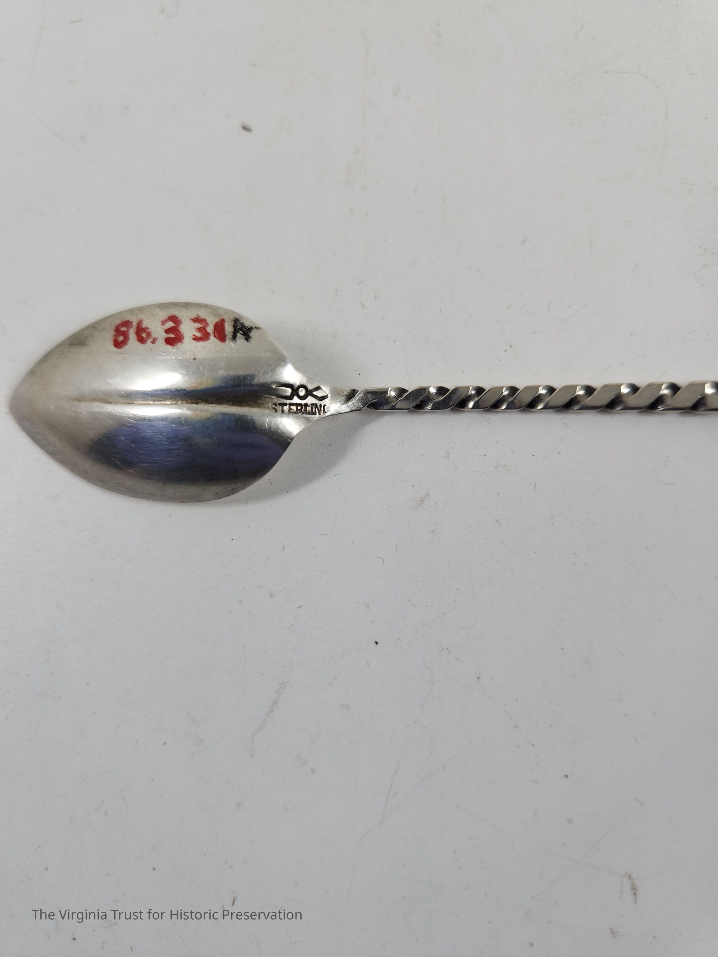 Part of set of six sterling silver demitasse spoons. Monogrammed "M" in bowl. Fully square twisted handle; pointed bowl. has hallmark.