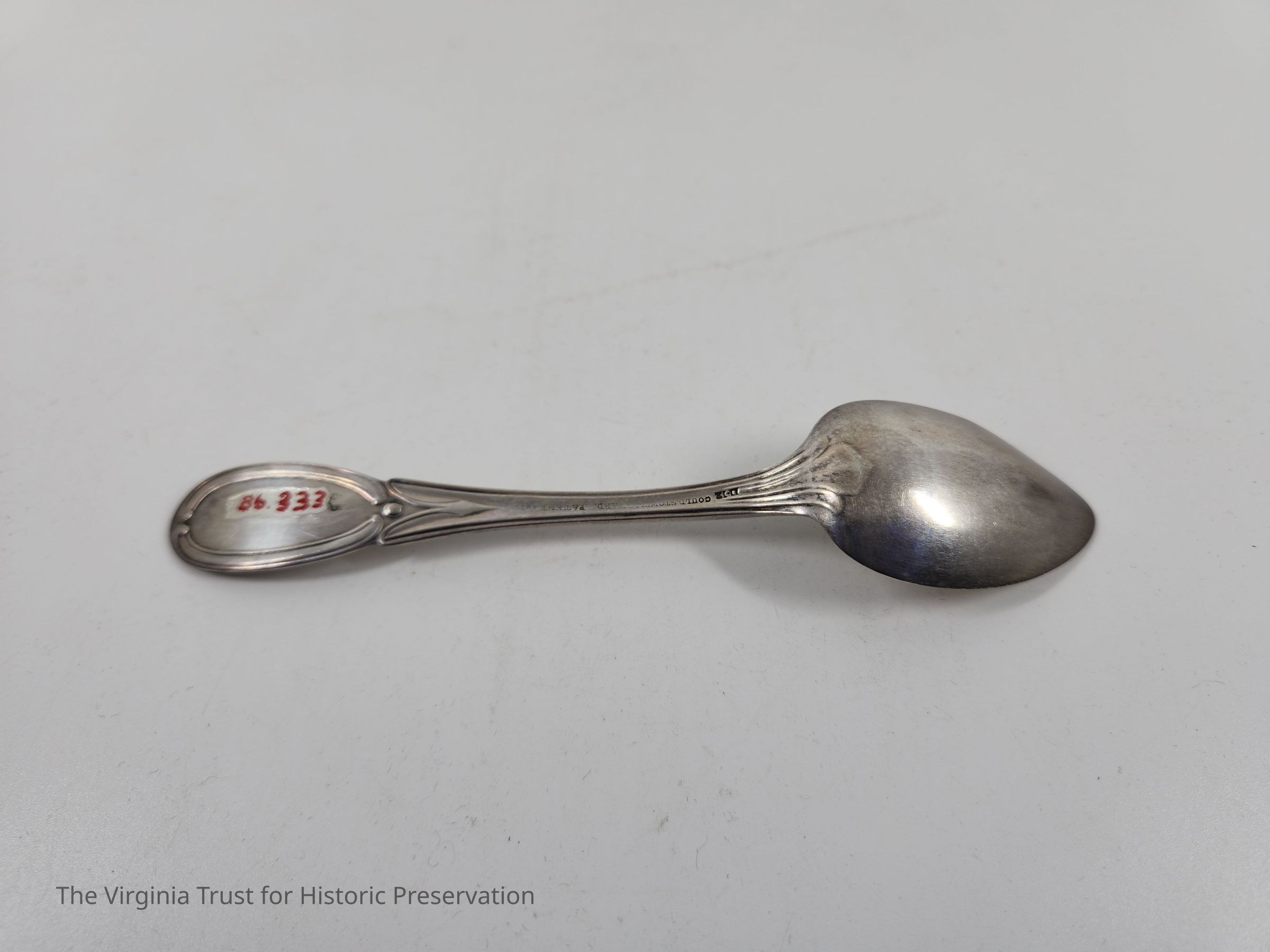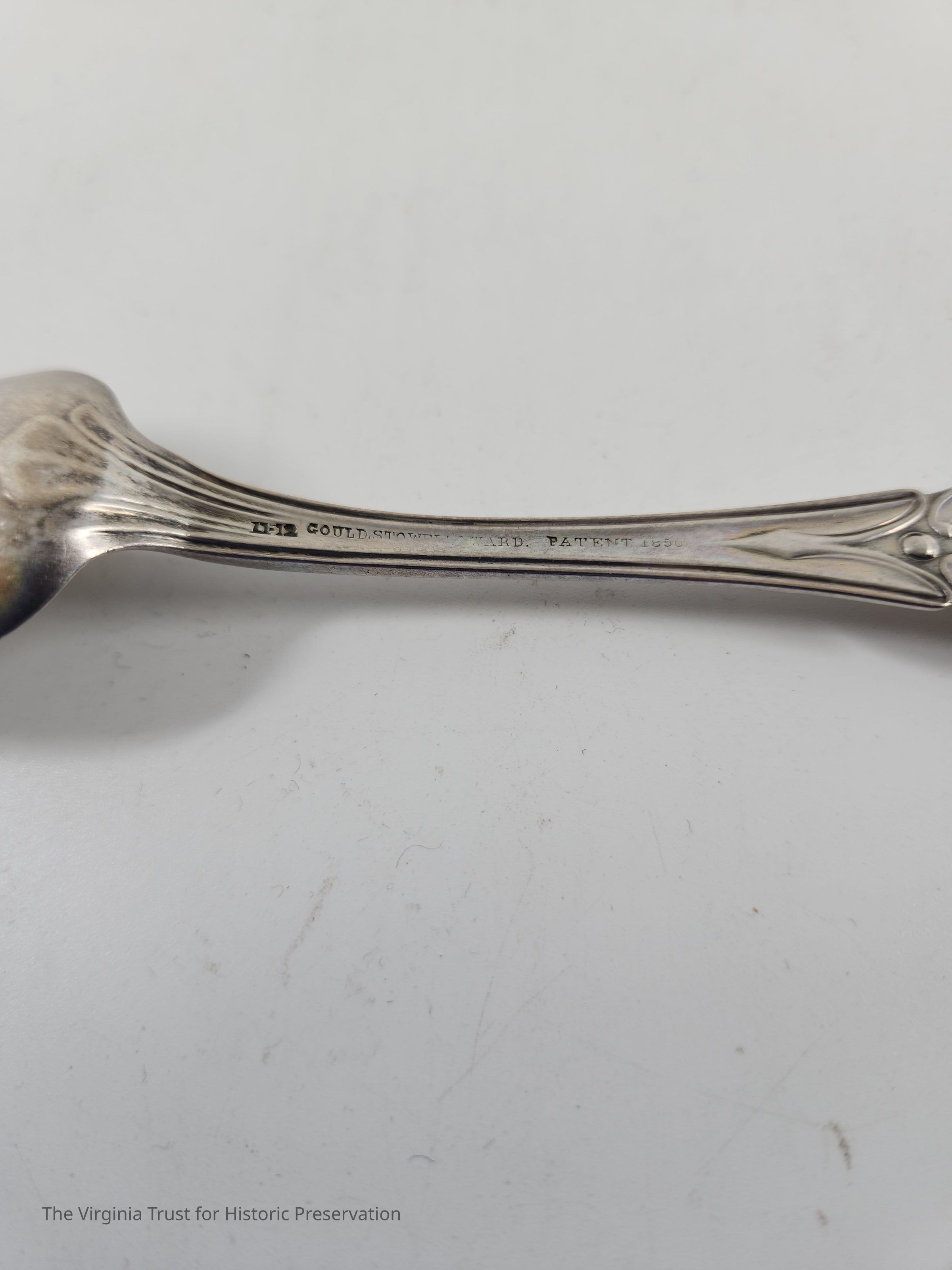 Part of set of six silver spoons with the Lee Squirrel engraved on the handle. Stamped "Gould, Stowells and Ward Patent 1850."