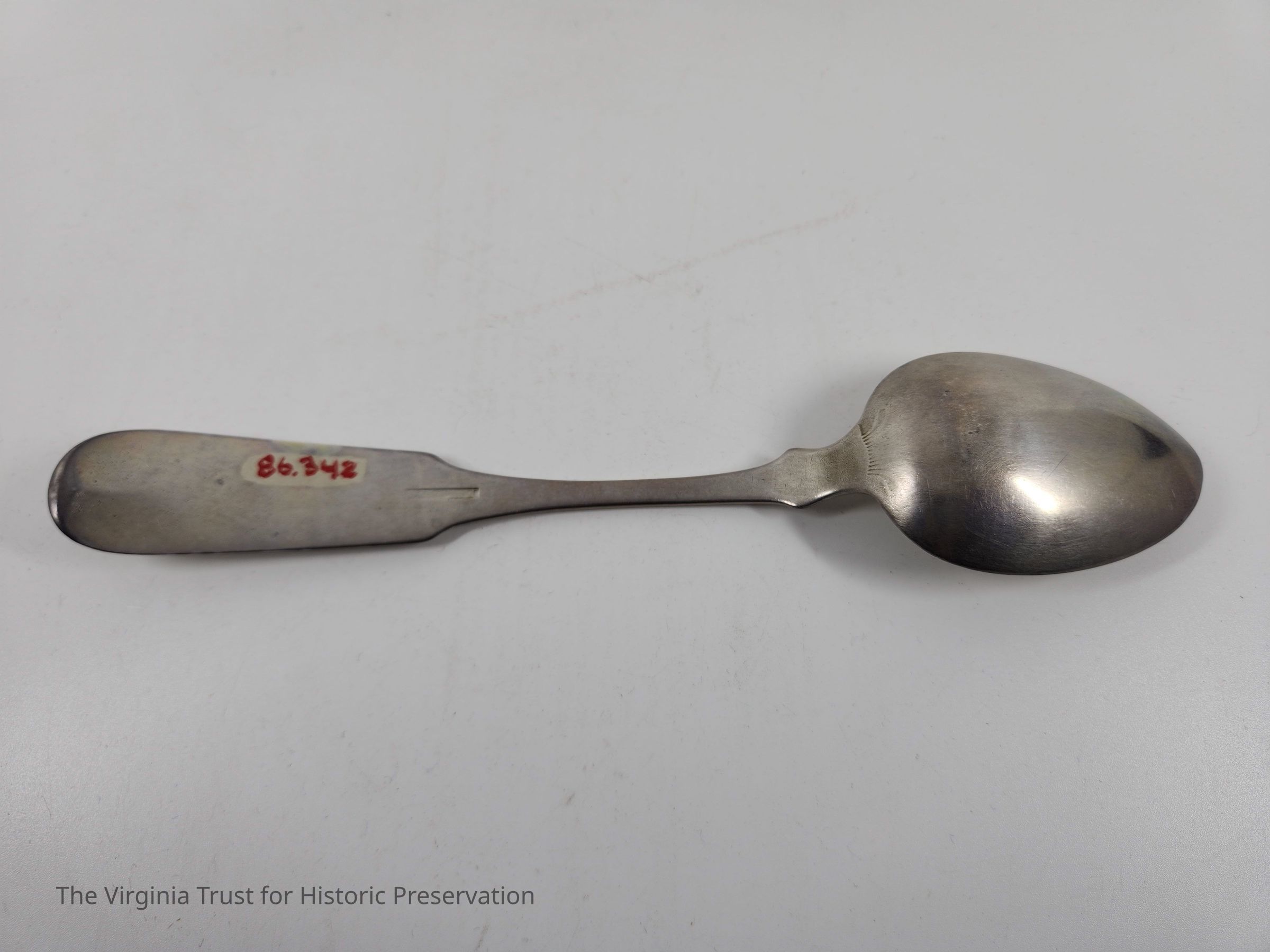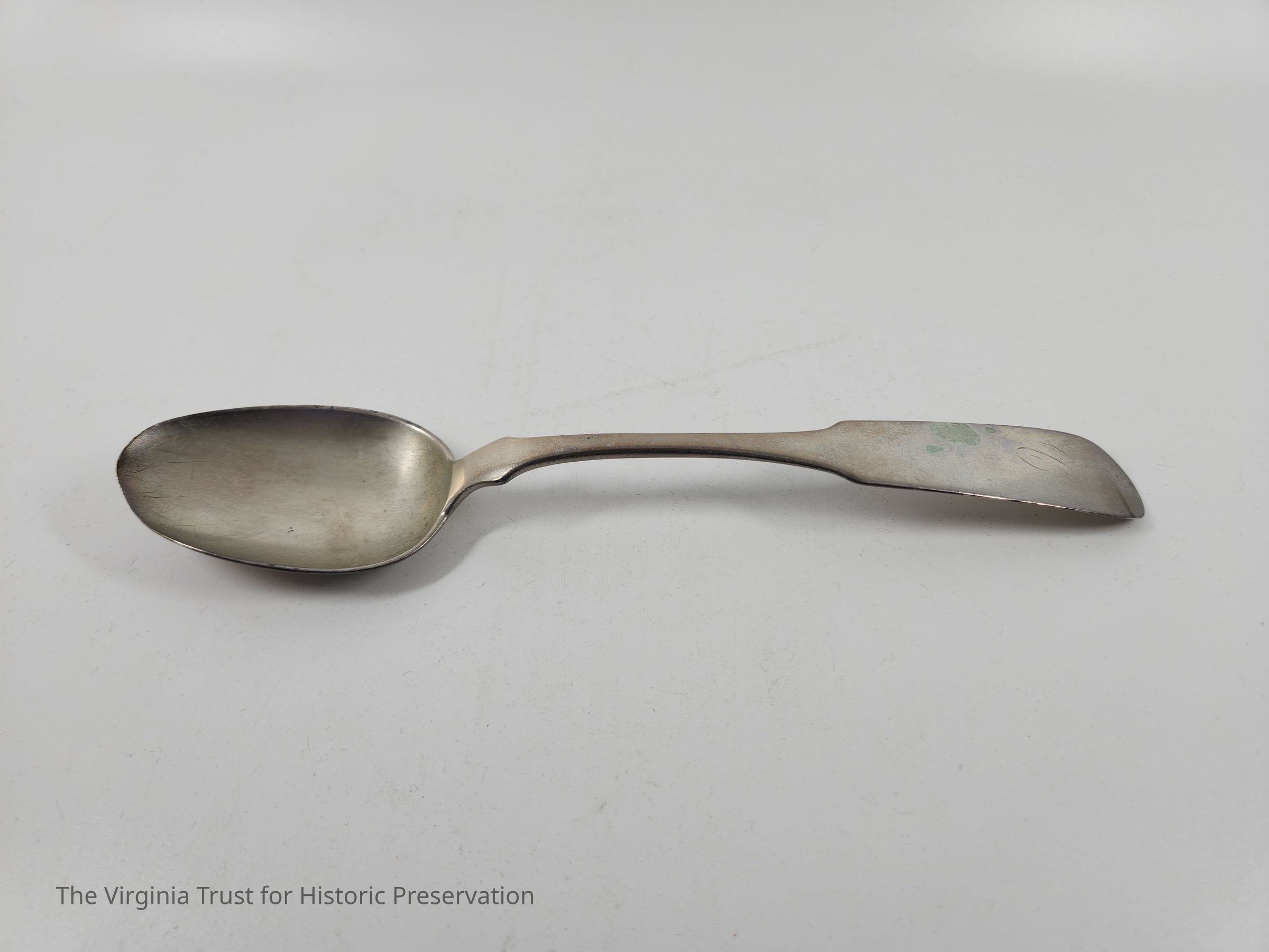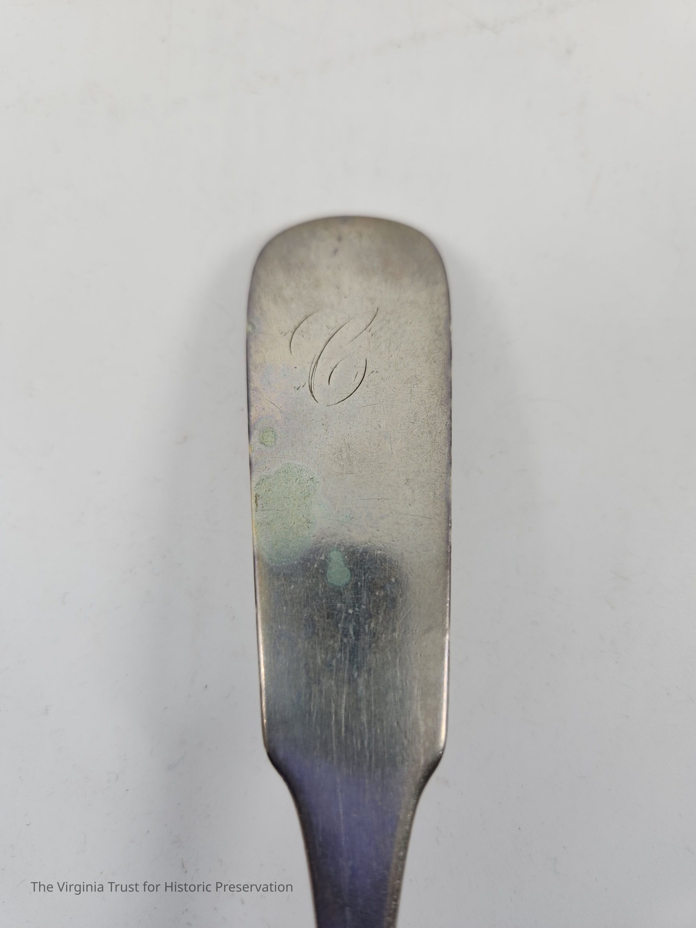 American coin silver fiddleback tablespoon. Monogrammed "C." on handle end - recto. Engraving: "E. WATSON" on back of handle.
