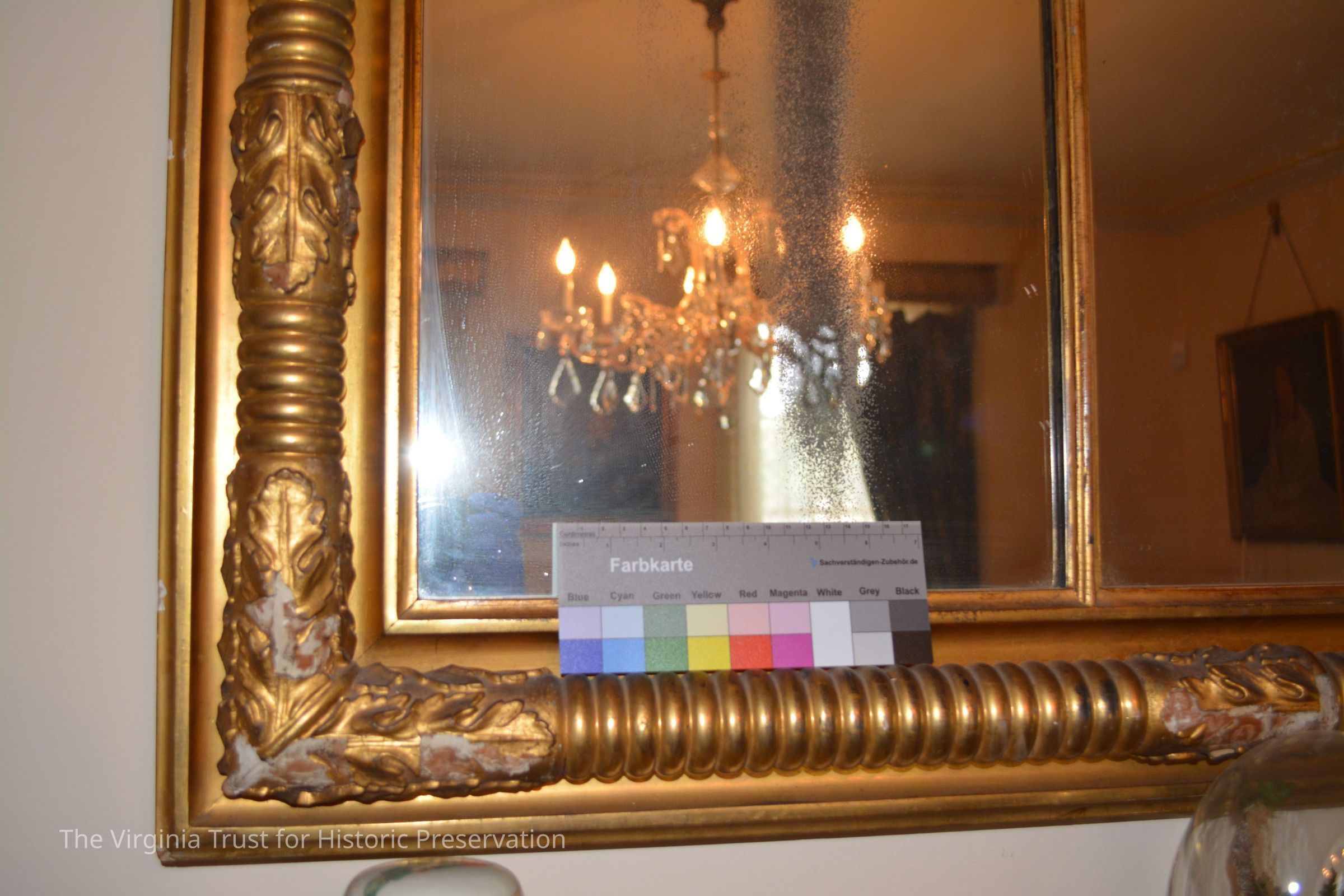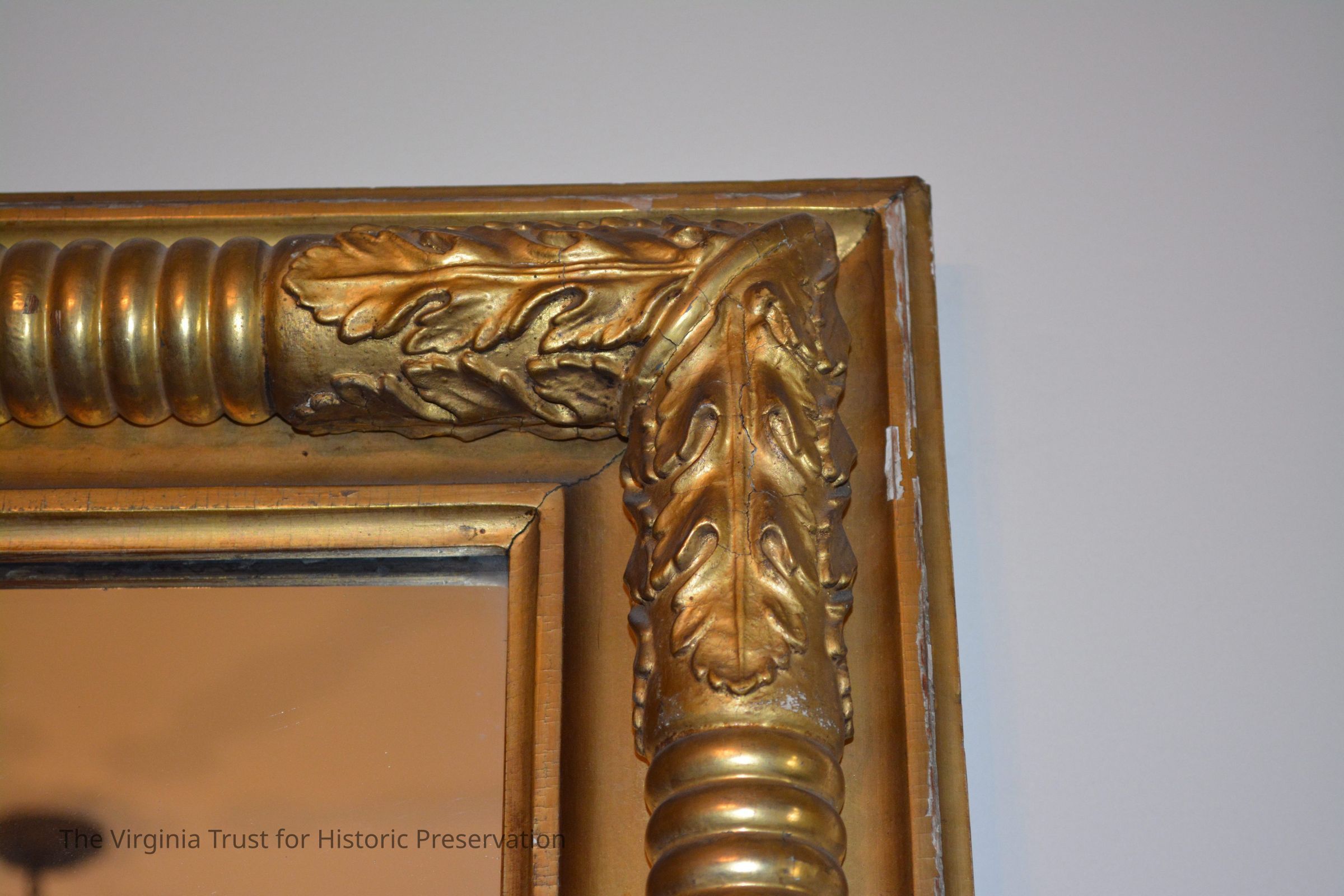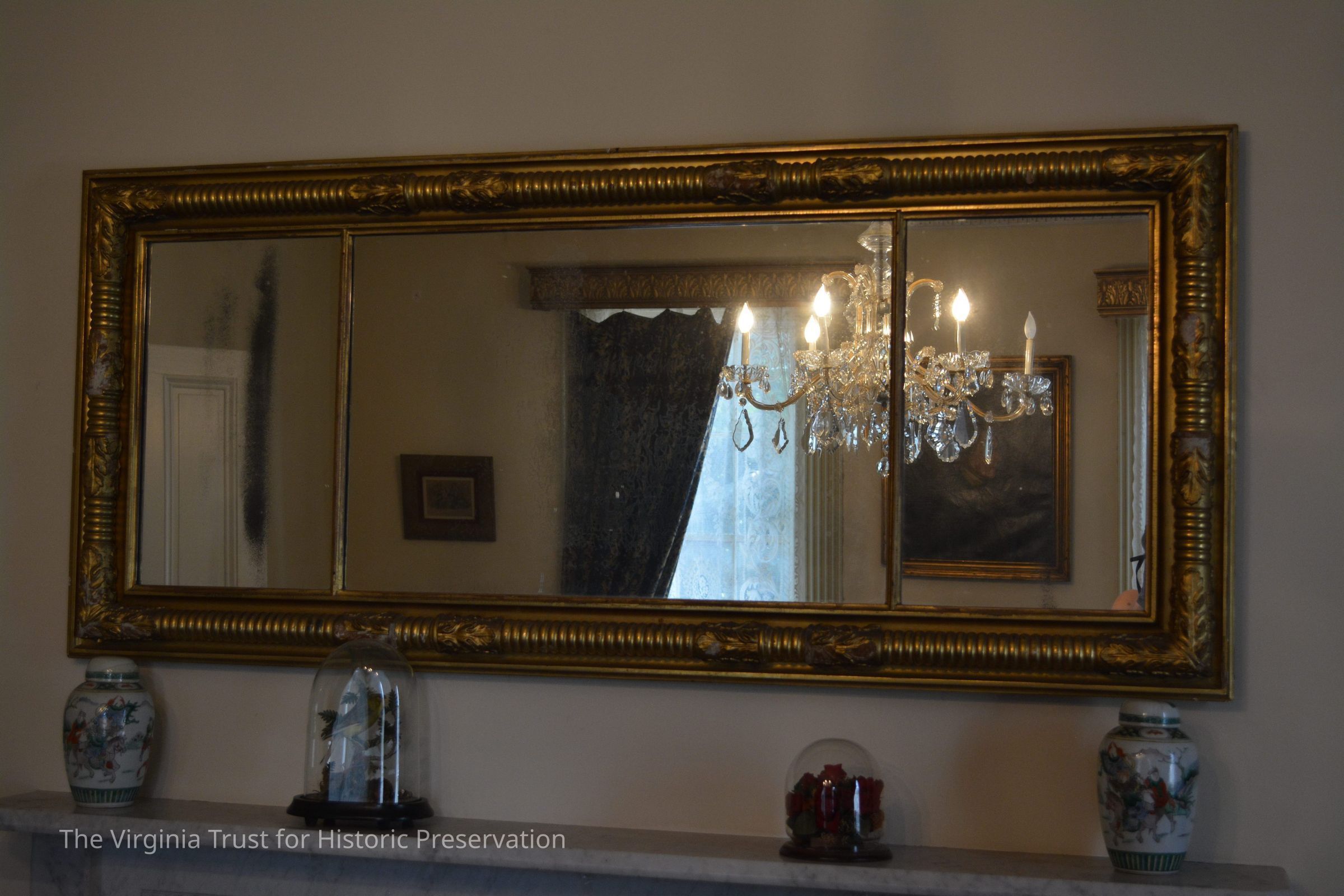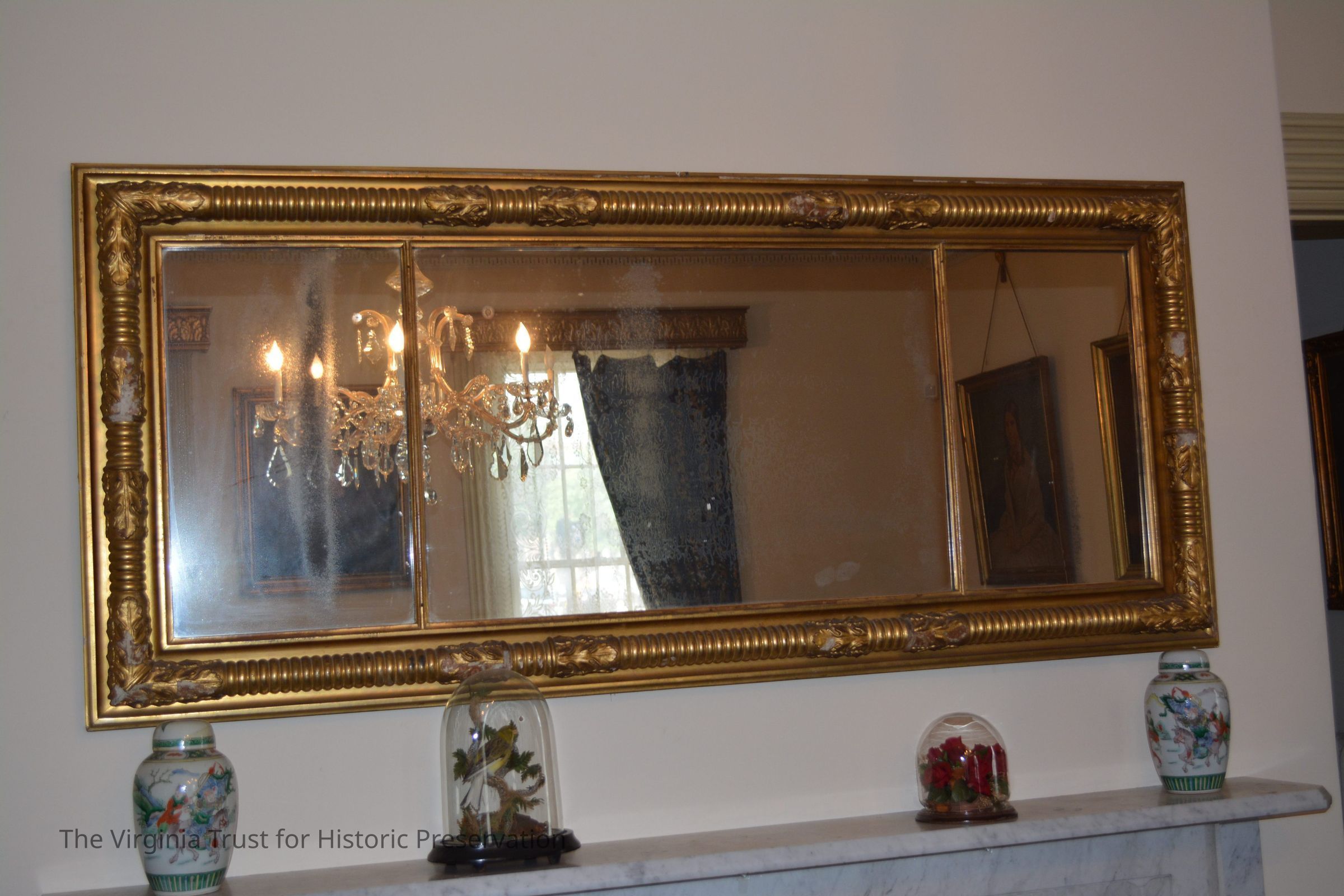Three panel mirror in a heavy gilt frame. Empire style. Mounted over the fireplace.