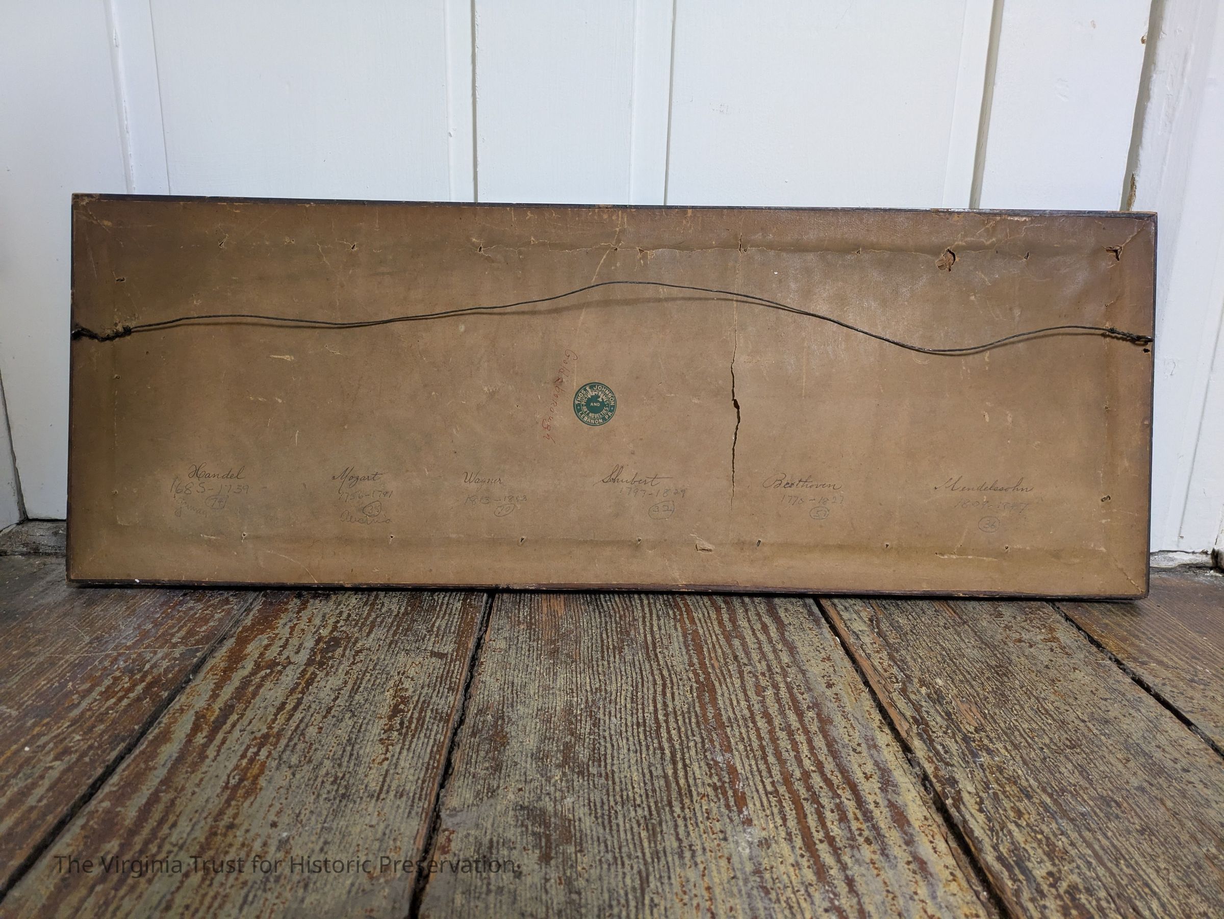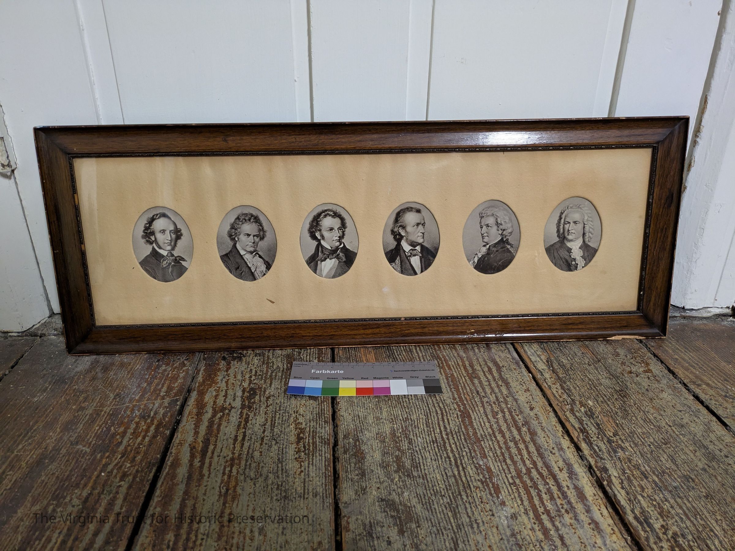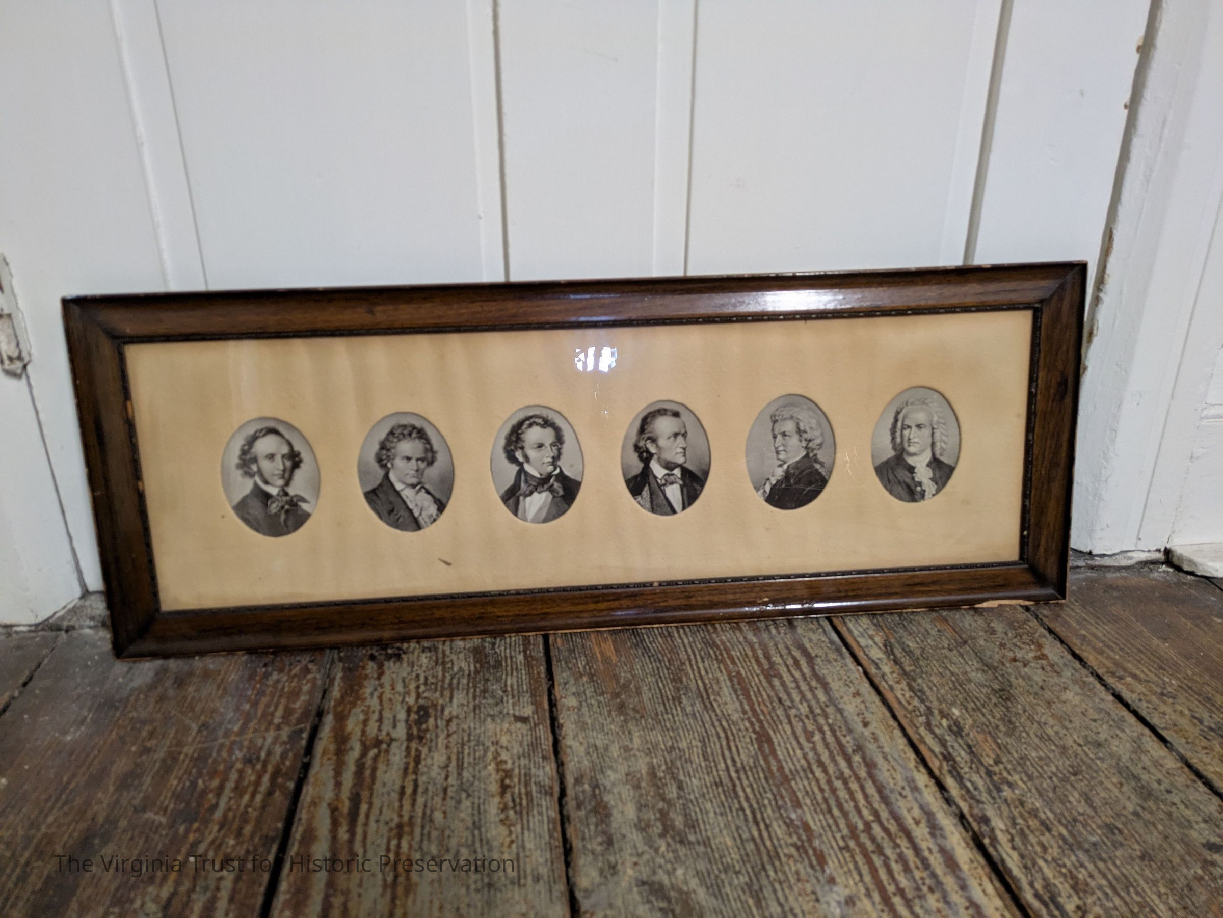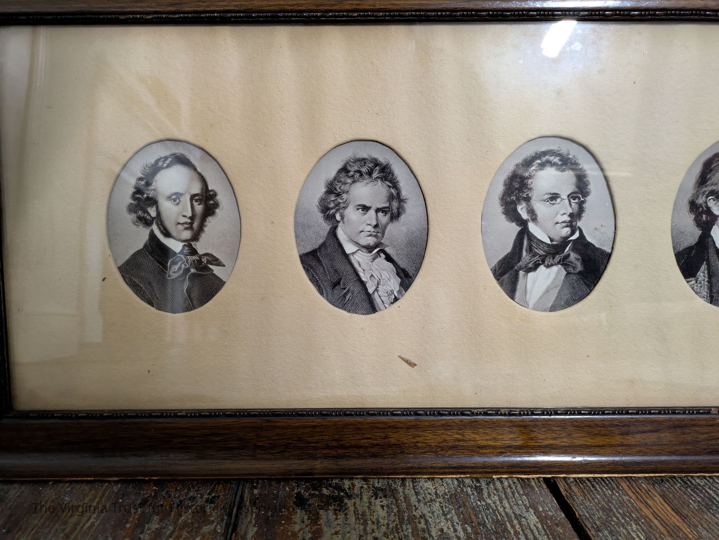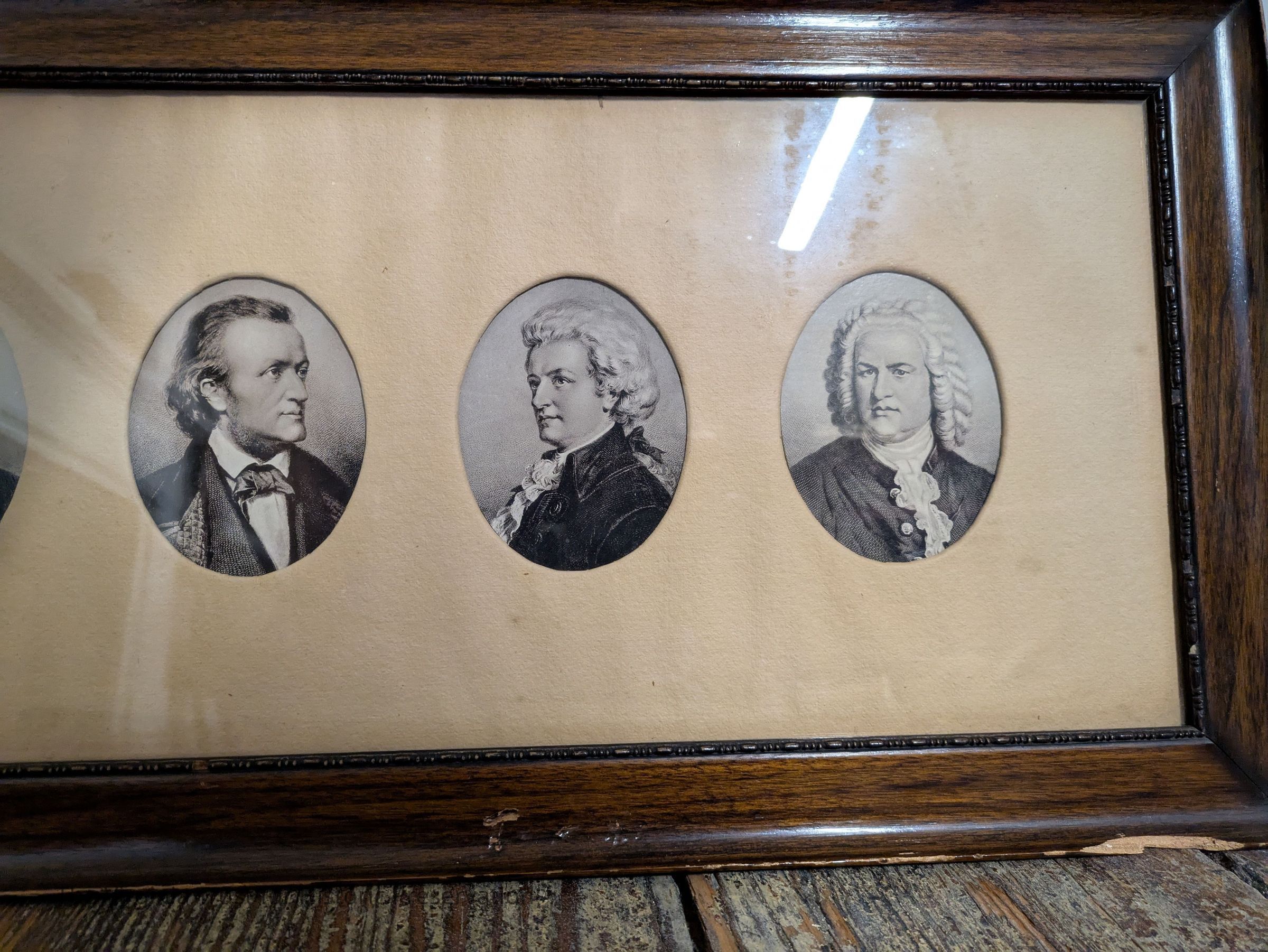 Framed wall hanging featuring oval portraits of six 19th century composers.