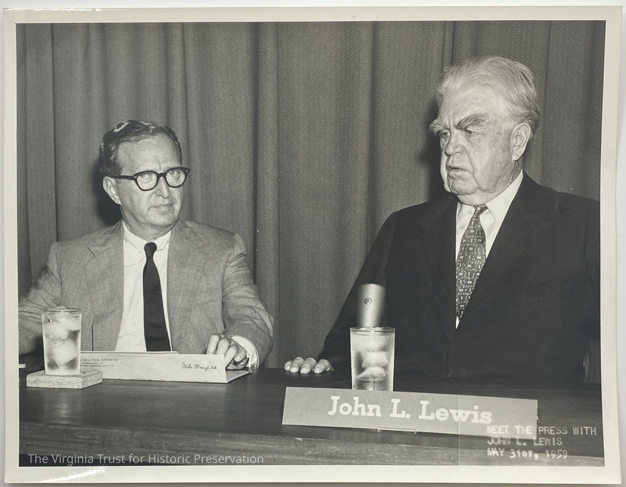 Black and white photograph of John L. Lewis sitting to the right of another ma on the left. Stamp on bottom right corner indicates it is from “Meet the Press” in 1959. Lewis, looking away from camera, wears dark colored suit, white undershirt and tie. Glass of water in front of him on the table. Other man looks directly at camera with a paper labelled “United States Senate” in front of him.