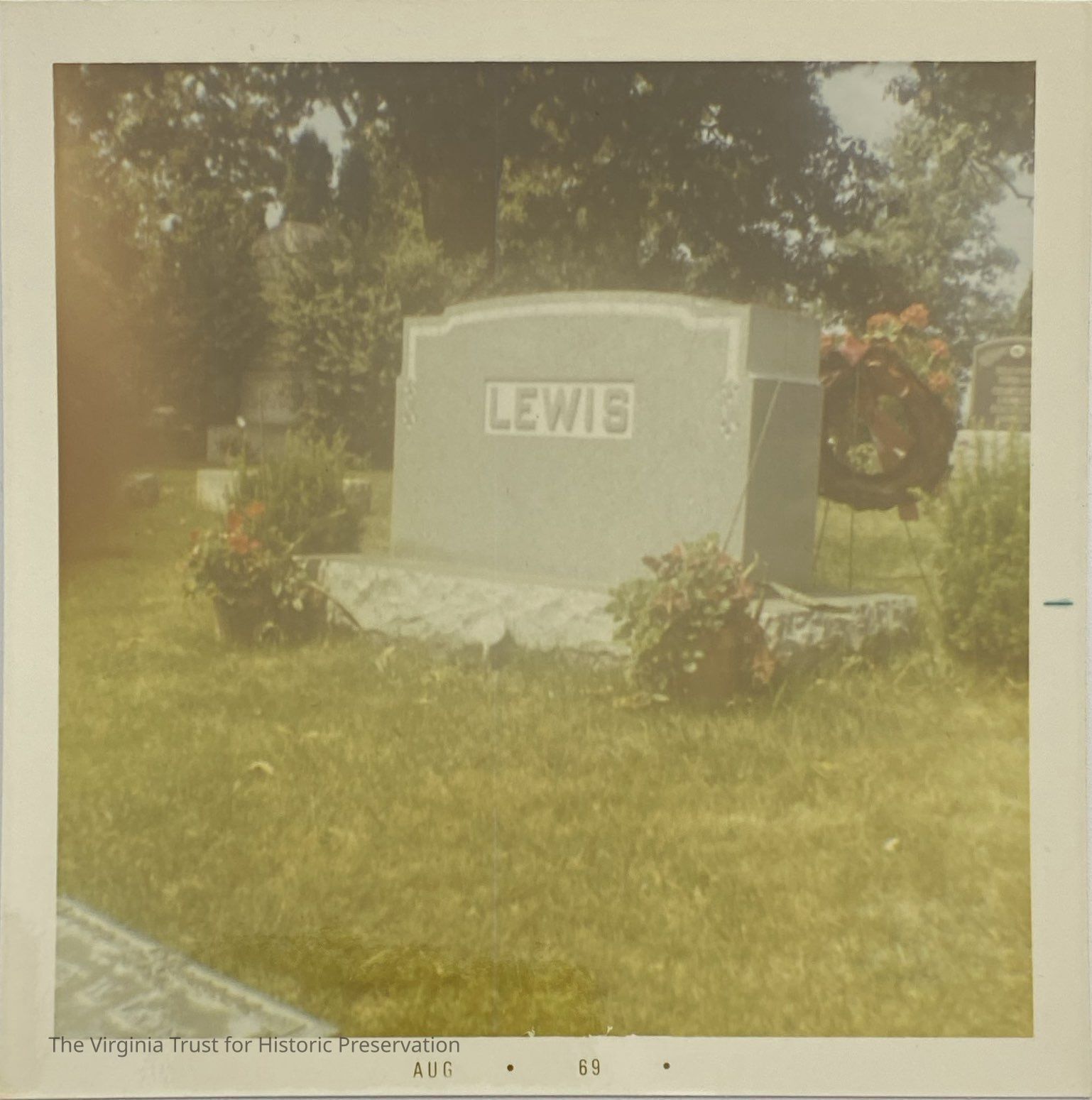 Photograph of John L. Lewis gravestone located in the Oak Ridge Cemetery (Springfield, IL). Two baskets of flowers lay on either side of gravestone. Trees in background.Dimensions