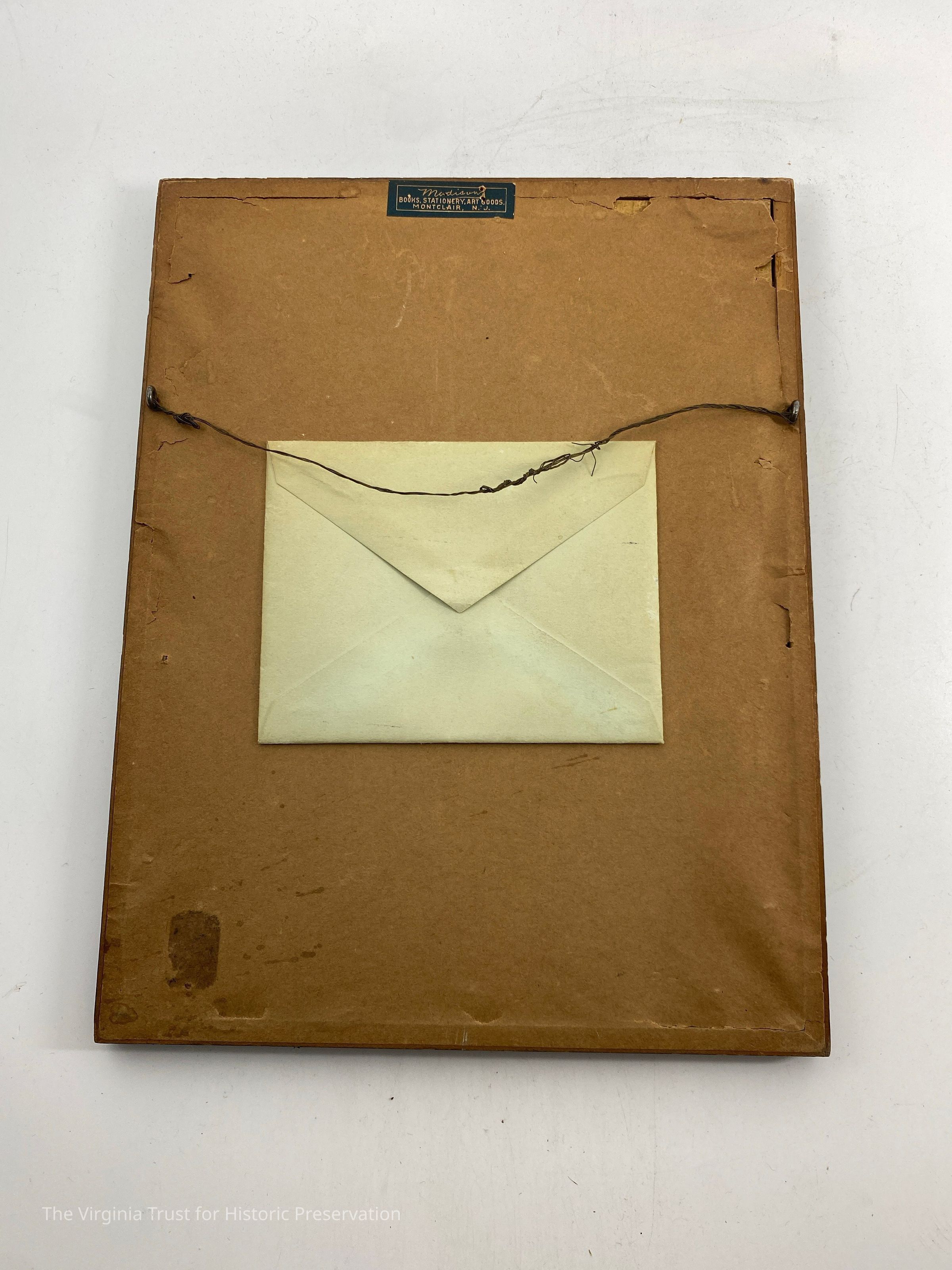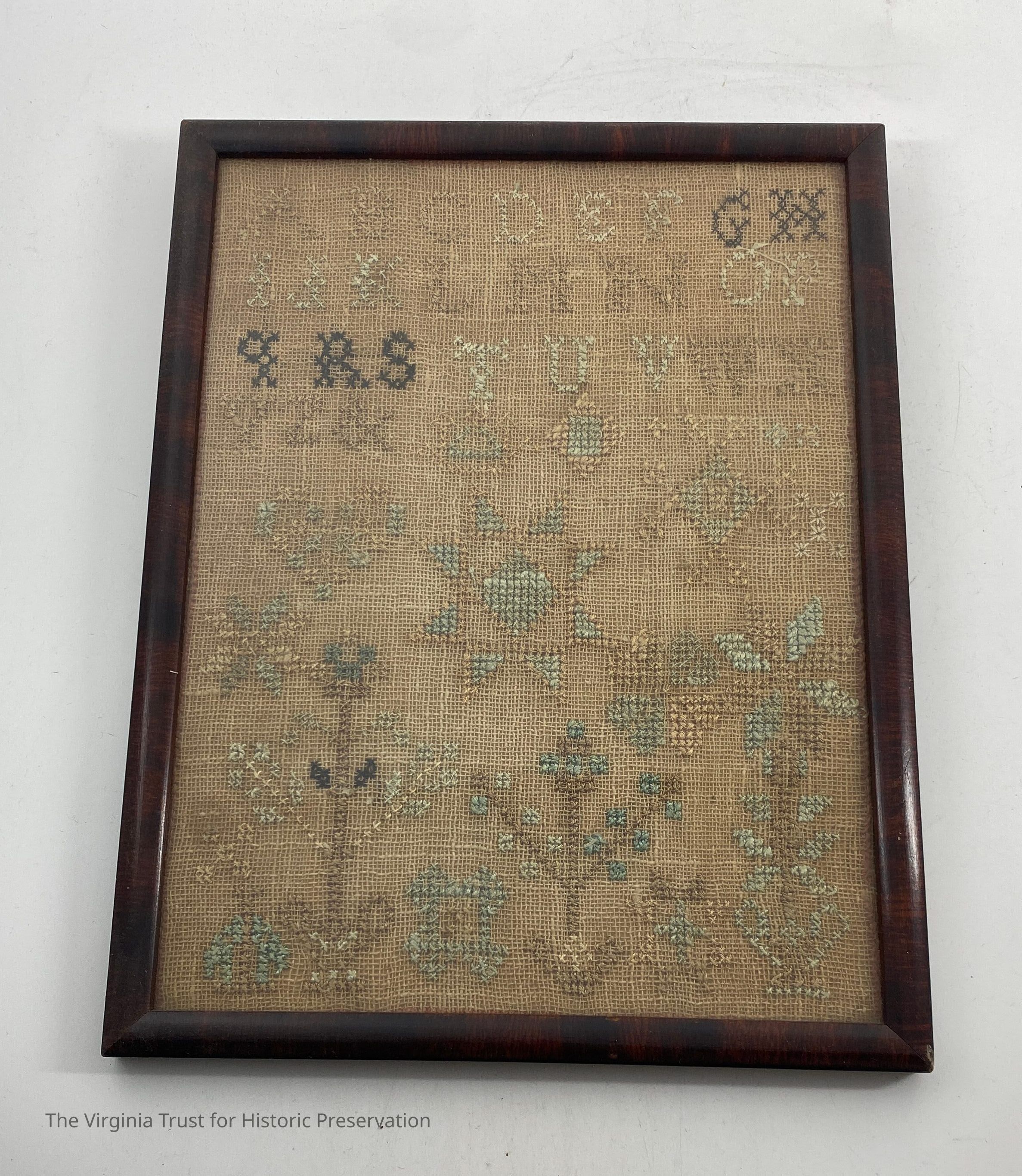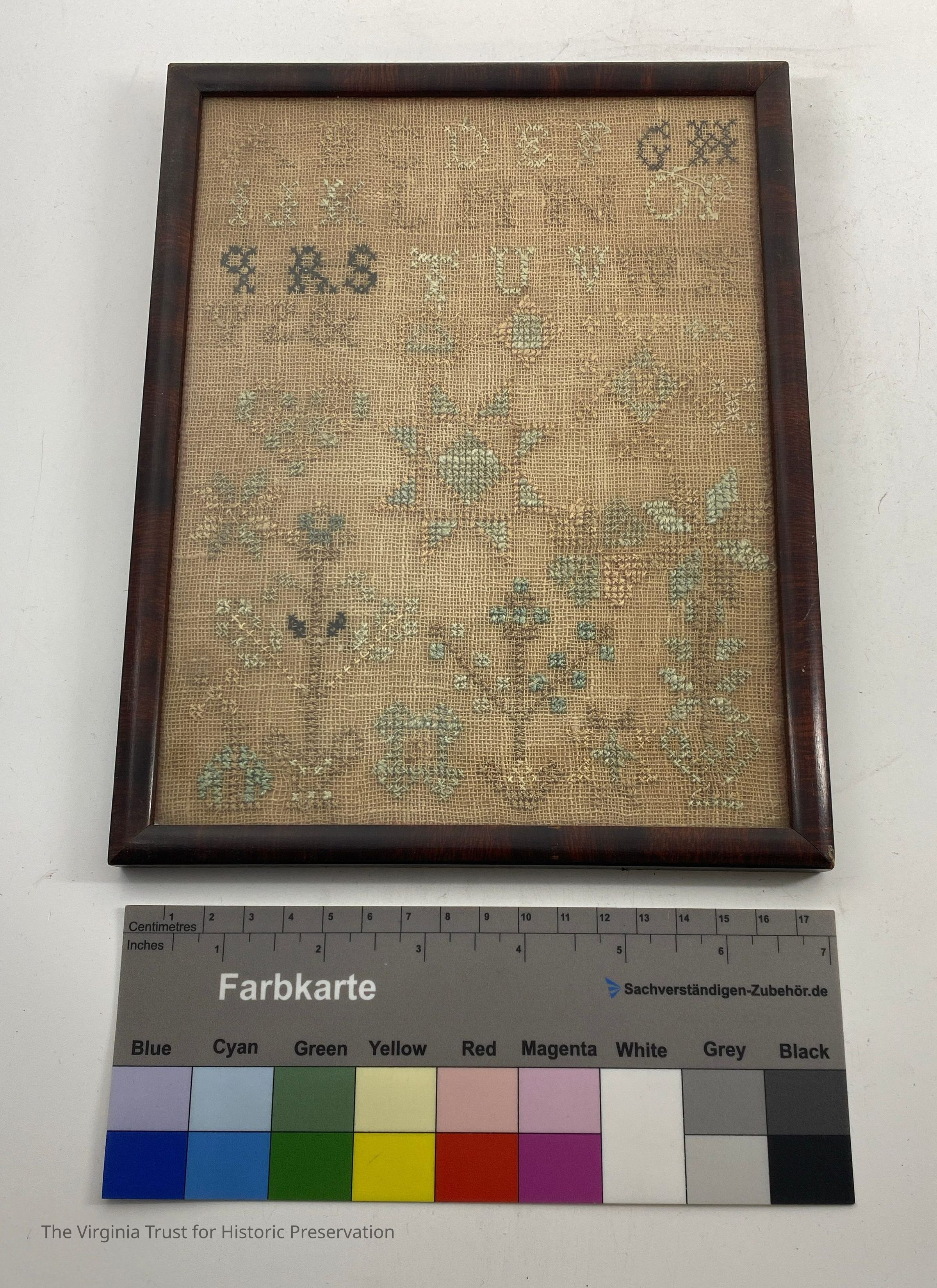Framed sampler. Alphabet and some designs. Envelope glued to the back - empty. Paper backing is yellowed and brittle; sticker on back reading- "Madison Books, Stationary, Art Goods Montclair, NJ."Dimensions