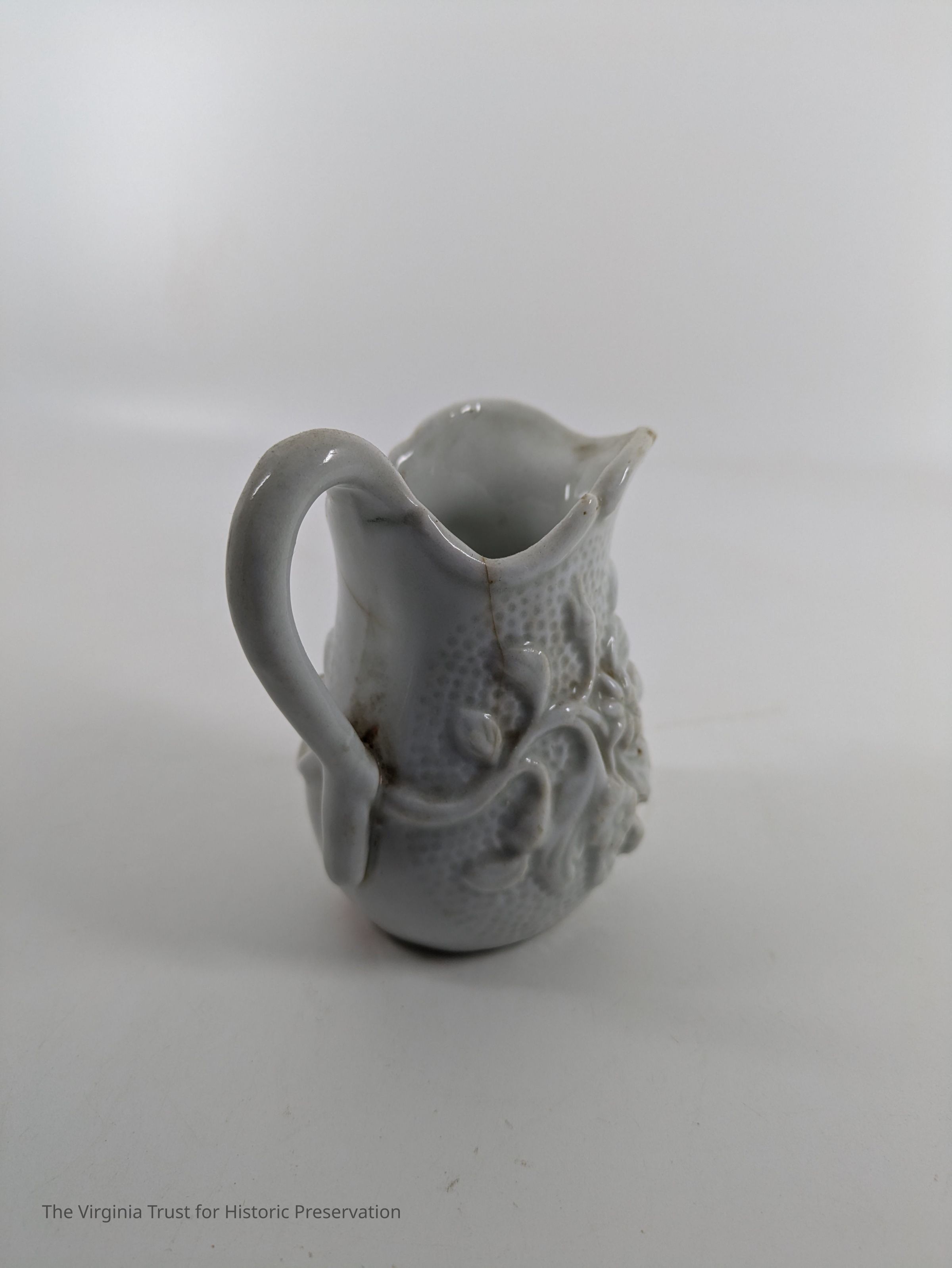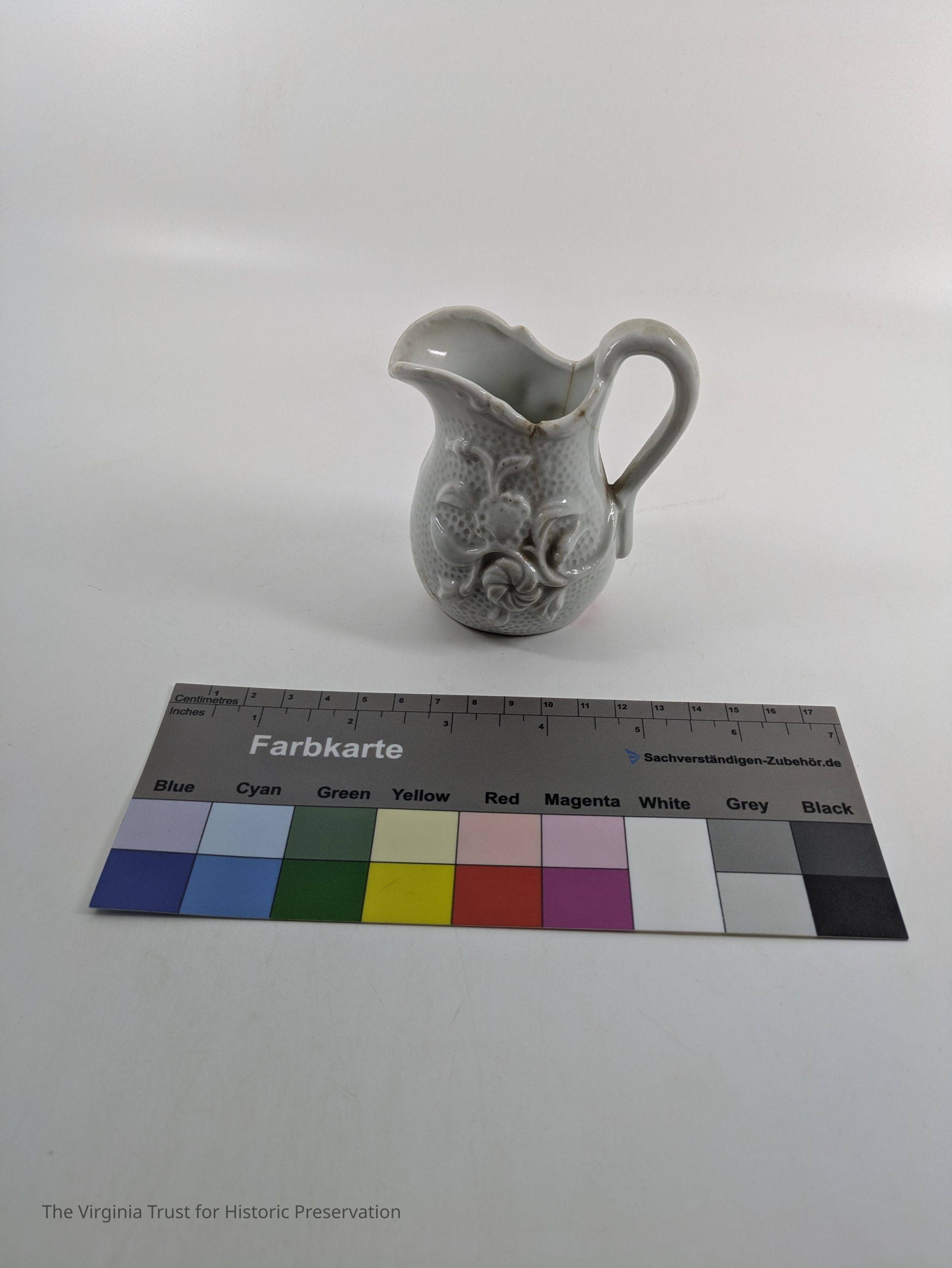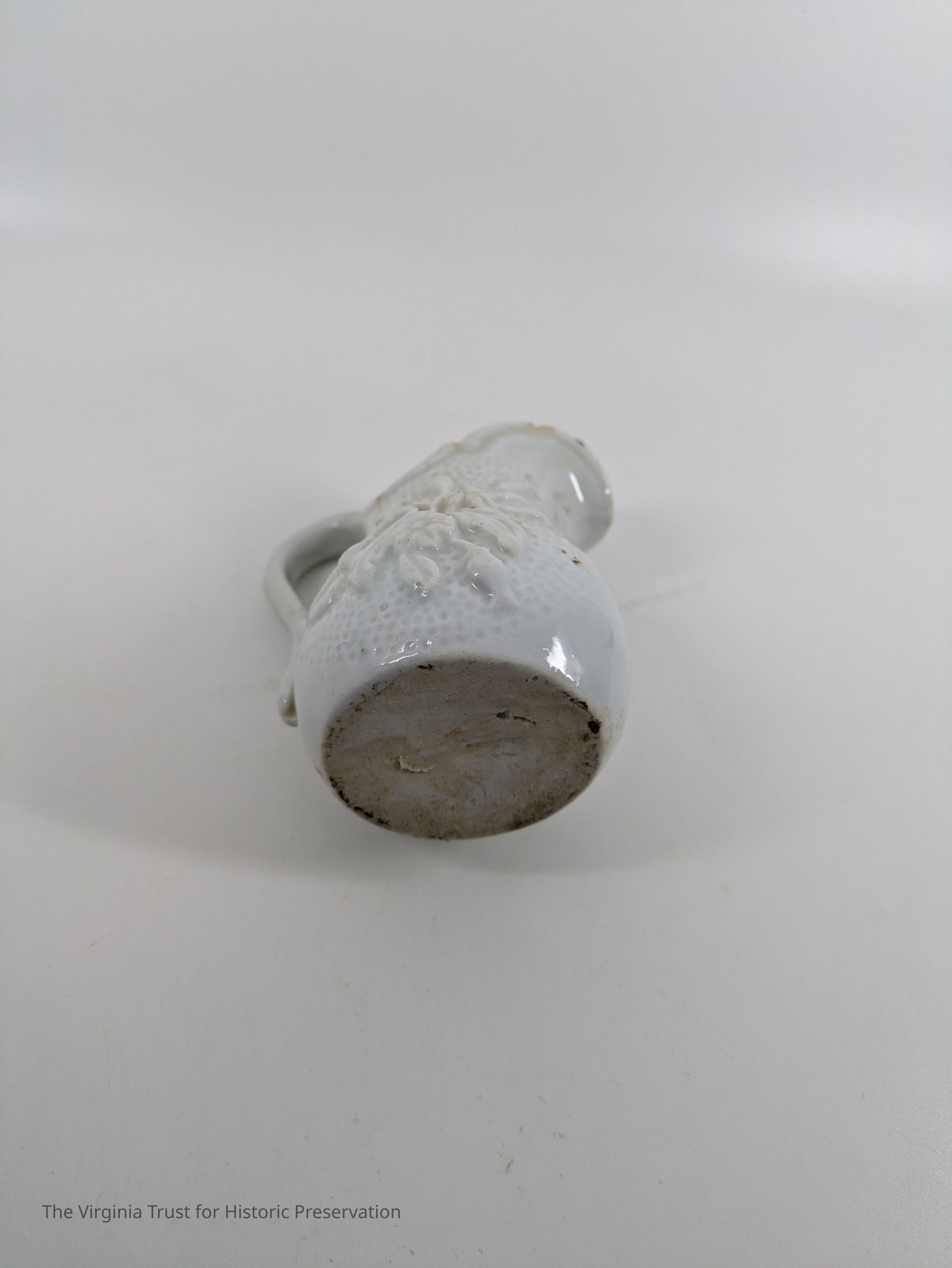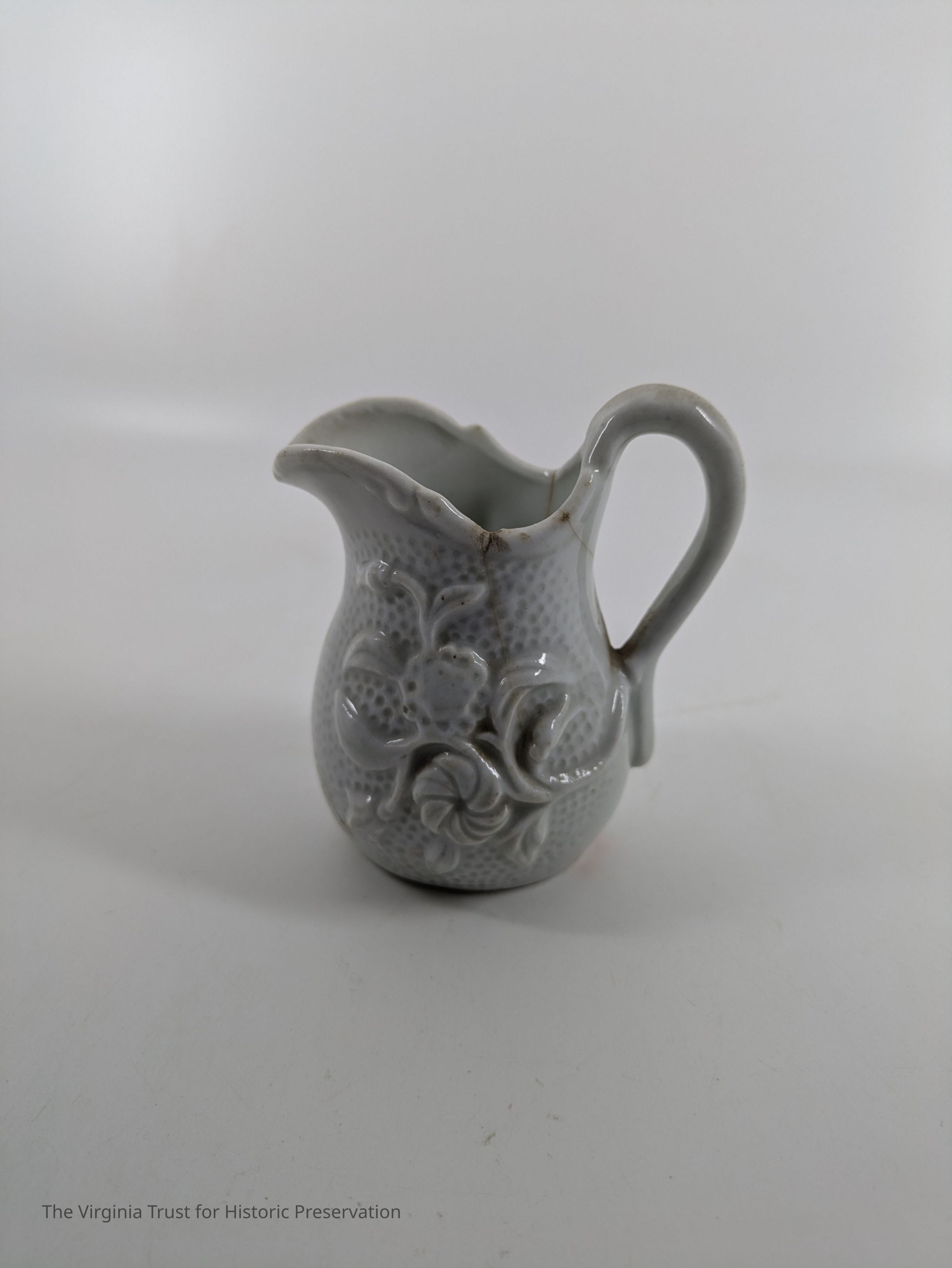 Pitcher. White, glazed with raised design, floral designs on both sides of handle. Doll toy.