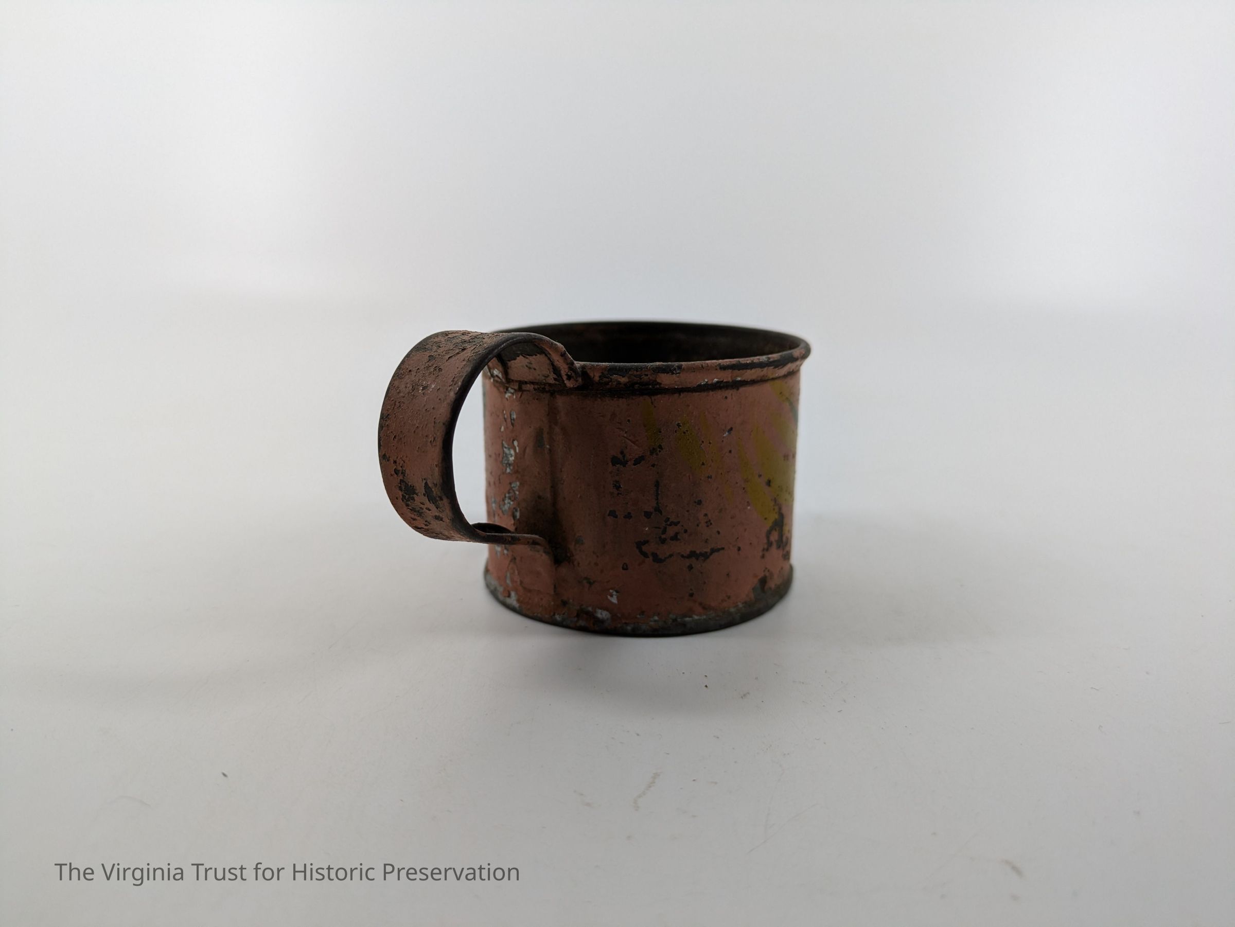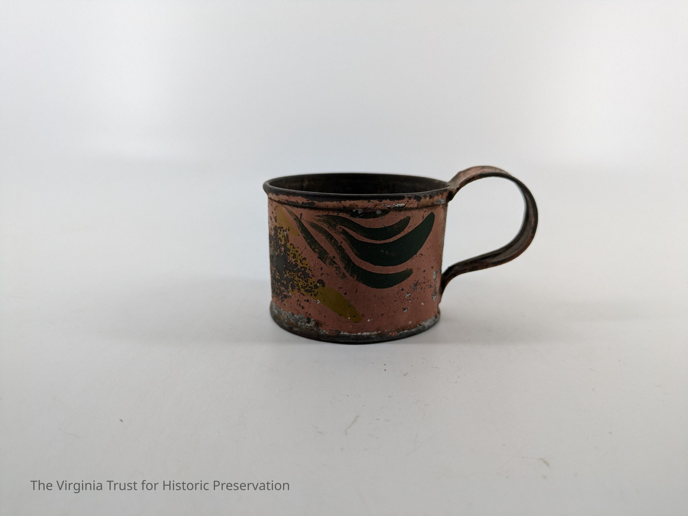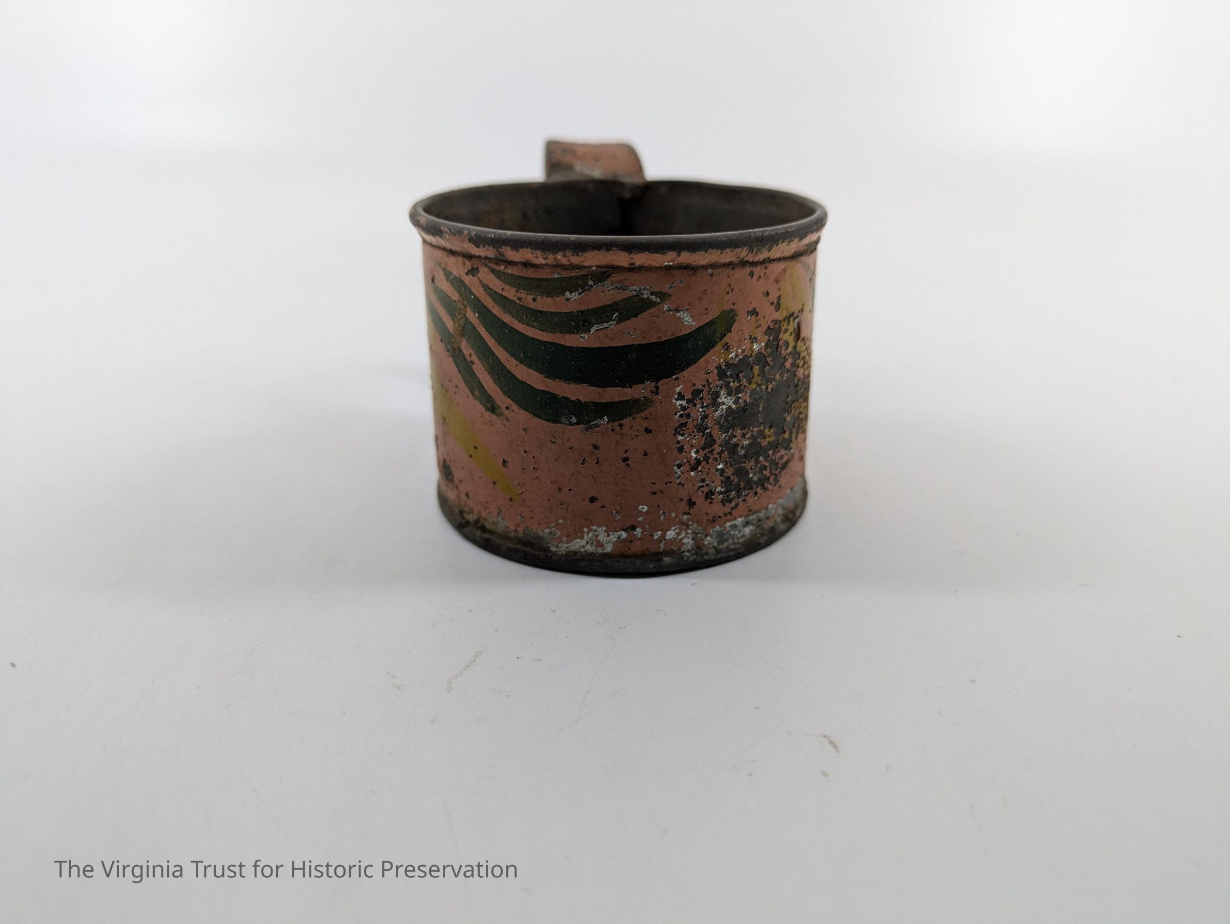 Tin cup with handle. Painted pink with yellow and green stripes.