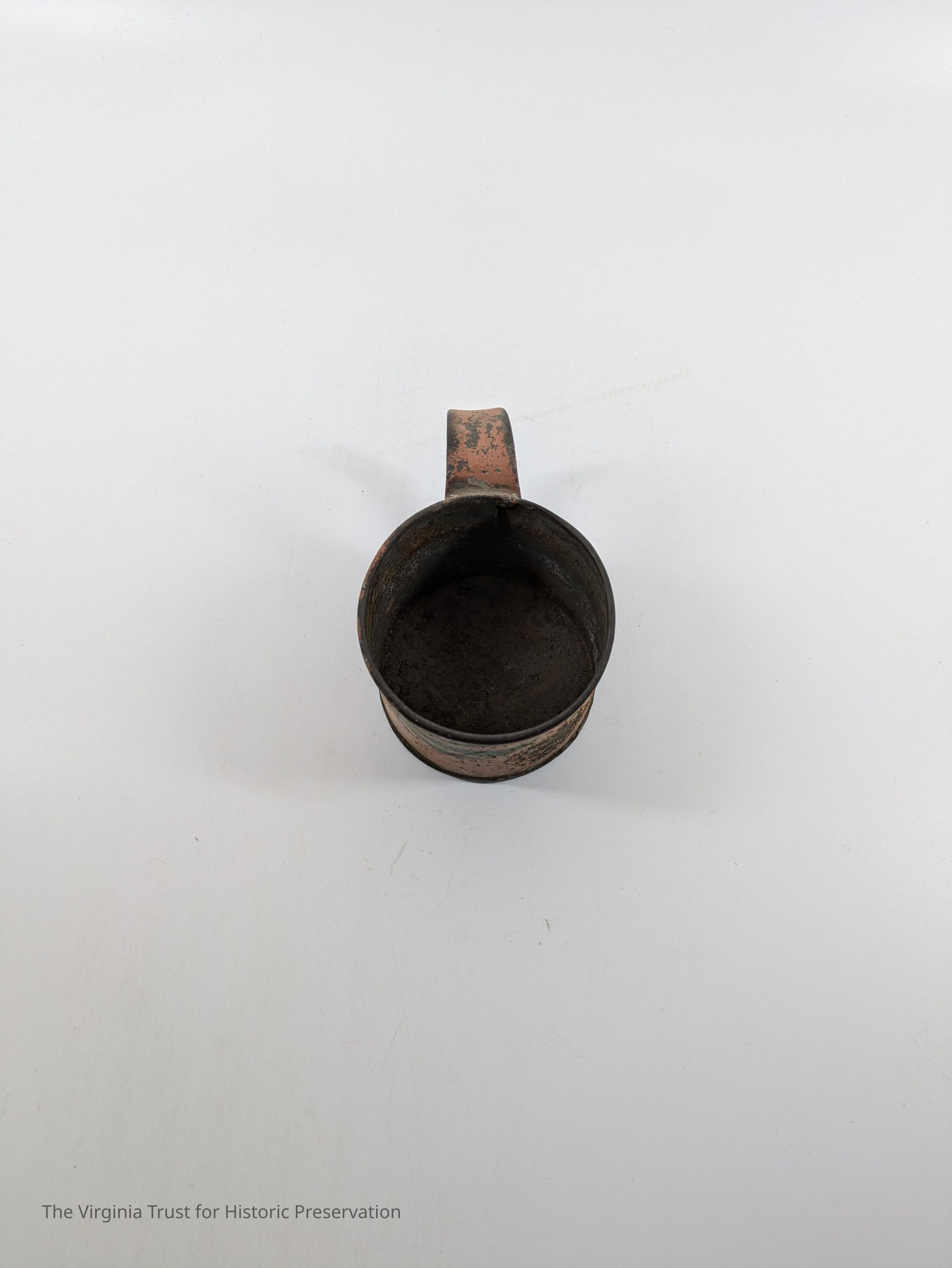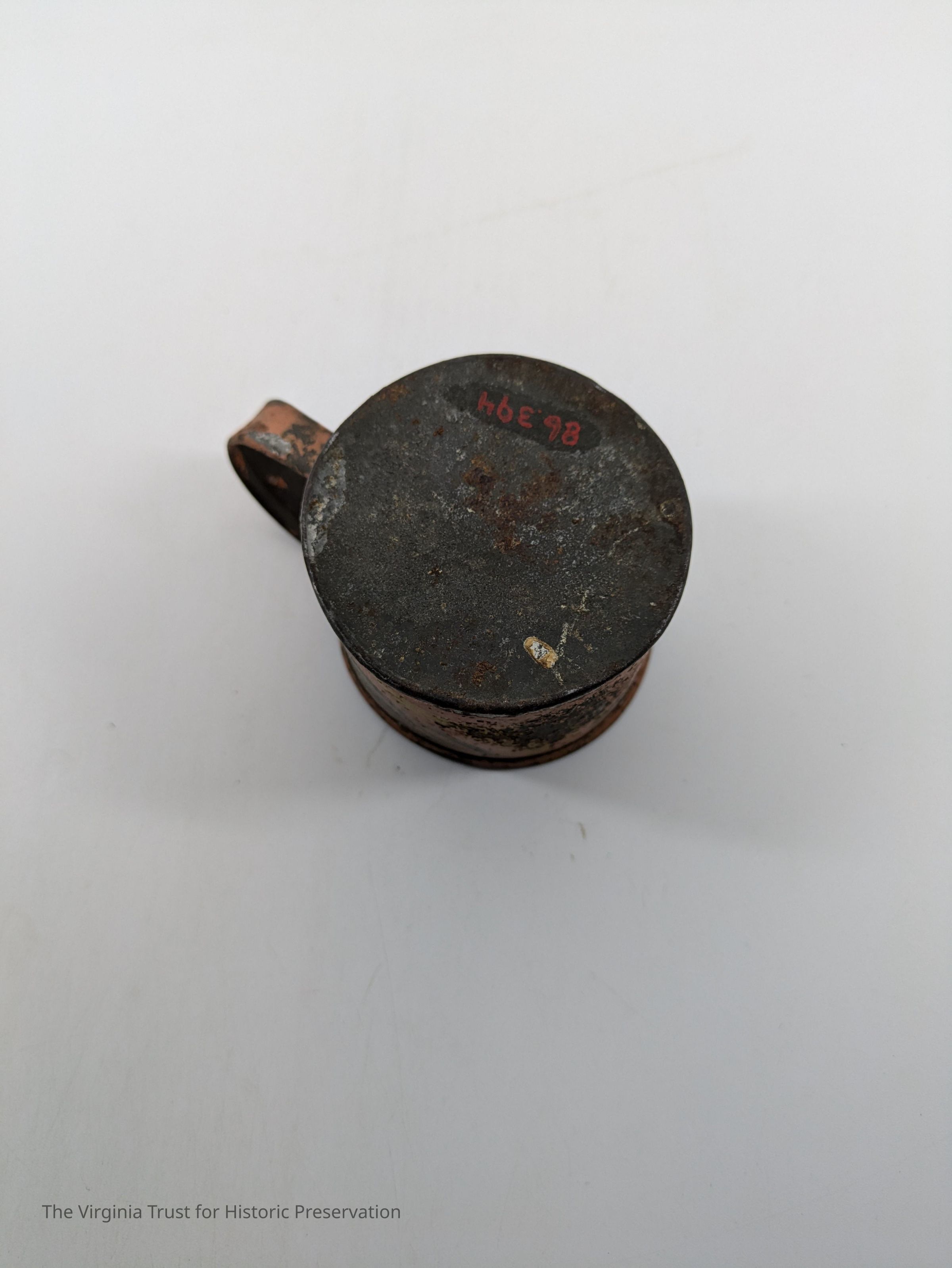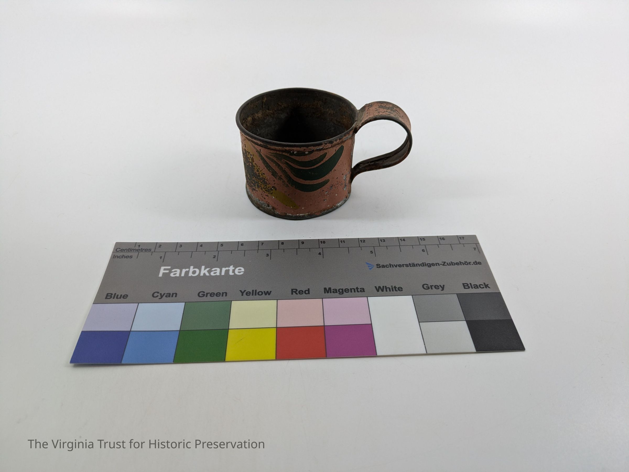 Tin cup with handle. Painted pink with yellow and green stripes.