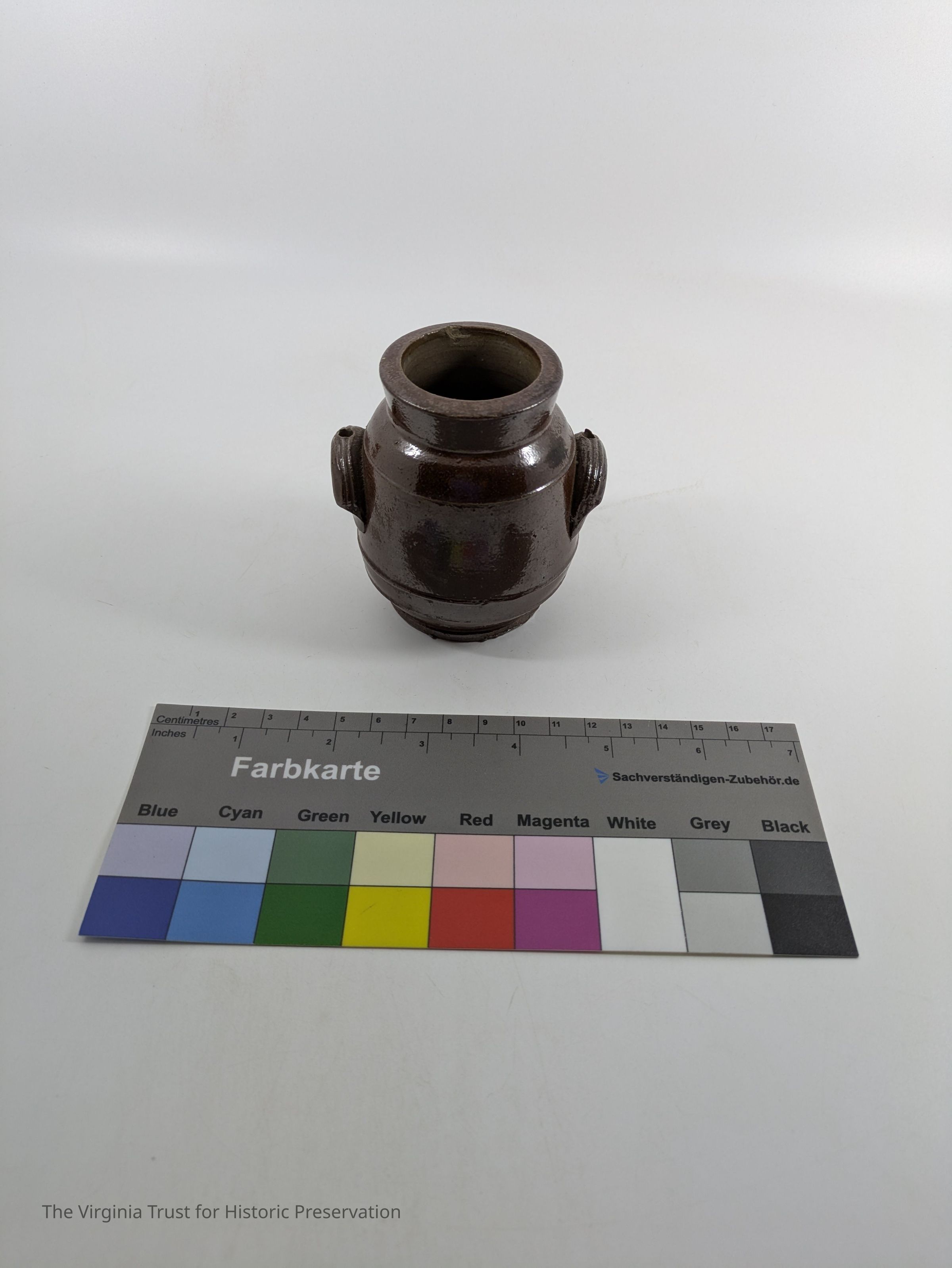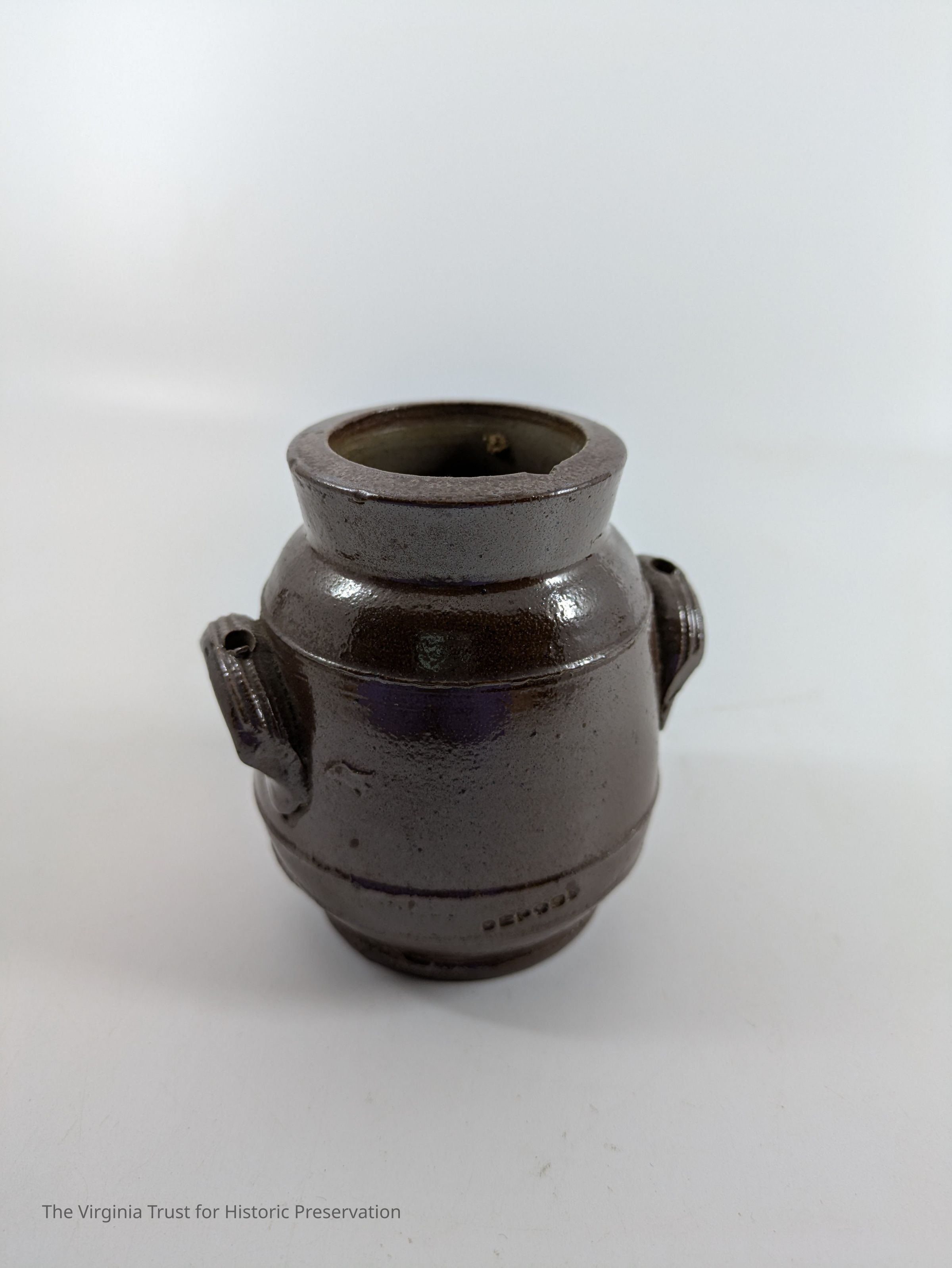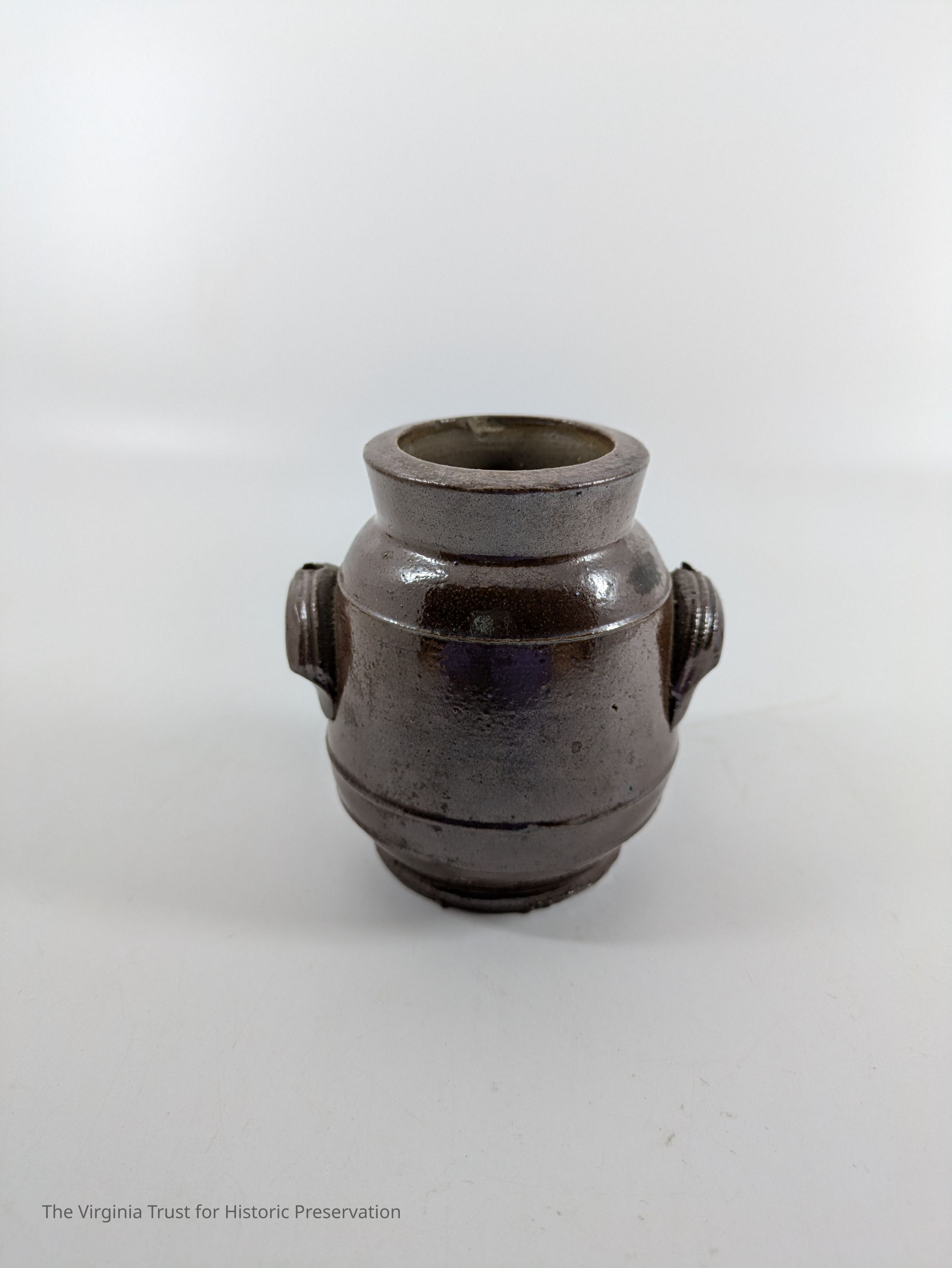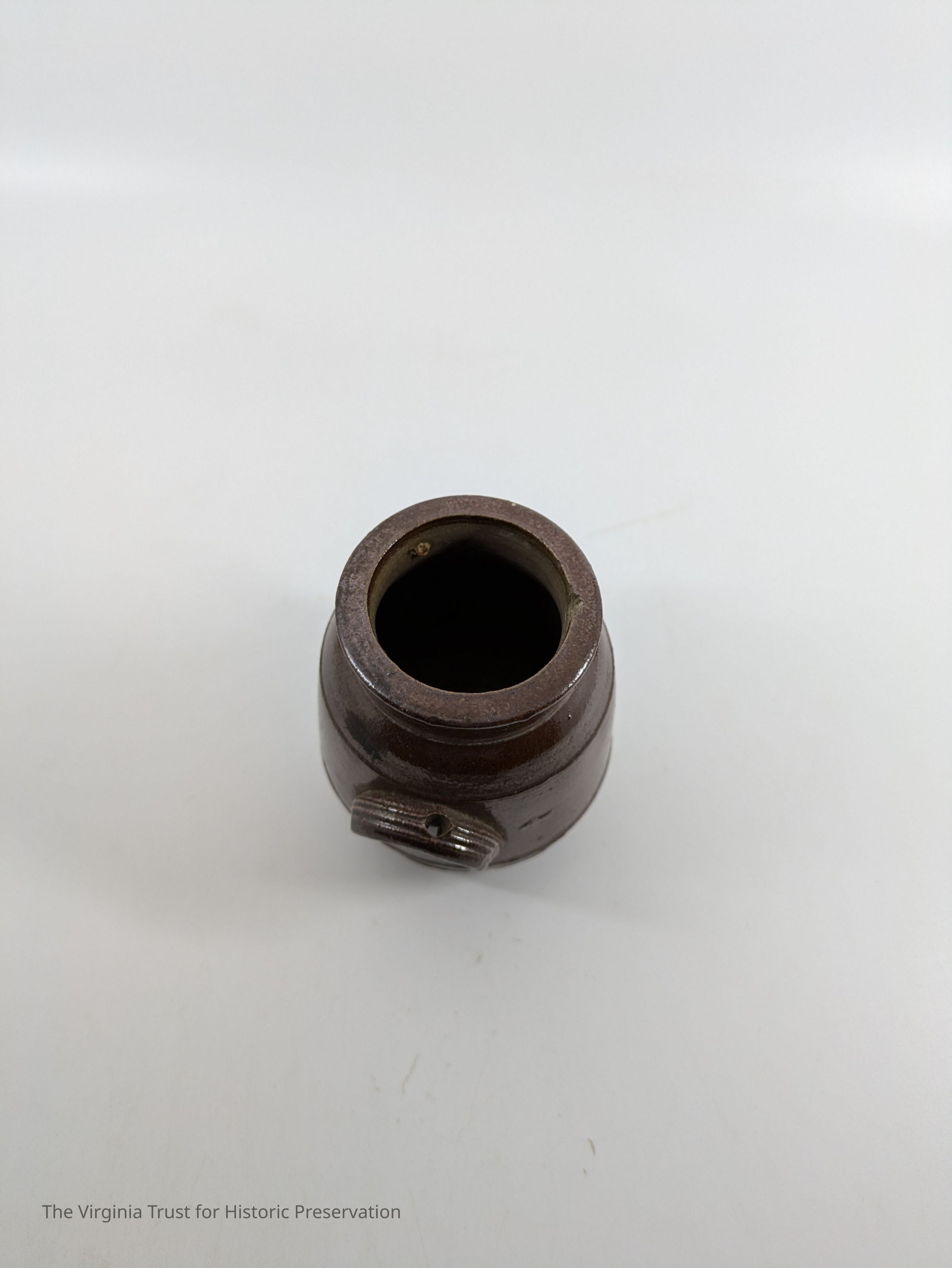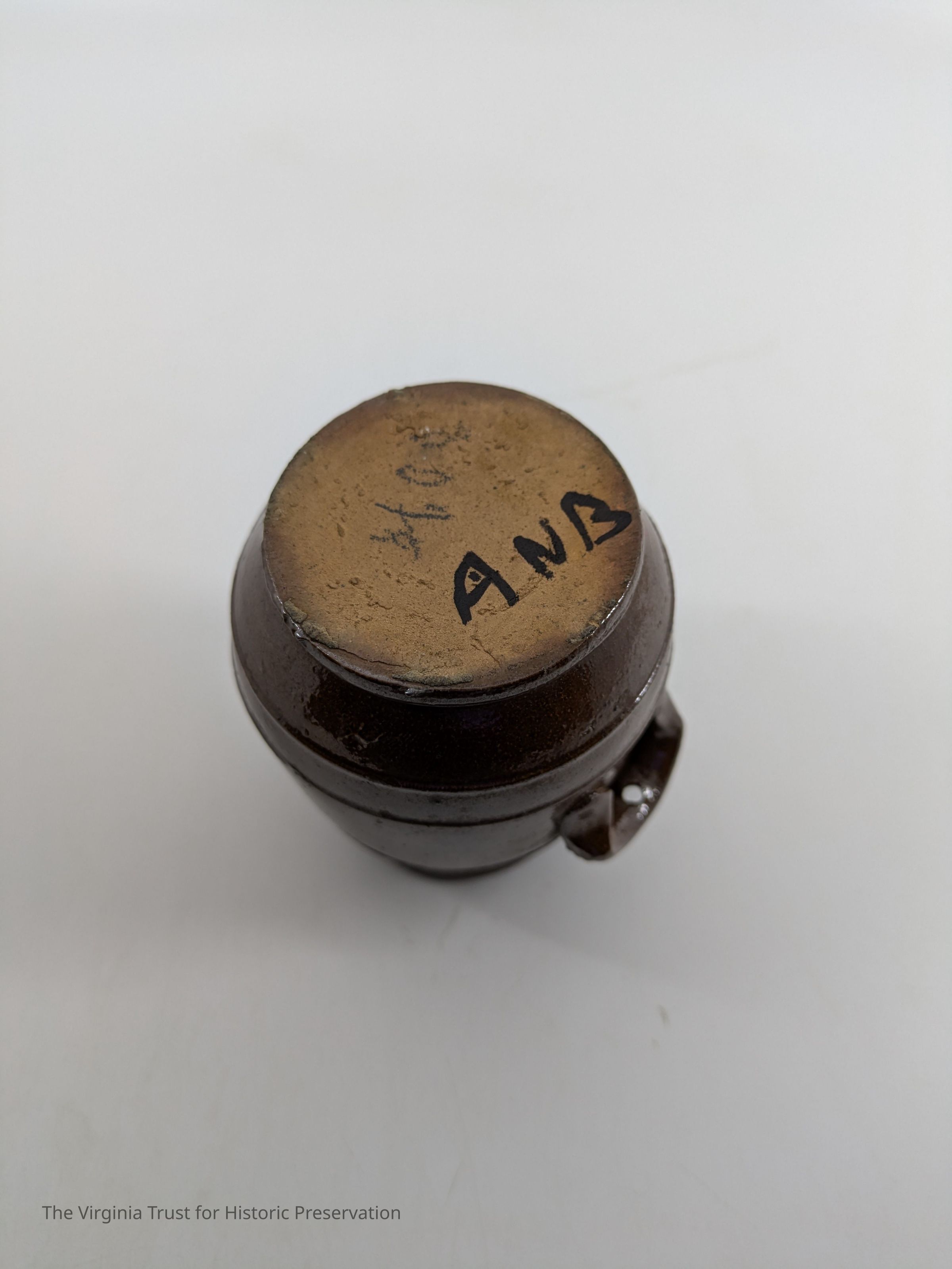 Miniature stoneware brown pot with 2 handles, marked "ANB" which are the initials for Agnes Elizabeth Blackwell.