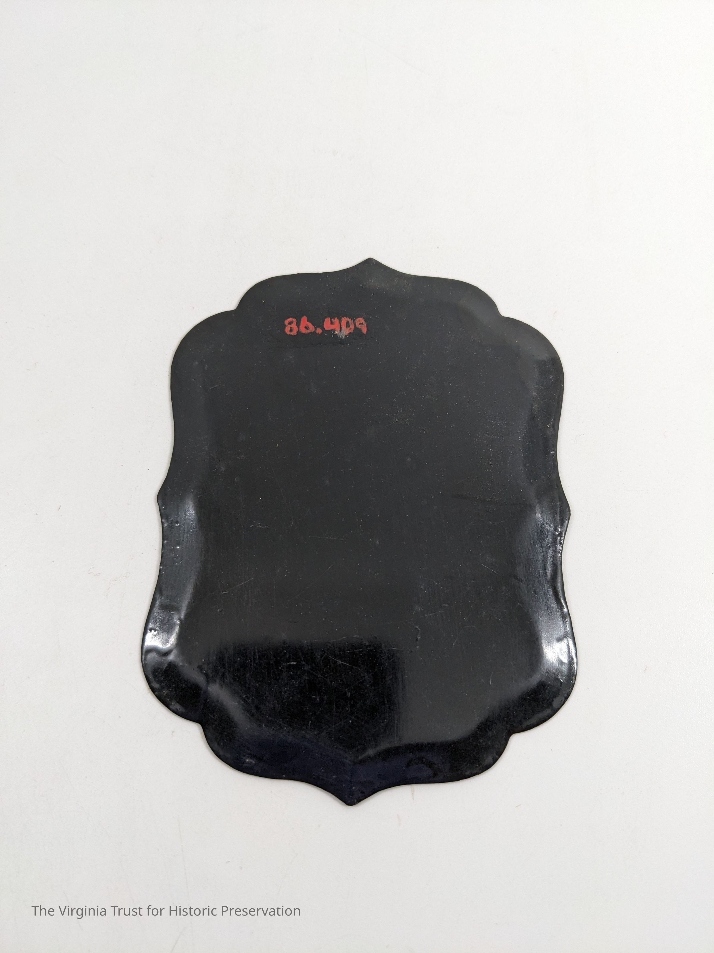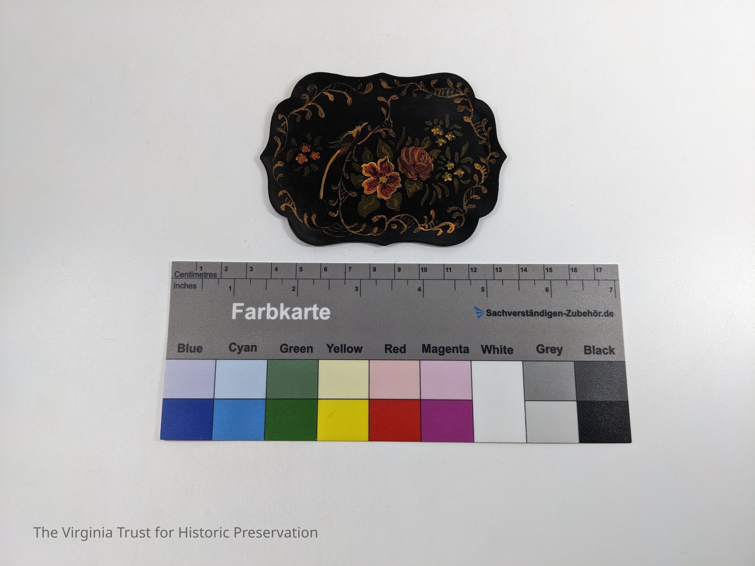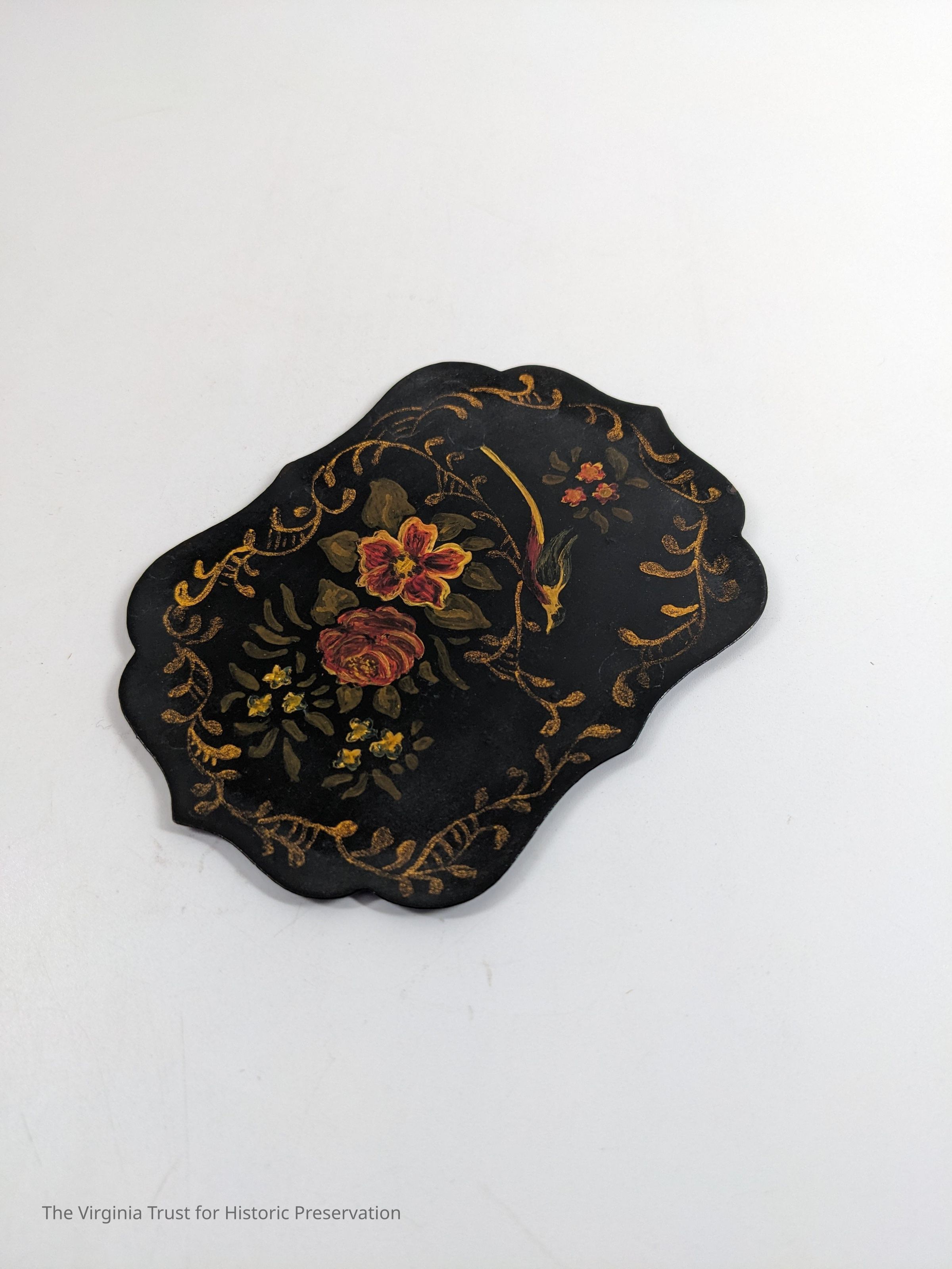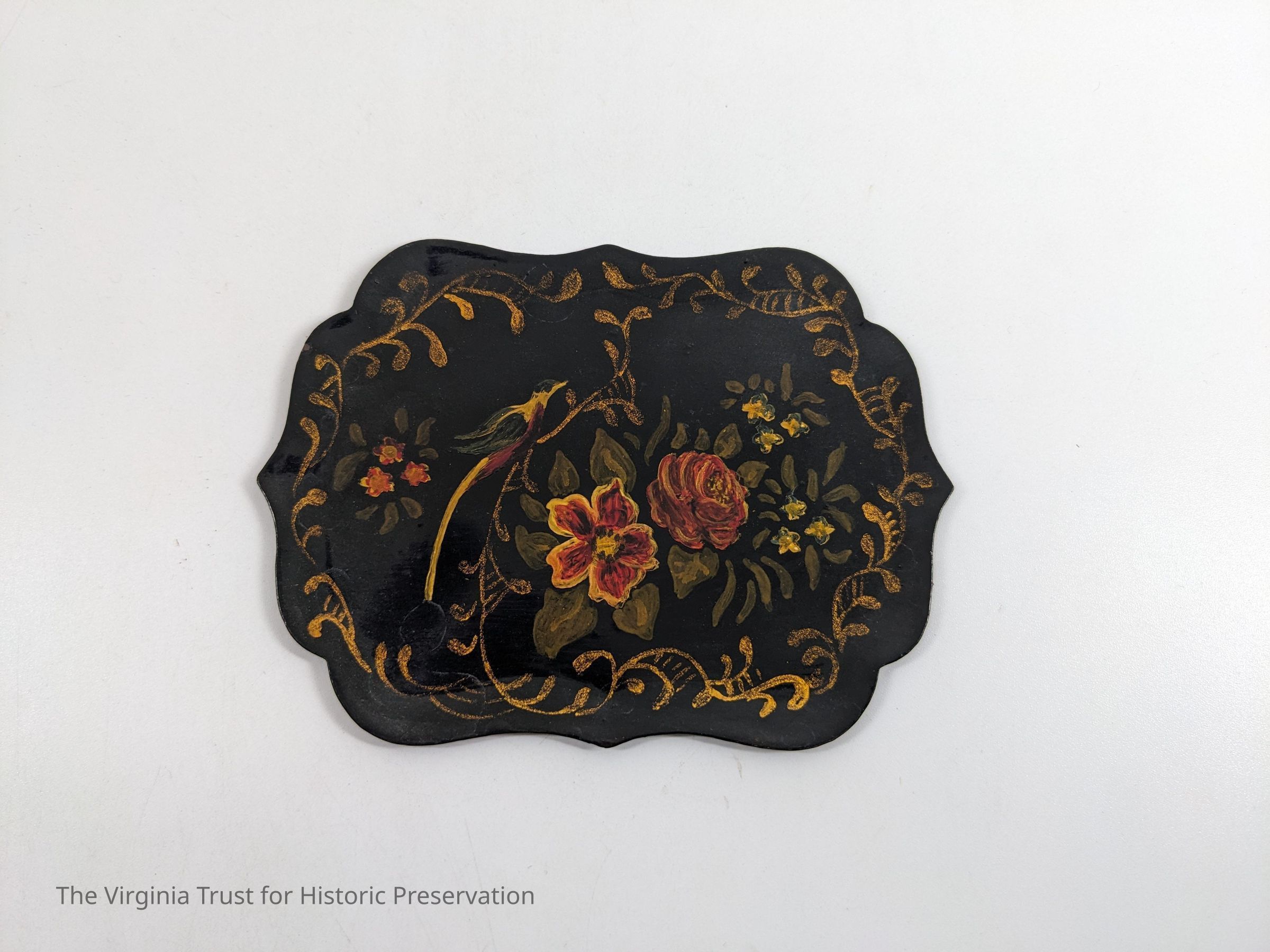 Metal painted tray. Leaf design around edge with two red flowers in the center. Bird painted towards top left of flowers.