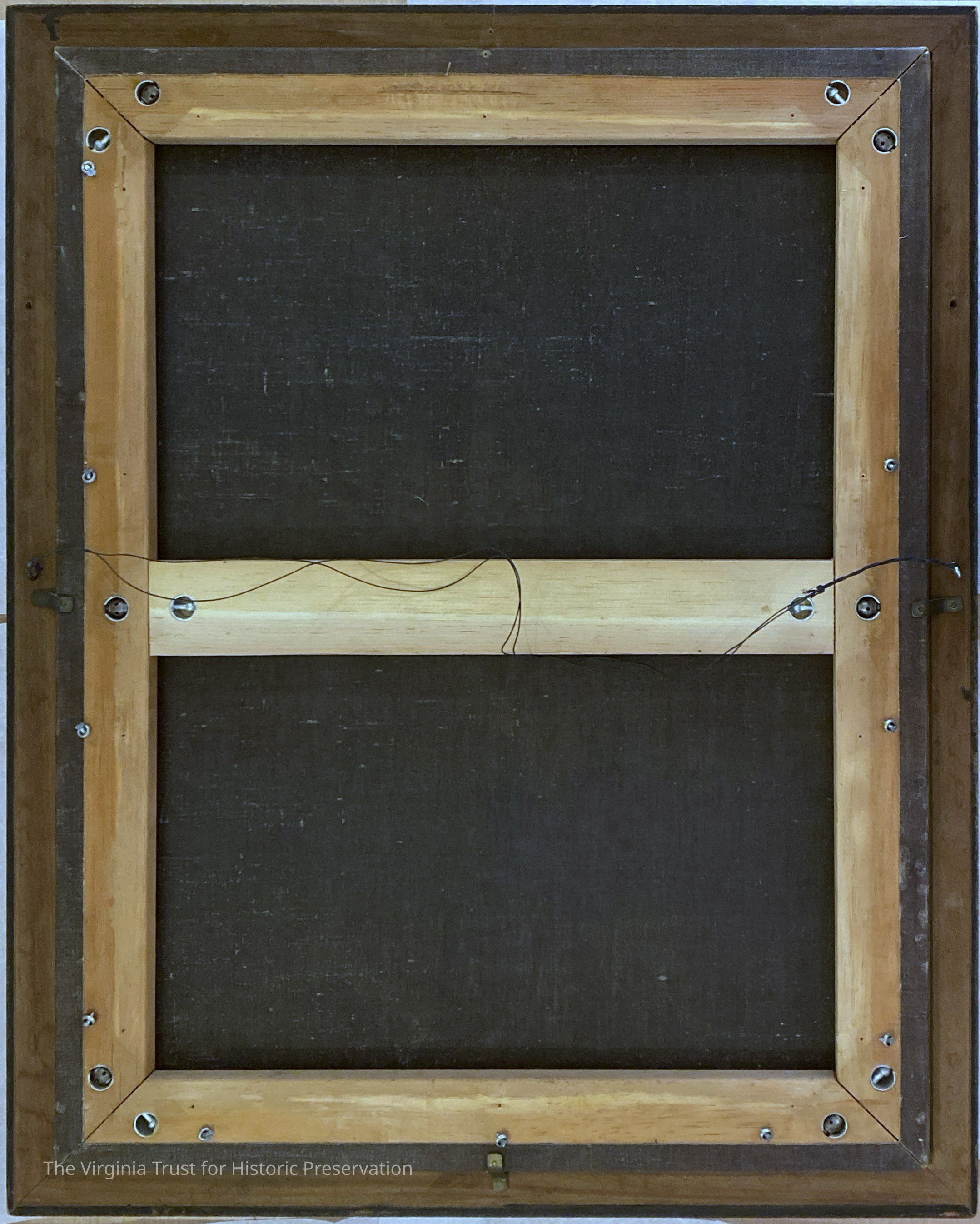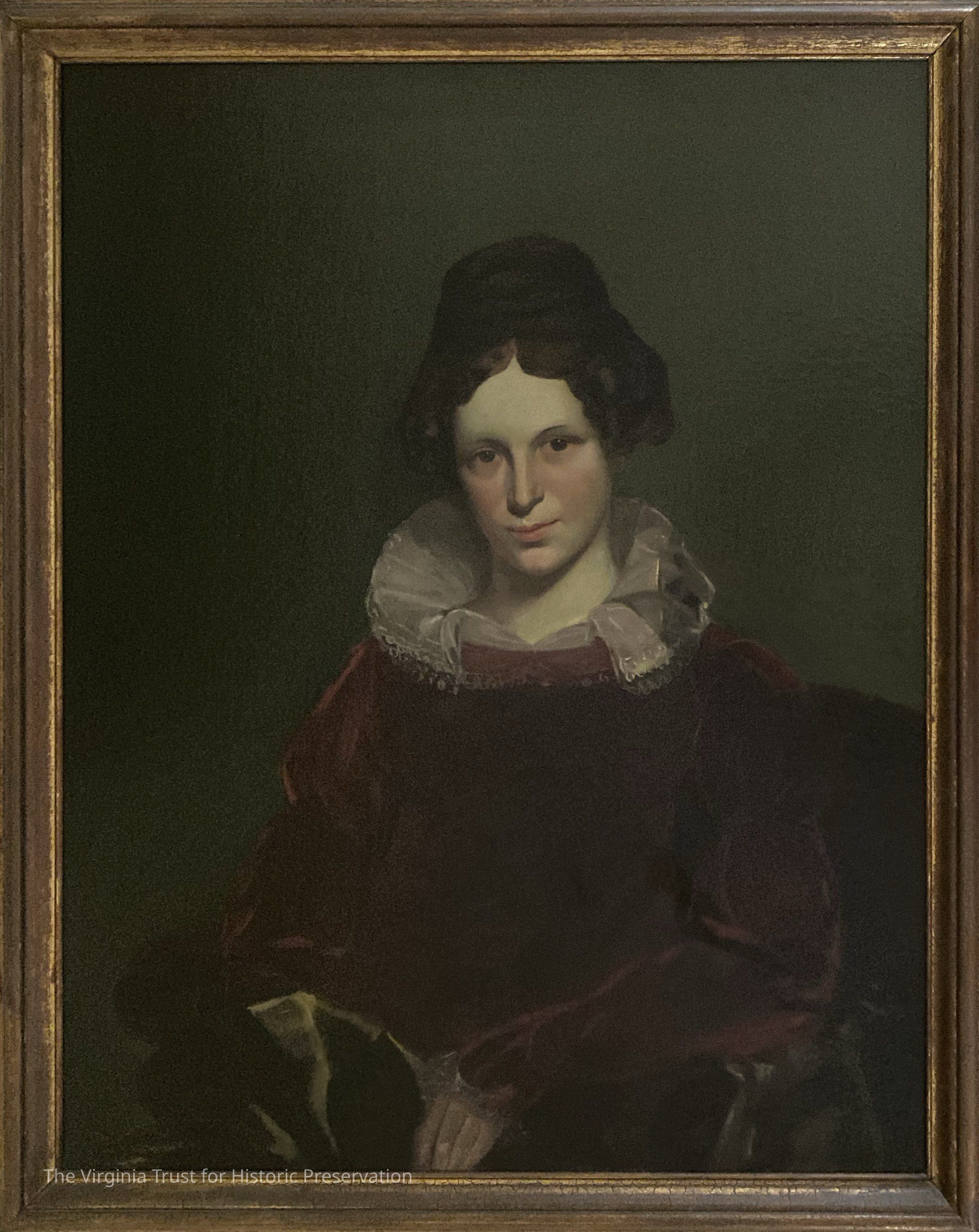 Portrait of Sarah "Sallie" Caldwell Lee. Lee is sitting in a chair and wears a red dress with lace at the neck and cuffs. Updo hair. Dark green background. 19th century.Dimensions
